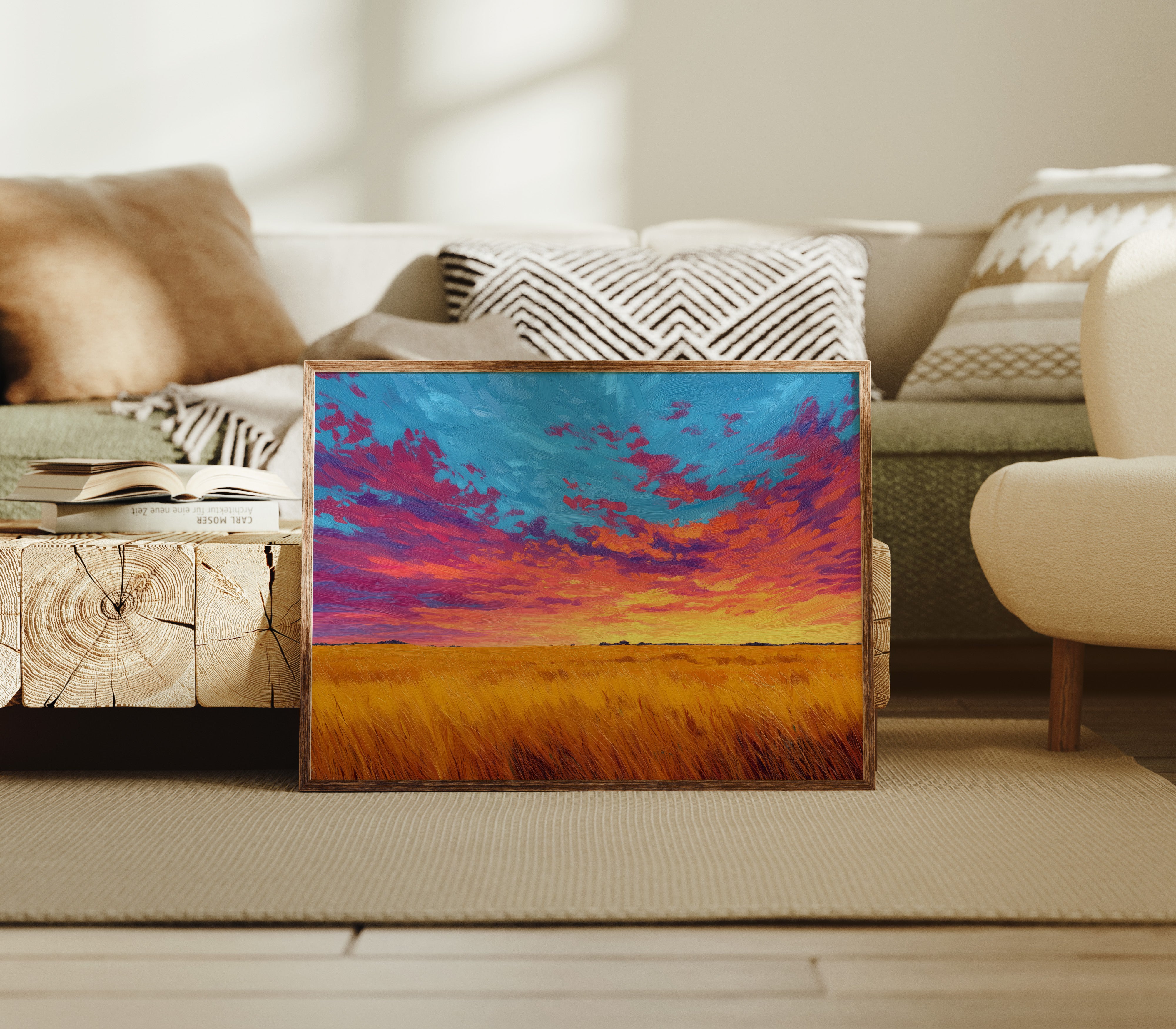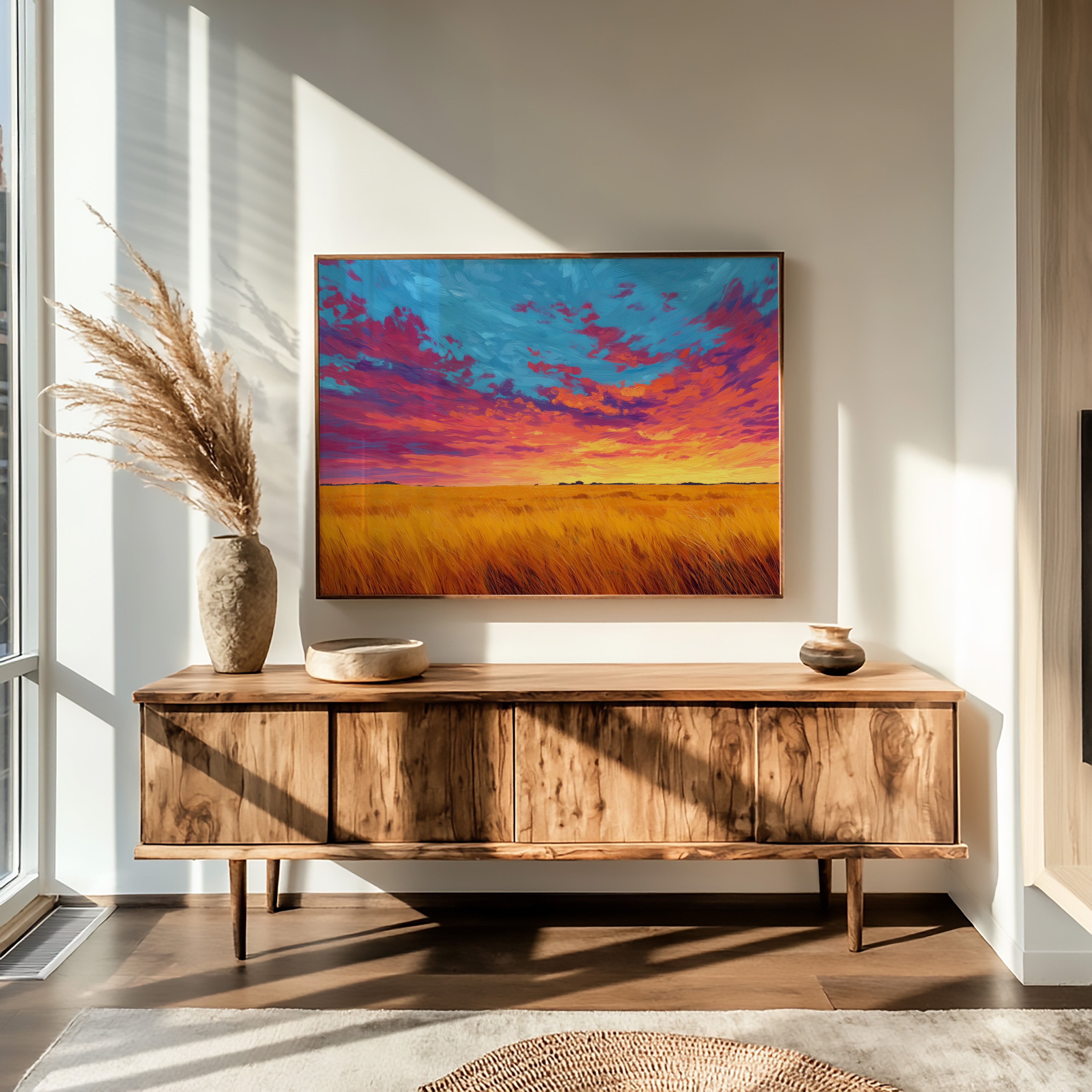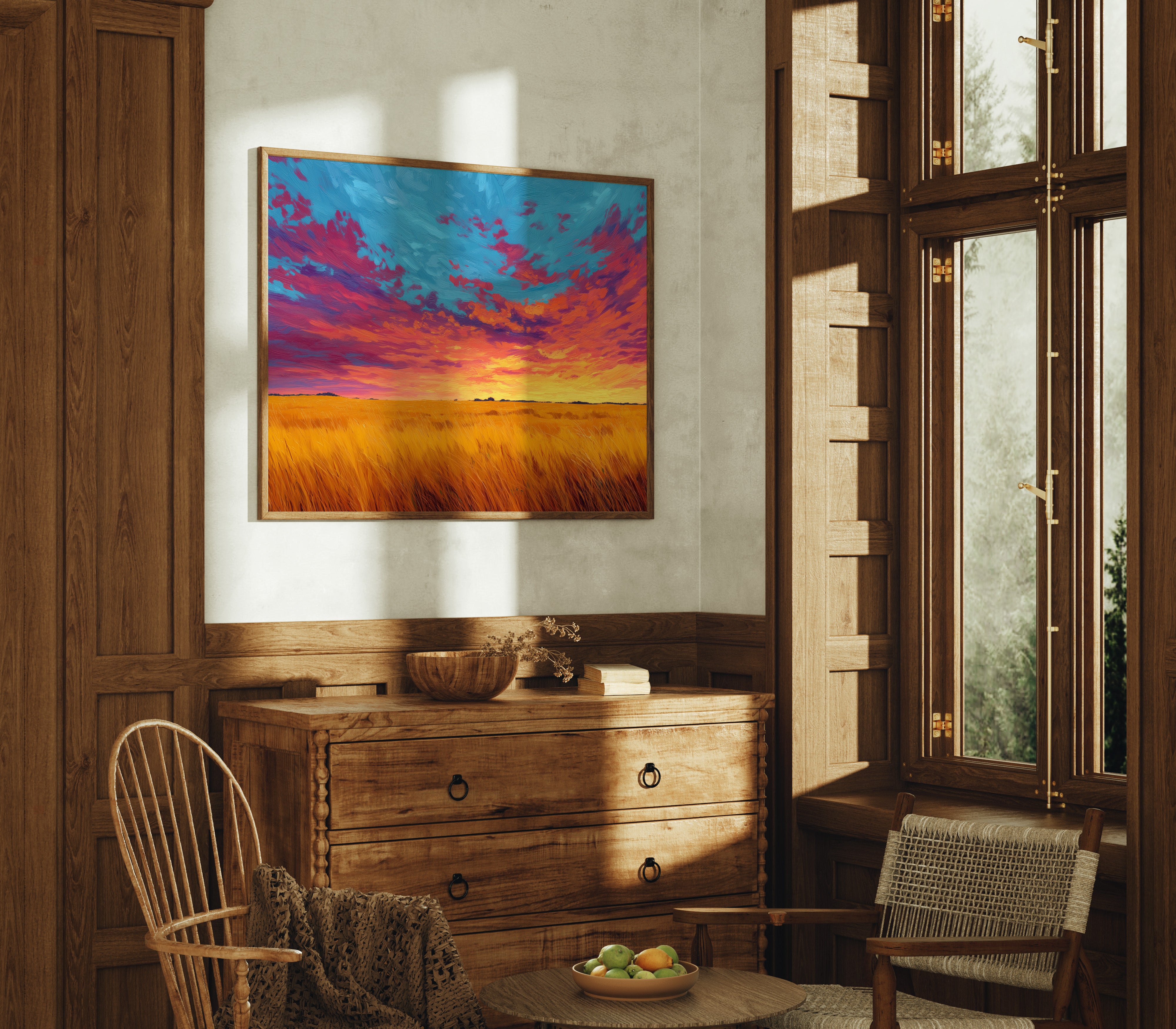 A blazing sunset ignites the horizon, painting the sky in a dramatic display of turquoise, magenta, and molten gold. Endless fields of golden wheat stretch toward the fiery horizon, their stalks swaying gently in an unseen breeze like waves on an amber ocean. The interplay of warm and cool tones creates a mesmerizing dialogue between earth and sky, while the textured brushstrokes capture the raw energy of nature's most spectacular light show. This statement piece commands attention in modern living spaces, bringing bold color and serene prairie energy to contemporary interiors.
