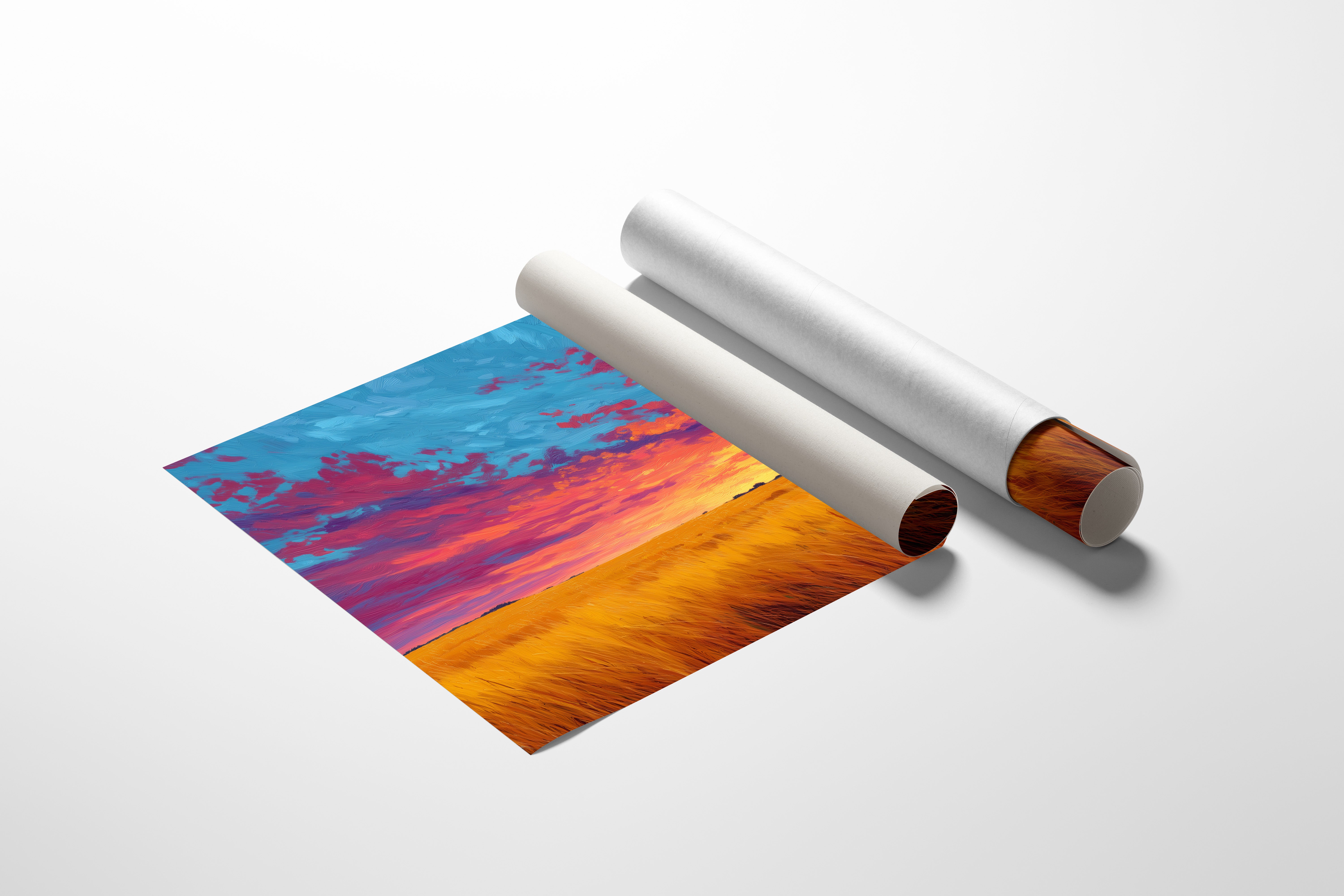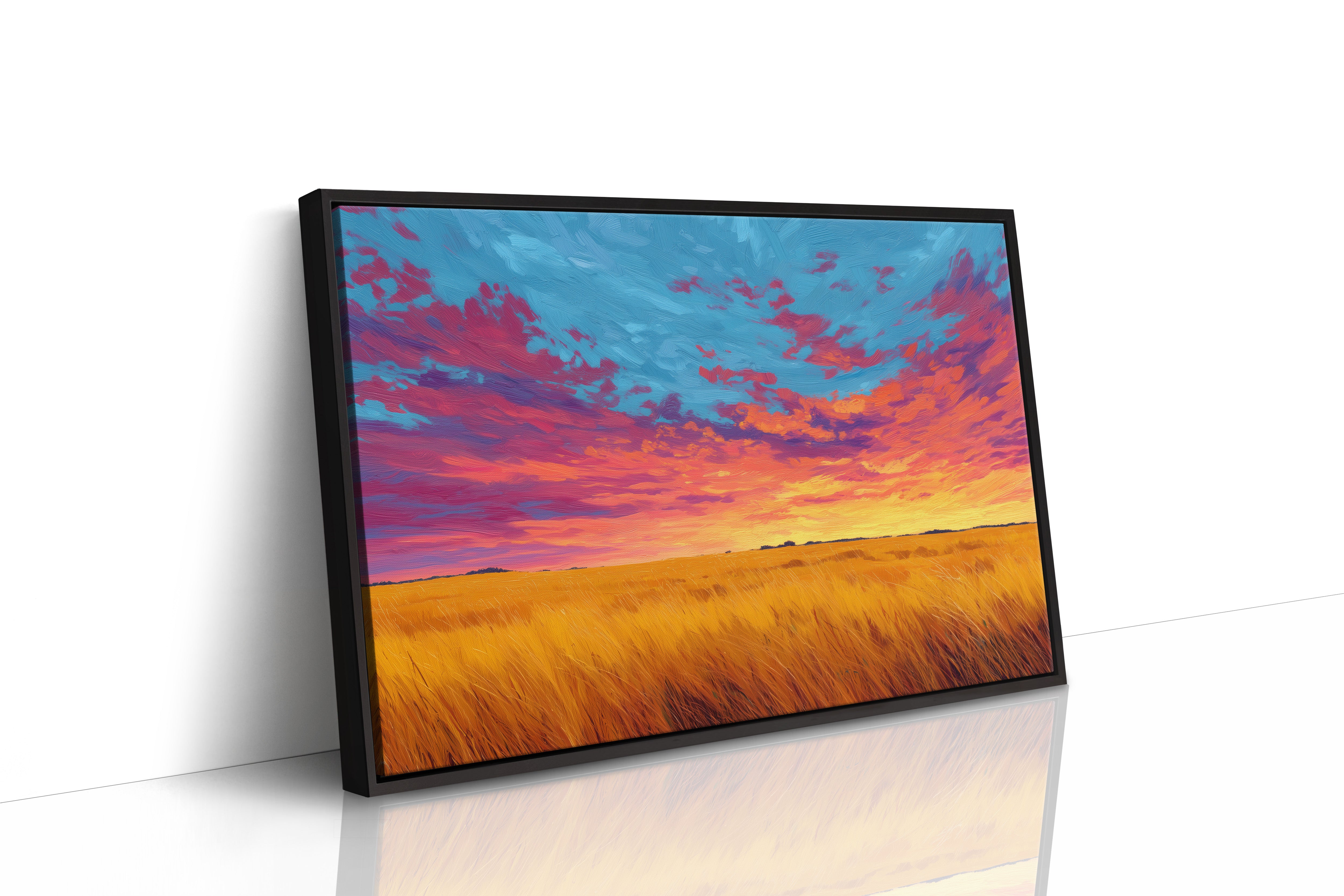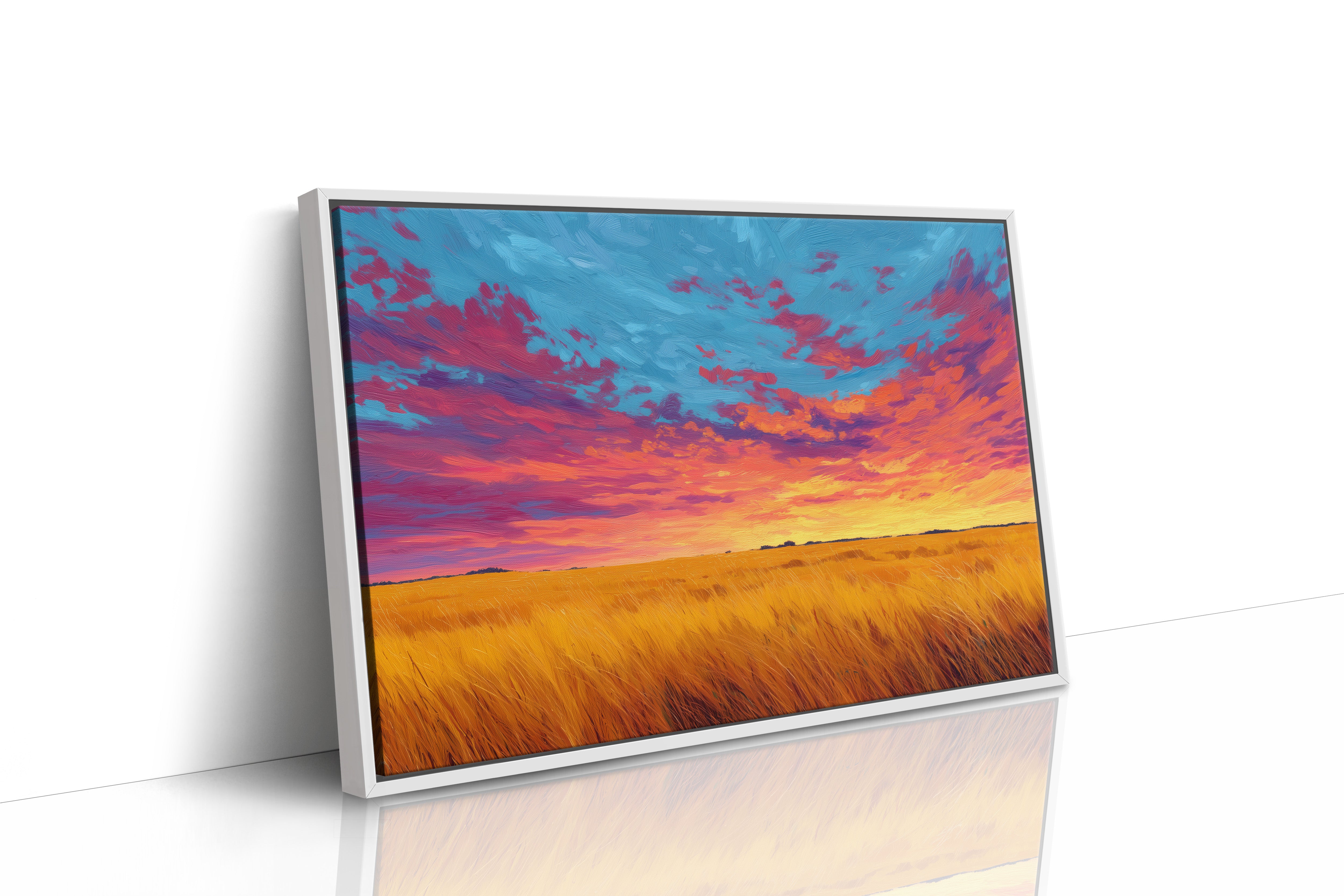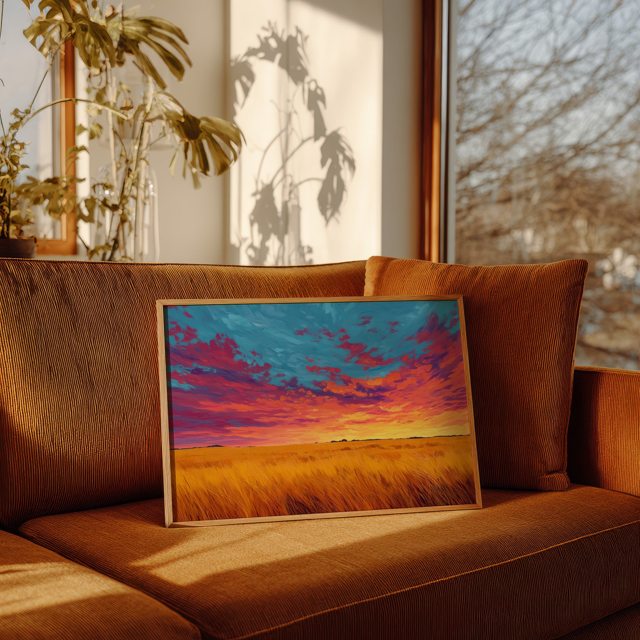 A blazing sunset ignites the horizon, painting the sky in a dramatic display of turquoise, magenta, and molten gold. Endless fields of golden wheat stretch toward the fiery horizon, their stalks swaying gently in an unseen breeze like waves on an amber ocean. The interplay of warm and cool tones creates a mesmerizing dialogue between earth and sky, while the textured brushstrokes capture the raw energy of nature's most spectacular light show. This statement piece commands attention in modern living spaces, bringing bold color and serene prairie energy to contemporary interiors.