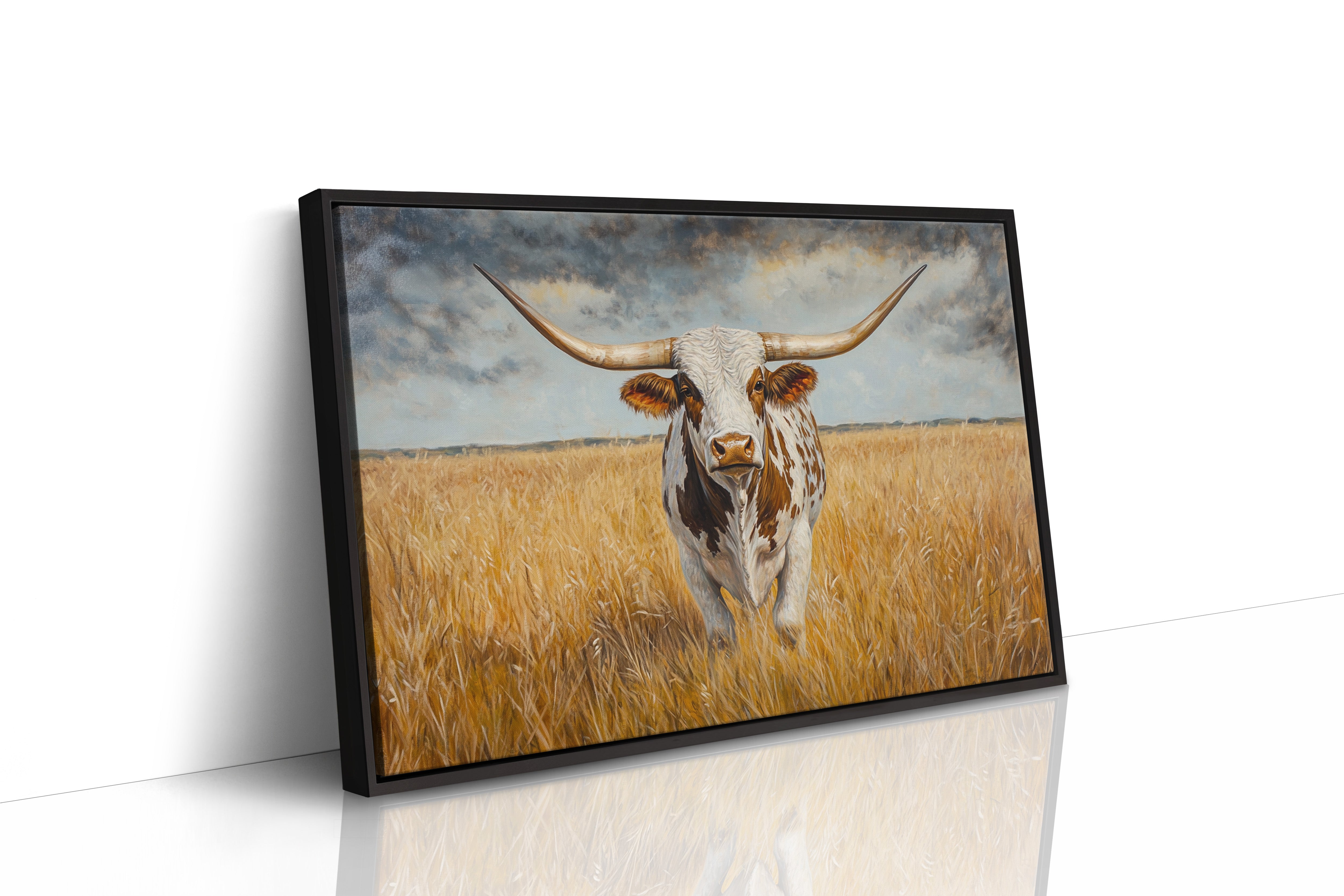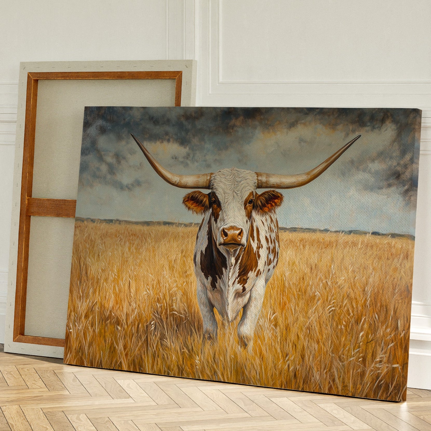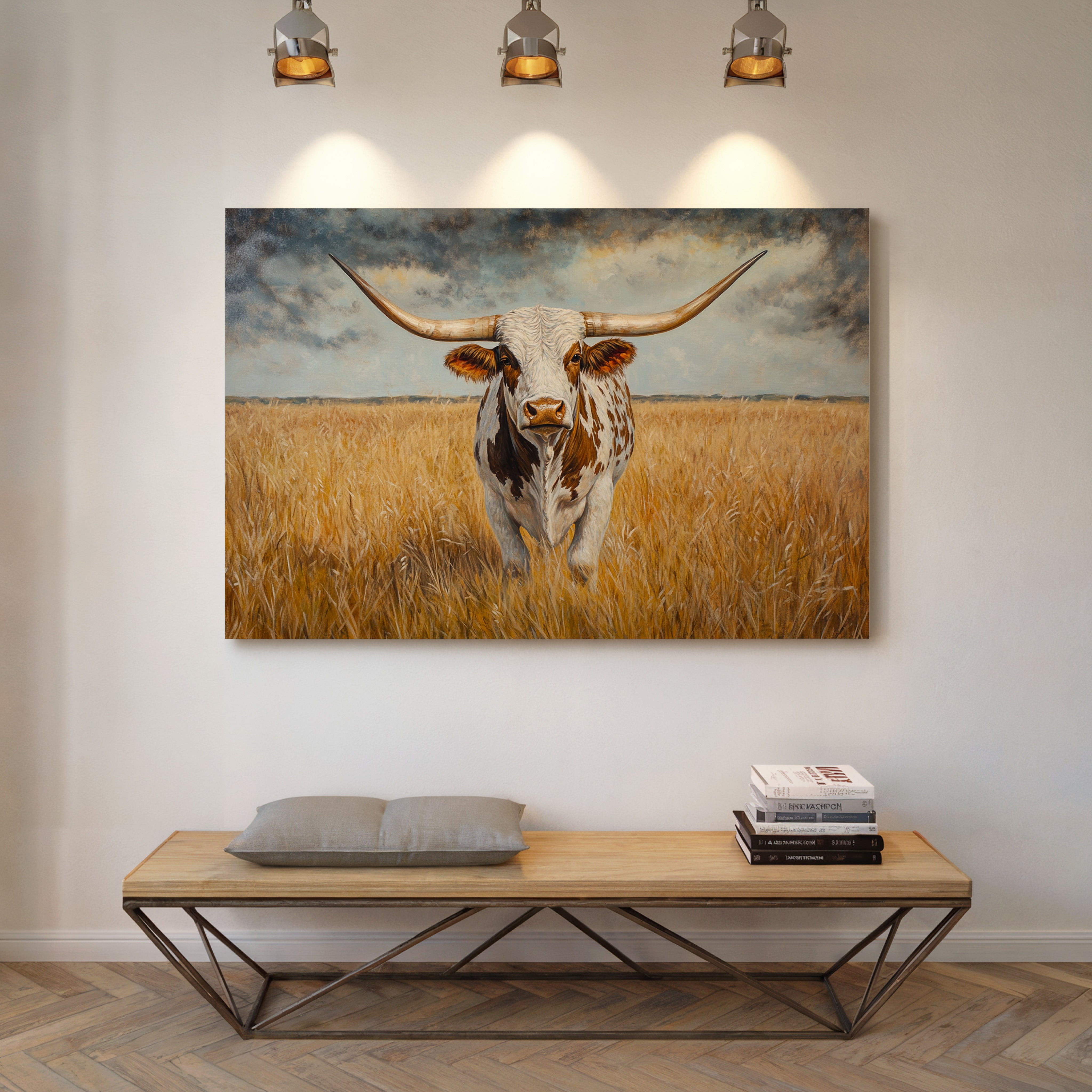 "Strength and majesty command attention as a magnificent longhorn stands sentinel in a sea of sun-ripened wheat. The dramatic contrast of the animal's brown and white spotted coat creates a striking silhouette against the moody sky above. Those impressive horns stretch across the horizon like nature's crown, while intelligent eyes peer through copper-tinted fur, telling tales of wild Texas heritage. This piece captures the raw power and untamed spirit of the American West, where pastoral beauty meets wild determination. Perfect for adding a bold statement to ranch houses, rustic dining rooms, or any space seeking to capture the essence of western charm.