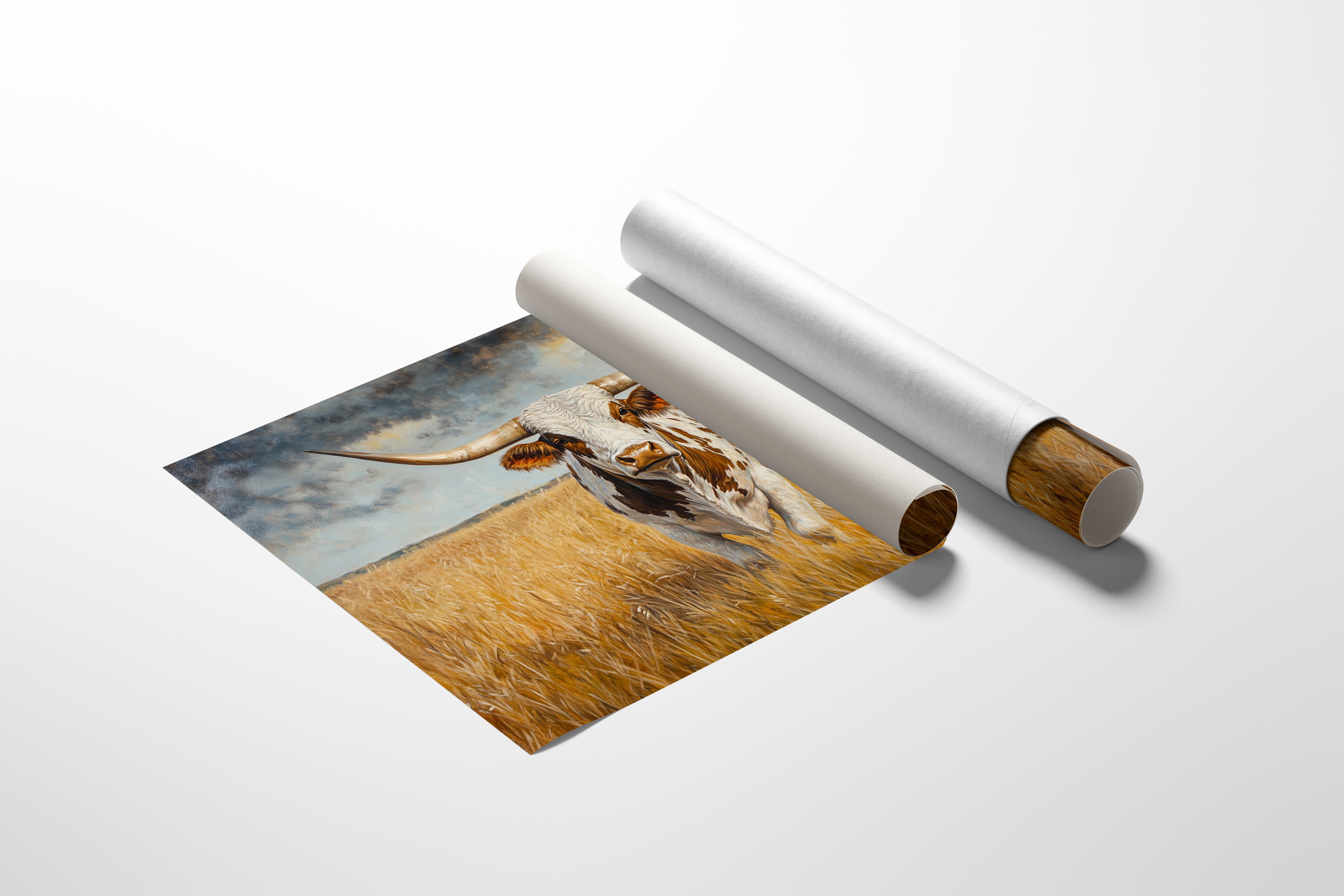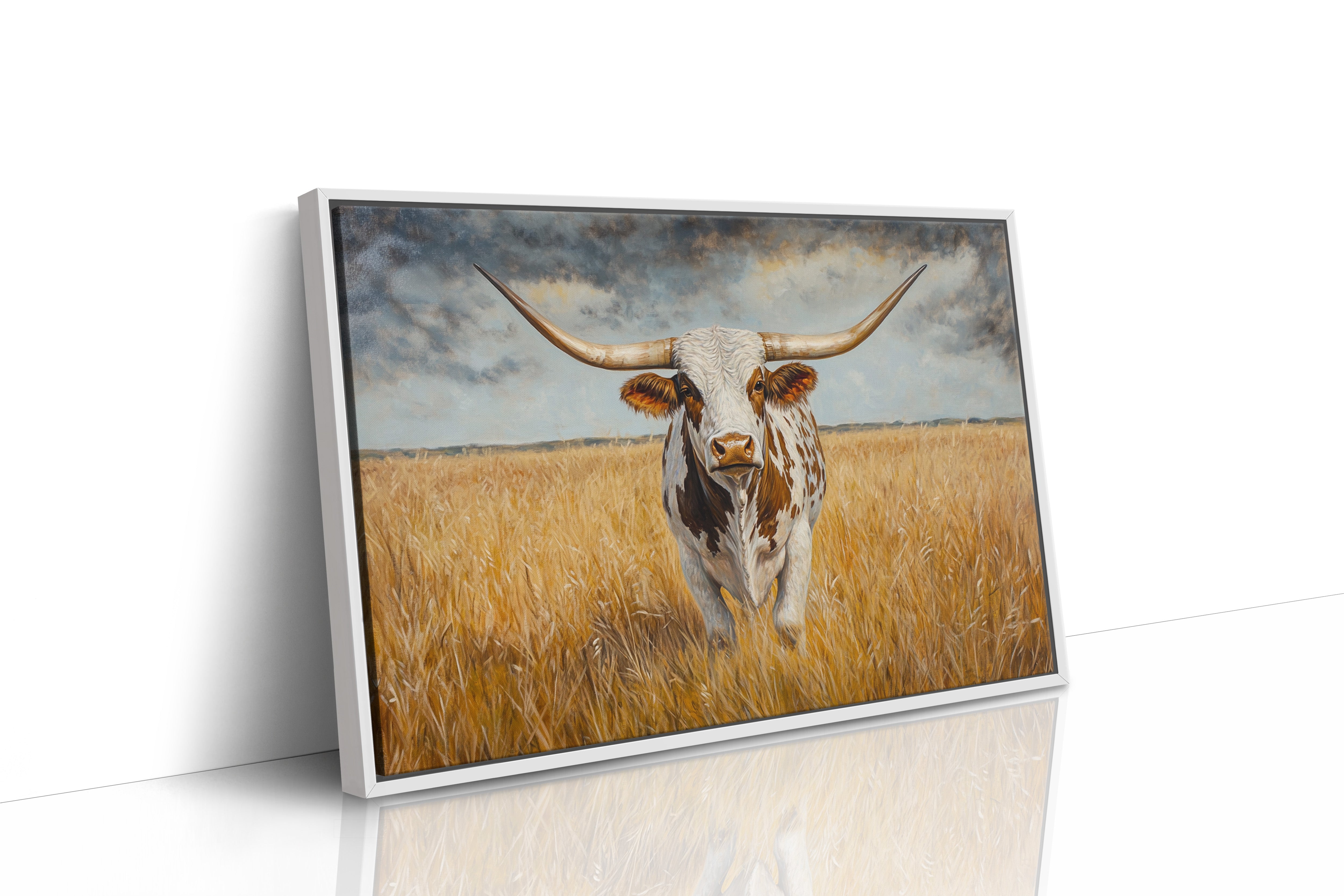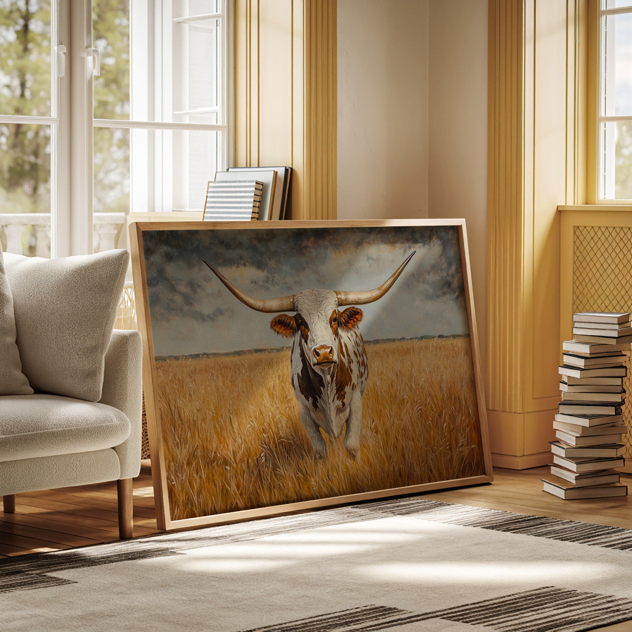 "Strength and majesty command attention as a magnificent longhorn stands sentinel in a sea of sun-ripened wheat. The dramatic contrast of the animal's brown and white spotted coat creates a striking silhouette against the moody sky above. Those impressive horns stretch across the horizon like nature's crown, while intelligent eyes peer through copper-tinted fur, telling tales of wild Texas heritage. This piece captures the raw power and untamed spirit of the American West, where pastoral beauty meets wild determination. Perfect for adding a bold statement to ranch houses, rustic dining rooms, or any space seeking to capture the essence of western charm.