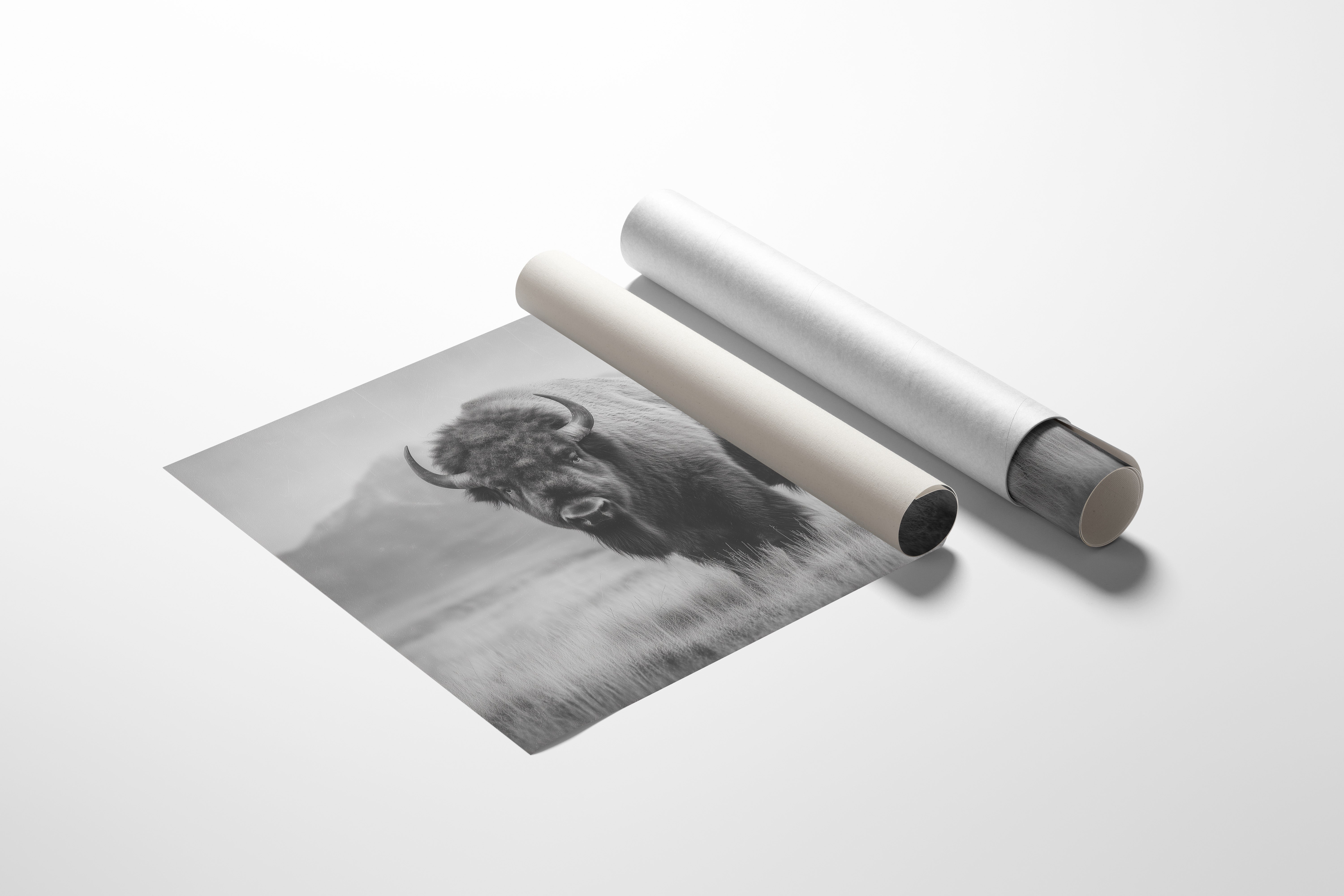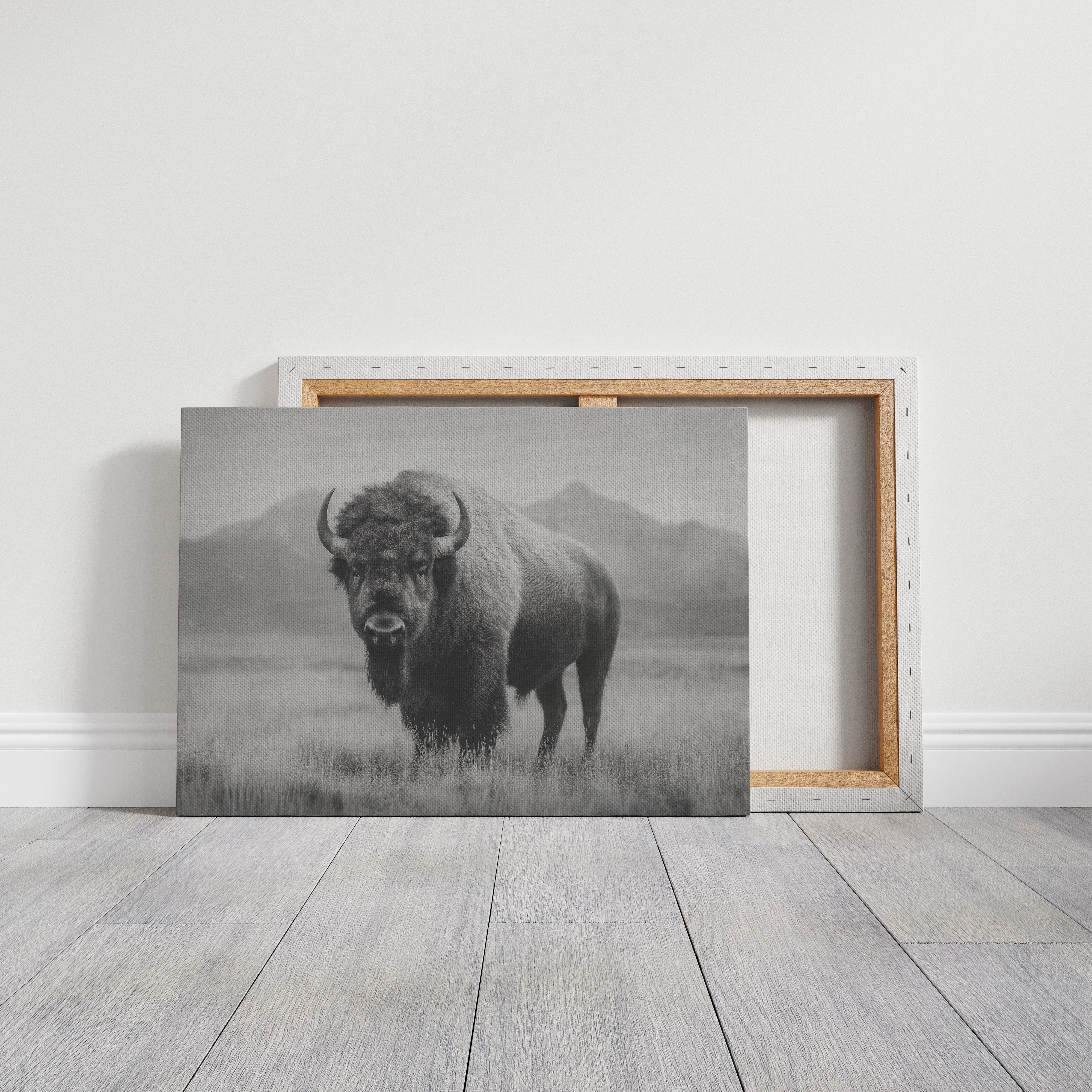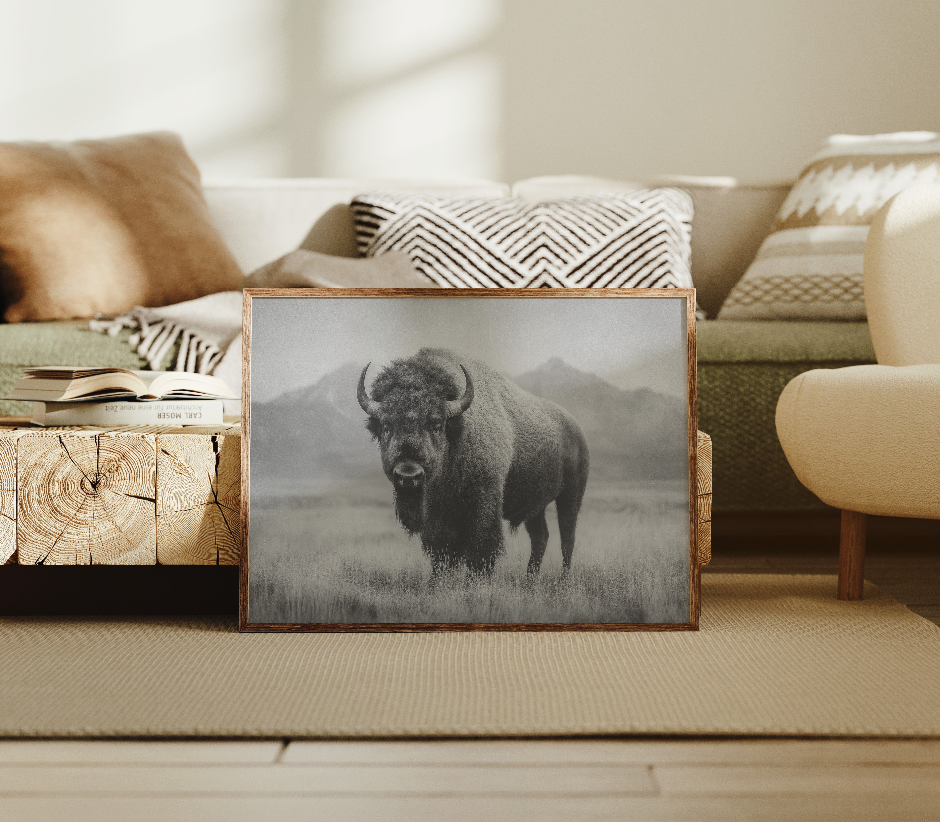 Morning mist settles across the grassland as a magnificent bison stands resolute, commanding the landscape with quiet strength. This striking monochromatic capture from our Contemporary collection perfectly balances raw power with artistic restraint. The buffalo's dense fur catches subtle variations of gray, while distant mountains fade into atmospheric haze, creating layers of visual depth that tell stories of wild spaces and ancient bloodlines. Every detail, from the textured grass to the beast's penetrating gaze, speaks to the enduring spirit of the American West. This piece makes a bold statement in modern living spaces, especially in minimalist rooms where its dramatic presence can take center stage. Its timeless quality bridges the gap between untamed nature and refined interior design.