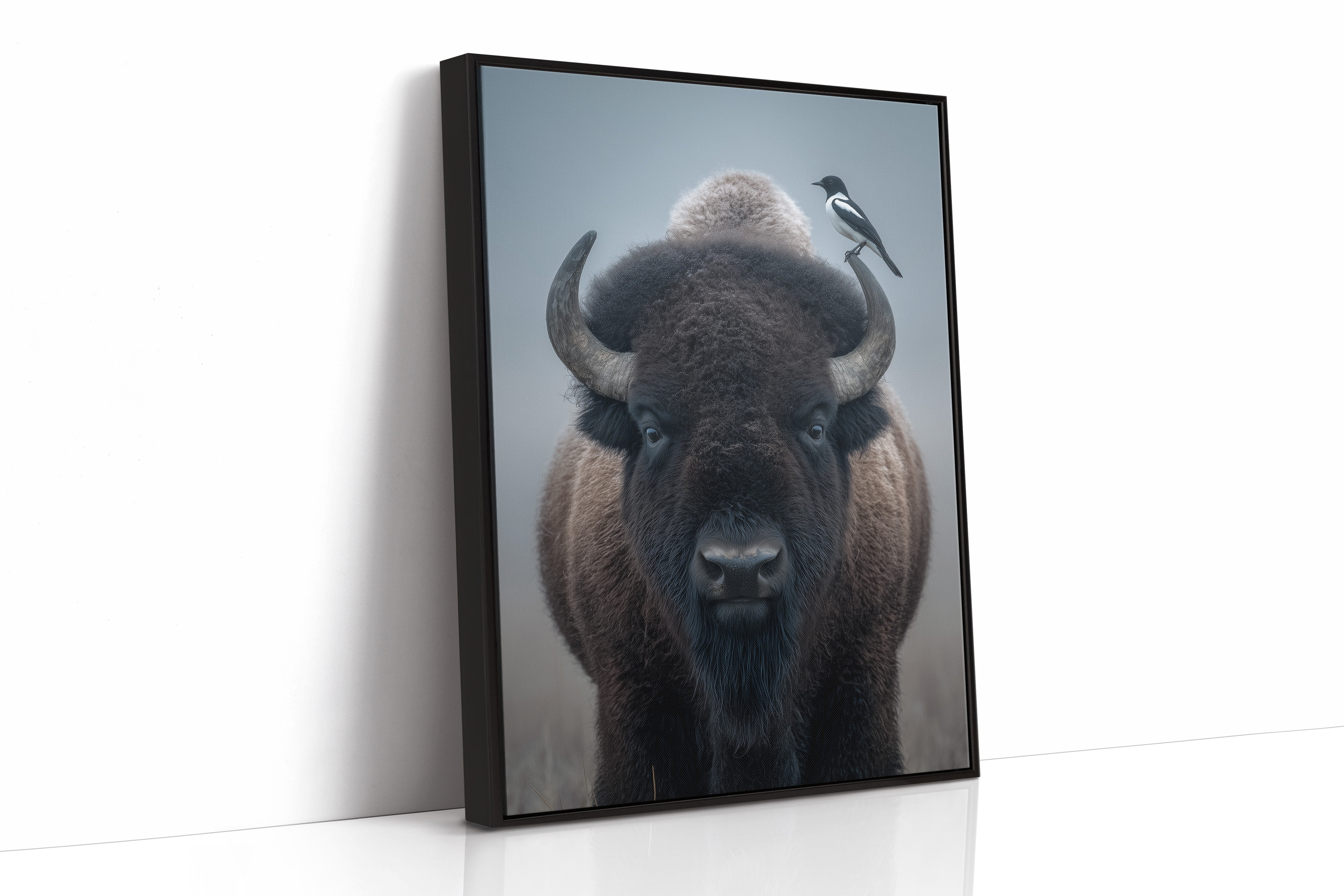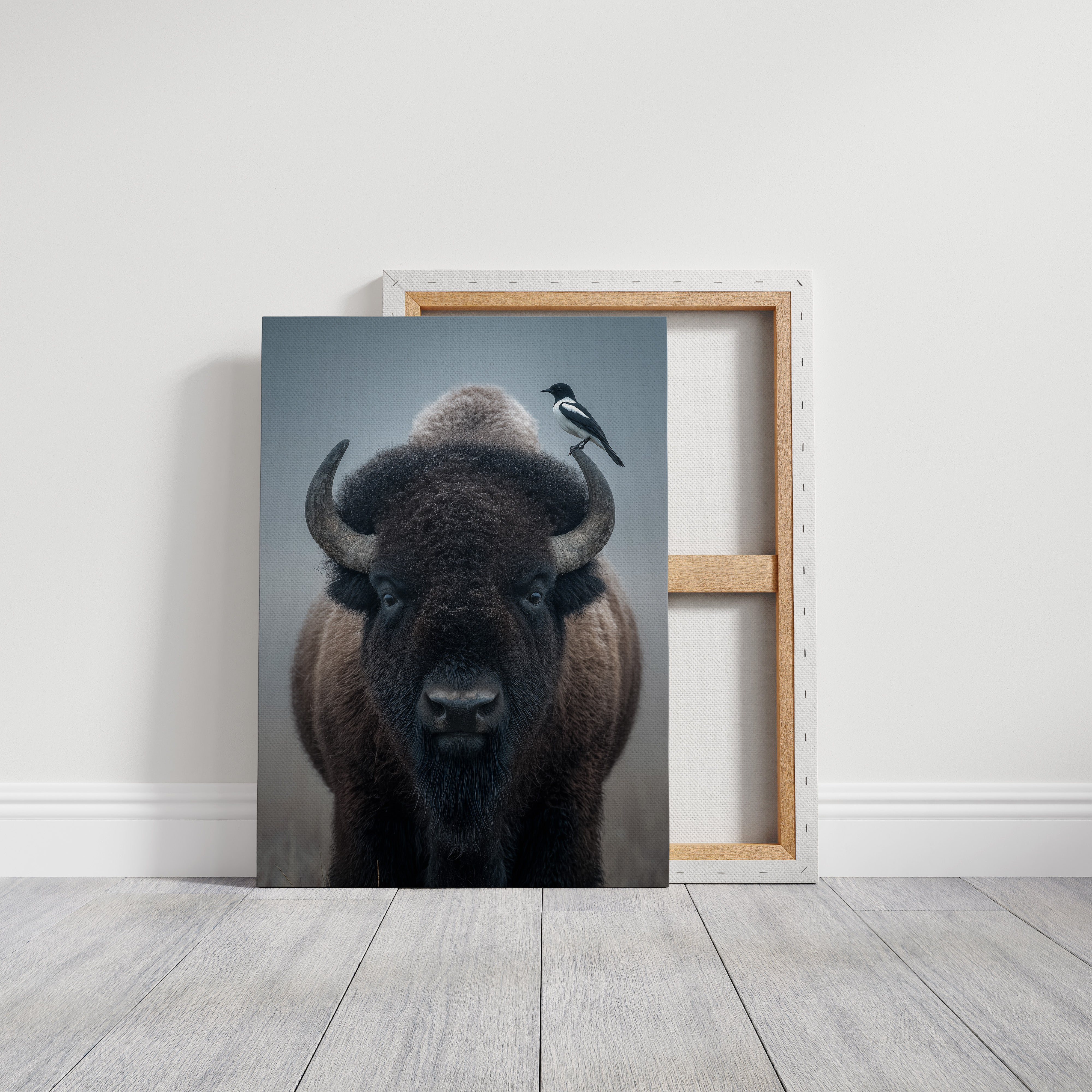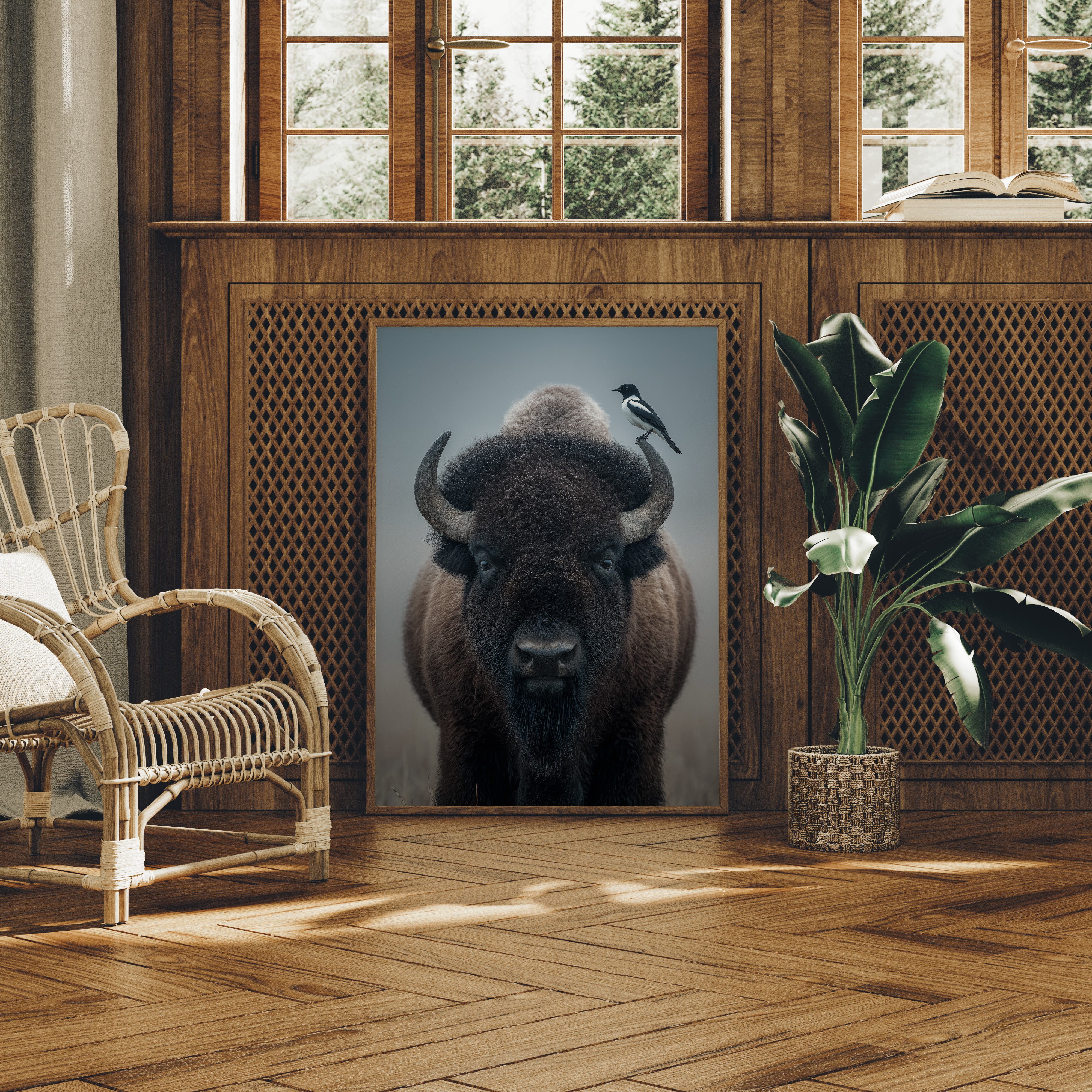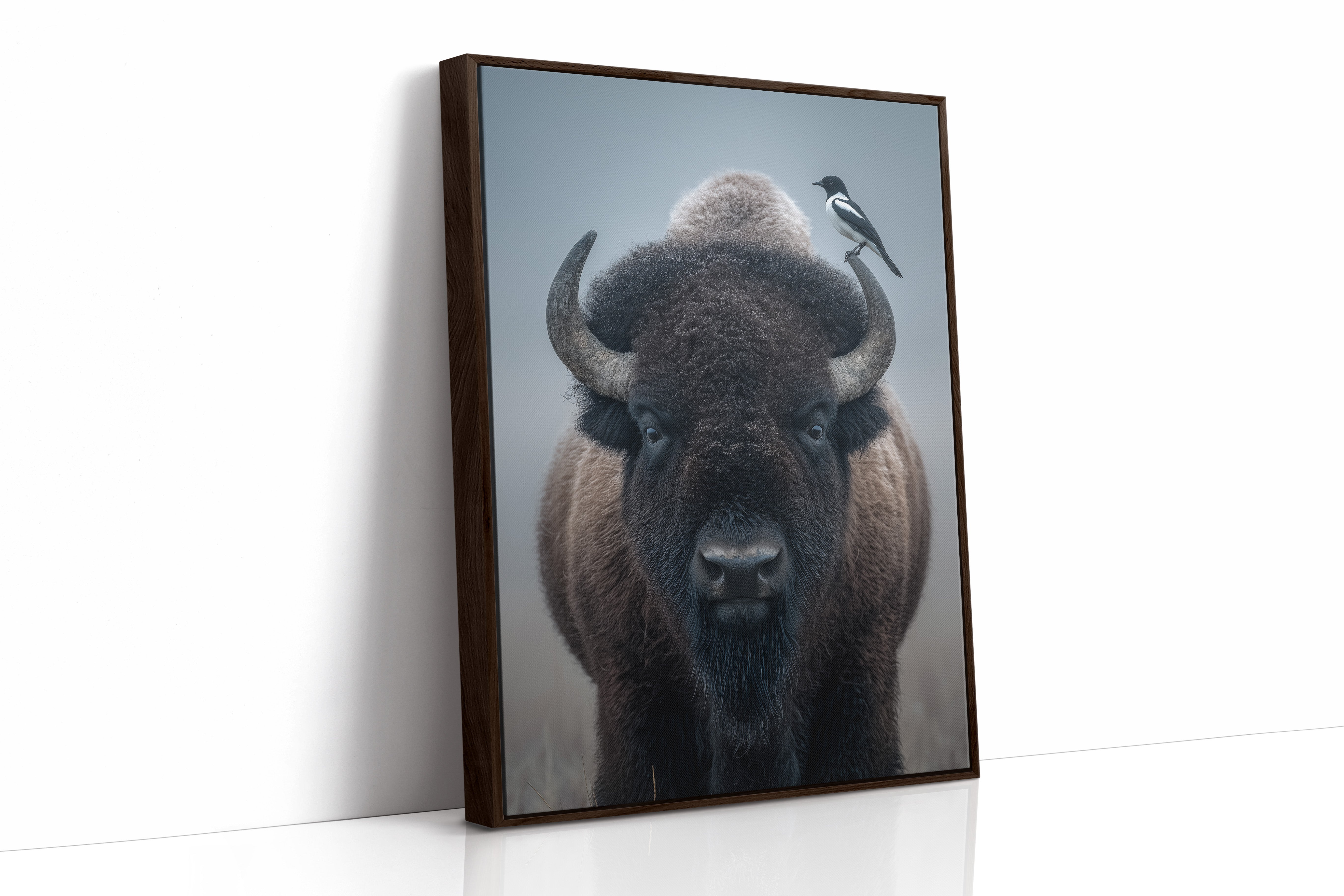 A majestic bison stands in stoic contemplation, its powerful presence commanding attention while a delicate magpie perches boldly atop its massive form. The contrast between the bison's rugged strength and the bird's graceful poise creates an unexpected partnership that speaks to nature's surprising harmonies. Rich textures of the bison's dense fur catch subtle light, while the magpie's sleek feathers add a flash of contrast against the moody atmospheric background. This striking portrait brings untamed prairie spirit into contemporary spaces, making a dramatic statement in modern rustic interiors, home offices, or lodge-inspired living rooms.