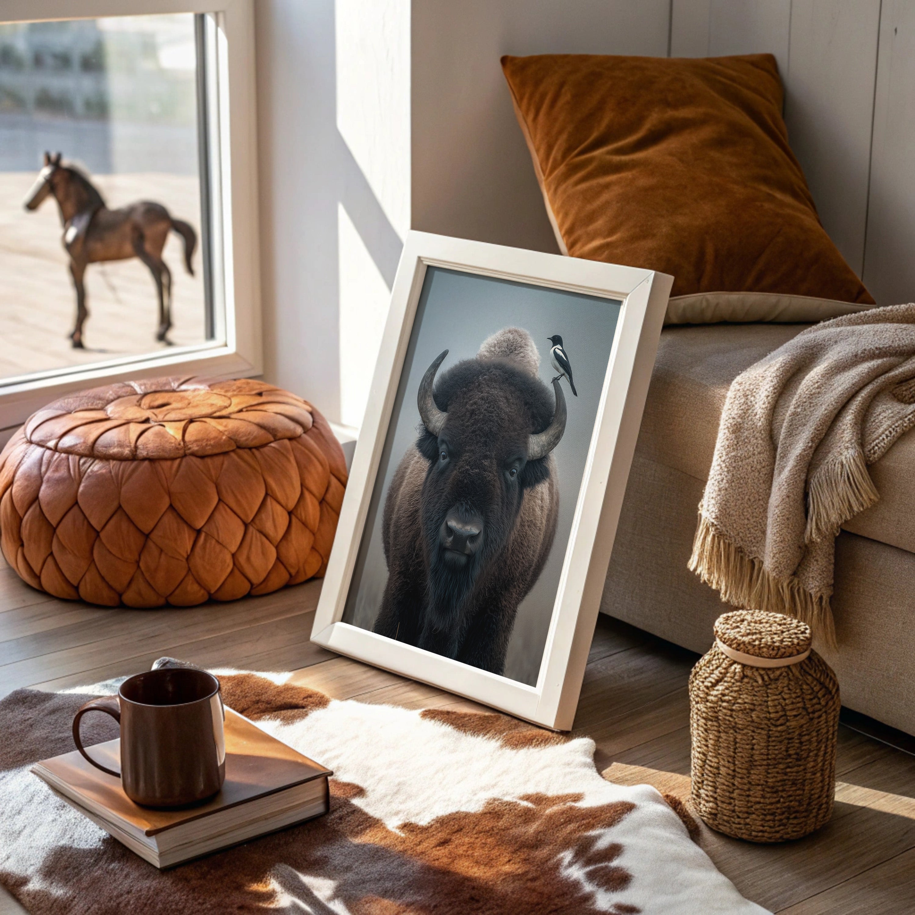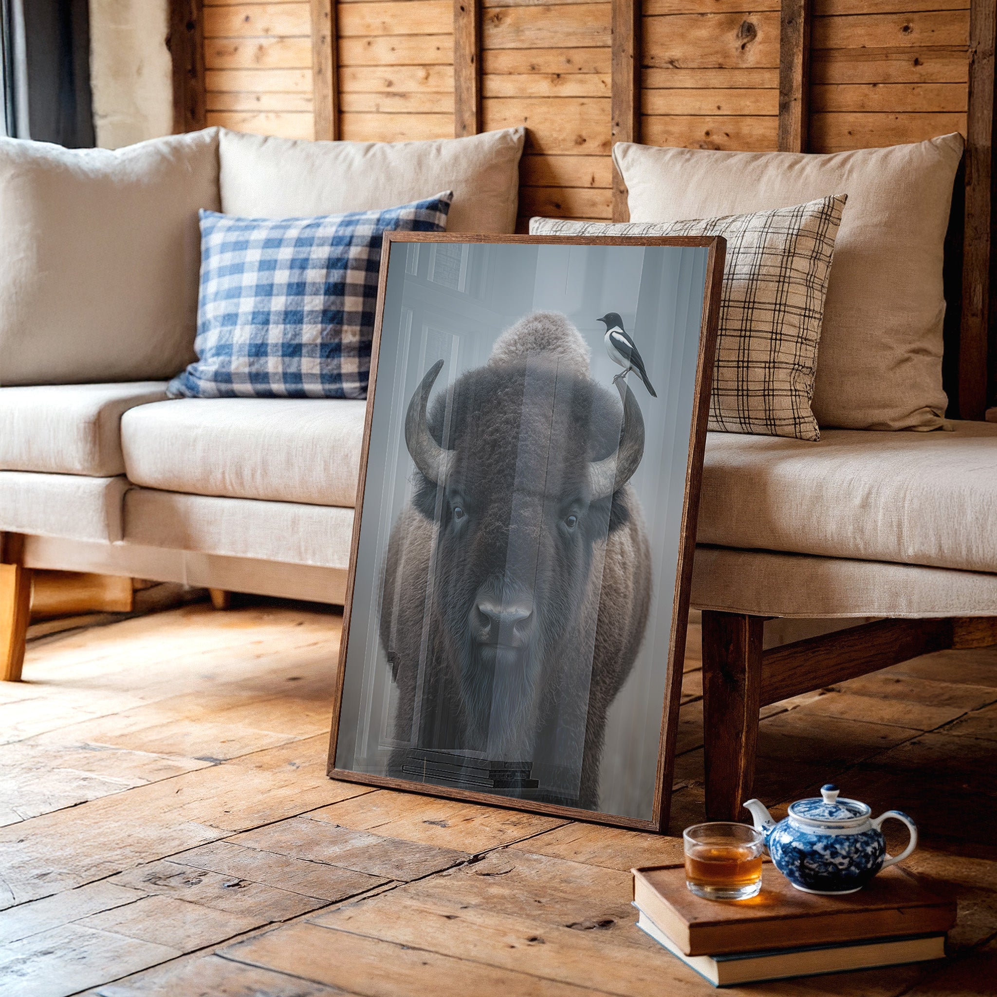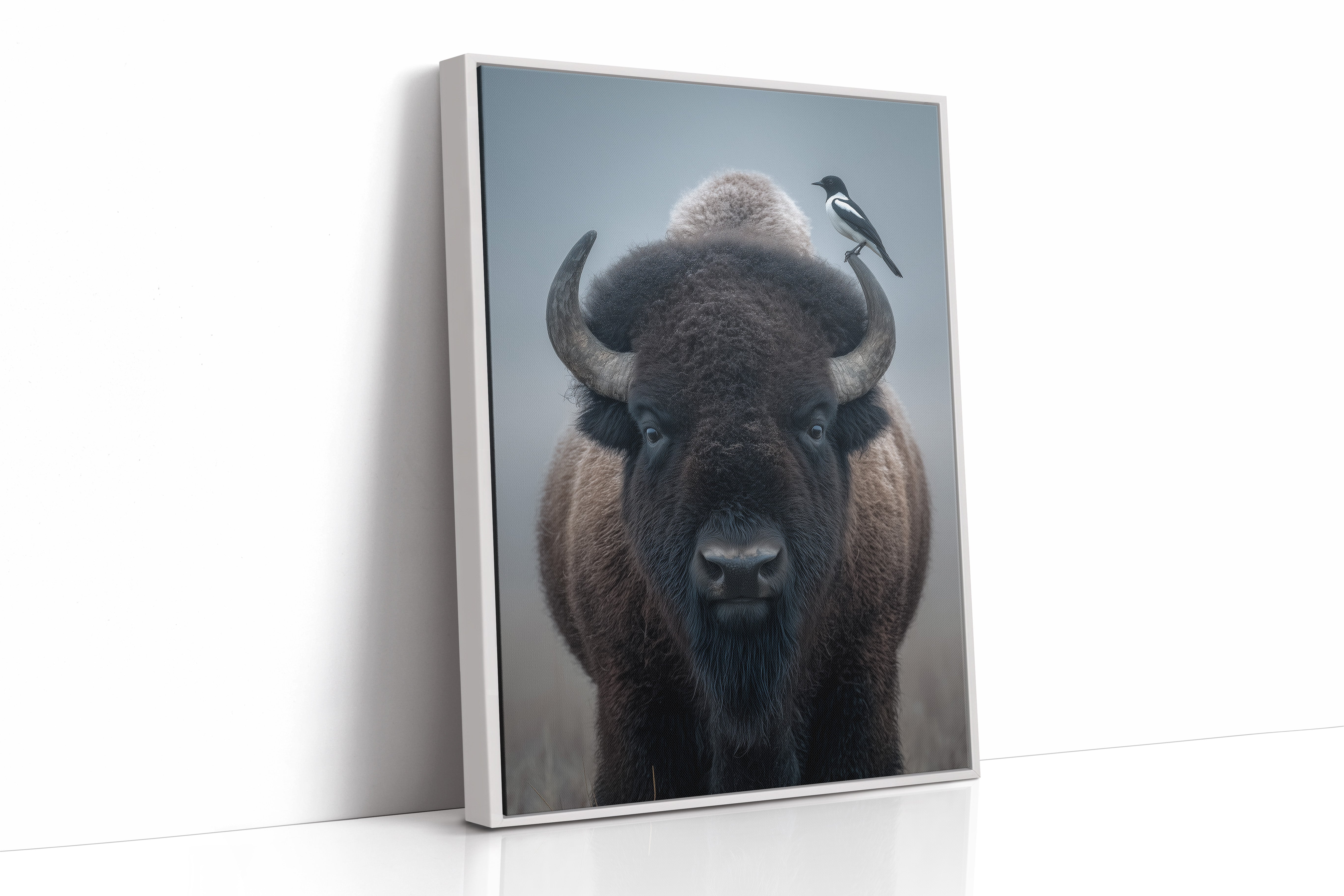 A majestic bison stands in stoic contemplation, its powerful presence commanding attention while a delicate magpie perches boldly atop its massive form. The contrast between the bison's rugged strength and the bird's graceful poise creates an unexpected partnership that speaks to nature's surprising harmonies. Rich textures of the bison's dense fur catch subtle light, while the magpie's sleek feathers add a flash of contrast against the moody atmospheric background. This striking portrait brings untamed prairie spirit into contemporary spaces, making a dramatic statement in modern rustic interiors, home offices, or lodge-inspired living rooms.