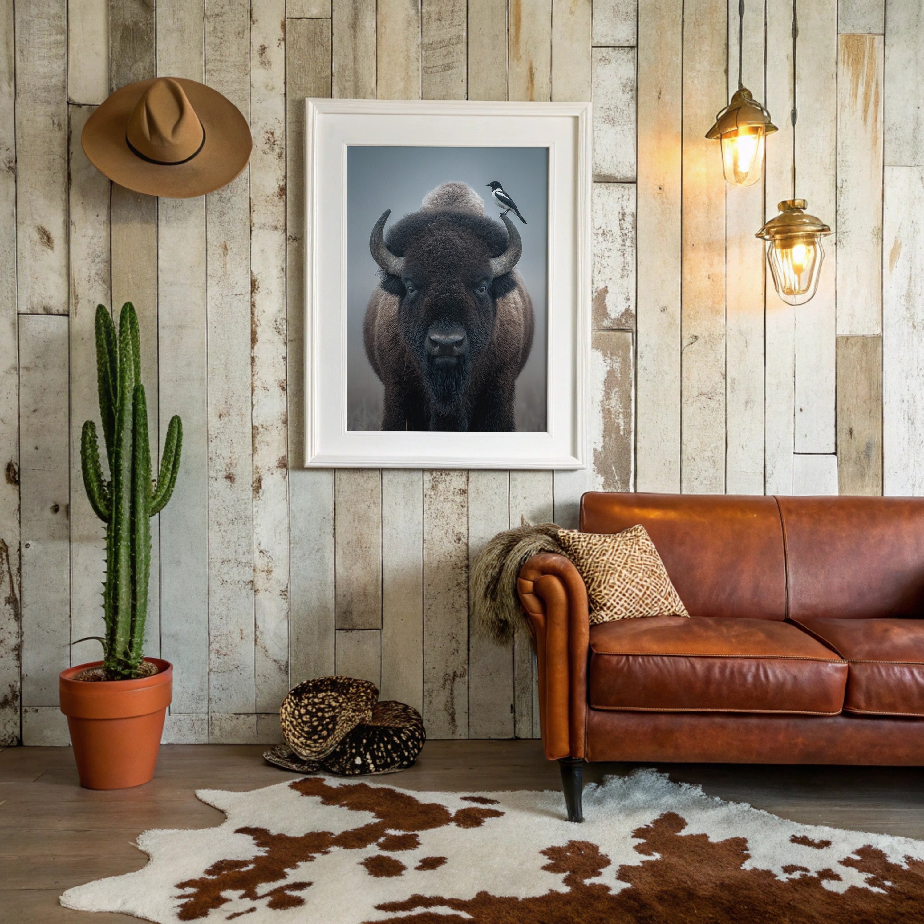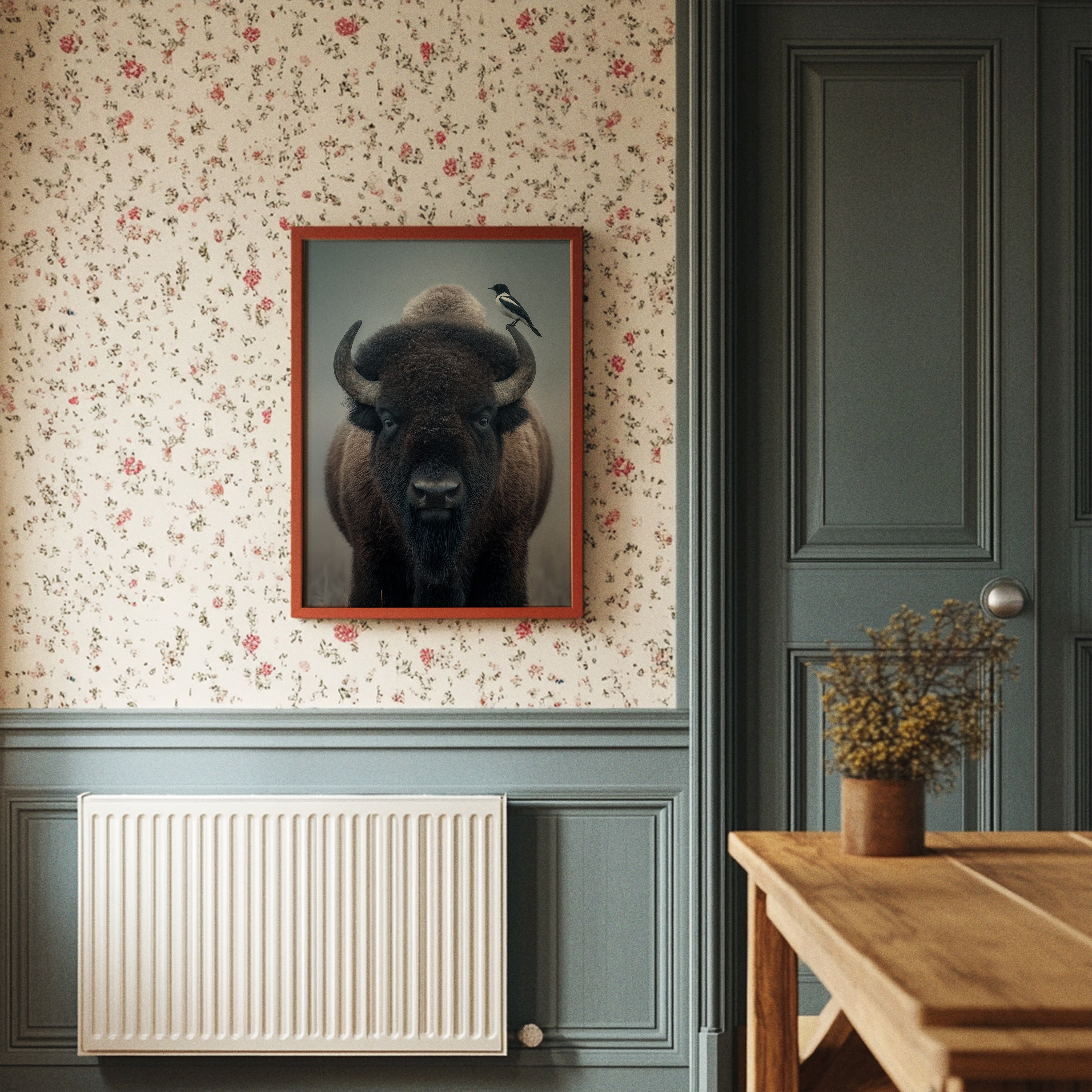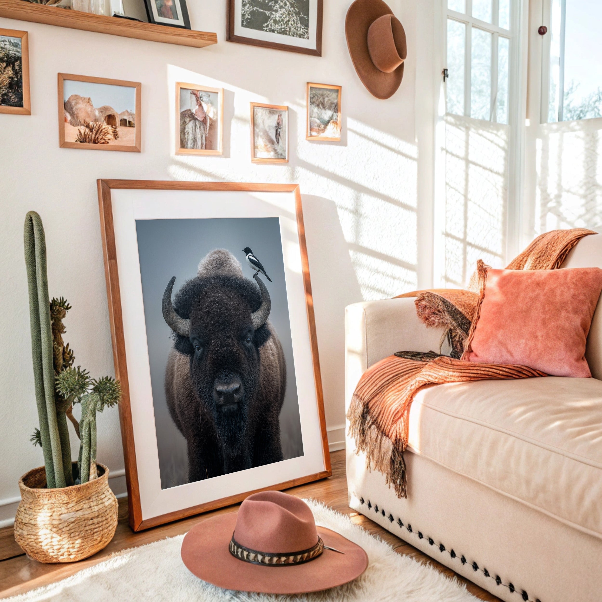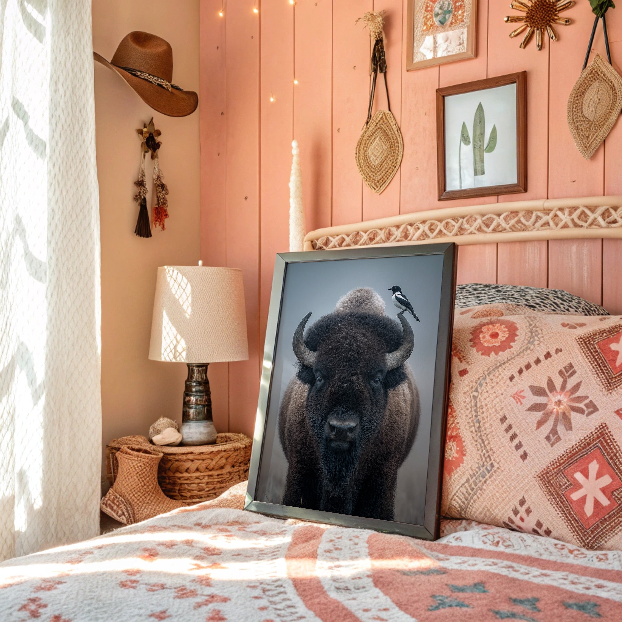 A majestic bison stands in stoic contemplation, its powerful presence commanding attention while a delicate magpie perches boldly atop its massive form. The contrast between the bison's rugged strength and the bird's graceful poise creates an unexpected partnership that speaks to nature's surprising harmonies. Rich textures of the bison's dense fur catch subtle light, while the magpie's sleek feathers add a flash of contrast against the moody atmospheric background. This striking portrait brings untamed prairie spirit into contemporary spaces, making a dramatic statement in modern rustic interiors, home offices, or lodge-inspired living rooms.