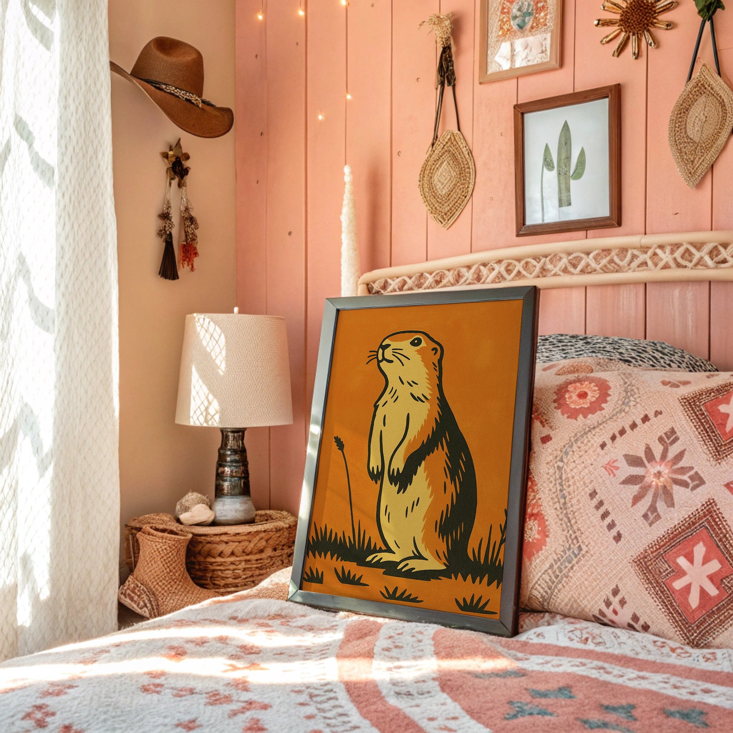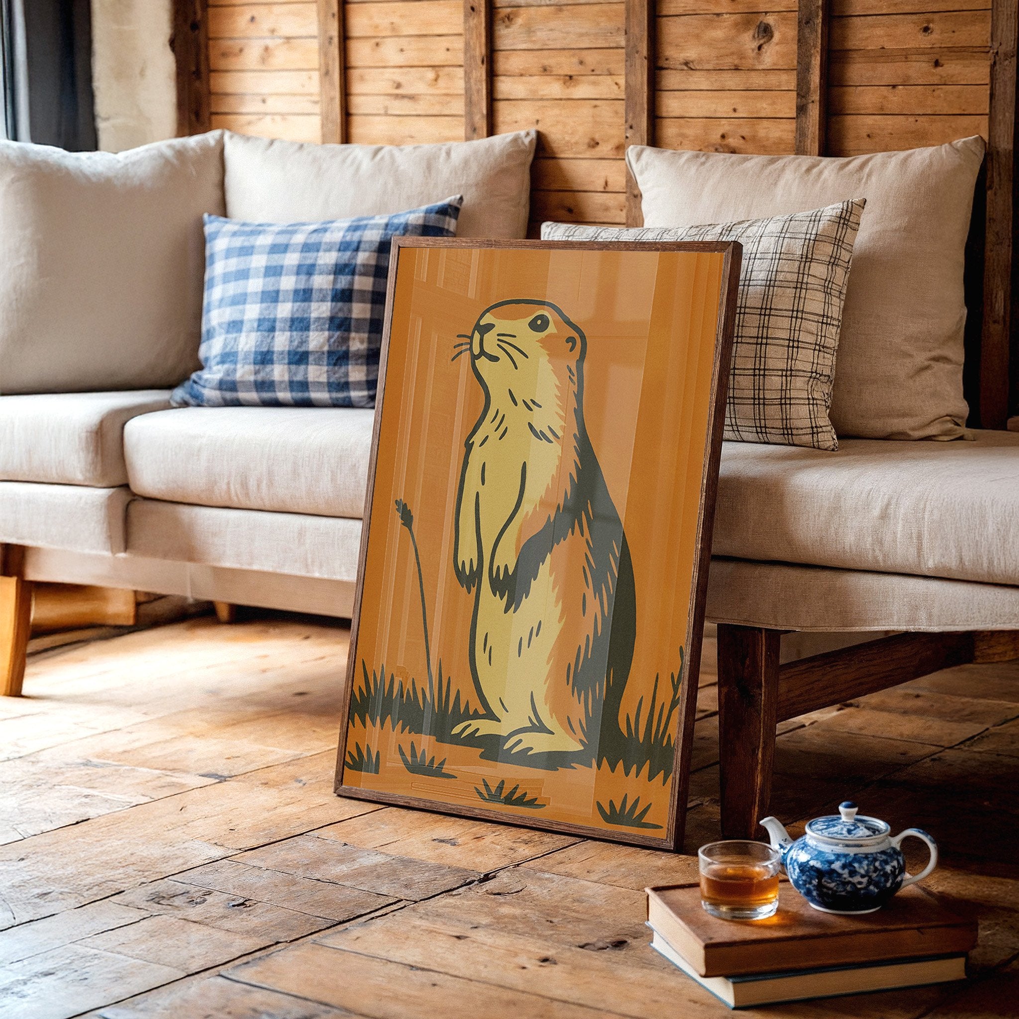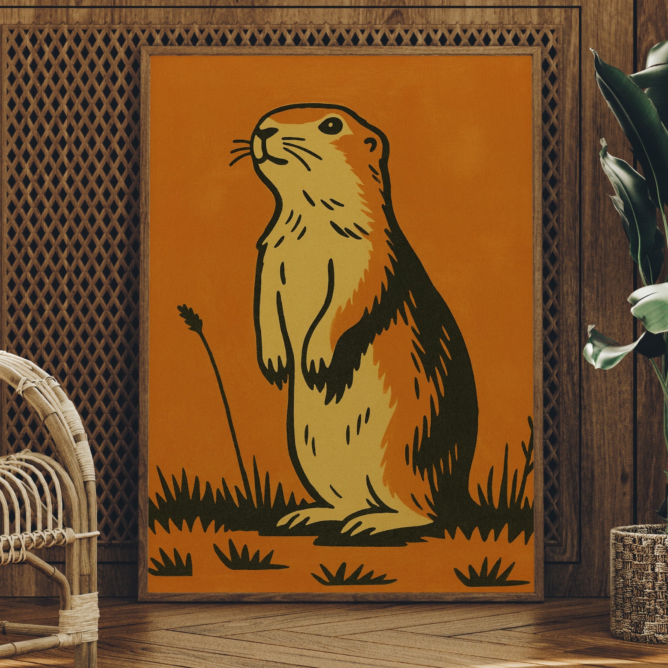 Morning light catches the curious gaze of a prairie dog, illustrated in bold strokes against a warm amber backdrop. The minimalist design captures the creature's alert posture and gentle spirit, rendered in earthy yellows and rich browns that echo the natural world it inhabits. This southwestern-inspired piece brings a touch of rustic charm and playful character to any thoughtfully curated space.