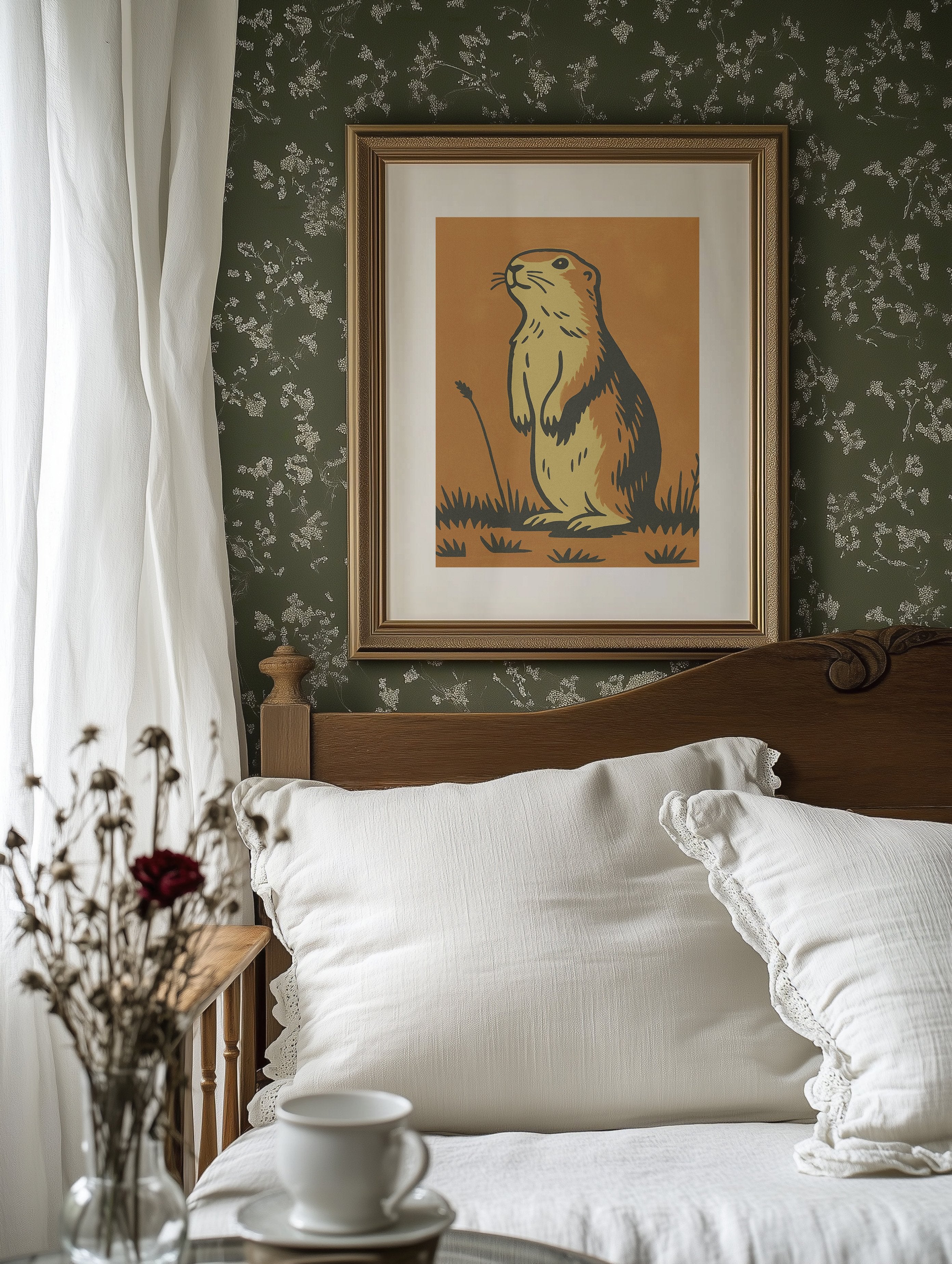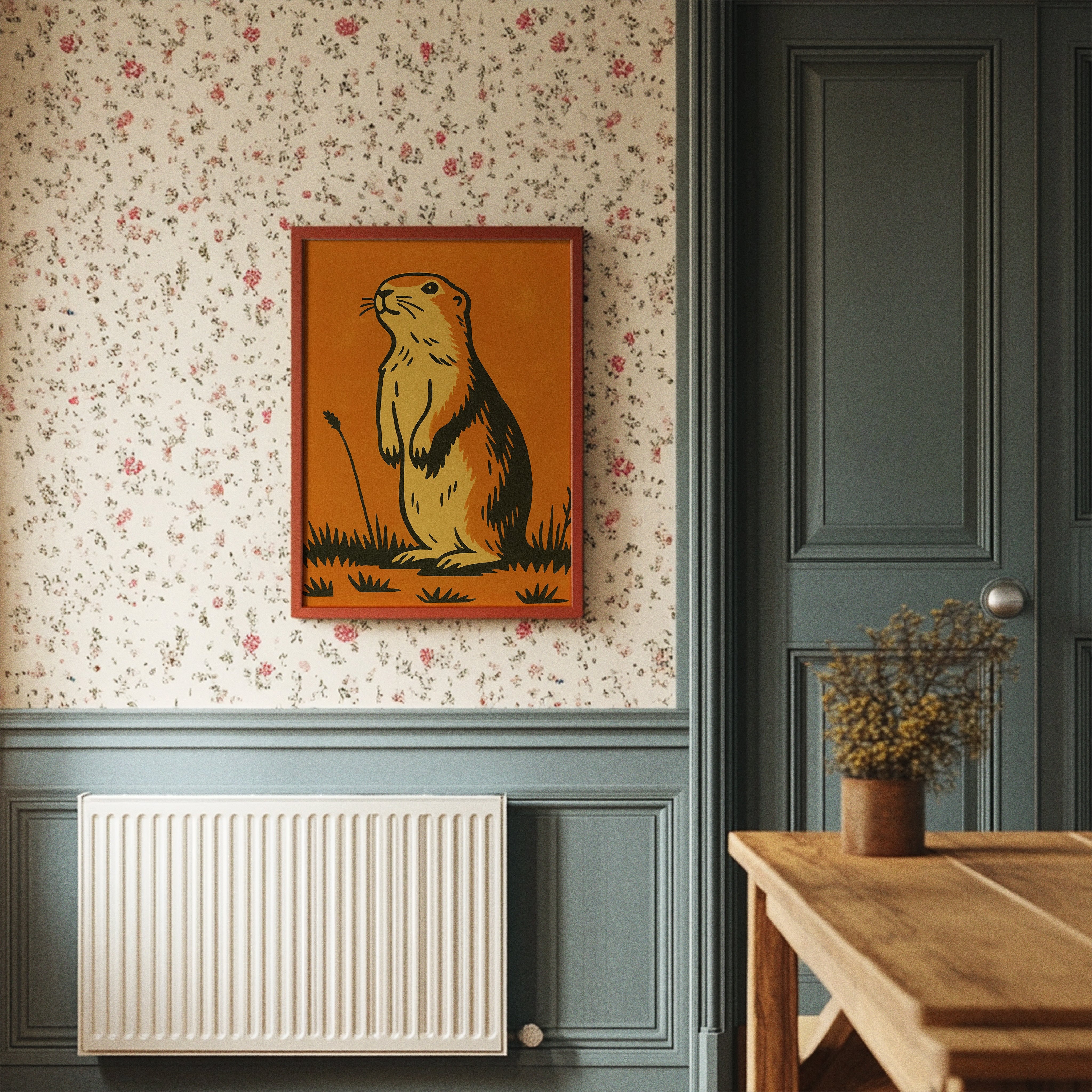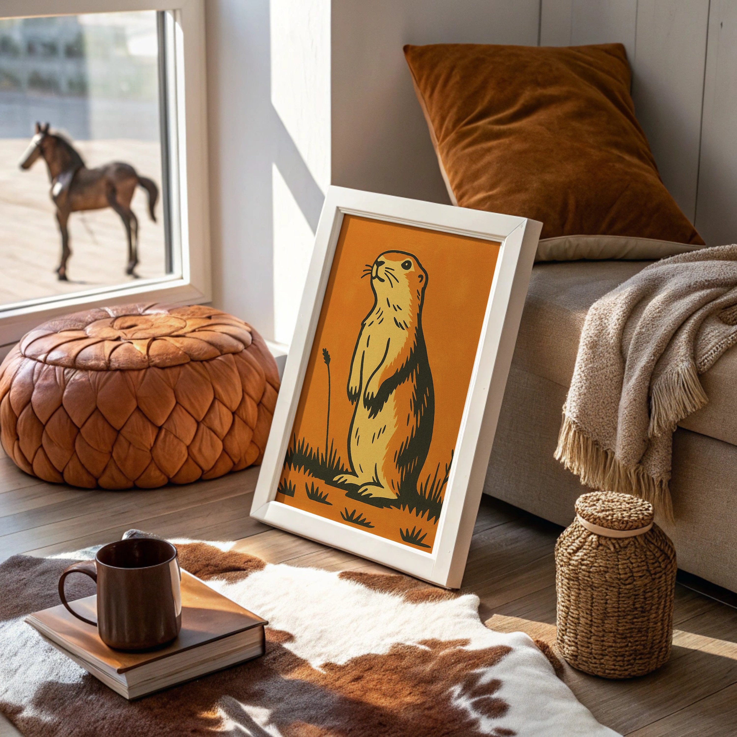 Morning light catches the curious gaze of a prairie dog, illustrated in bold strokes against a warm amber backdrop. The minimalist design captures the creature's alert posture and gentle spirit, rendered in earthy yellows and rich browns that echo the natural world it inhabits. This southwestern-inspired piece brings a touch of rustic charm and playful character to any thoughtfully curated space.