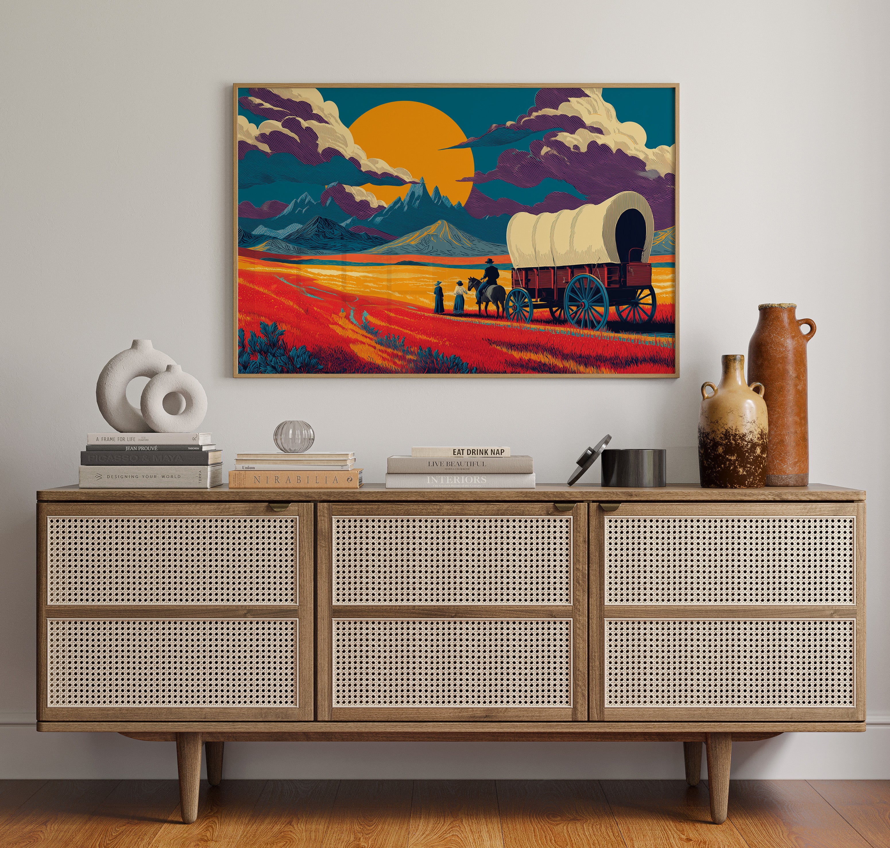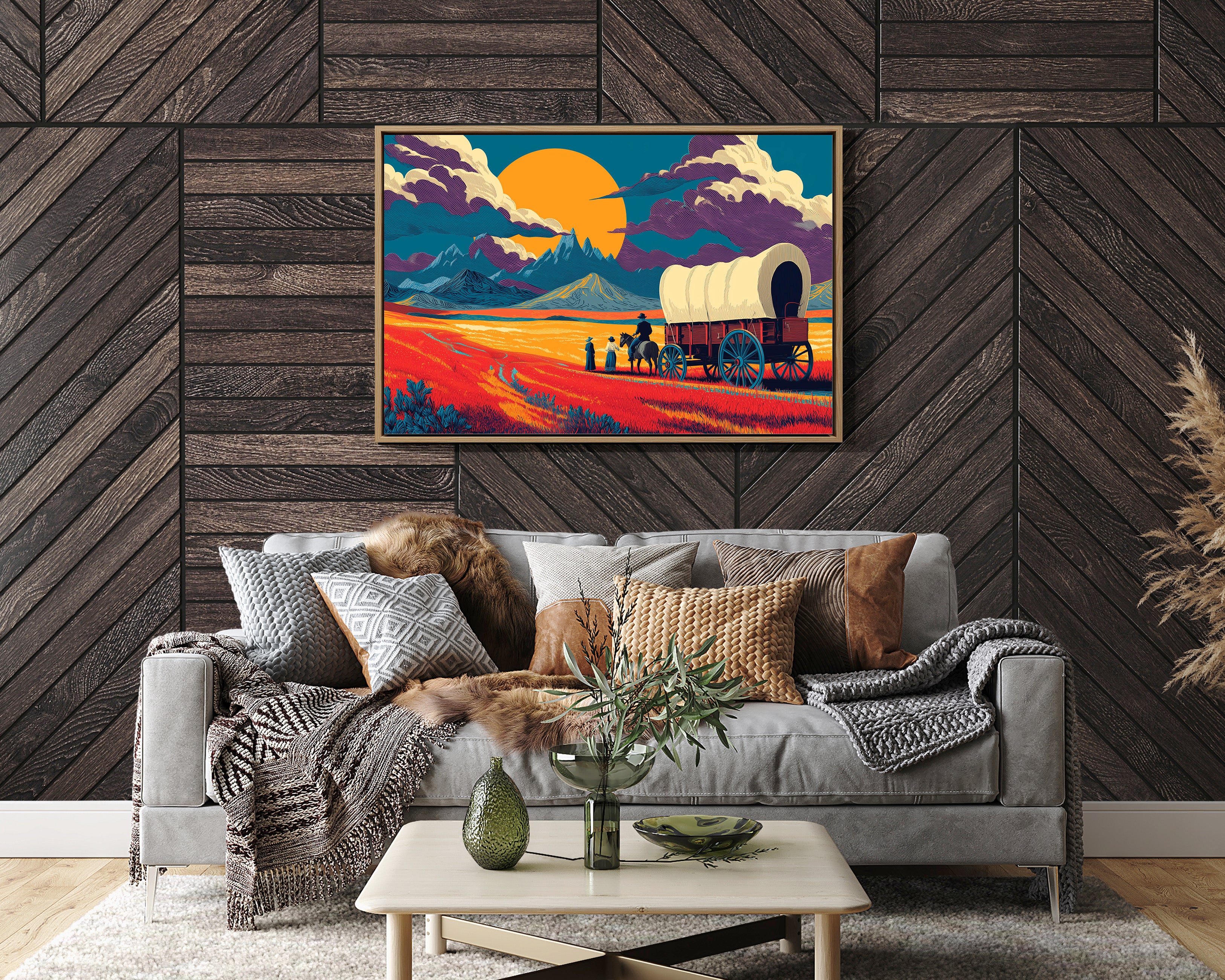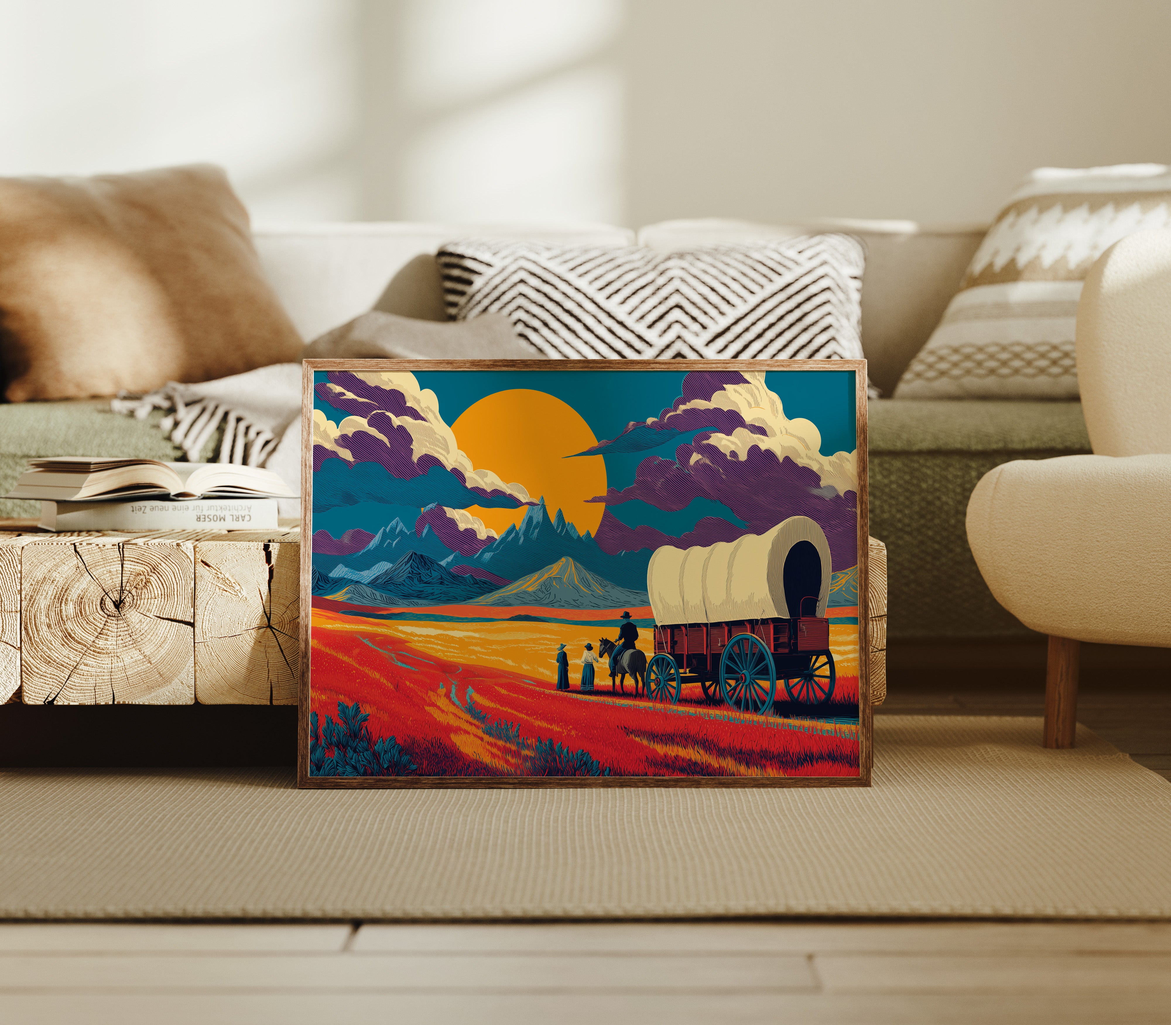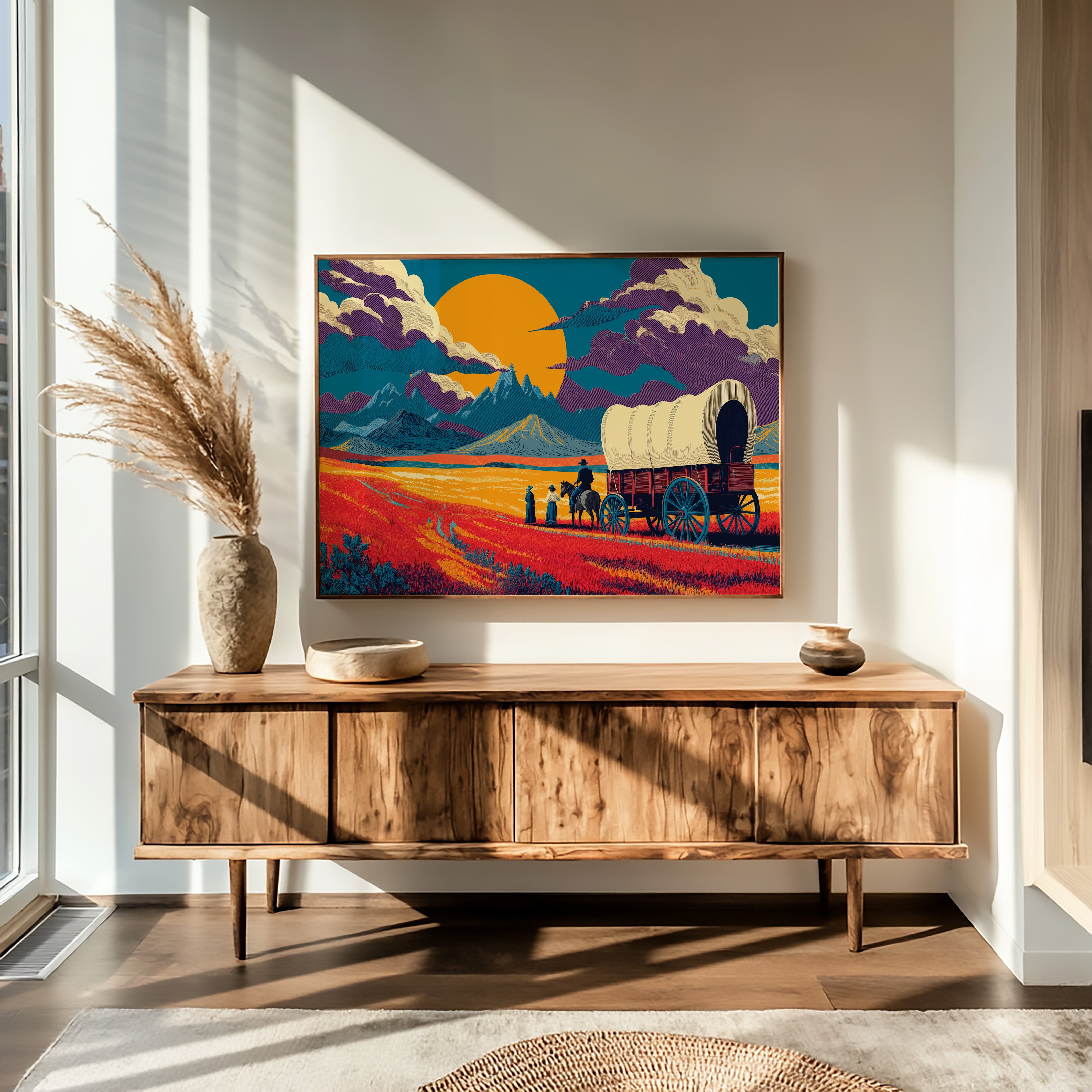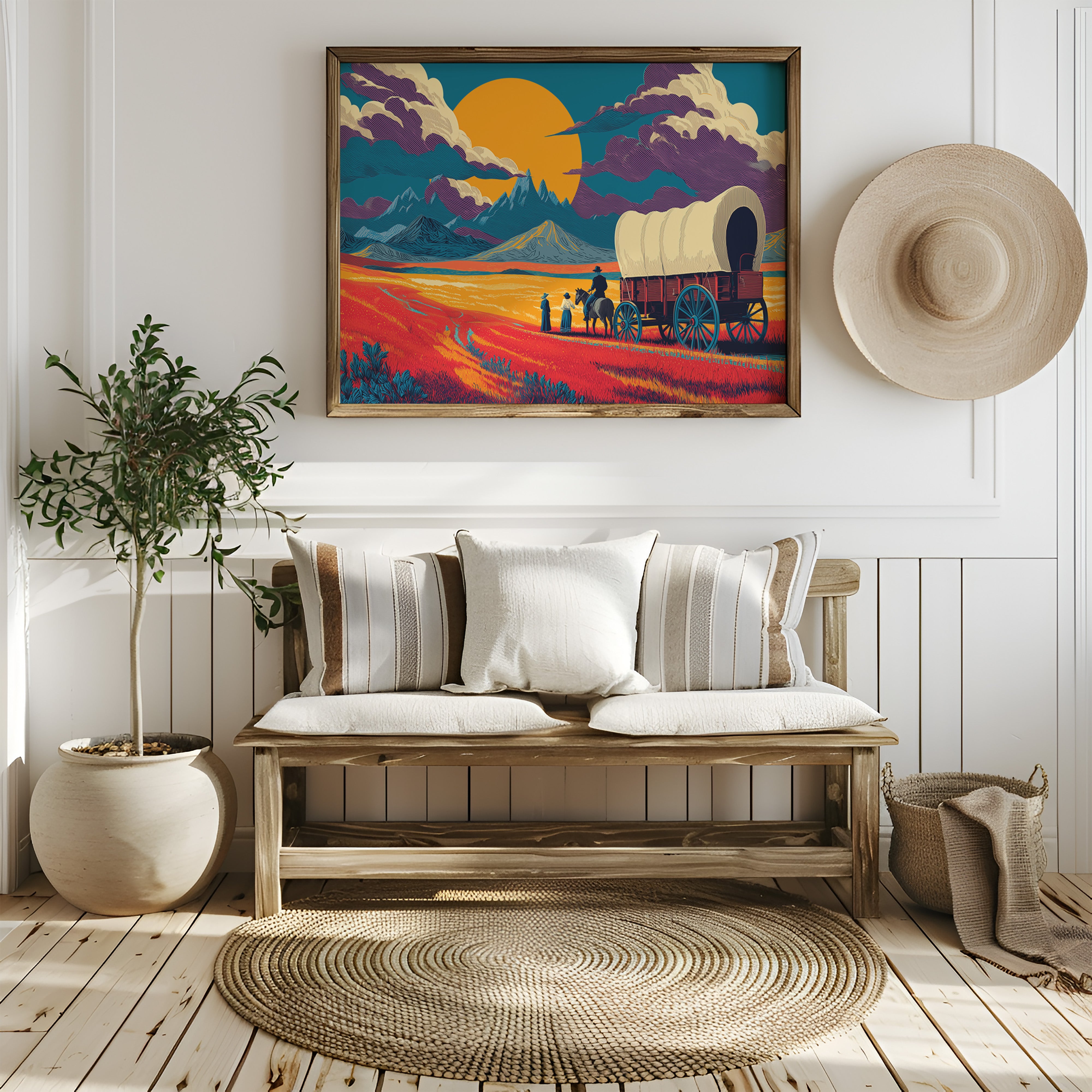 Time stands still in the golden hour, where scarlet prairie grass bends beneath an impossibly large sun. This striking piece from our Contemporary collection reimagines the classic American frontier through a bold, modern lens. Dramatic purple clouds roll across a teal sky, while pioneering figures pause their westward journey, silhouetted against mountains that pierce the horizon like ancient guardians. The composition's saturated oranges and deep teals create a mesmerizing interplay of warm and cool tones, capturing that magical moment when day surrenders to dusk. This statement piece commands attention in a modern living room or adds historical gravitas to a study, where its story of adventure and possibility can inspire daily contemplation.