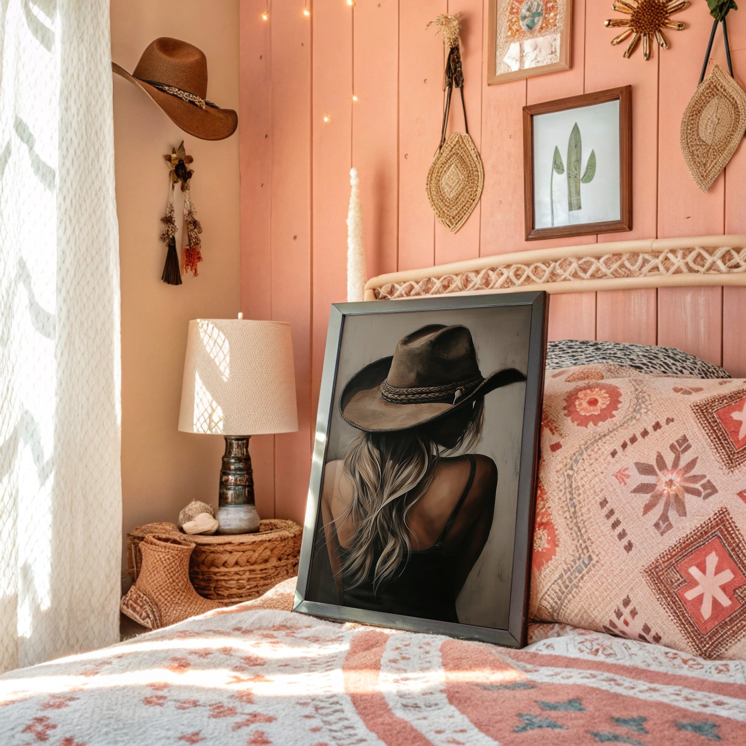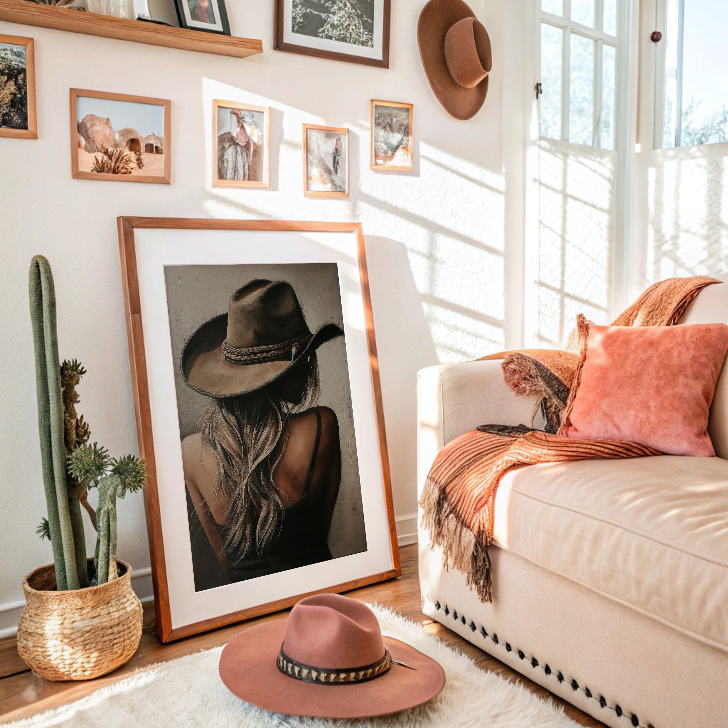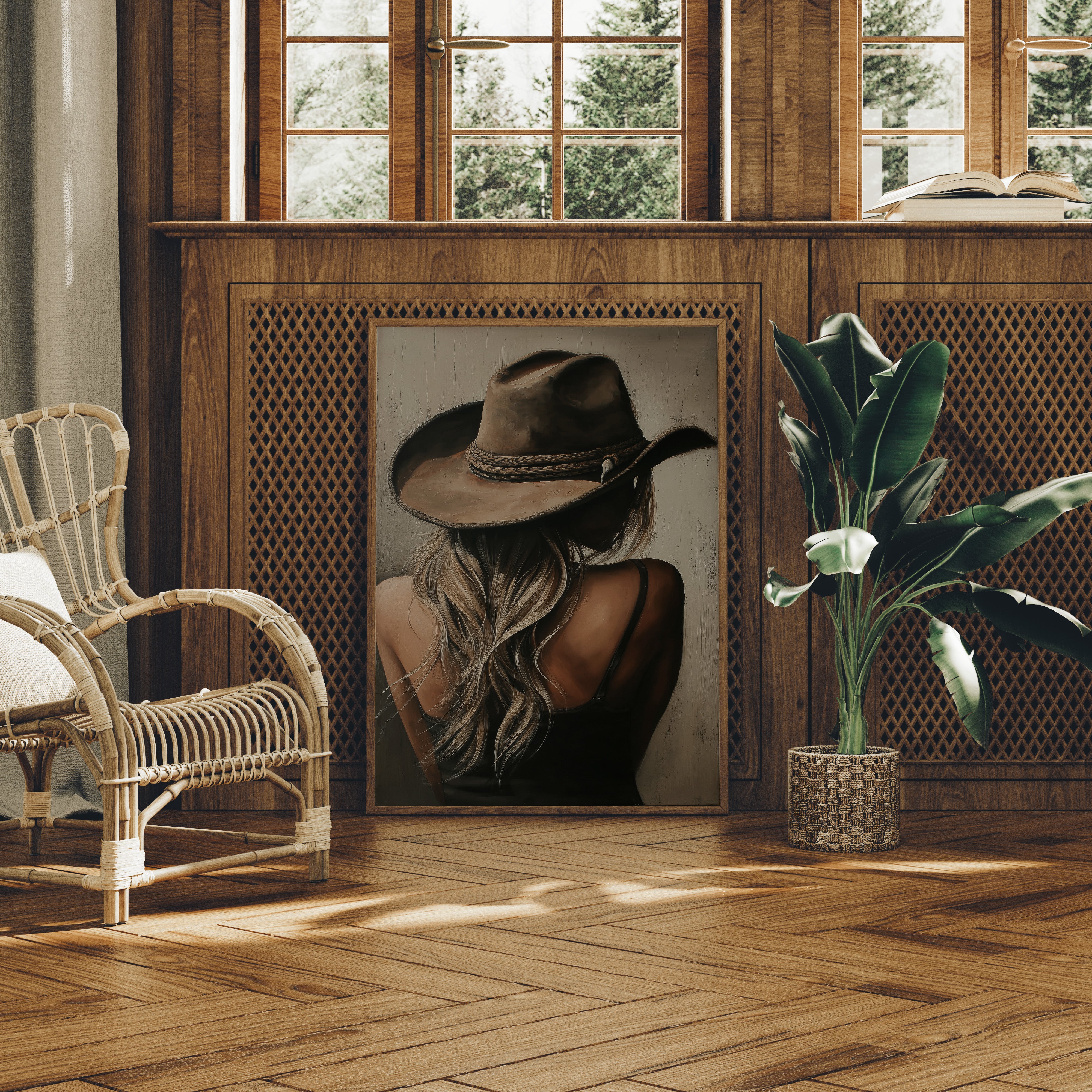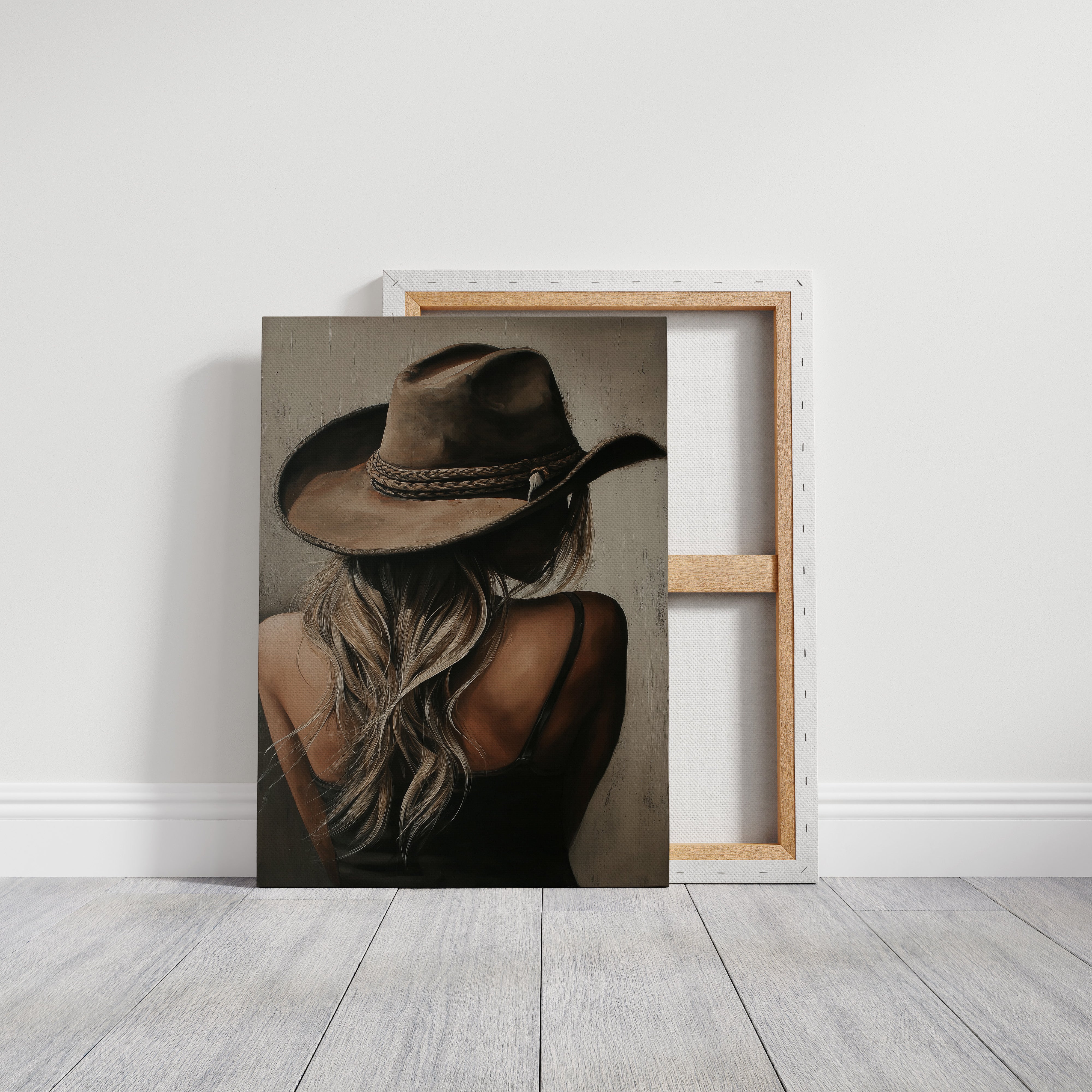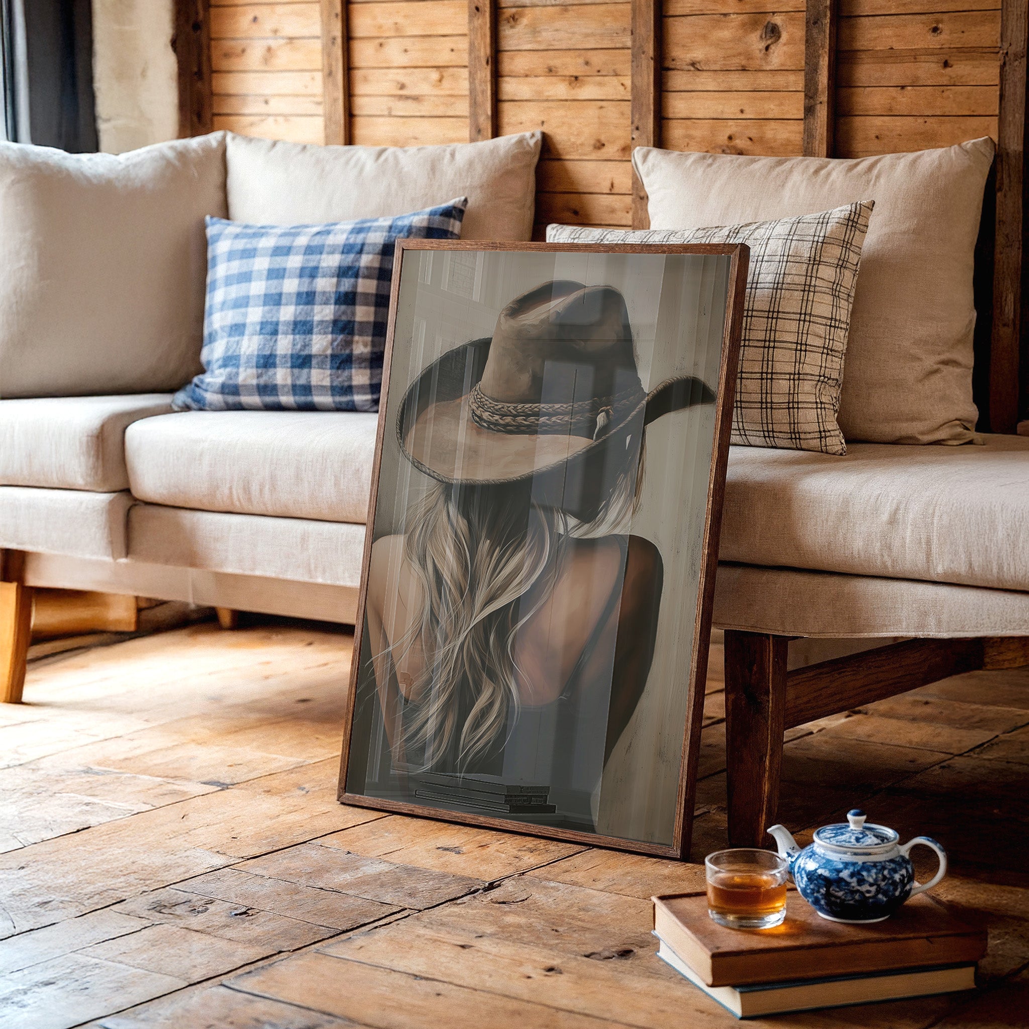 Sunlight catches golden strands beneath the wide brim of a weathered hat, telling tales of open skies and untamed spirits. This piece from our Contemporary collection bridges classic Western aesthetics with modern portraiture. Rich sepia tones and dramatic shadows dance across the composition, while flowing hair and supple leather create a striking interplay of textures that speaks to both strength and grace. The understated elegance of the backward glance creates an air of mystery that draws viewers into their own storytelling moment. Perfect for adding sophisticated rustic charm to a living room or study, where its timeless appeal can anchor a collected, well-traveled aesthetic. The image invites quiet contemplation while celebrating the enduring allure of Western heritage.