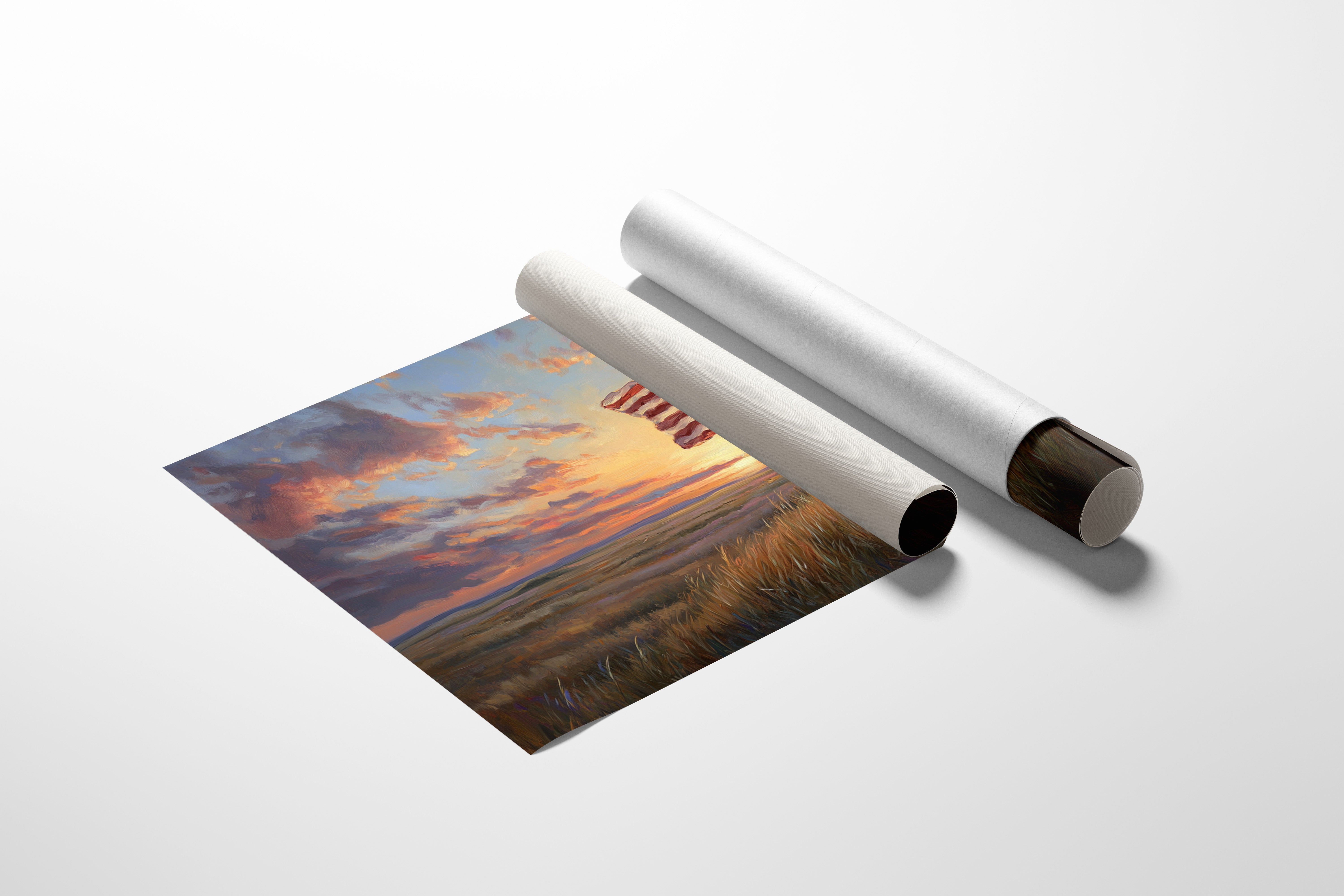 Golden light pierces through dramatic clouds, casting a warm glow across endless grasslands. A solitary American flag waves proudly against the painted sky, its stars and stripes dancing with purpose in the evening breeze. Rich brushstrokes capture the texture of amber prairie grass swaying beneath, while purple mountains fade into the distance like silent guardians of the landscape. This piece brings the heartland's spirit into any space, perfect for creating a focal point in a study, living room, or any area where you want to celebrate American heritage with artistic sophistication.