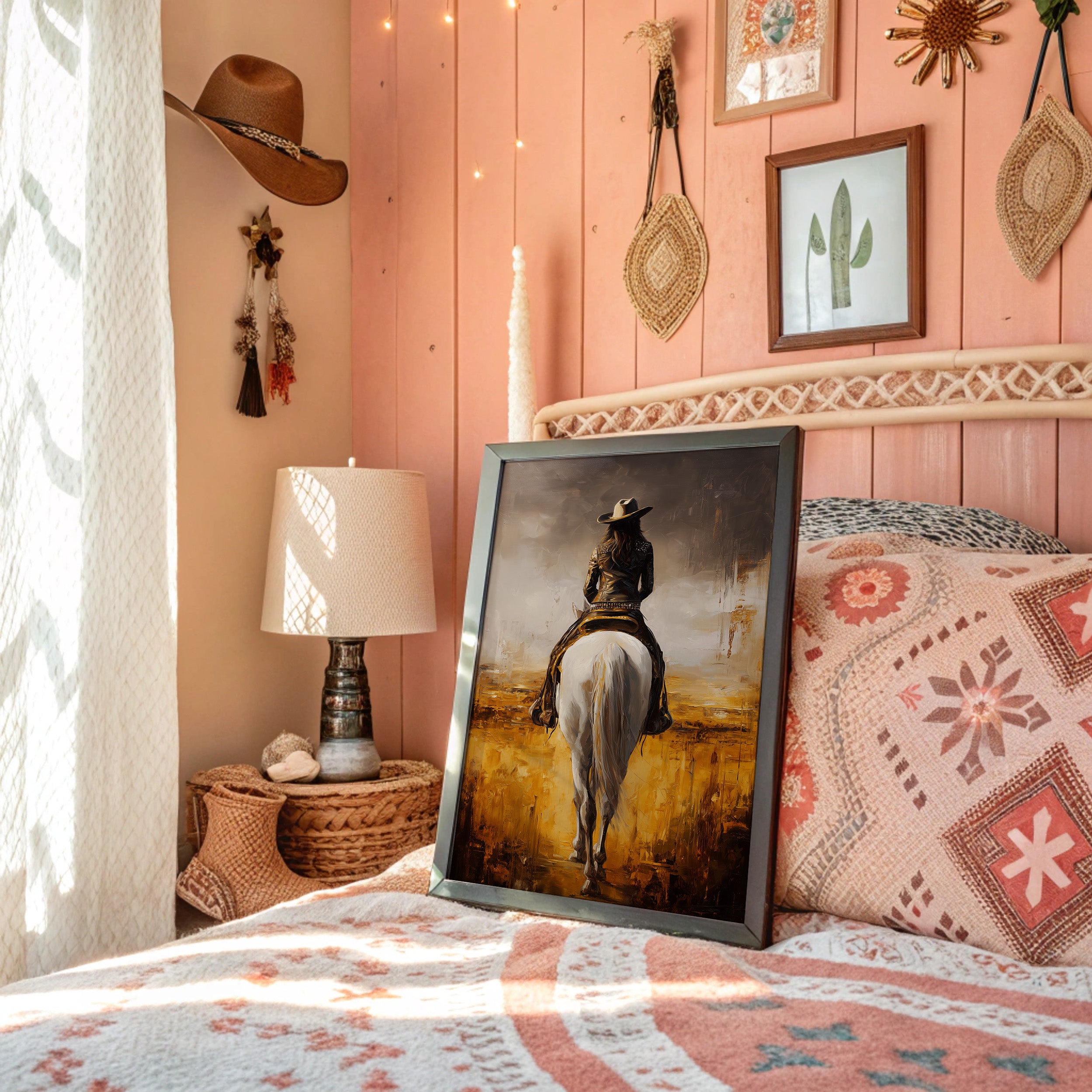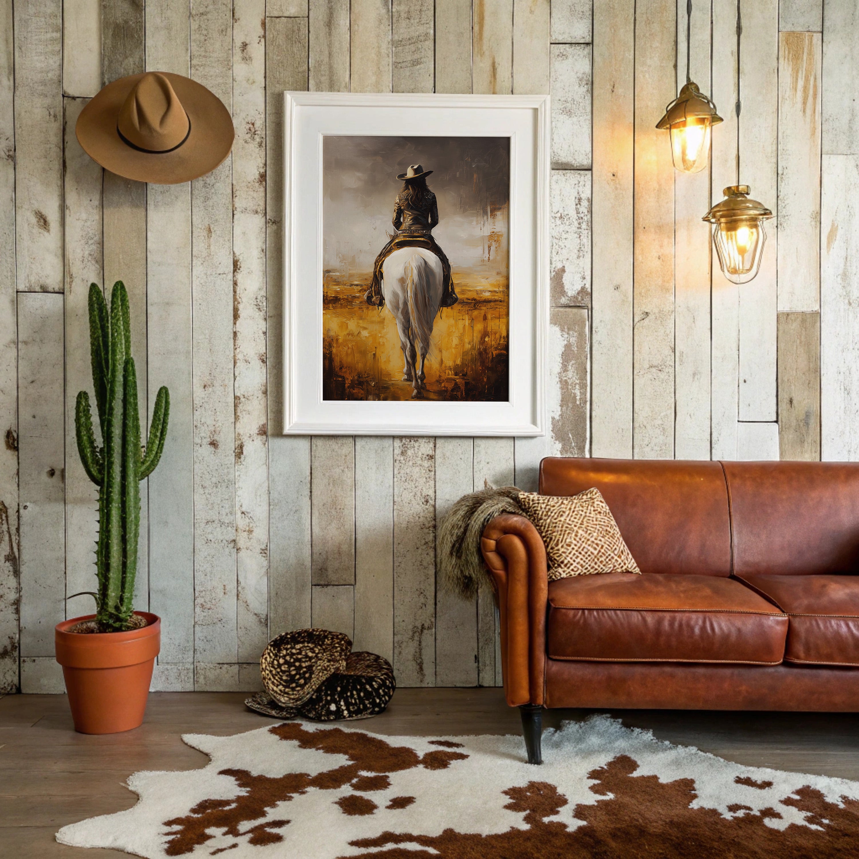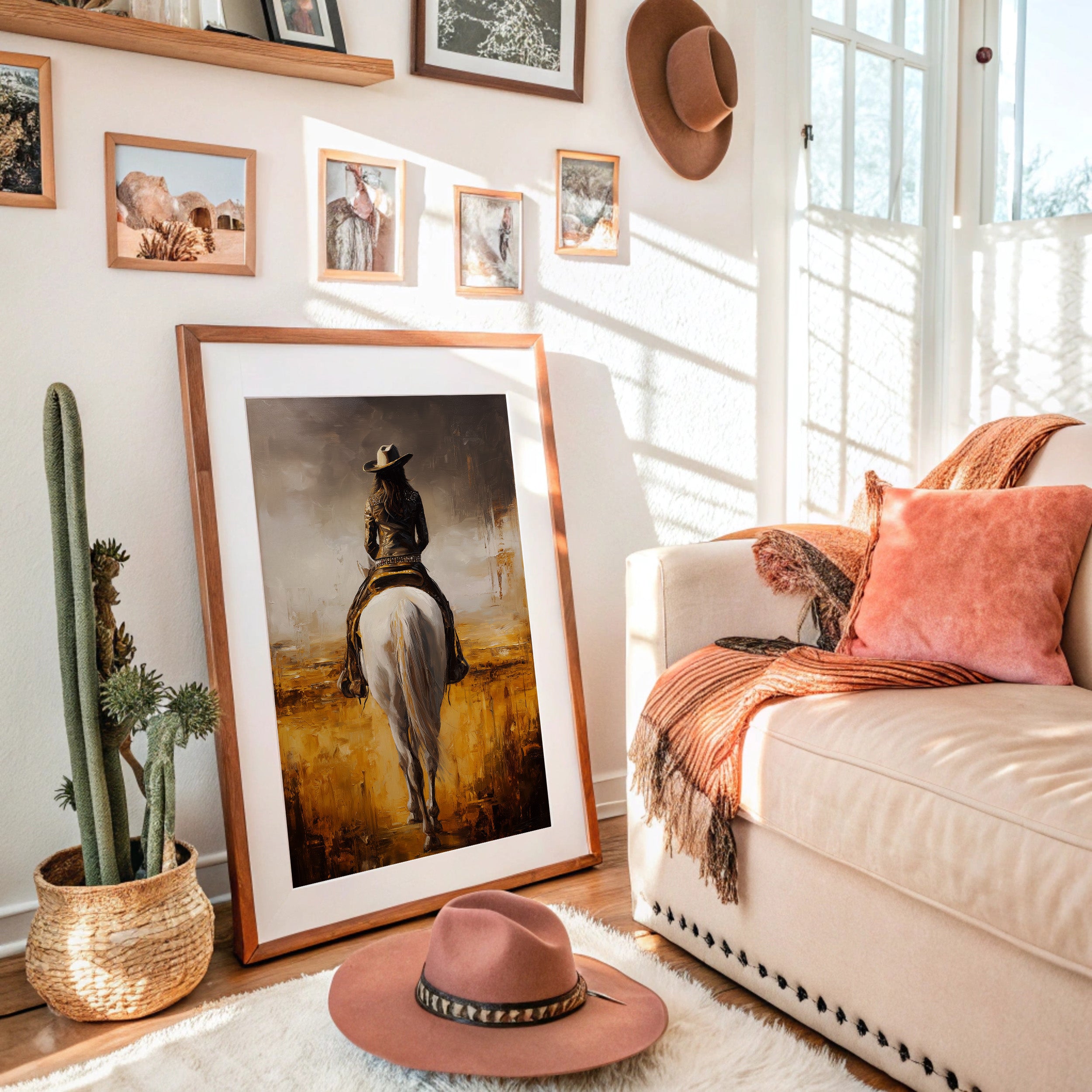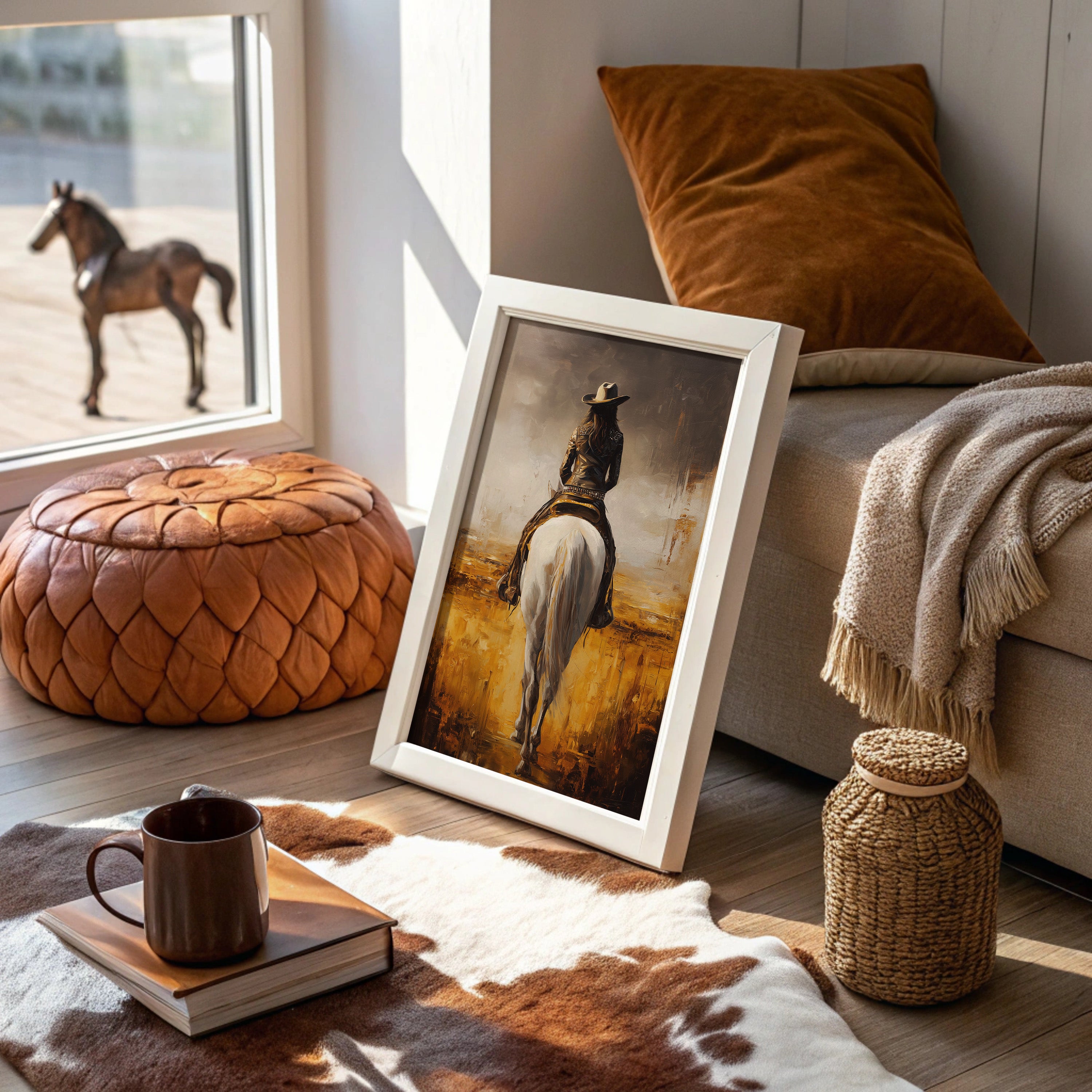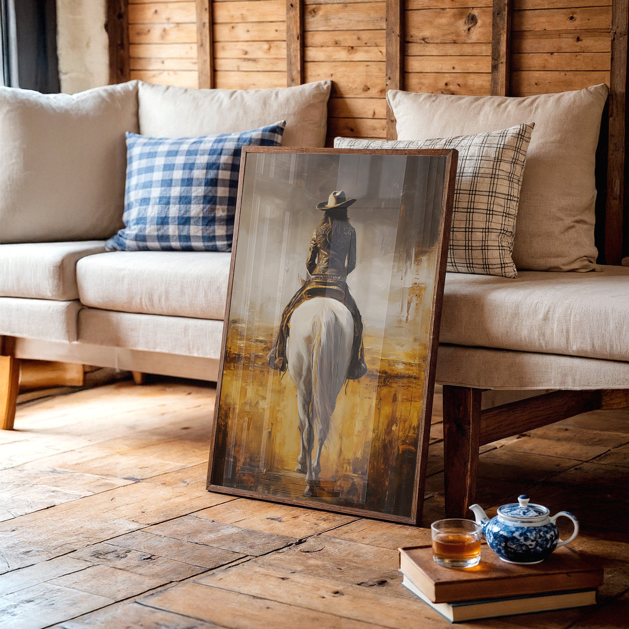 Dust motes dance in golden light as leather meets morning air, capturing a moment of solitary grace on horseback. This piece from our Contemporary collection merges classic Western imagery with modern artistic expression. Rich amber tones wash across the canvas like sunrise on prairie grass, while bold brushstrokes capture the quiet strength of rider and mount in perfect harmony. The composition draws the eye forward into an endless horizon, suggesting both motion and stillness in one timeless scene. This striking piece becomes a focal point in any room, particularly suited to spaces that celebrate the bold spirit of the American West. Its warm palette and powerful presence make it an especially compelling addition to living rooms or studies where stories gather.