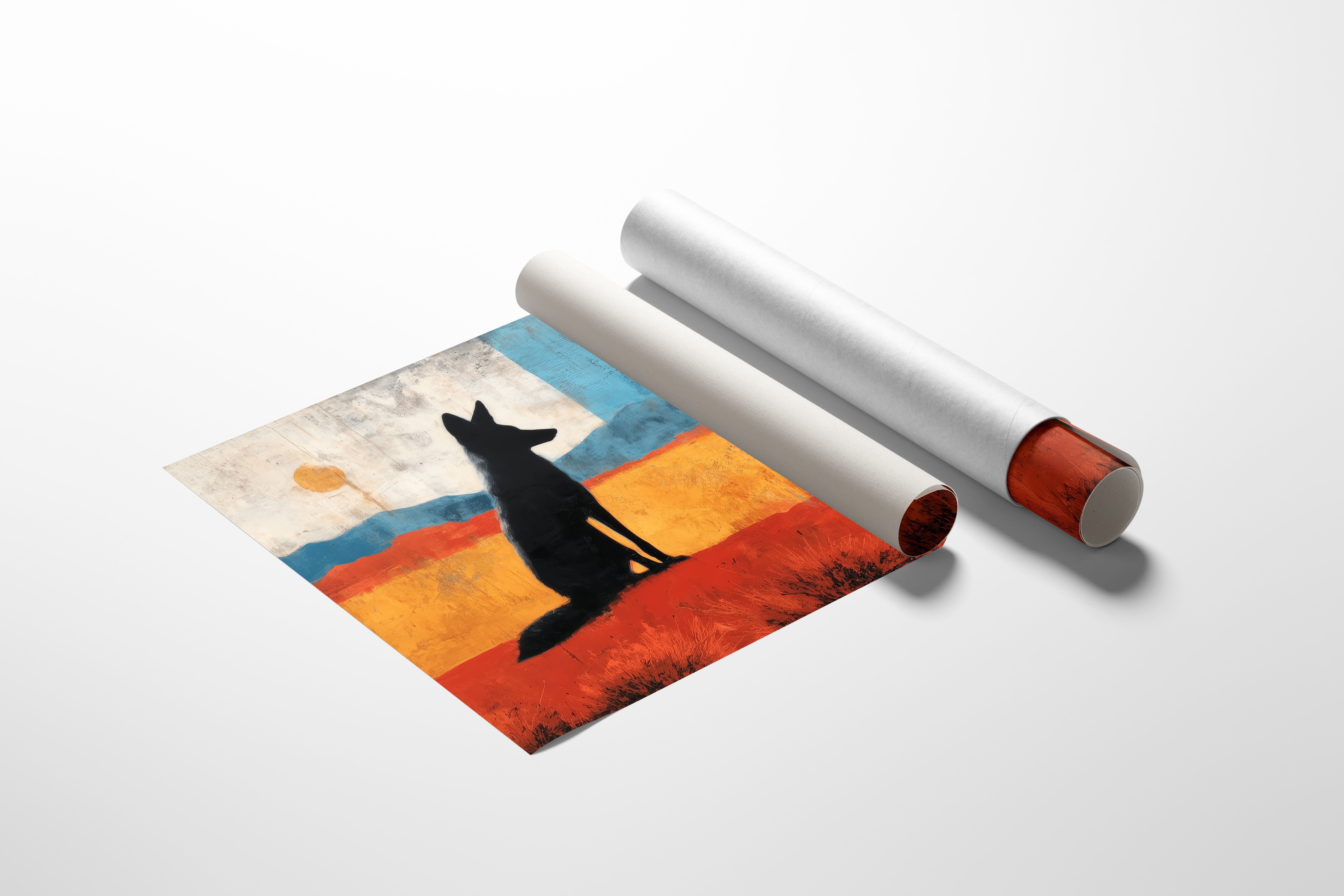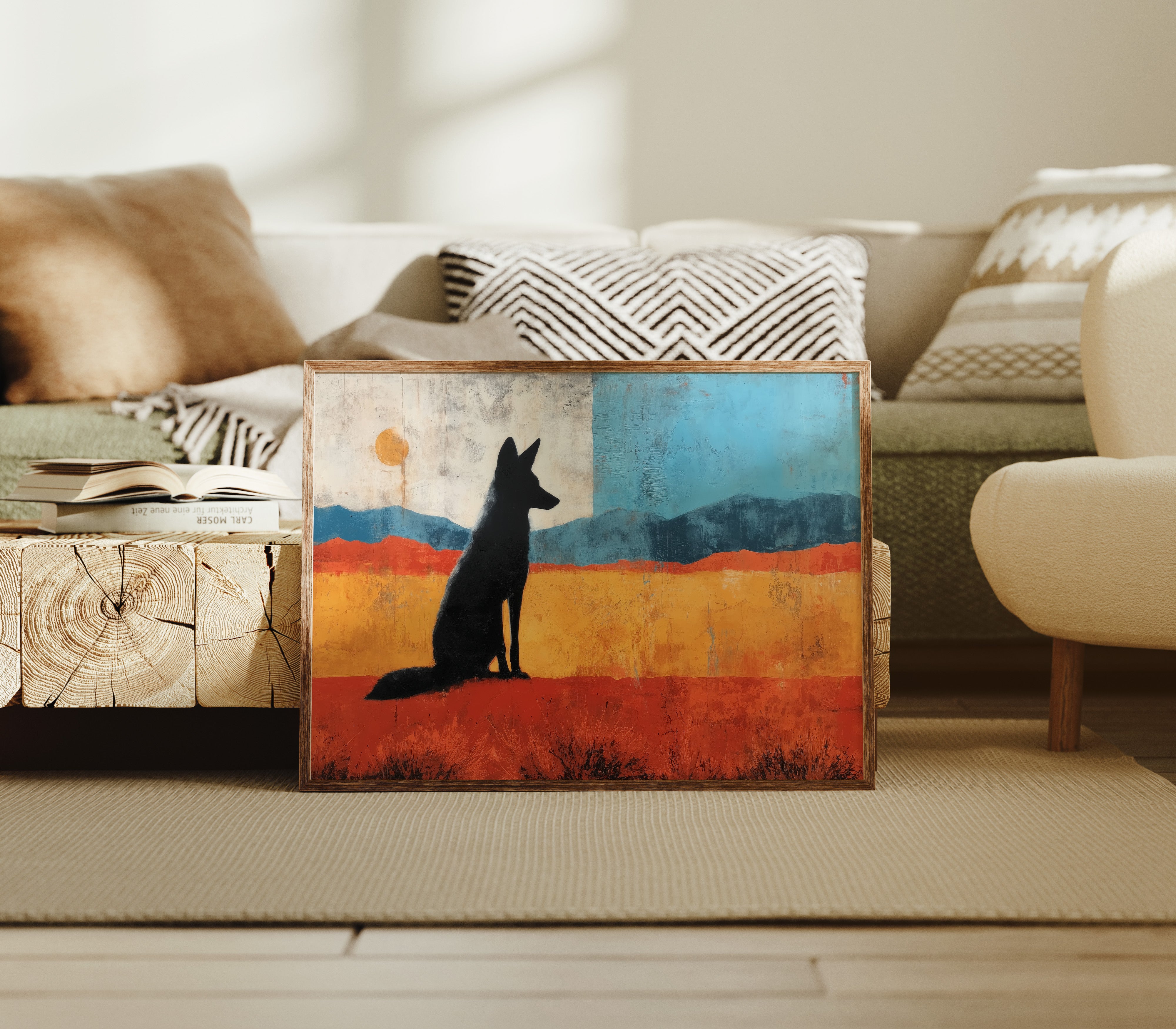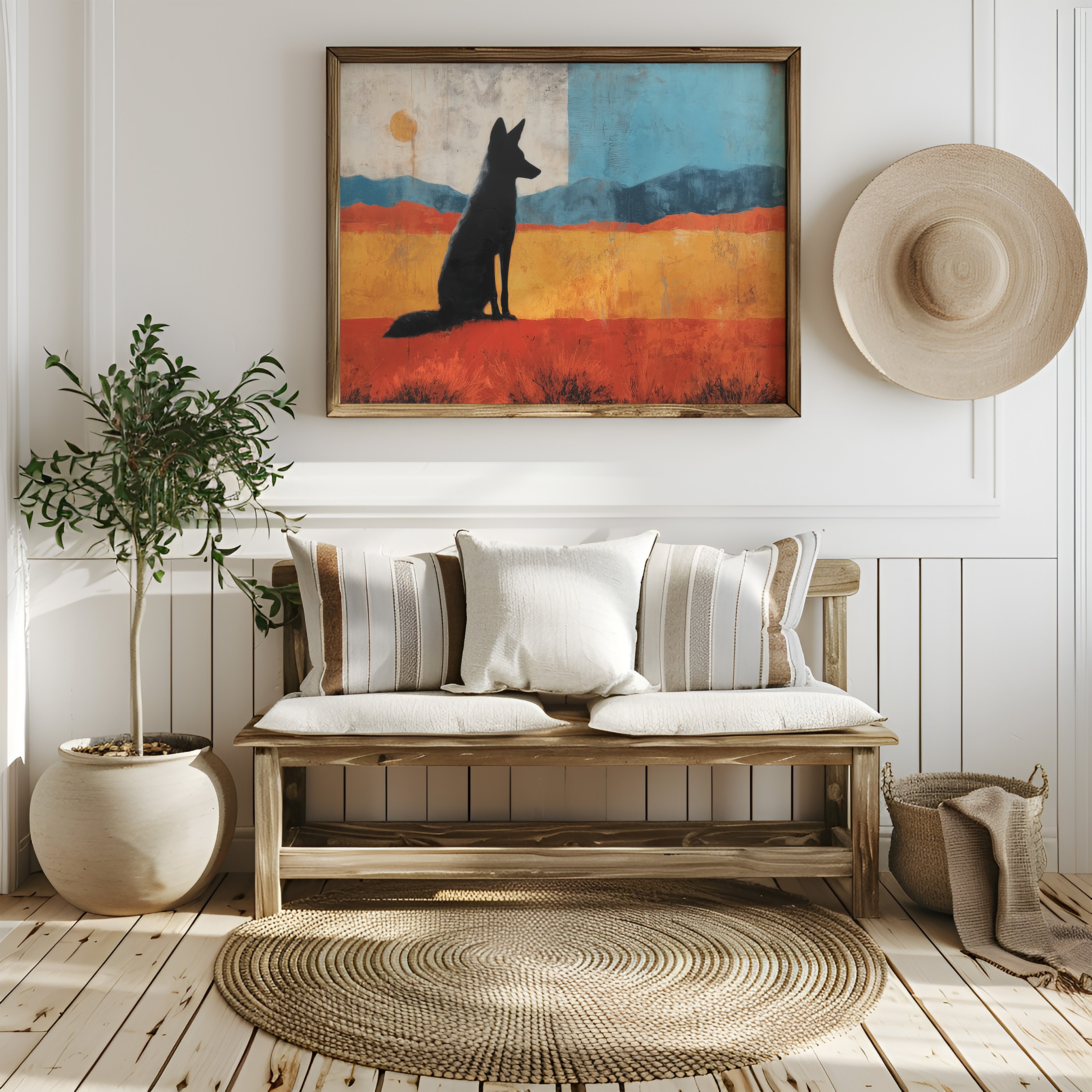 A lone silhouette stands sentinel against a luminous dawn, where golden fields meet azure mountains. From our Contemporary collection, this piece captures the bold minimalism of modern southwestern art. The striking contrast between the wolf's dark form and the vibrant landscape creates a powerful narrative of solitude and strength, while layers of ochre, crimson, and turquoise paint a story of wild spaces untamed. This statement piece brings dramatic serenity to modern living rooms or offices, creating an anchor point that draws the eye while maintaining sophisticated simplicity. Its presence reminds us of nature's quiet dignity in our busy world.