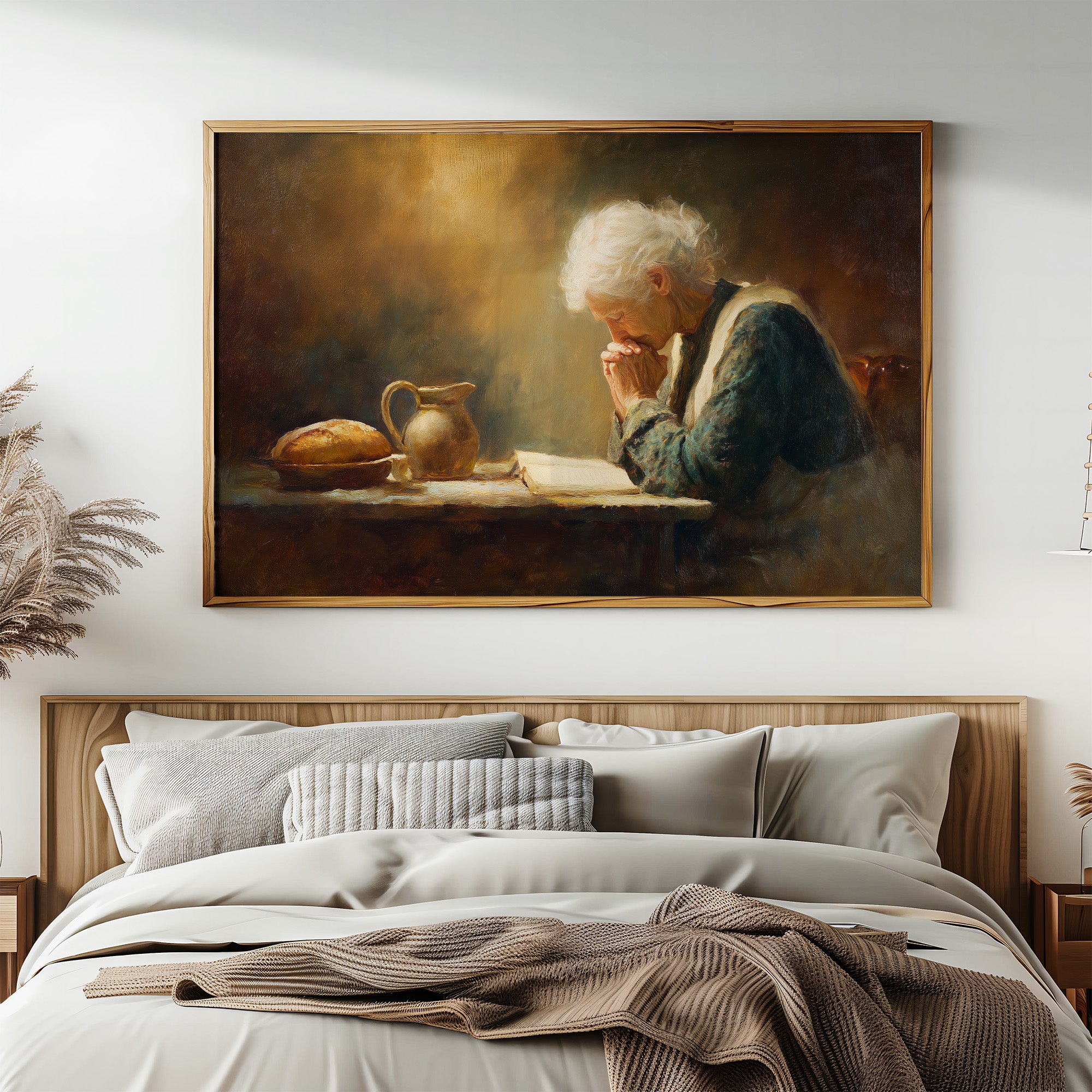 Warm light falls across weathered hands folded in devotion, creating a moment suspended in reverent stillness. The rich amber glow bathes the elderly figure in contemplative solitude, while the earthen pottery and open book speak of simple faith and daily ritual. This thoughtful portrait rests among literary companions and dried pampas grass, creating a sanctuary of reflection within the modern home.