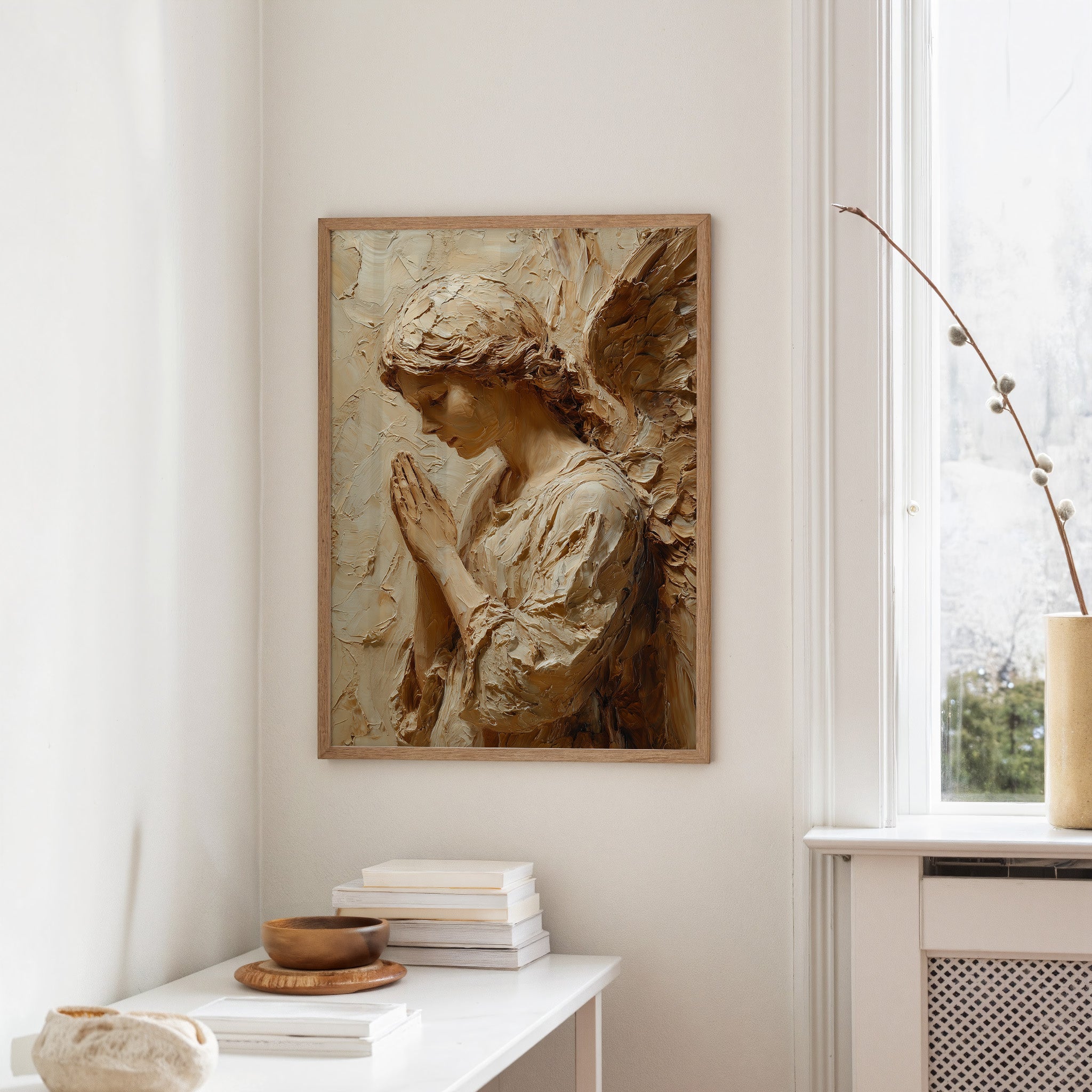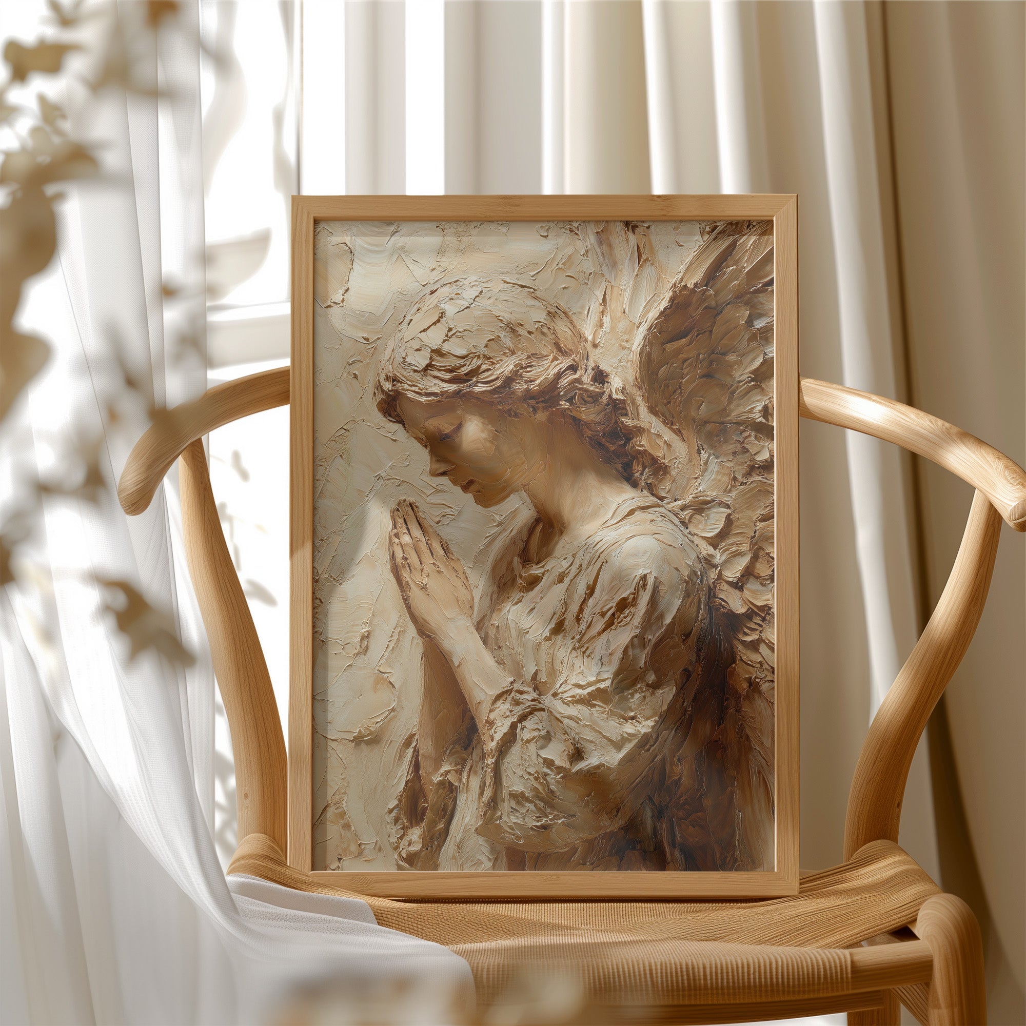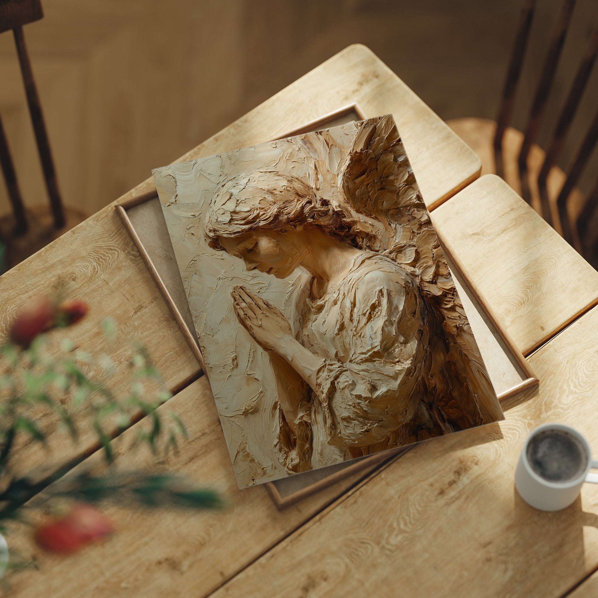 Sunlight washes over textured strokes of clay, bringing warmth to a moment of divine contemplation. The sculptural relief captures delicate features in profile, hands pressed together in reverent prayer, with each ridge and hollow telling a story of devotion. The natural wooden table beneath creates a sanctuary for this sacred piece, where morning light and shadows play across its dimensional surface.