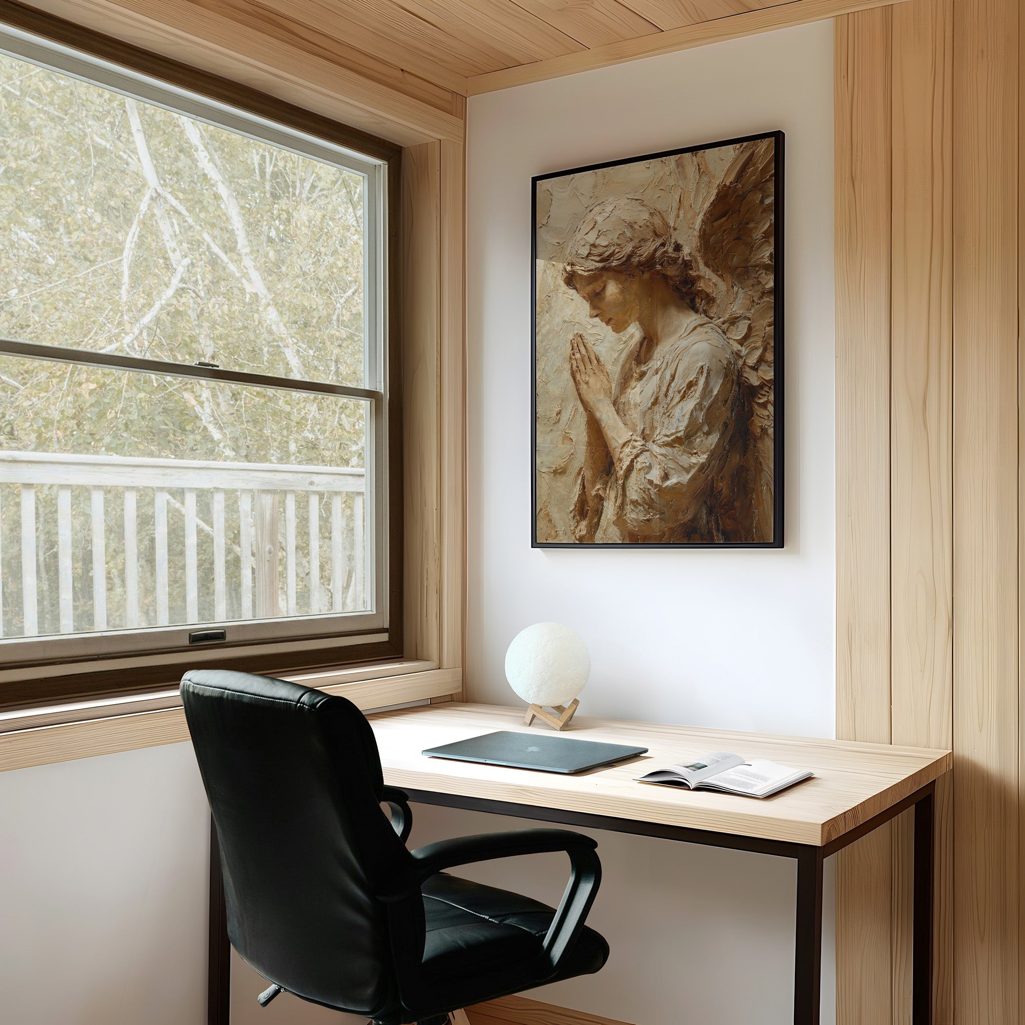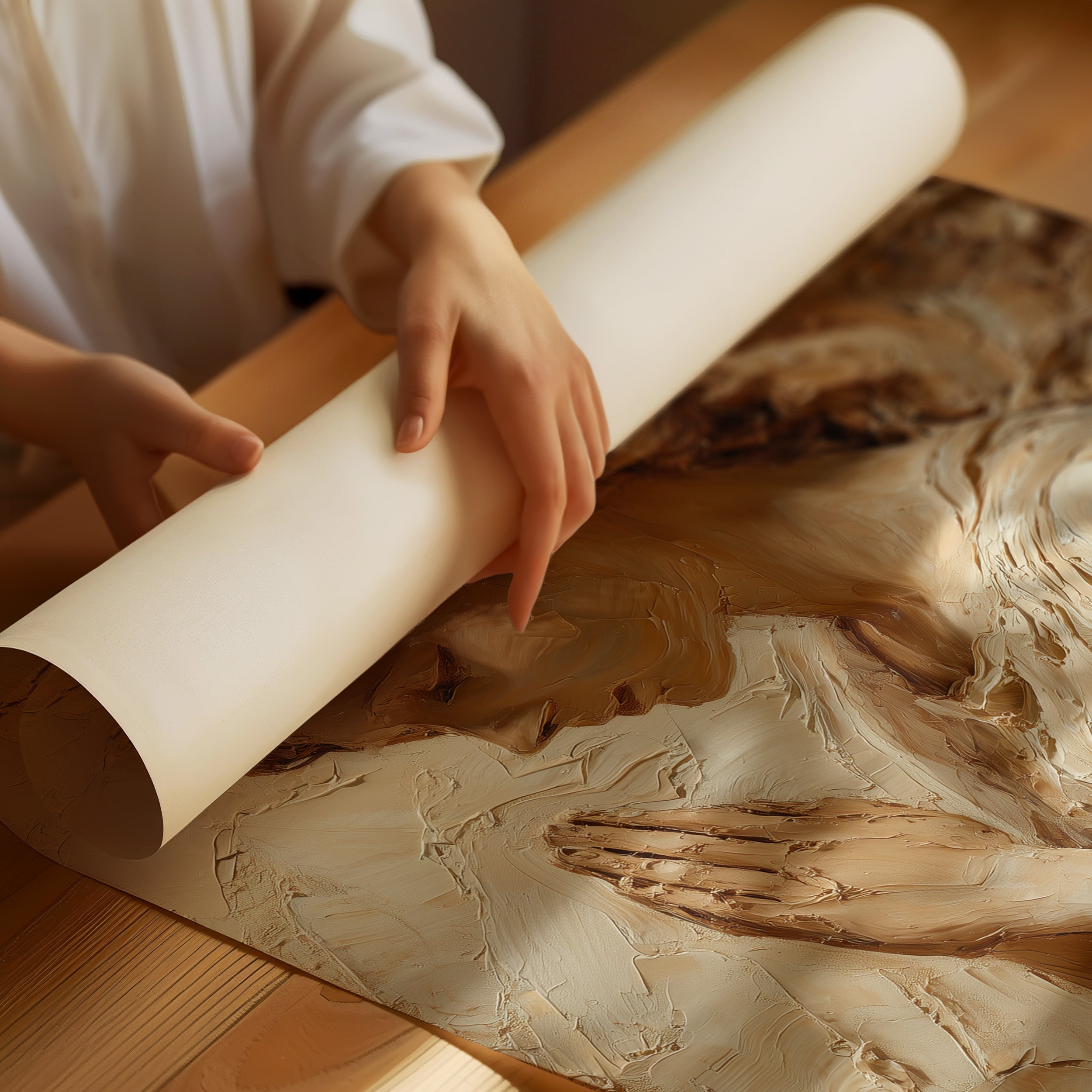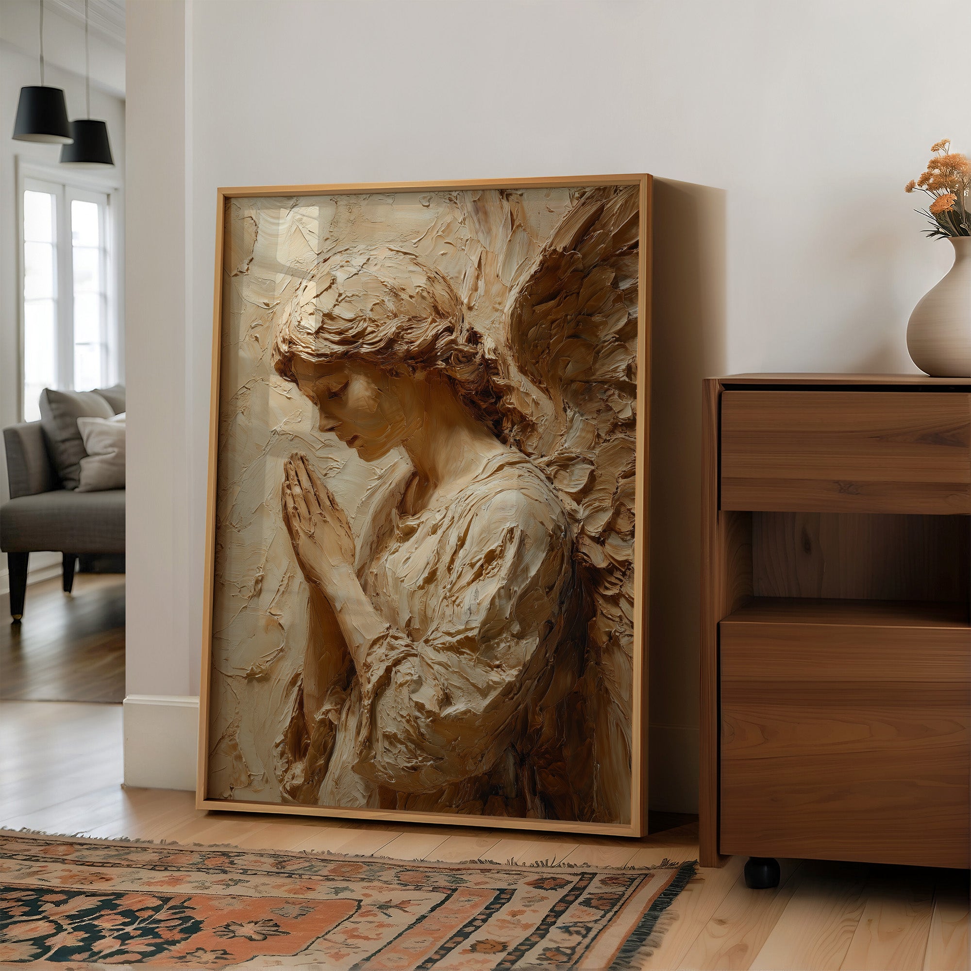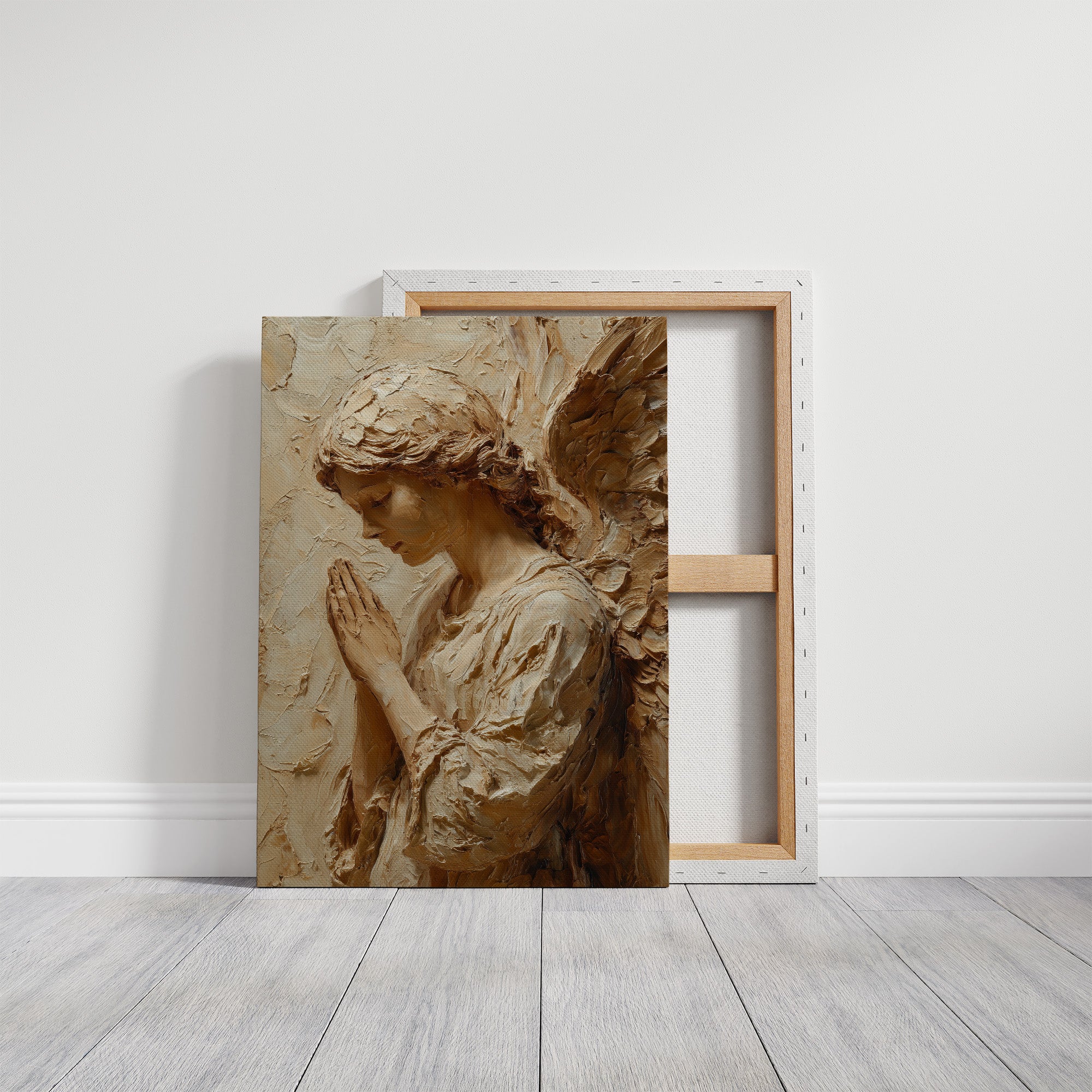 Sunlight washes over textured strokes of clay, bringing warmth to a moment of divine contemplation. The sculptural relief captures delicate features in profile, hands pressed together in reverent prayer, with each ridge and hollow telling a story of devotion. The natural wooden table beneath creates a sanctuary for this sacred piece, where morning light and shadows play across its dimensional surface.