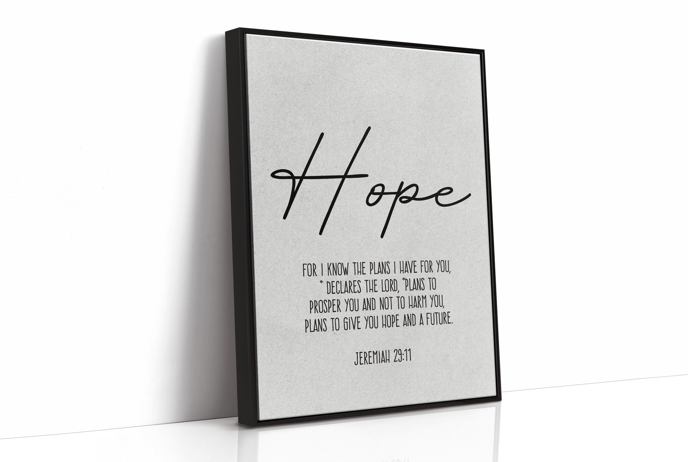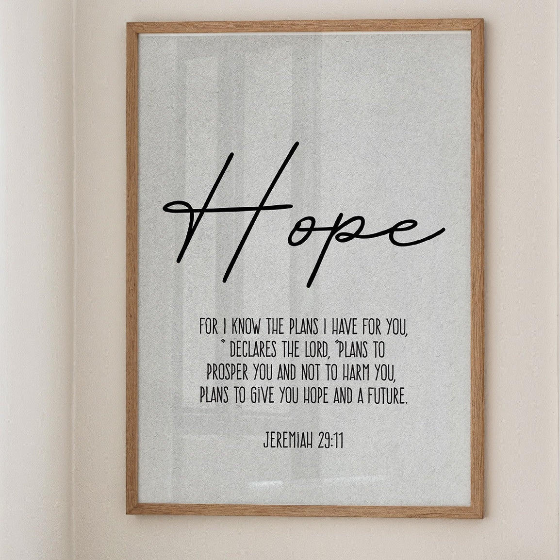 A moment of stillness captured in warm morning light. The word "Hope" stands boldly against crisp white paper, while Jeremiah 29:11 unfolds beneath it in a gentle reminder of divine promise. The rustic wooden table offers a perfect contrast to the minimalist typography, with soft greenery and the hint of a coffee cup creating a scene of contemplative peace. This piece brings spiritual comfort to any breakfast nook, reading corner, or prayer space where daily reflection matters most.