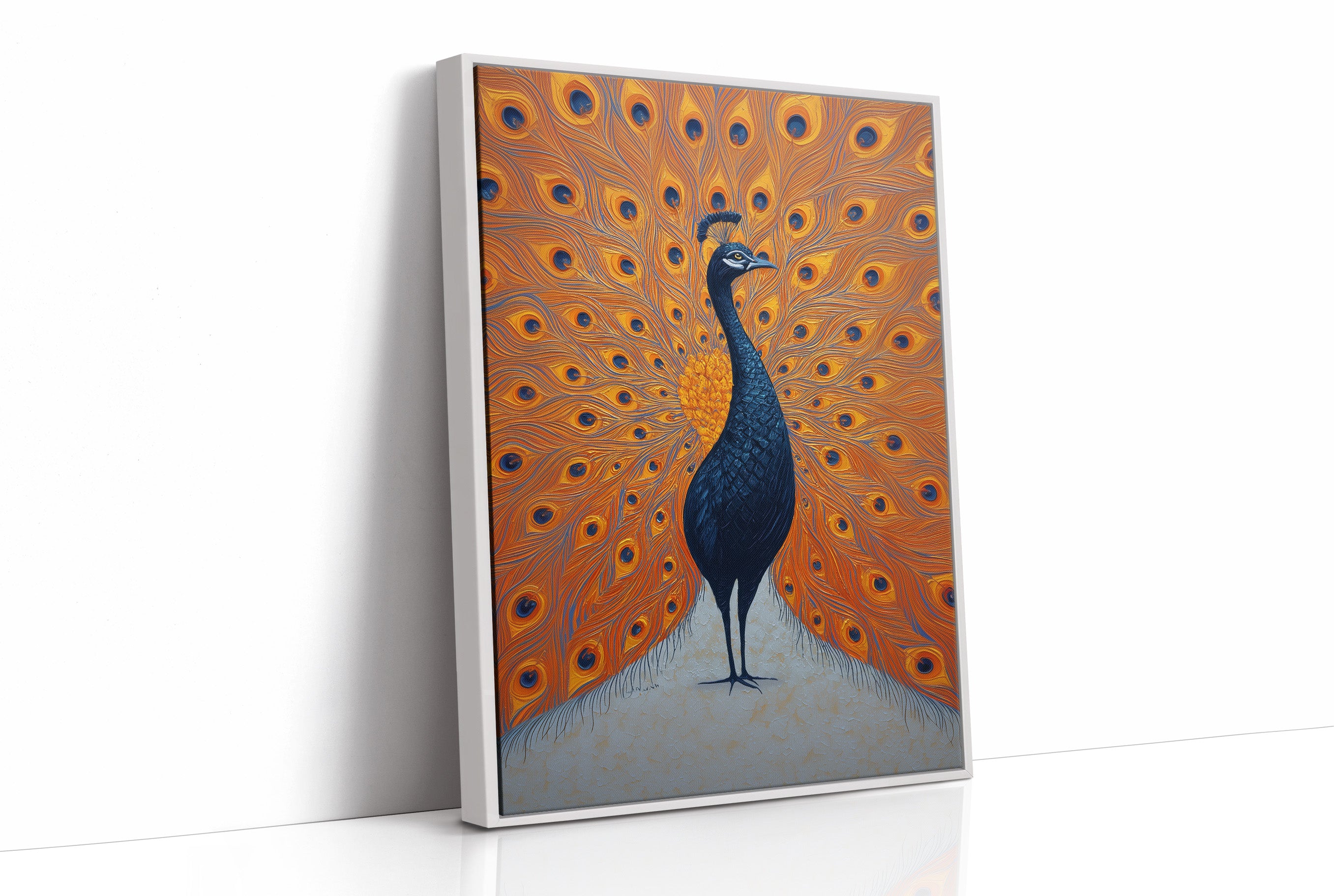 A regal peacock commands attention against a luminous backdrop, its feathers unfurling like a sunset-painted fan. Deep navy plumage contrasts dramatically with warm copper and golden tones, while electric blue eyespots create a mesmerizing pattern of natural geometry. The bird's confident stance on cool grey ground speaks to both grace and grandeur, capturing that perfect moment of display. This striking piece brings sophisticated drama to any space, particularly suited for a study, dining room, or any area where its bold presence can spark conversation.
