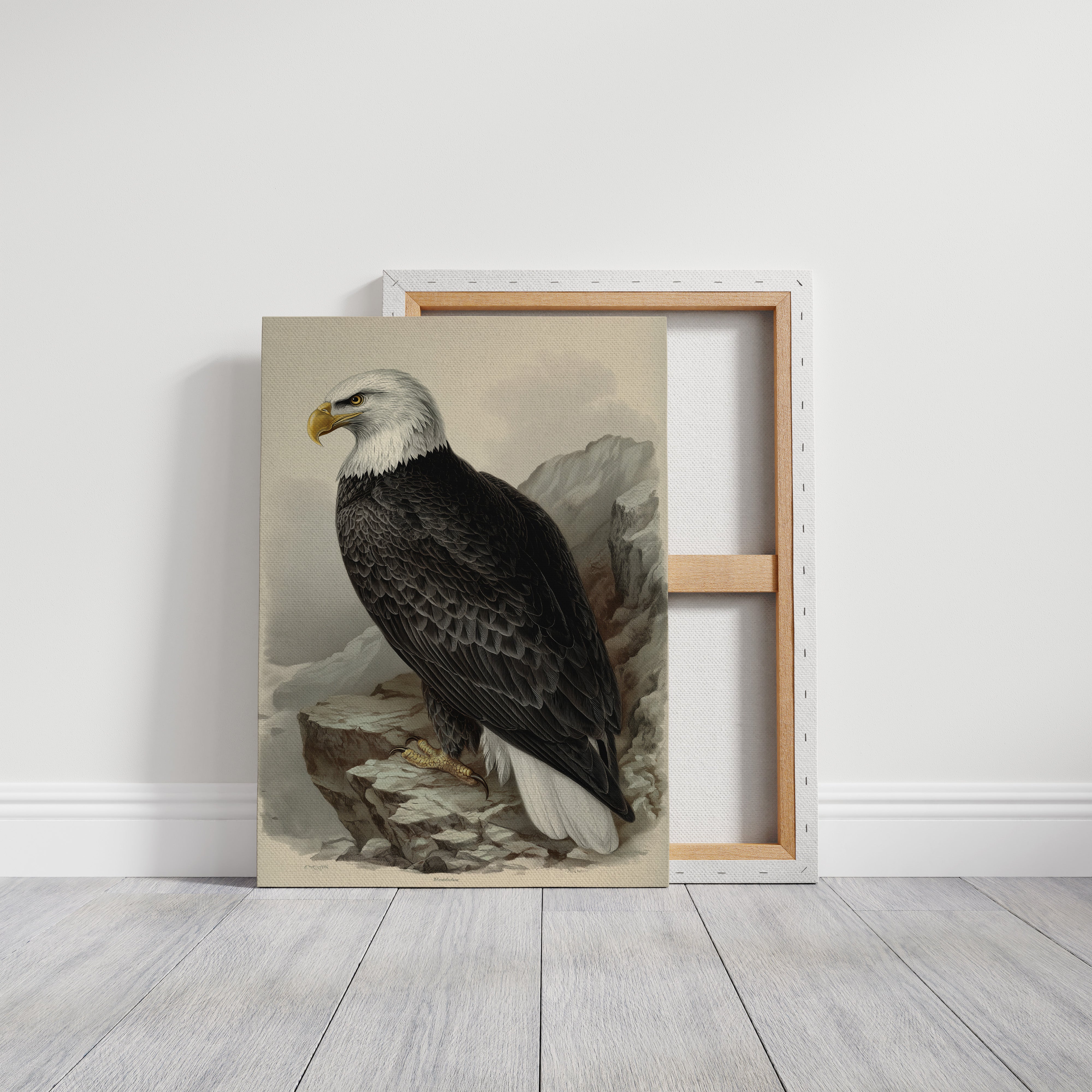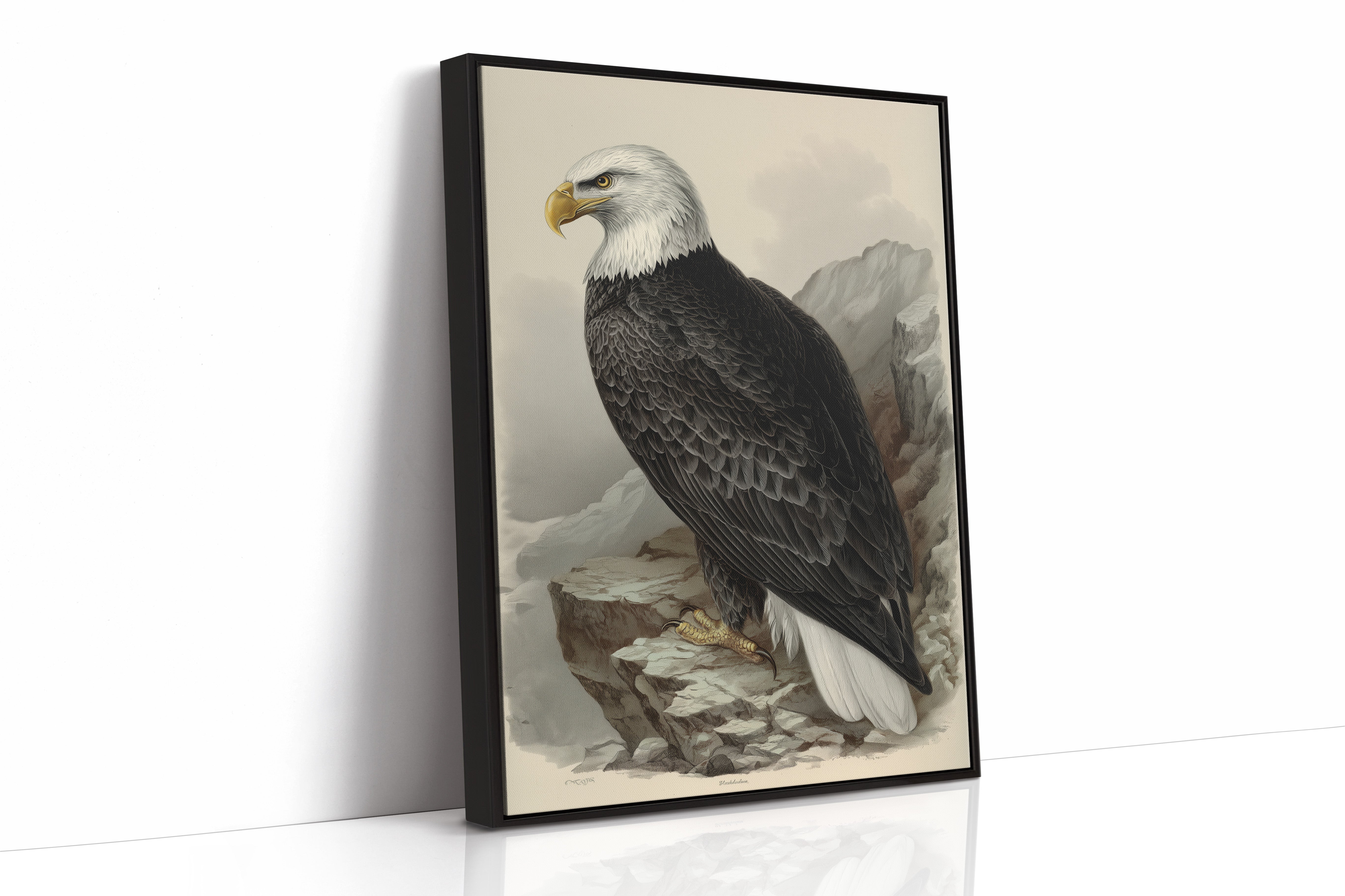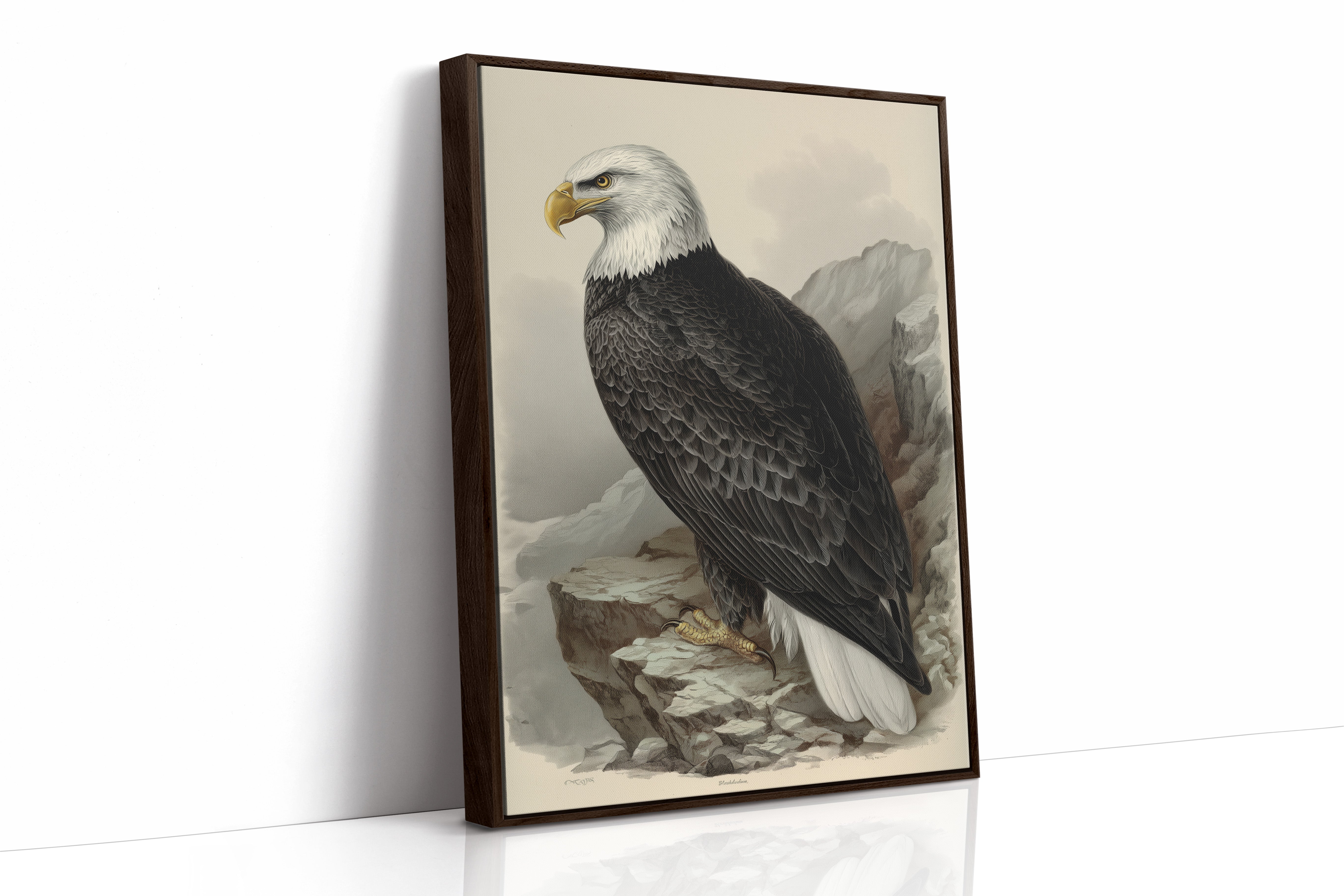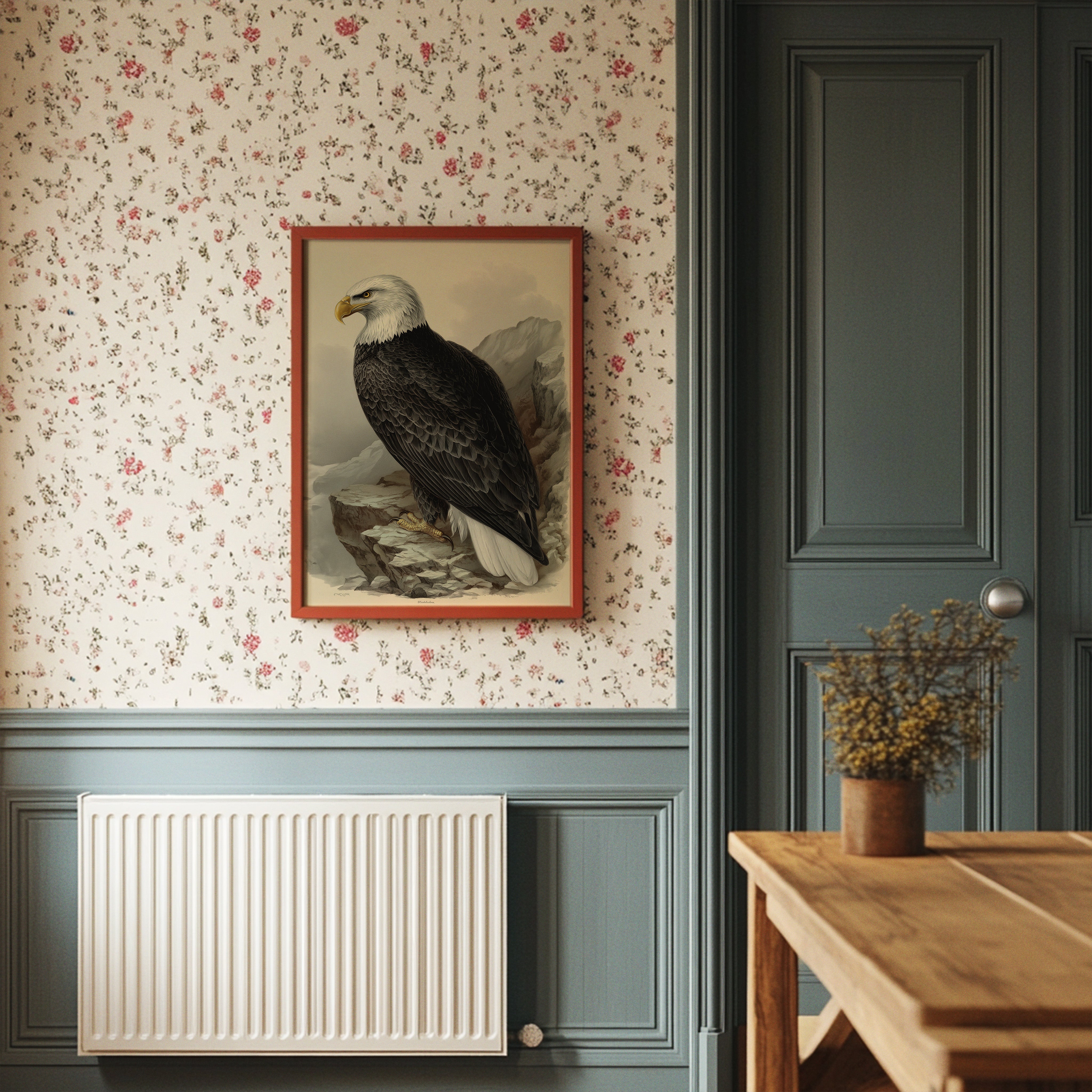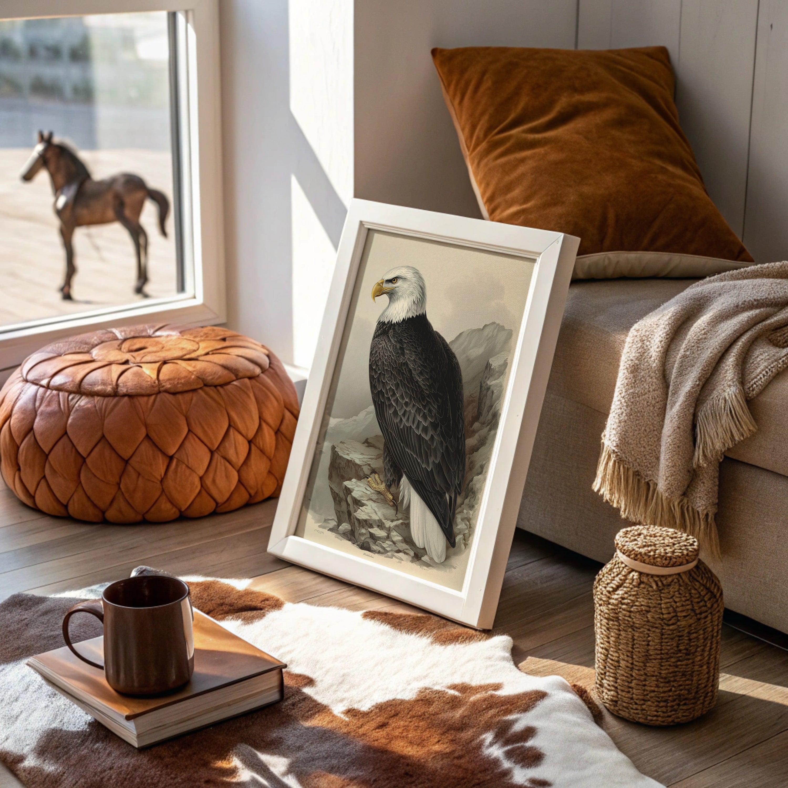 A majestic eagle portrait commands attention against weathered wood walls, while warm leather and desert accents create an inviting southwestern sanctuary. The contrast between the vintage illustration's refined detail and the room's rustic elements tells a story of untamed spirit meets modern comfort. Brass lanterns cast a gentle glow across the space, highlighting the interplay between natural textures - from smooth leather to rough wood planks. This piece anchors a contemporary western aesthetic, perfect for elevating a home office, den, or living room seeking to balance sophistication with rugged charm.