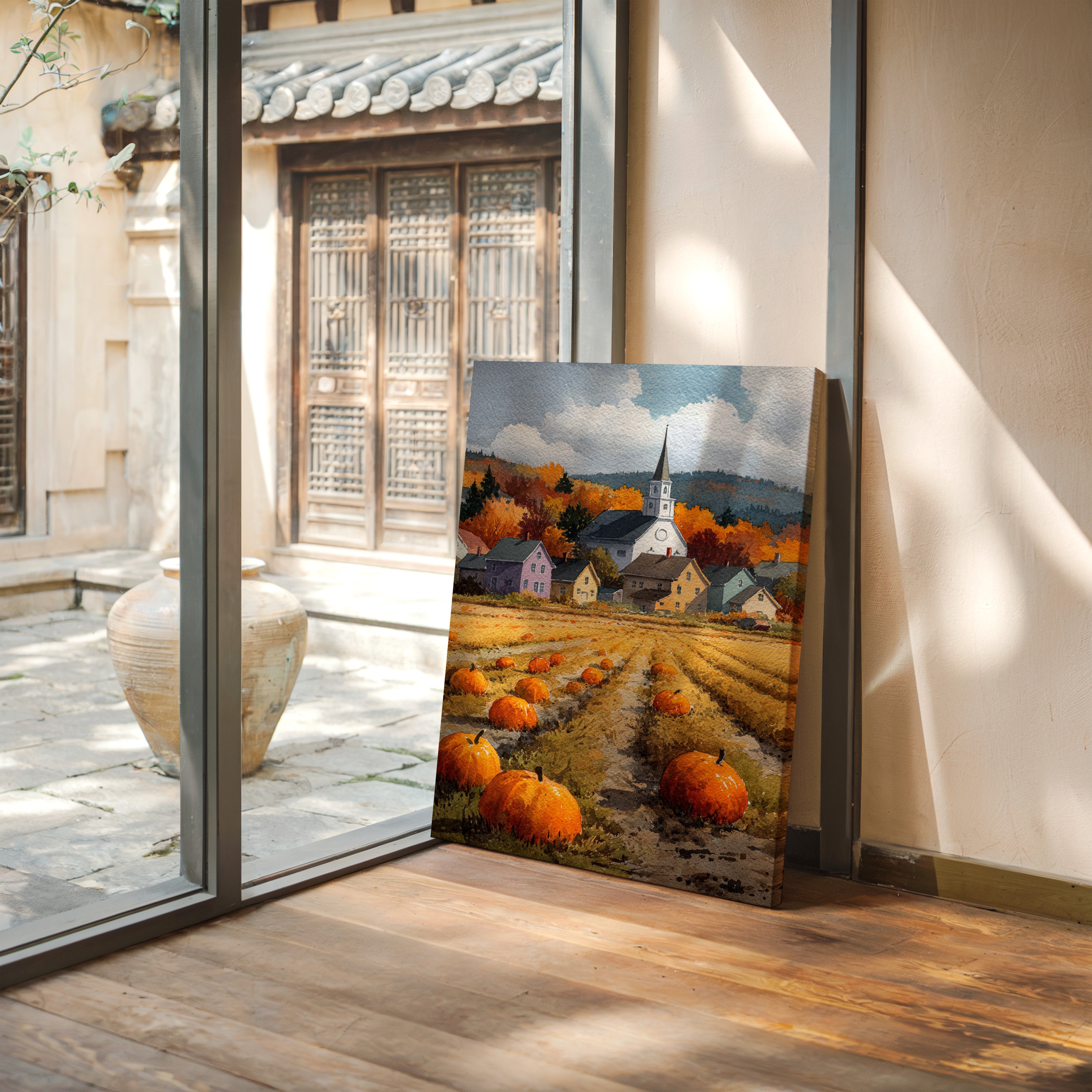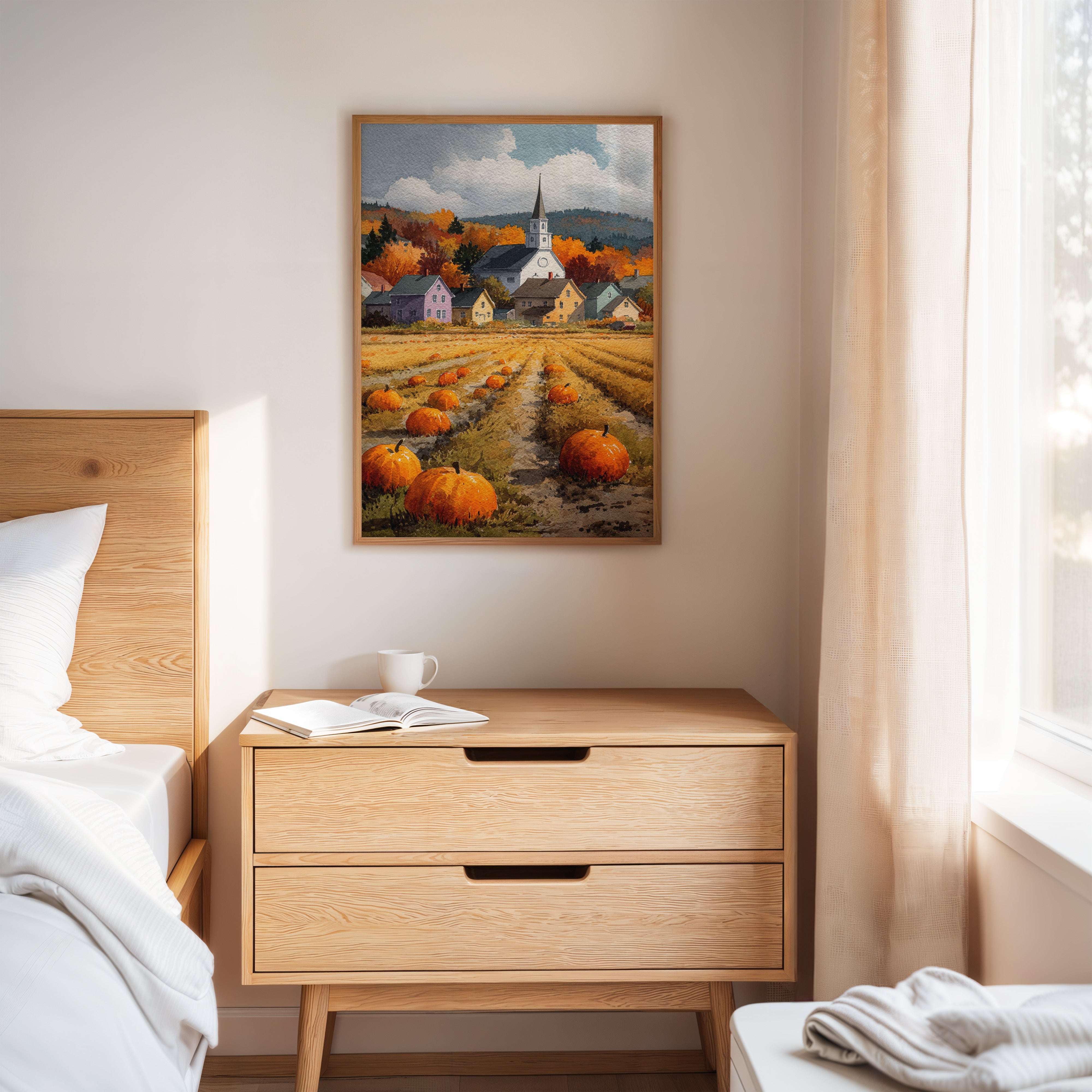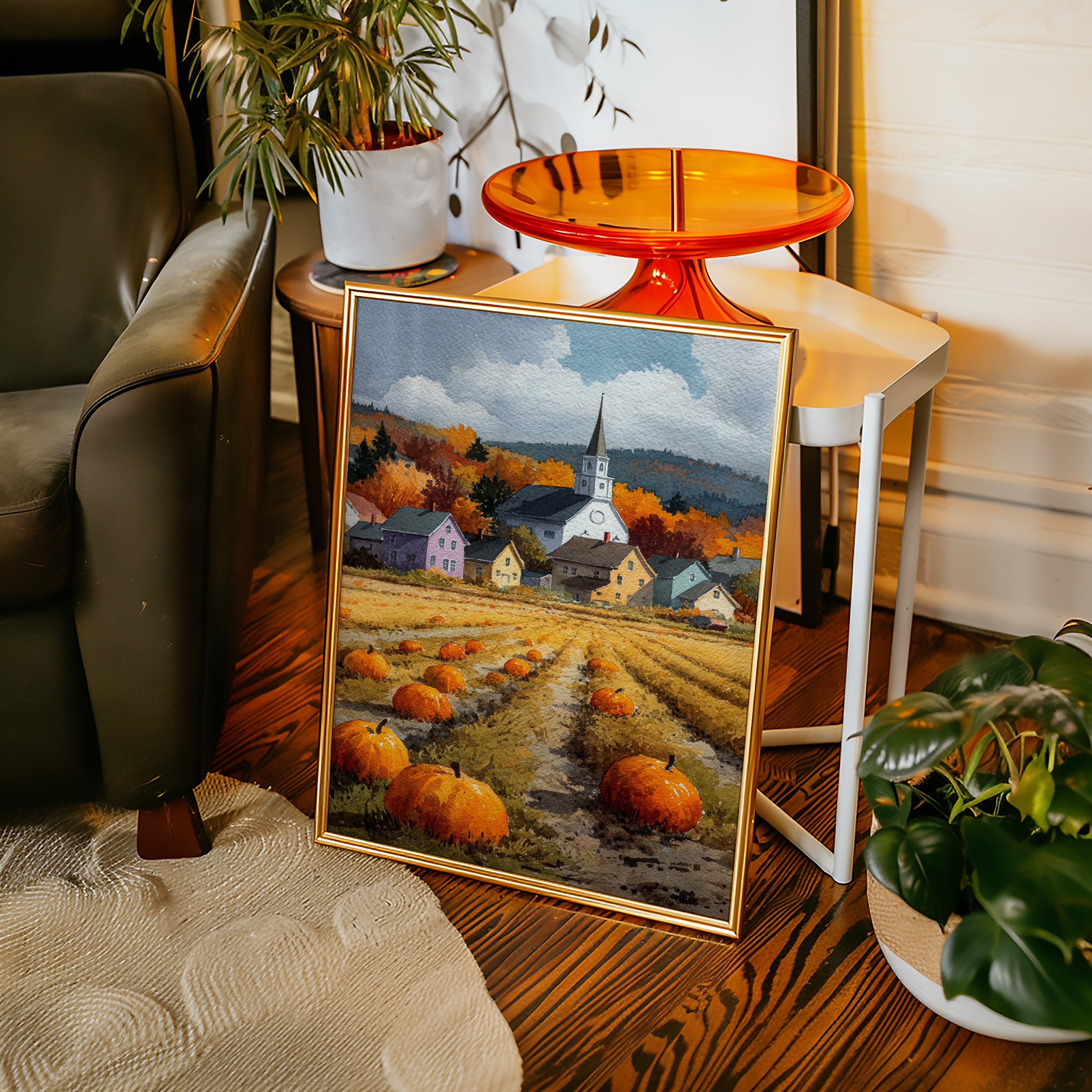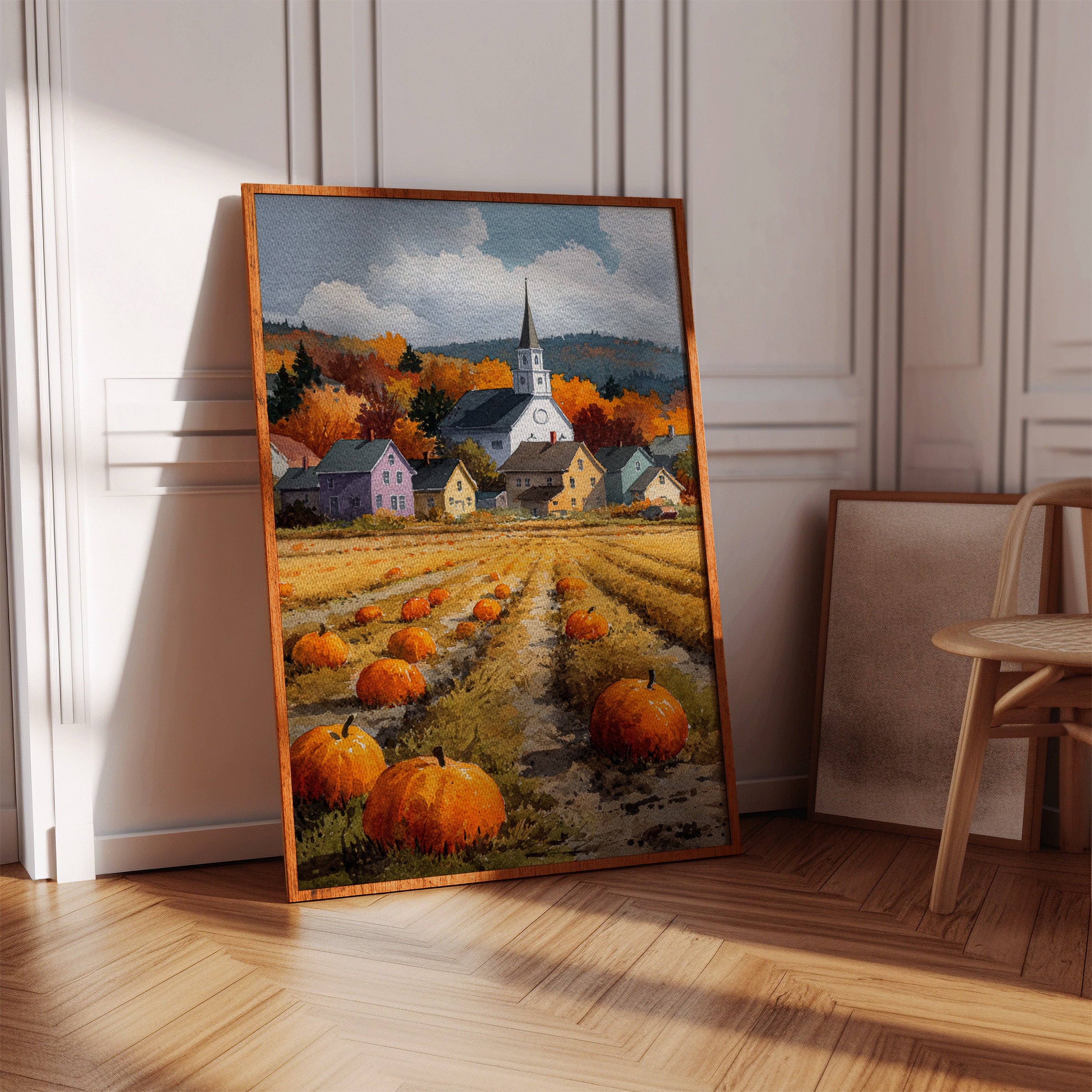 Golden autumn light bathes a quintessential New England scene, where plump pumpkins dot furrows of harvest-ready fields. A white church steeple rises proudly above a charming row of colorful houses, each painted in distinct pastels that complement the fiery fall foliage behind them. The scene captures the essence of small-town America, where neat rows of cultivation meet the warmth of community life. This watercolor piece balances the geometric precision of architecture with the organic shapes of nature, creating a harmonious celebration of harvest season. Perfect for bringing seasonal warmth to dining rooms or creating an inviting atmosphere in living spaces where family gatherings are cherished.
