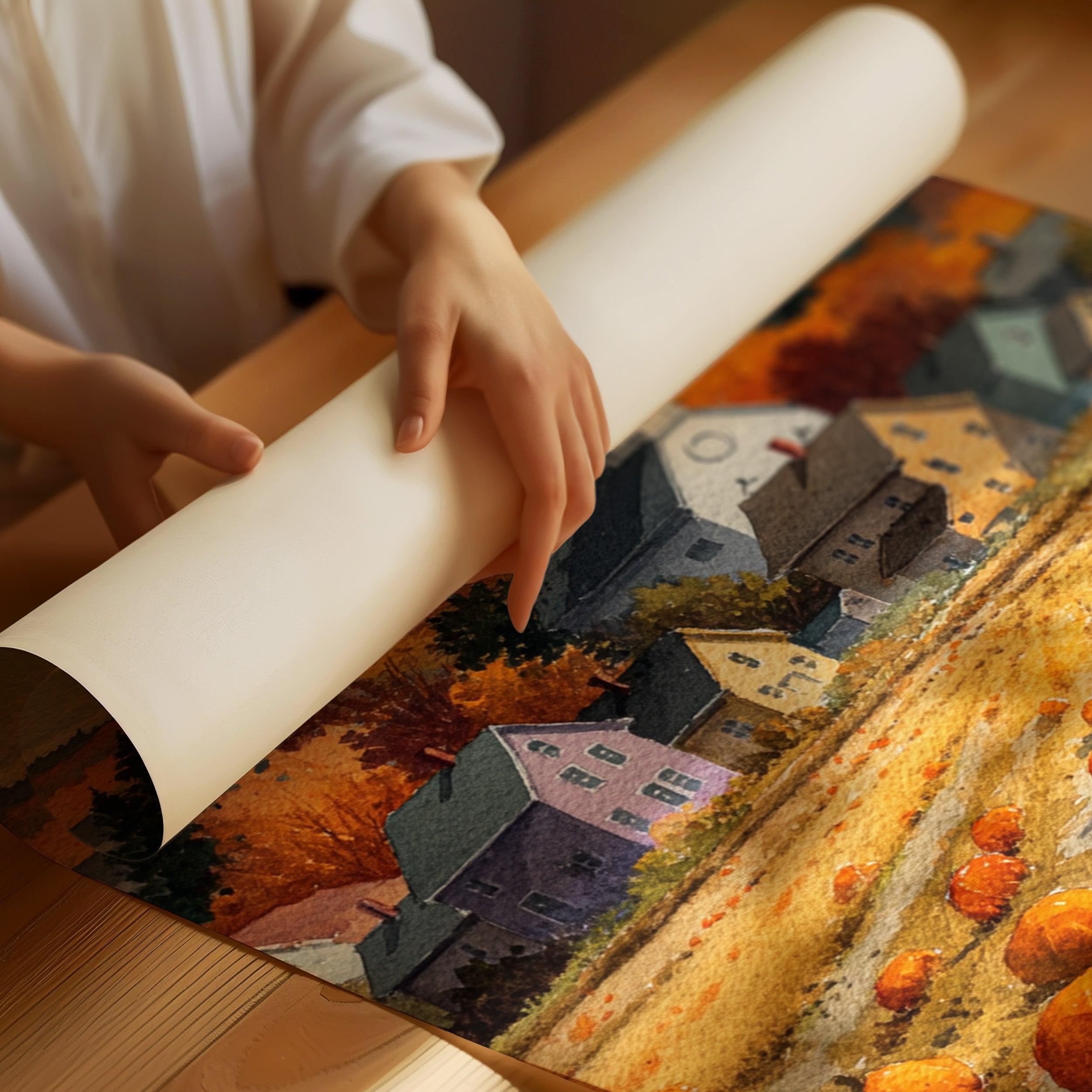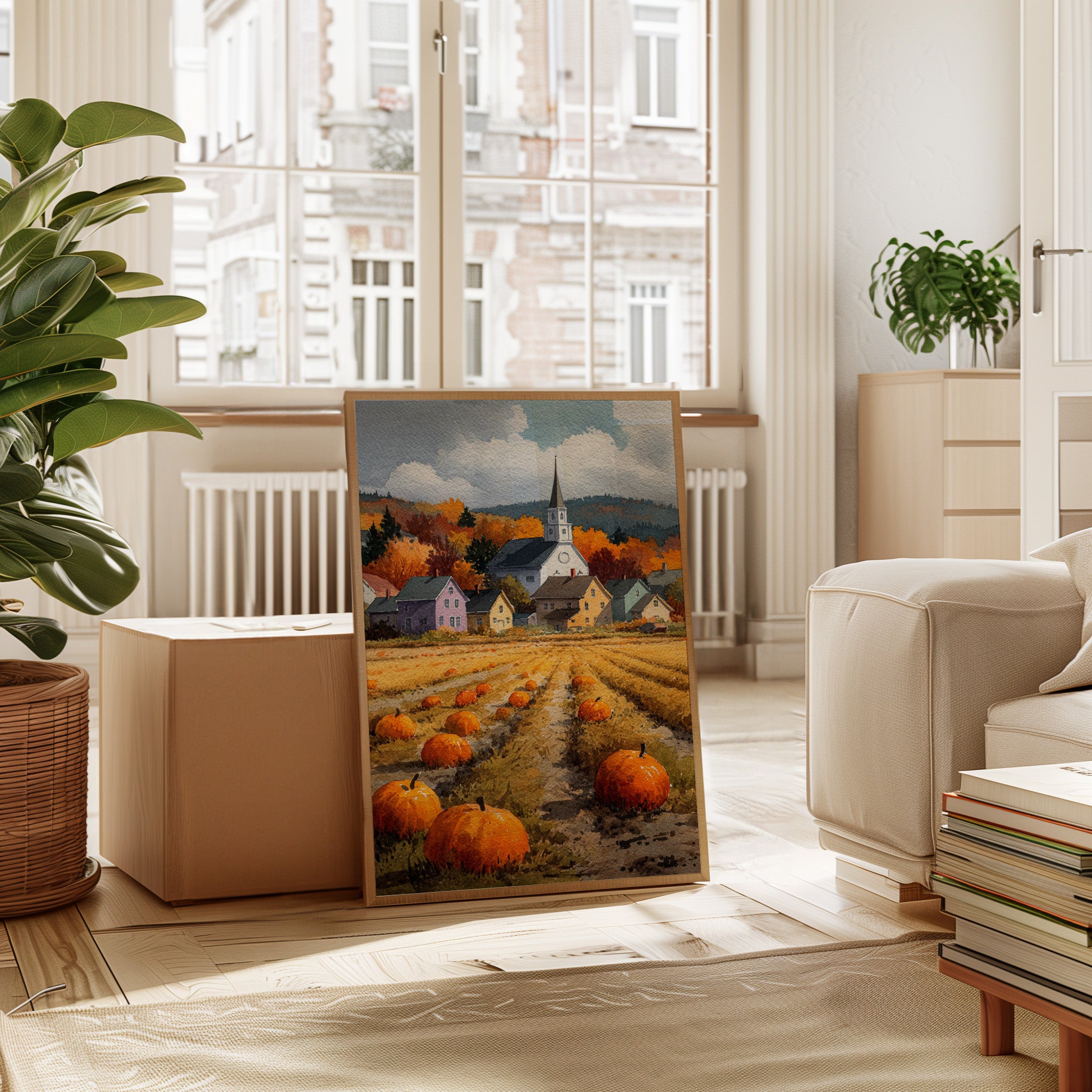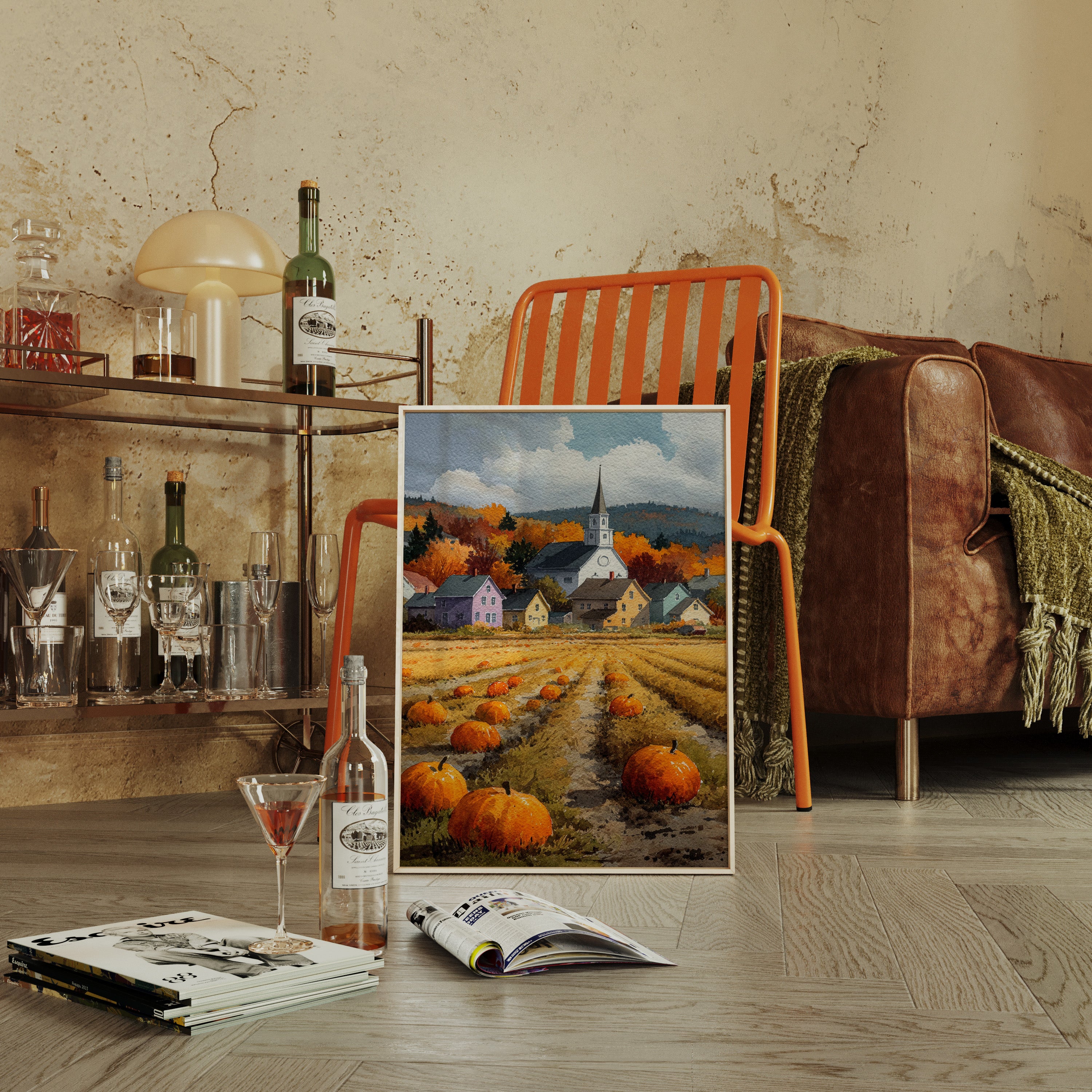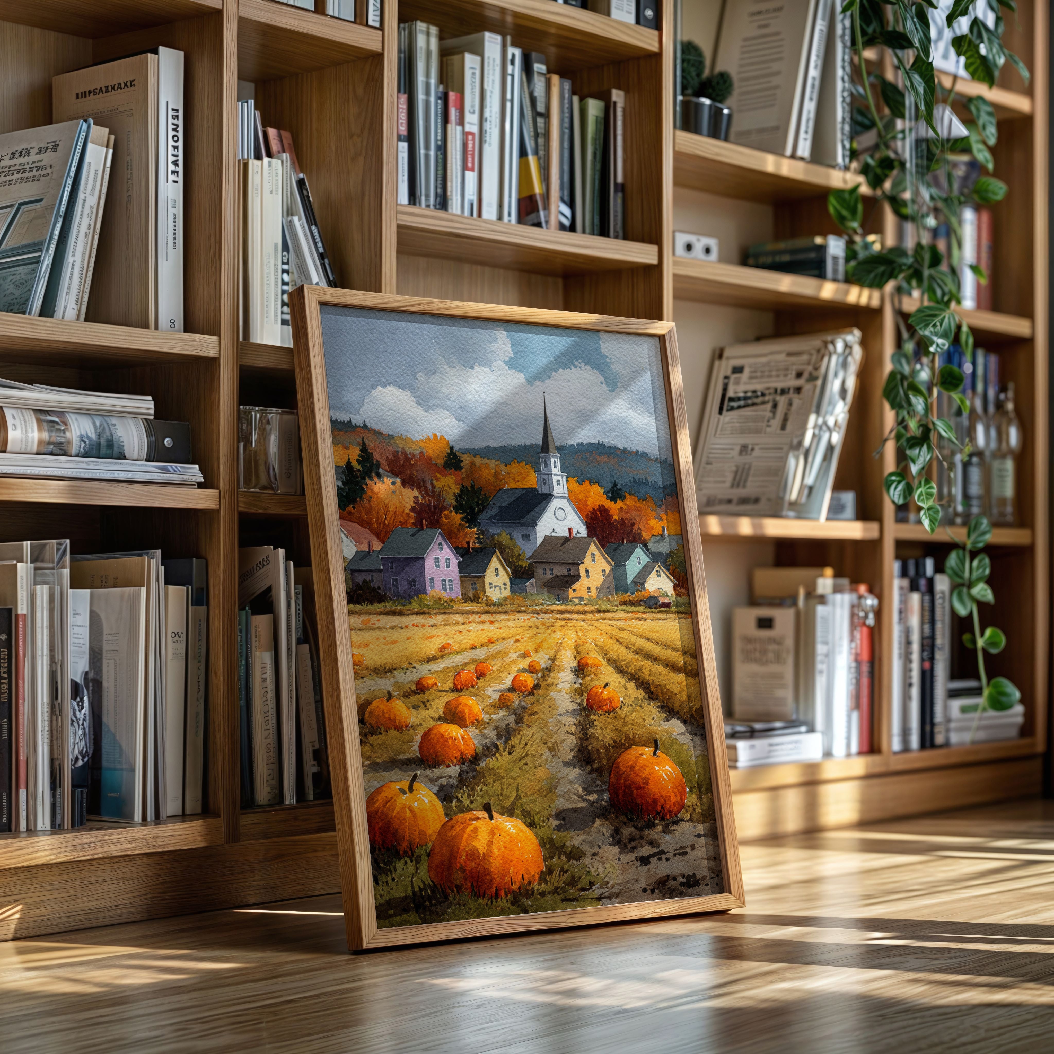 Golden autumn light bathes a quintessential New England scene, where plump pumpkins dot furrows of harvest-ready fields. A white church steeple rises proudly above a charming row of colorful houses, each painted in distinct pastels that complement the fiery fall foliage behind them. The scene captures the essence of small-town America, where neat rows of cultivation meet the warmth of community life. This watercolor piece balances the geometric precision of architecture with the organic shapes of nature, creating a harmonious celebration of harvest season. Perfect for bringing seasonal warmth to dining rooms or creating an inviting atmosphere in living spaces where family gatherings are cherished.