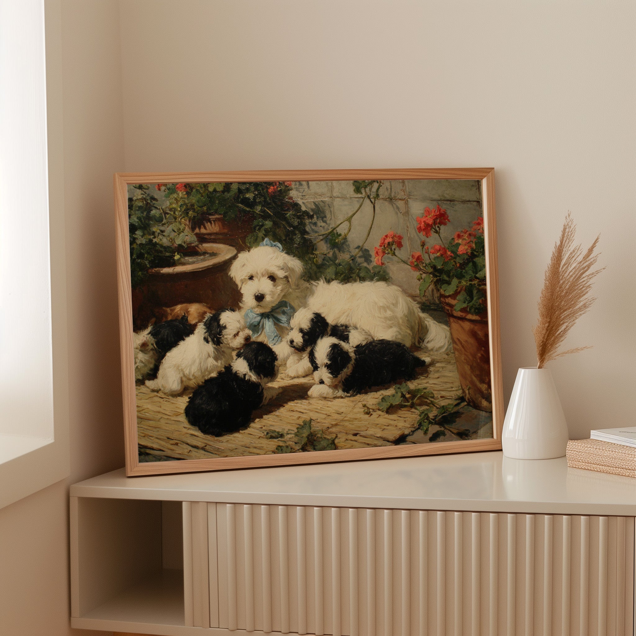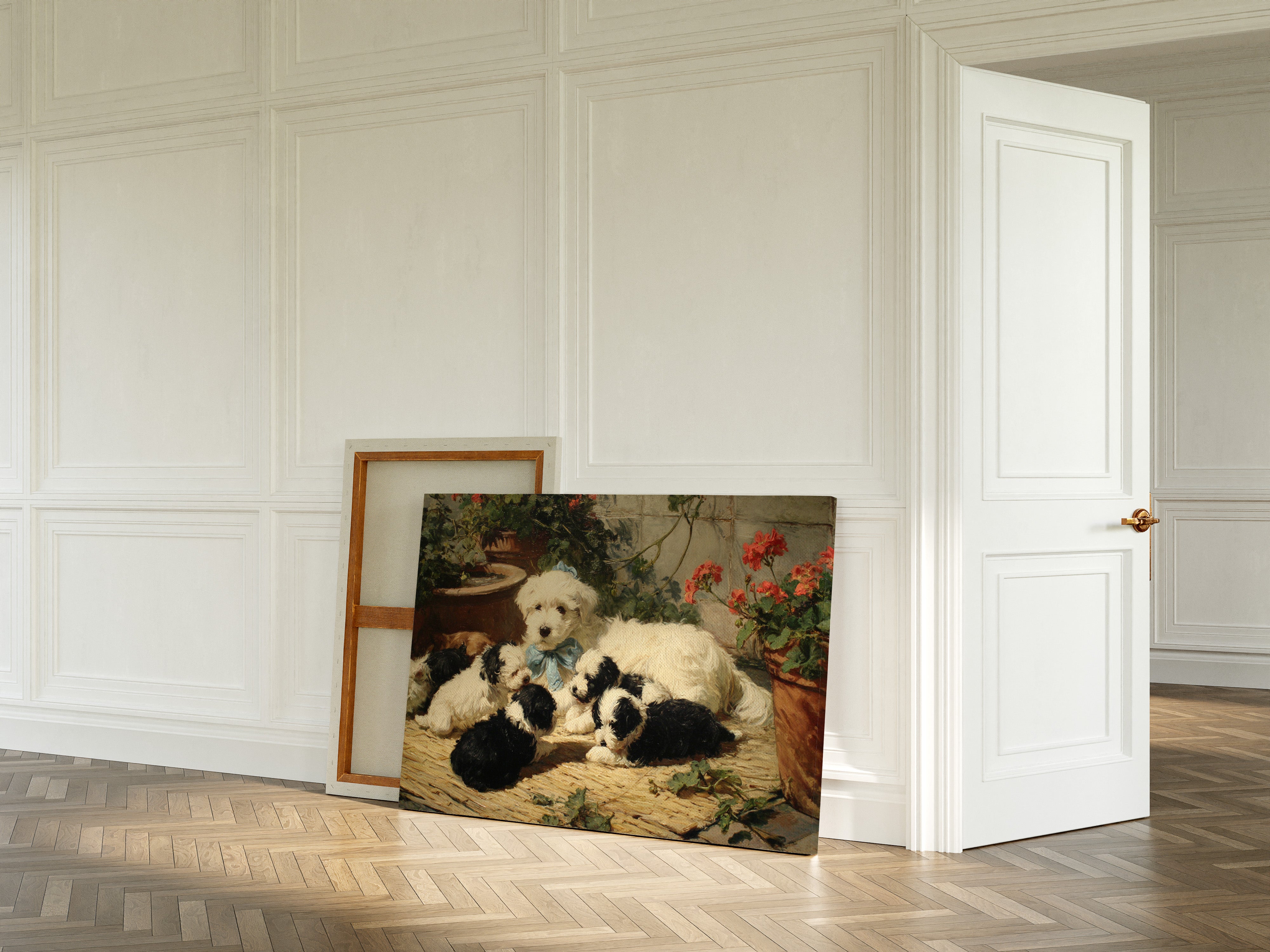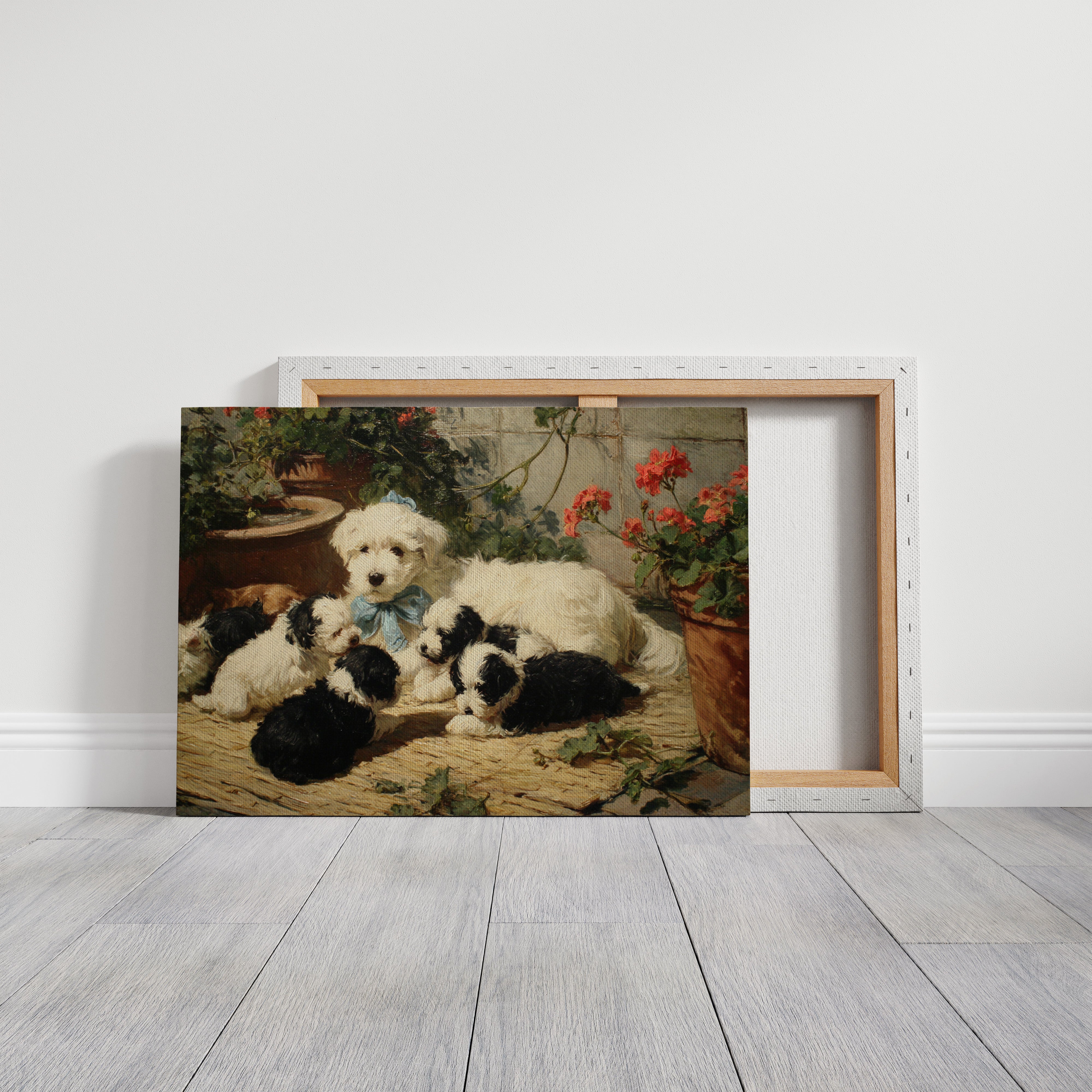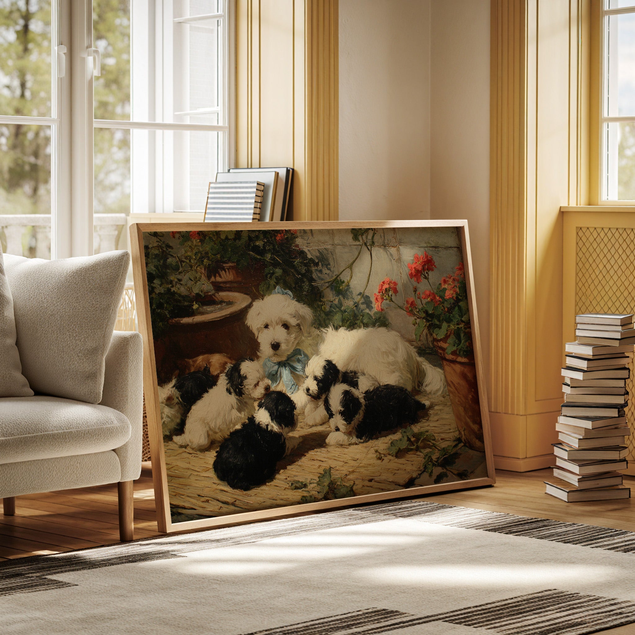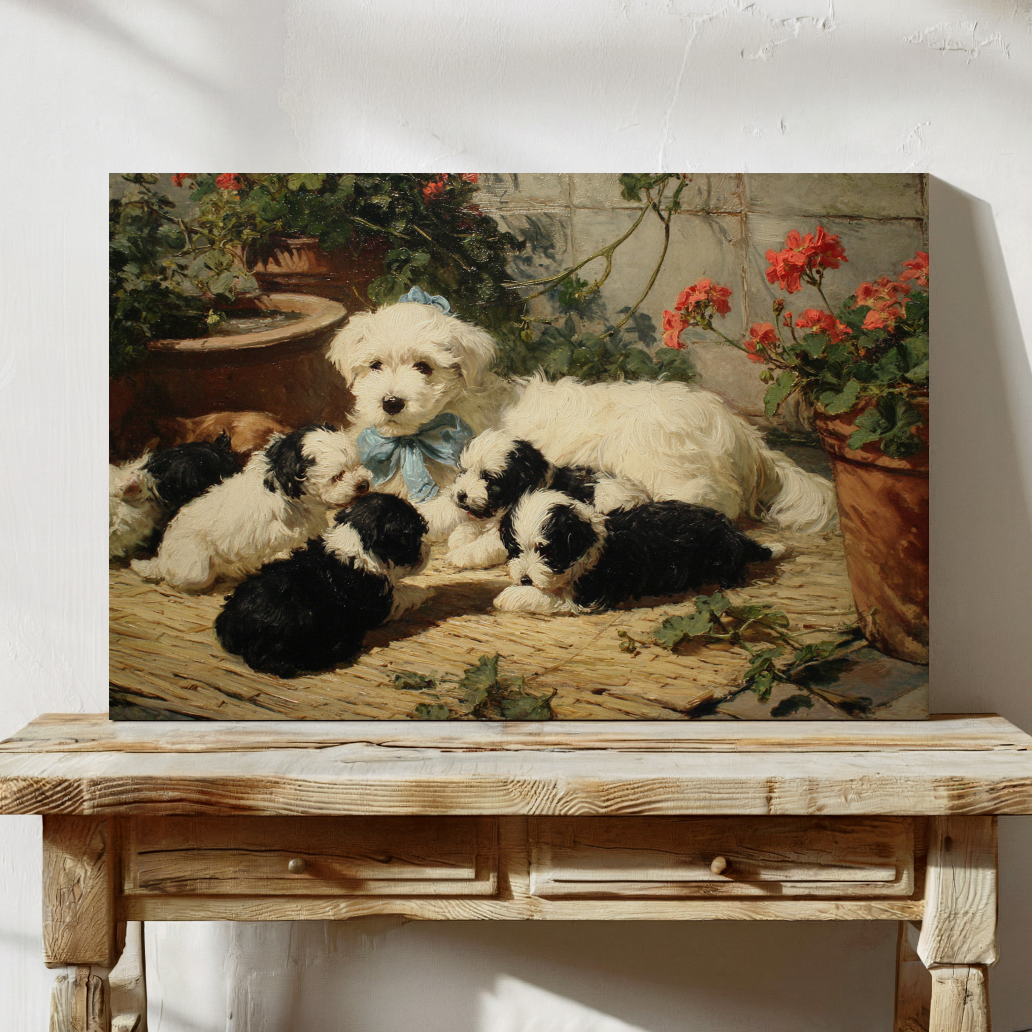 A tender moment unfolds in a sun-dappled garden corner, where a mother dog with a delicate blue bow watches over her sleeping puppies. The classic oil painting captures the peaceful harmony of black and white pups nestled together on golden straw, their tiny forms creating a gentle rhythm across the canvas. Terra cotta pots overflow with vibrant coral geraniums, adding warmth to the scene while casting soft shadows on the weathered wall behind. This nostalgic piece brings the charm of a Victorian garden and the timeless appeal of puppy love into any space, perfect for adding character to a reading nook or bringing pastoral elegance to a formal living room.