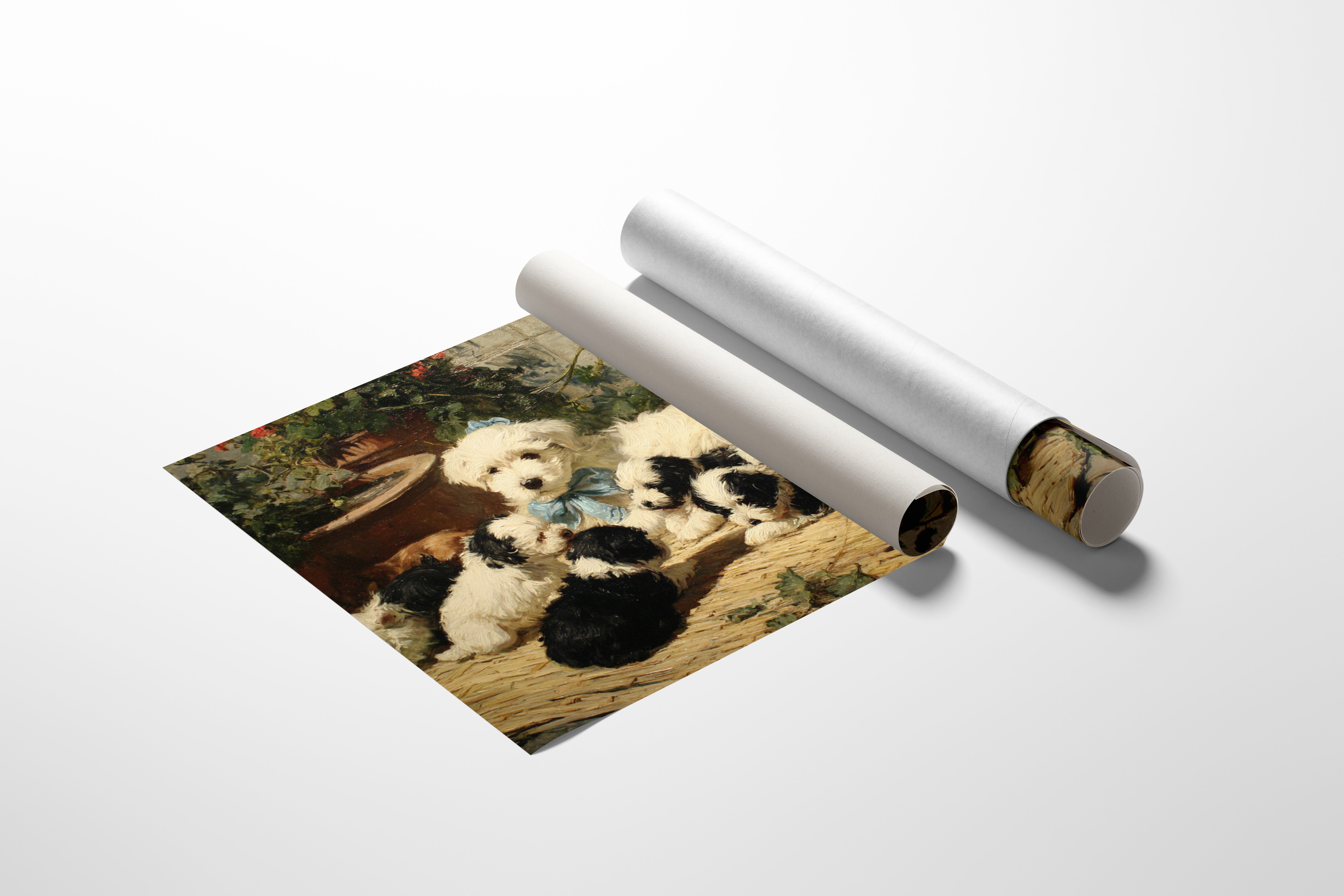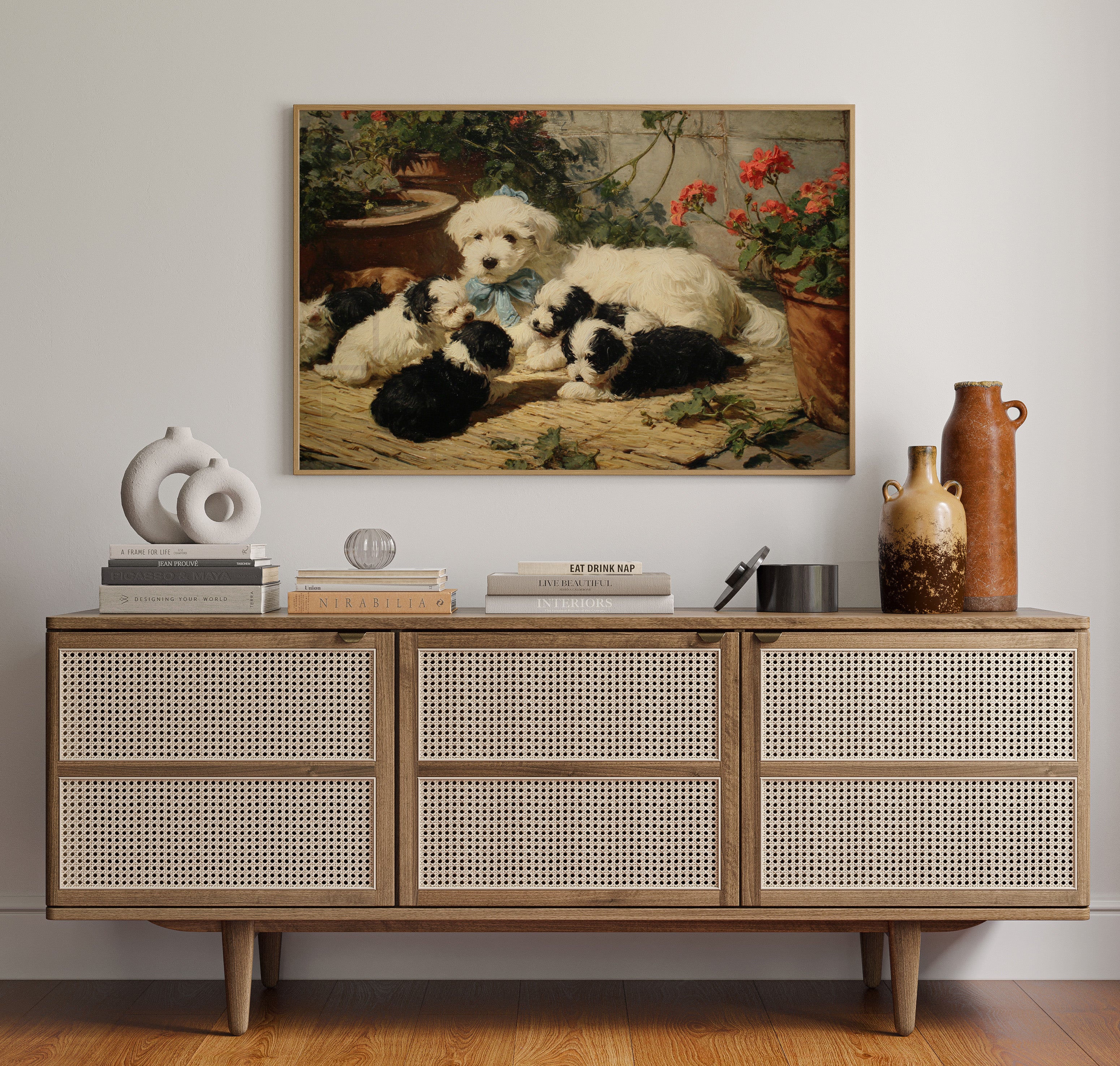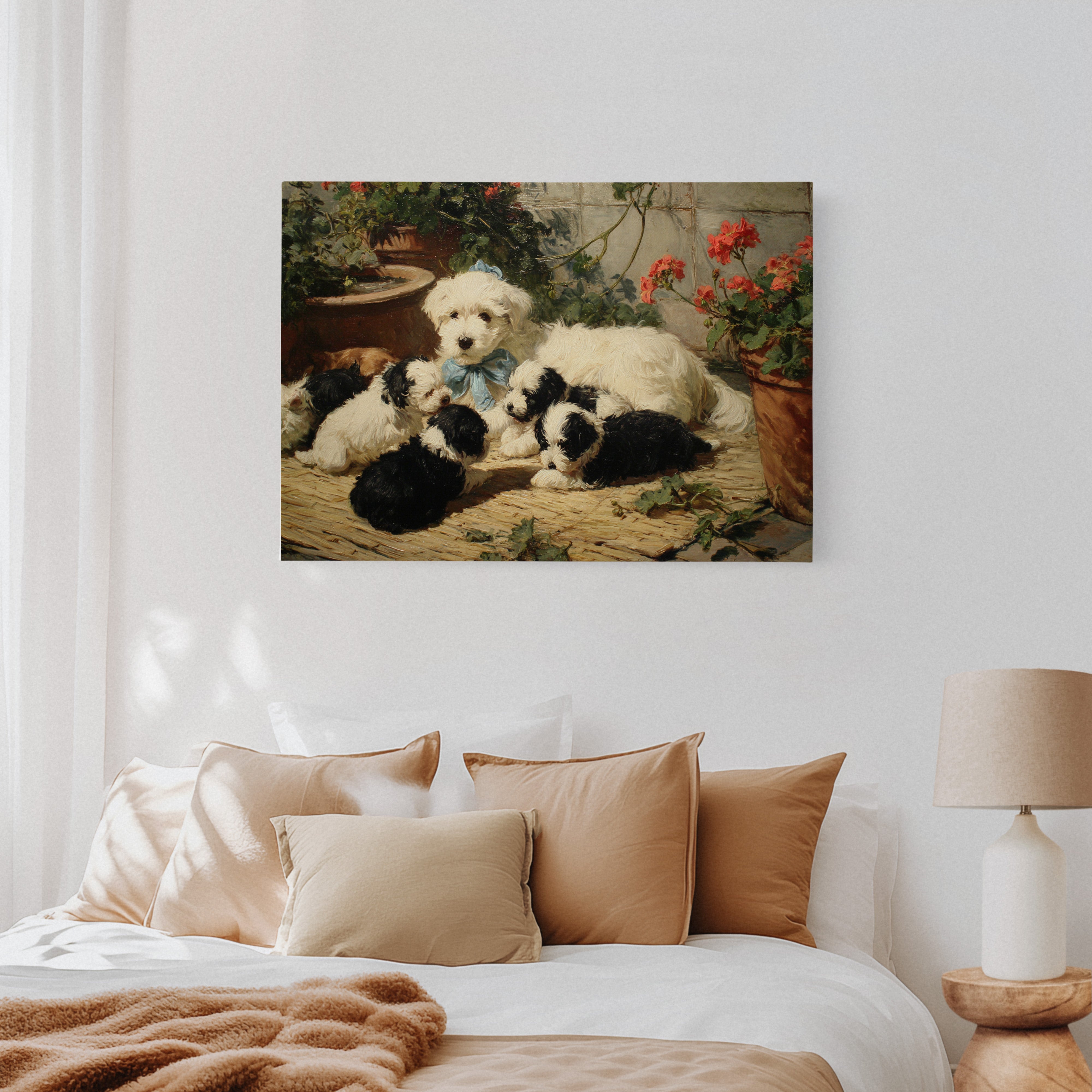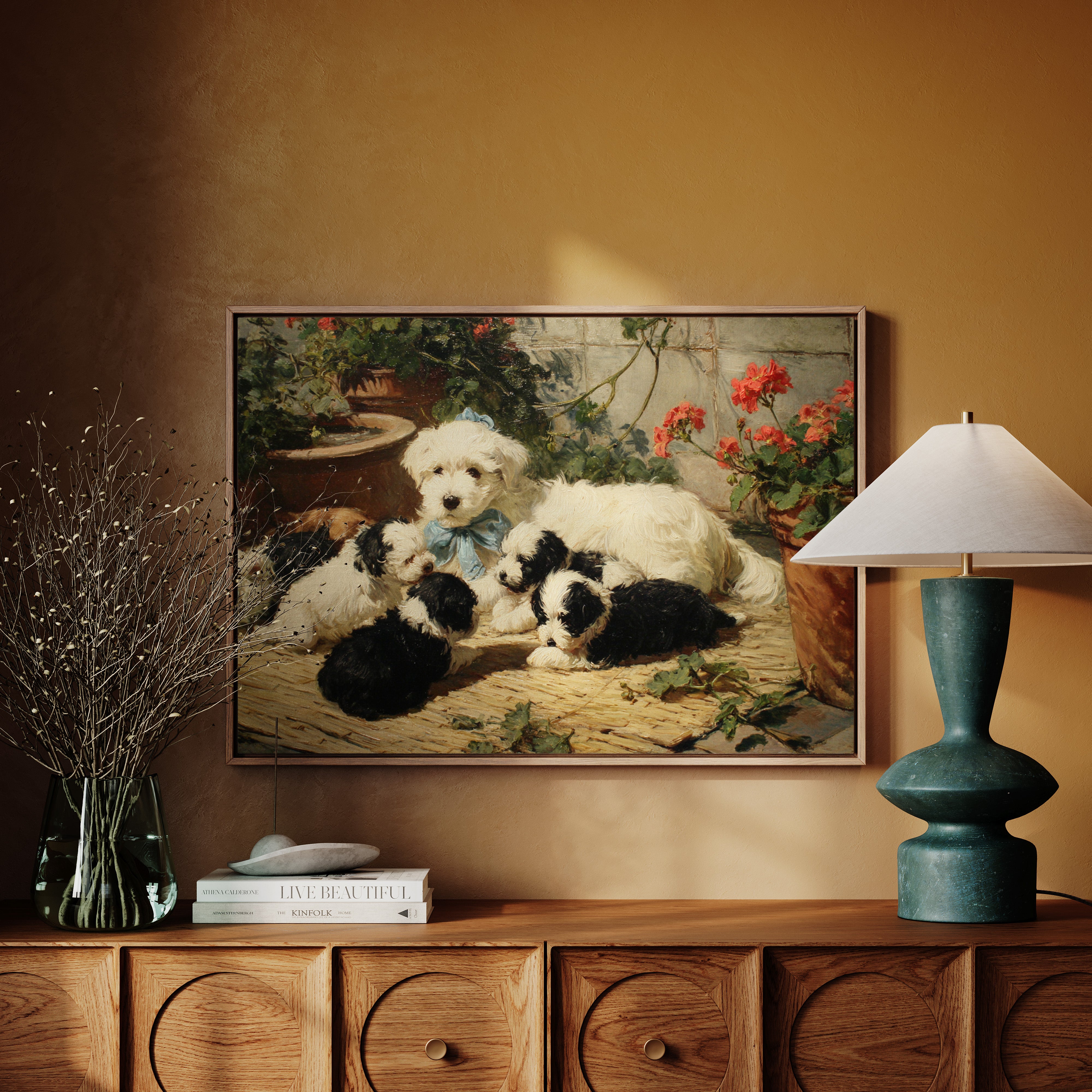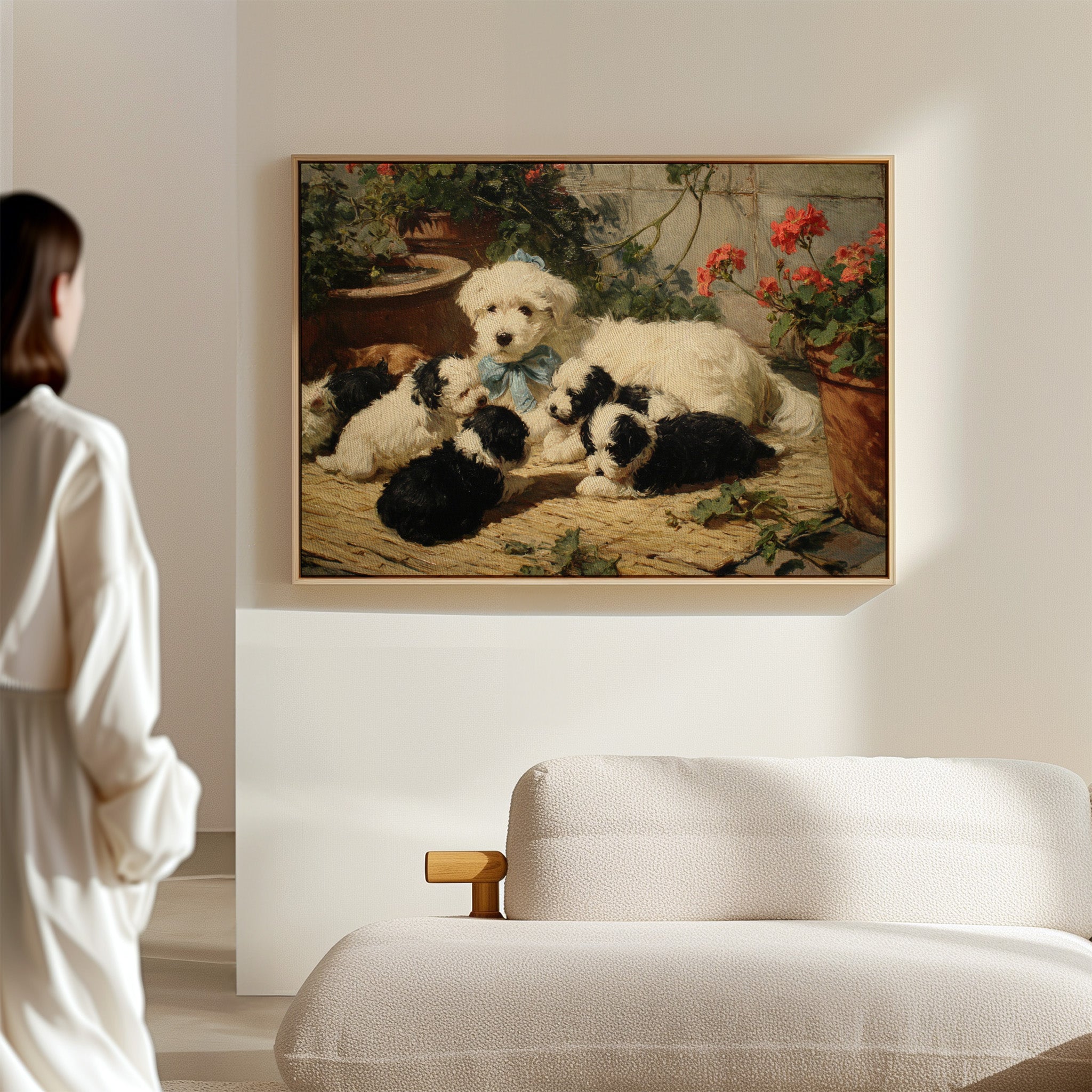 A tender moment unfolds in a sun-dappled garden corner, where a mother dog with a delicate blue bow watches over her sleeping puppies. The classic oil painting captures the peaceful harmony of black and white pups nestled together on golden straw, their tiny forms creating a gentle rhythm across the canvas. Terra cotta pots overflow with vibrant coral geraniums, adding warmth to the scene while casting soft shadows on the weathered wall behind. This nostalgic piece brings the charm of a Victorian garden and the timeless appeal of puppy love into any space, perfect for adding character to a reading nook or bringing pastoral elegance to a formal living room.