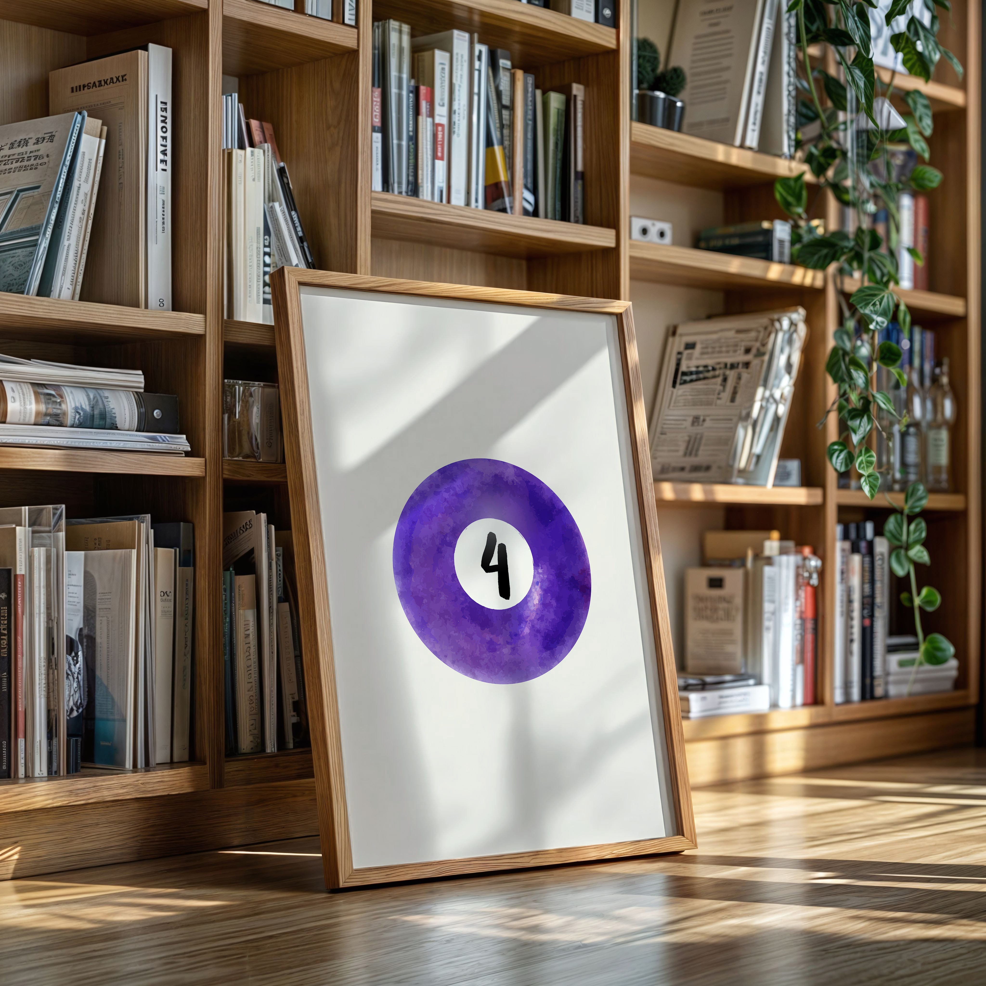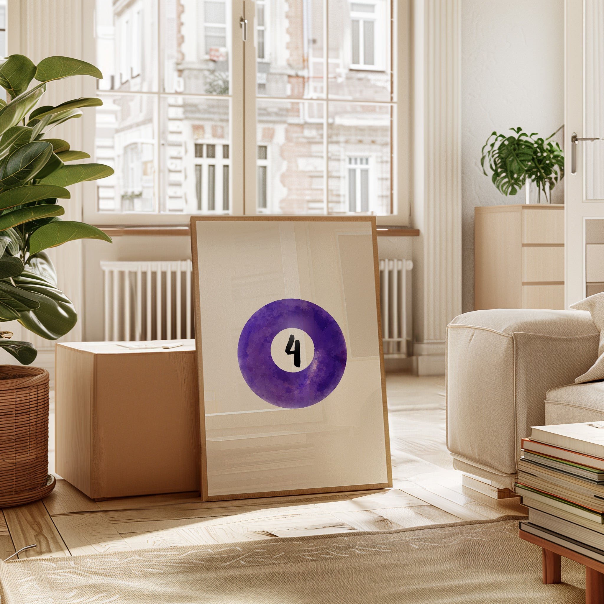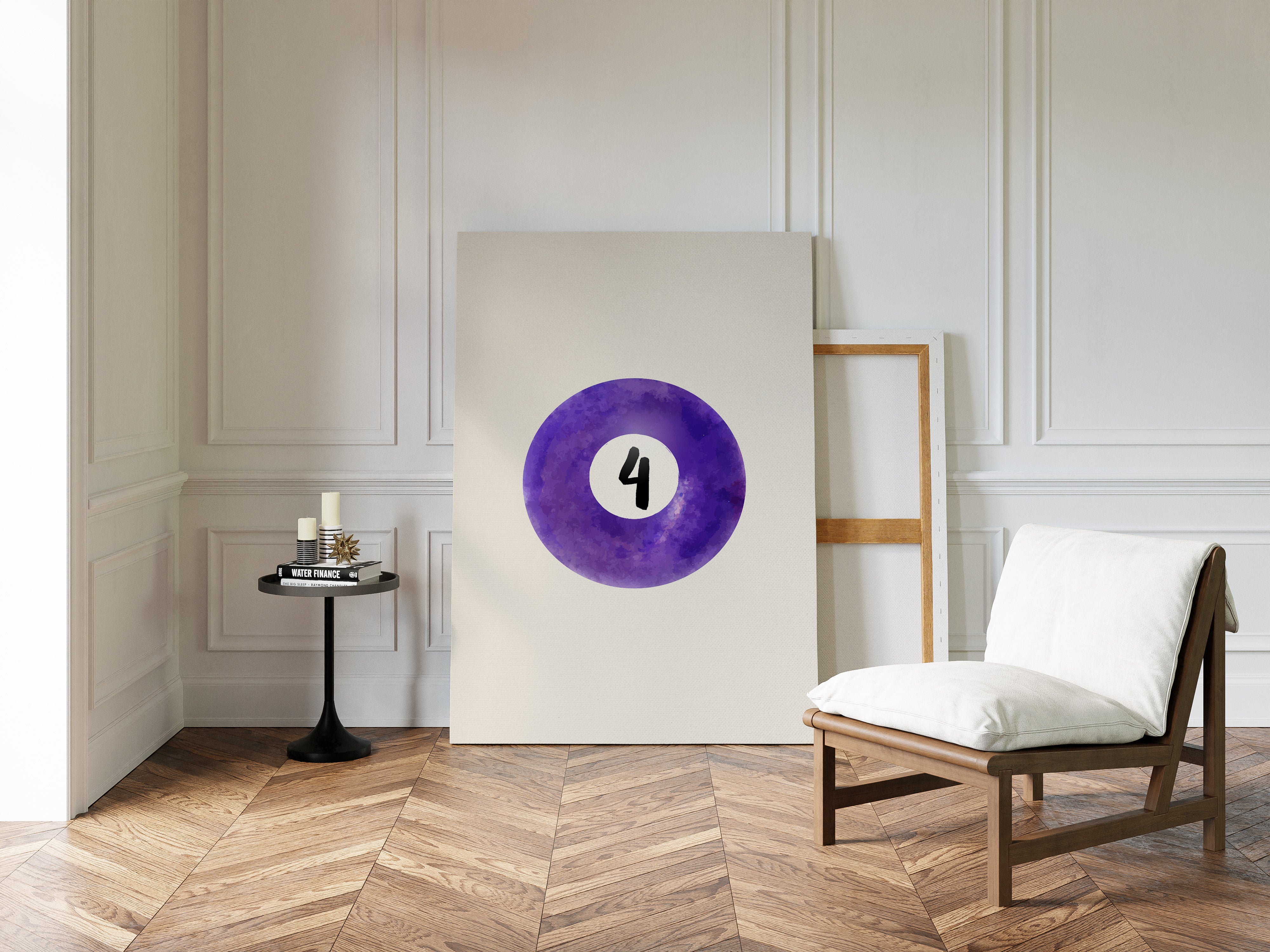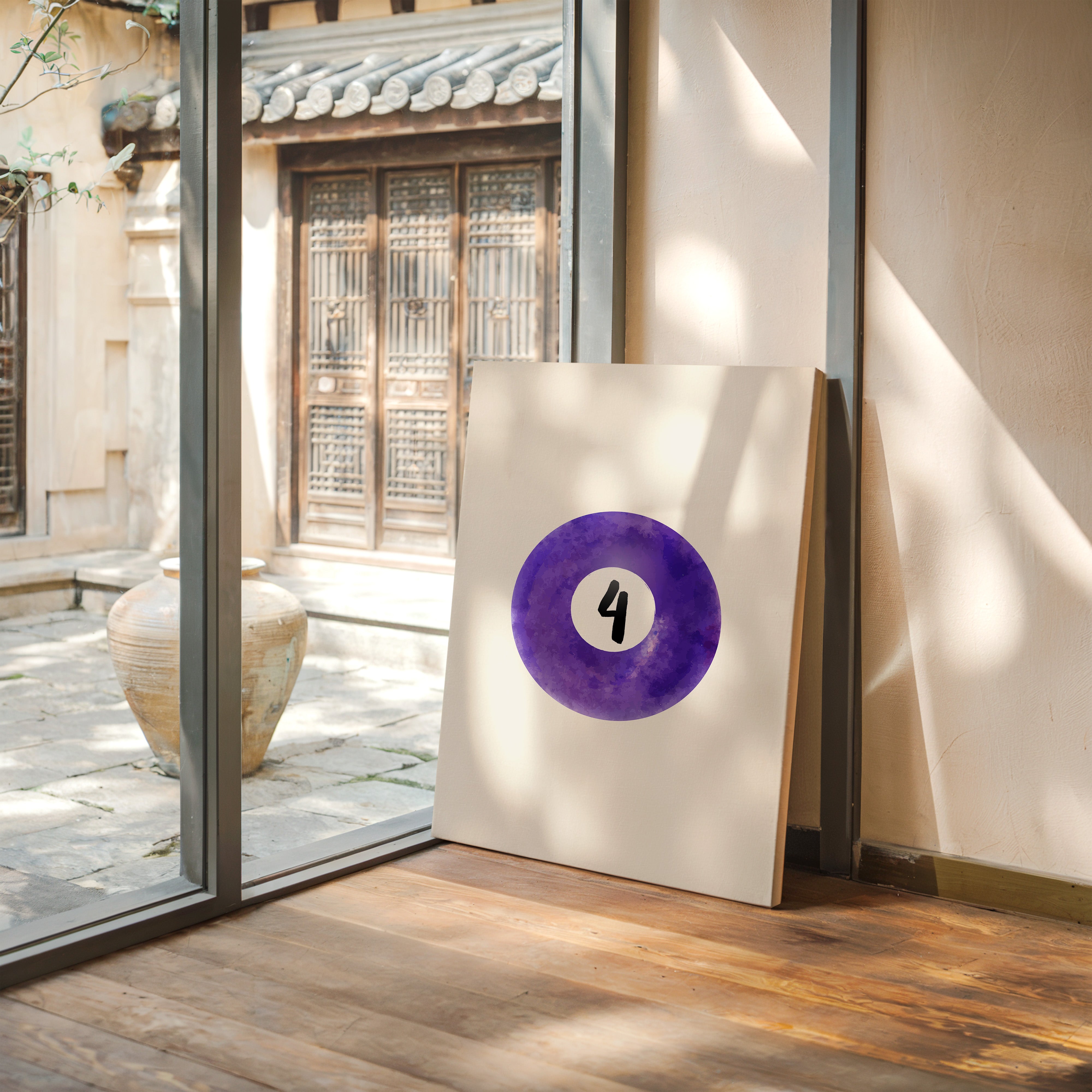 A deep violet pool ripples with possibility, centered around the bold number four like a cosmic bullseye. This piece from our Contemporary collection marries minimalist design with rich watercolor texture. The intense purple bleeds and blooms across the circular canvas, creating a mesmerizing contrast with the stark white center and bold black numeral. It speaks to both chance and intention, like the perfect combination of skill and serendipity. This striking piece adds modern sophistication to a game room, office, or any space calling for a touch of playful elegance. The simple yet impactful design invites both contemplation and conversation.