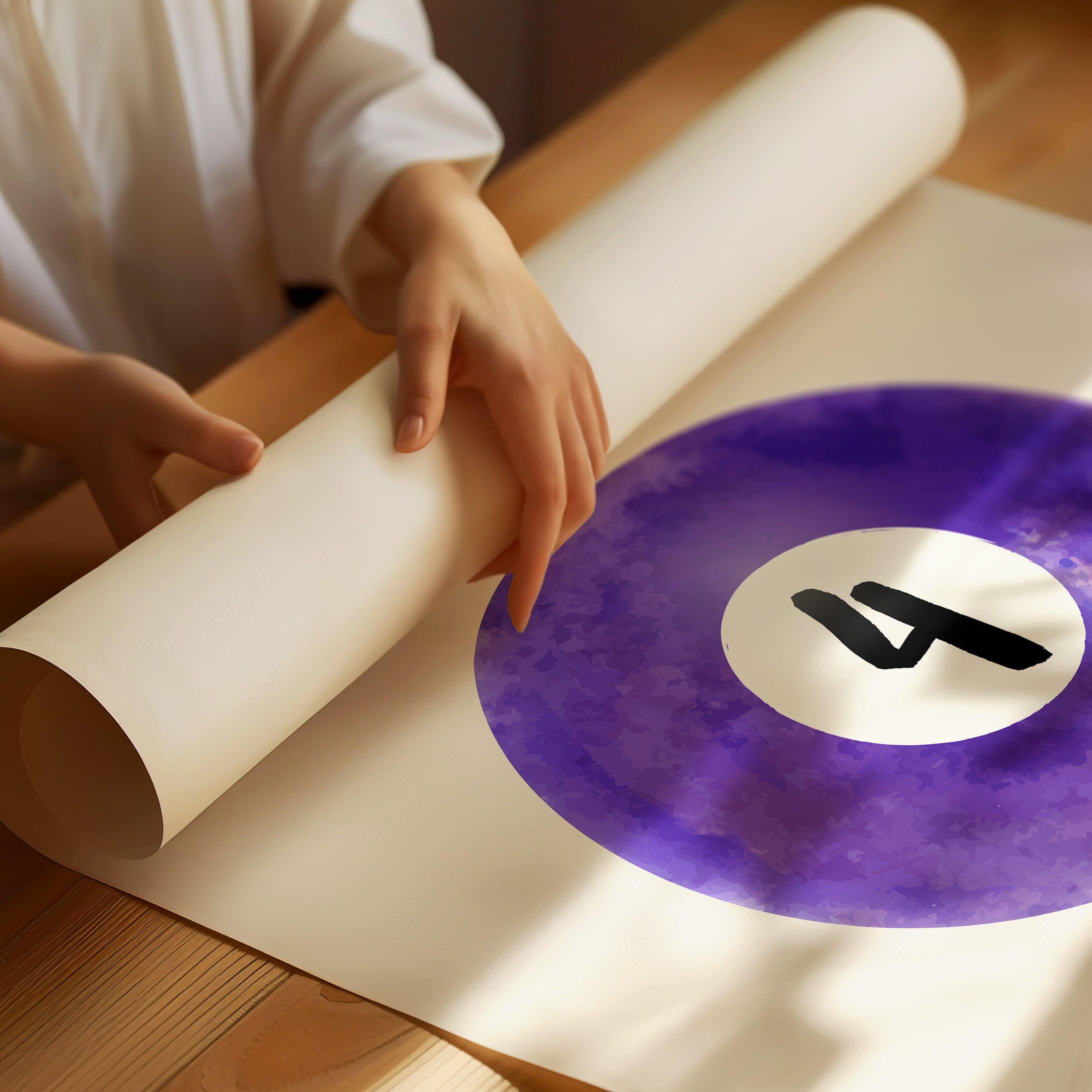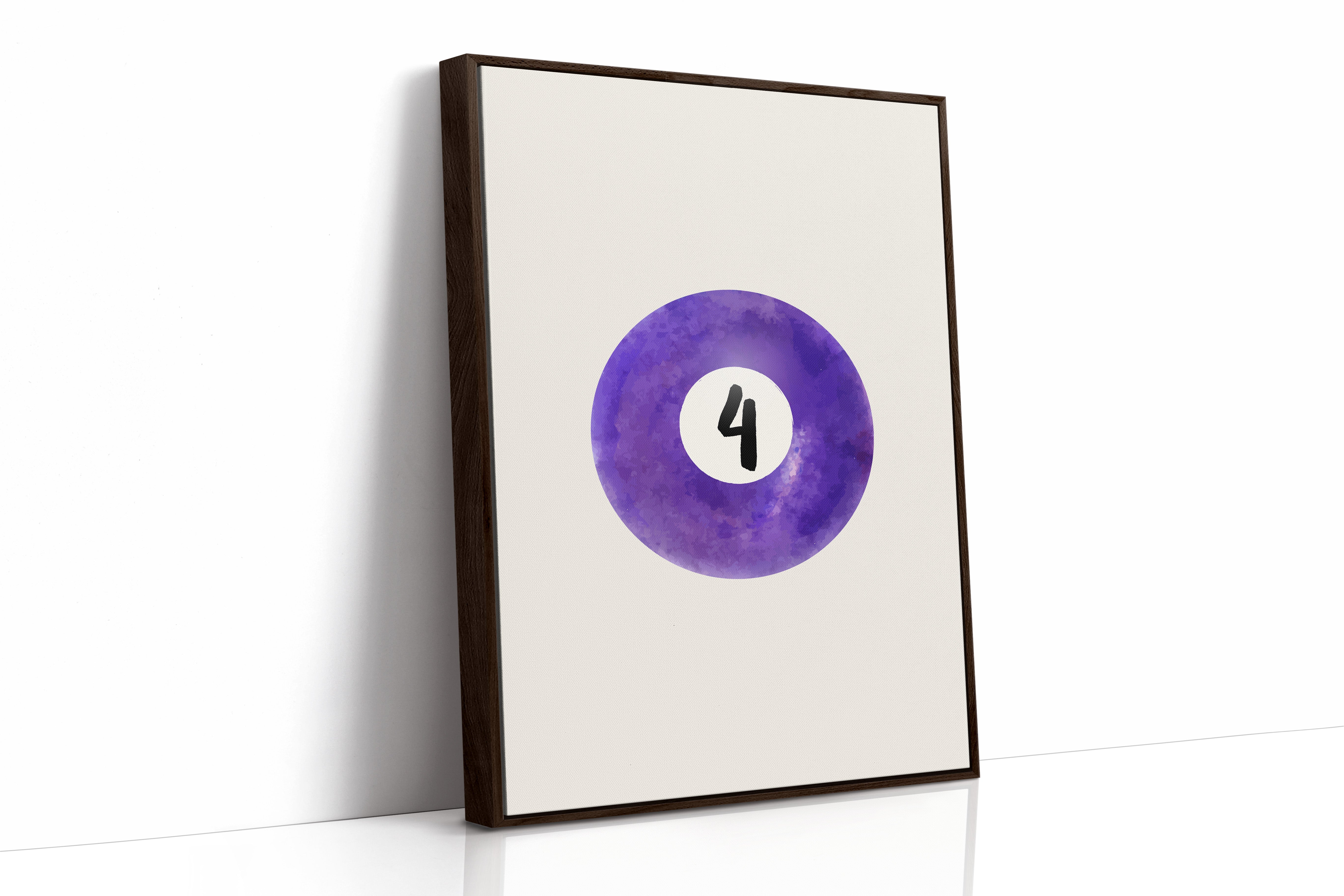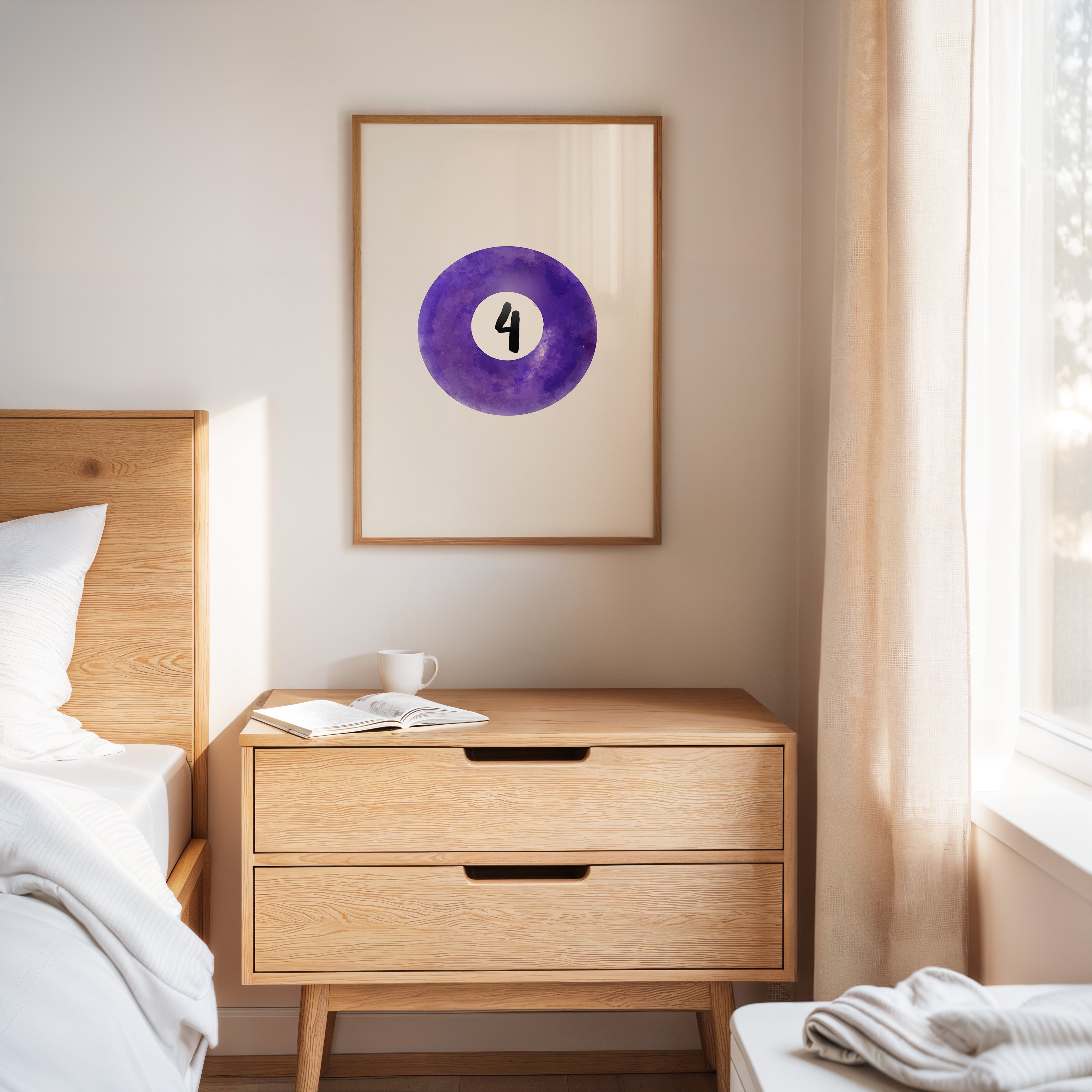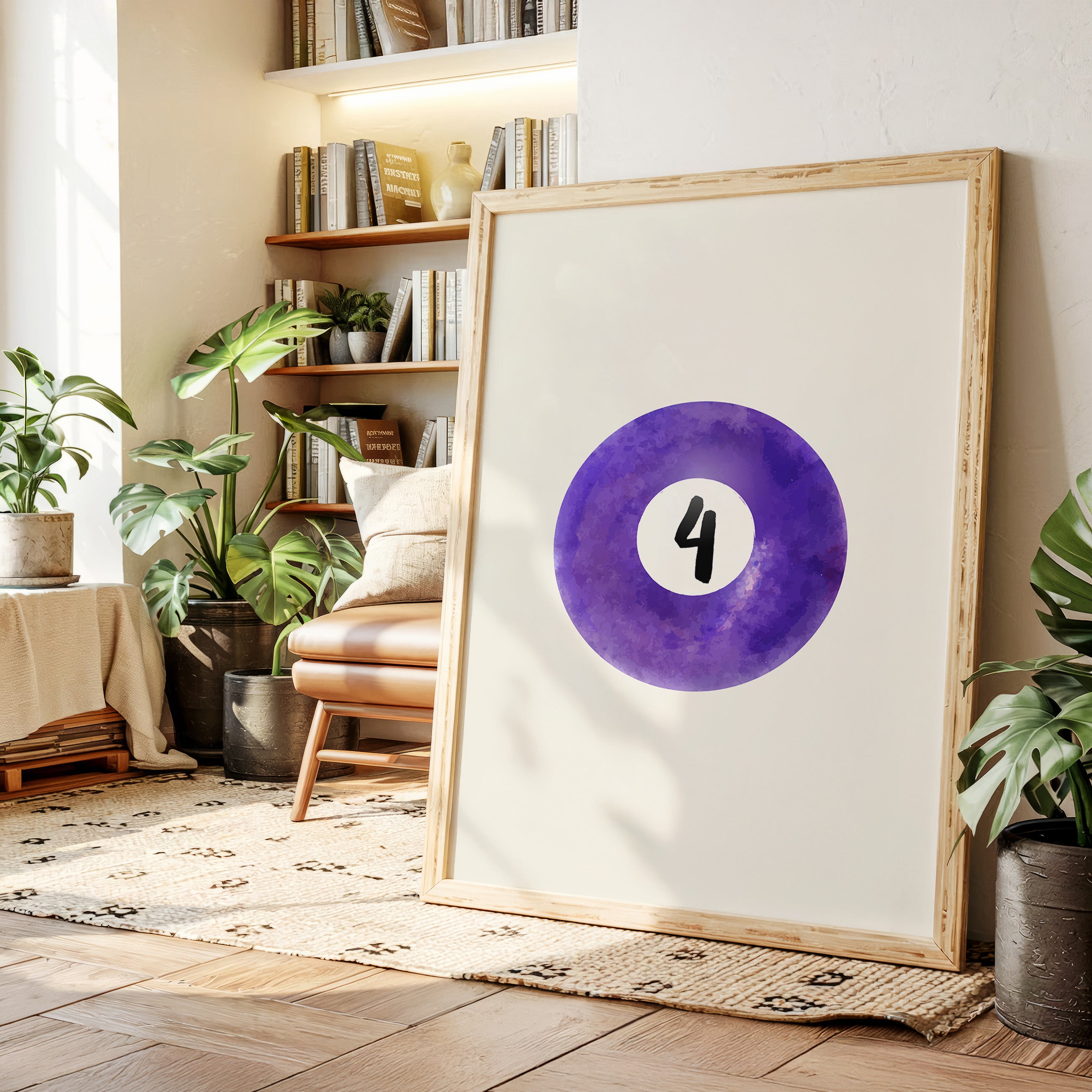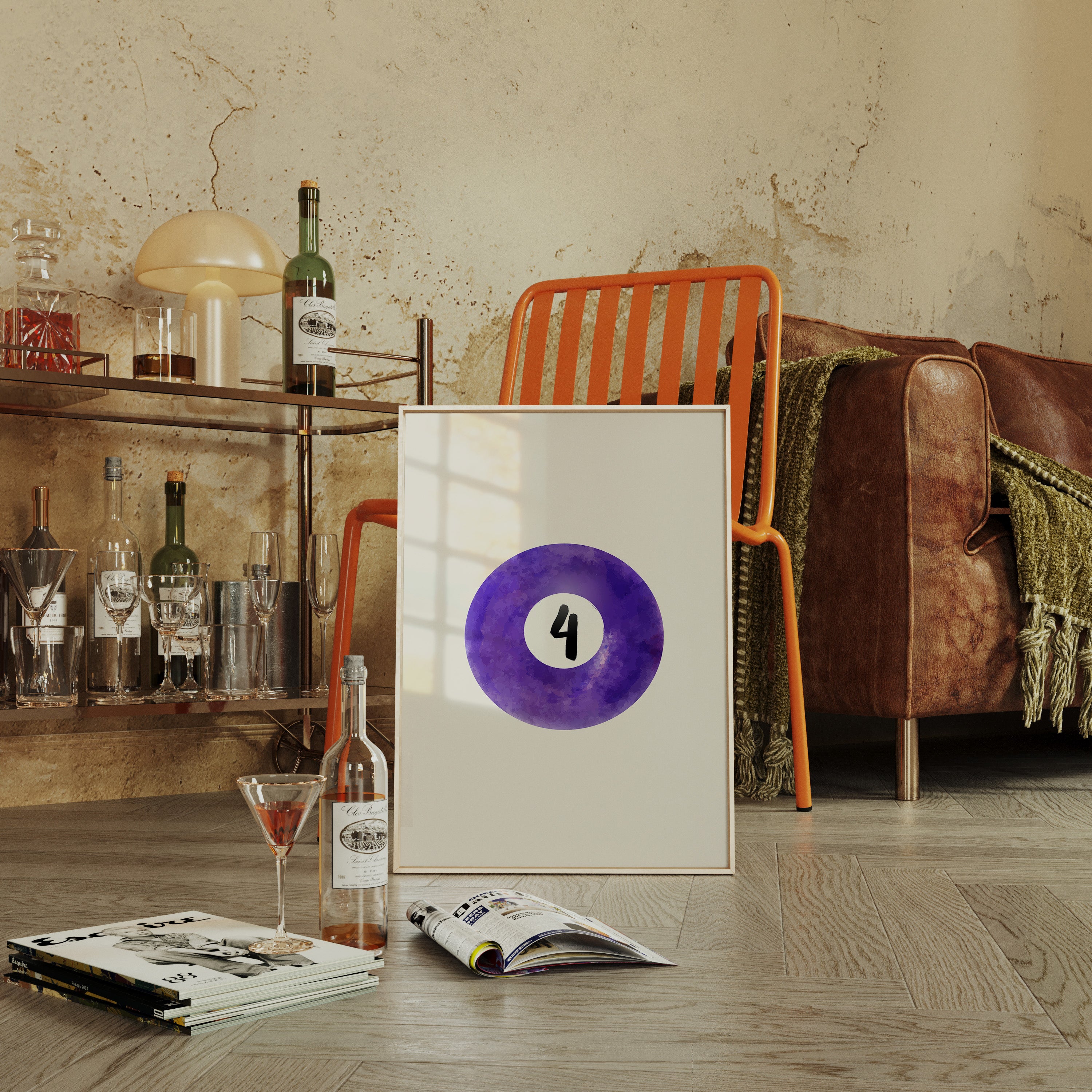 A deep violet pool ripples with possibility, centered around the bold number four like a cosmic bullseye. This piece from our Contemporary collection marries minimalist design with rich watercolor texture. The intense purple bleeds and blooms across the circular canvas, creating a mesmerizing contrast with the stark white center and bold black numeral. It speaks to both chance and intention, like the perfect combination of skill and serendipity. This striking piece adds modern sophistication to a game room, office, or any space calling for a touch of playful elegance. The simple yet impactful design invites both contemplation and conversation.