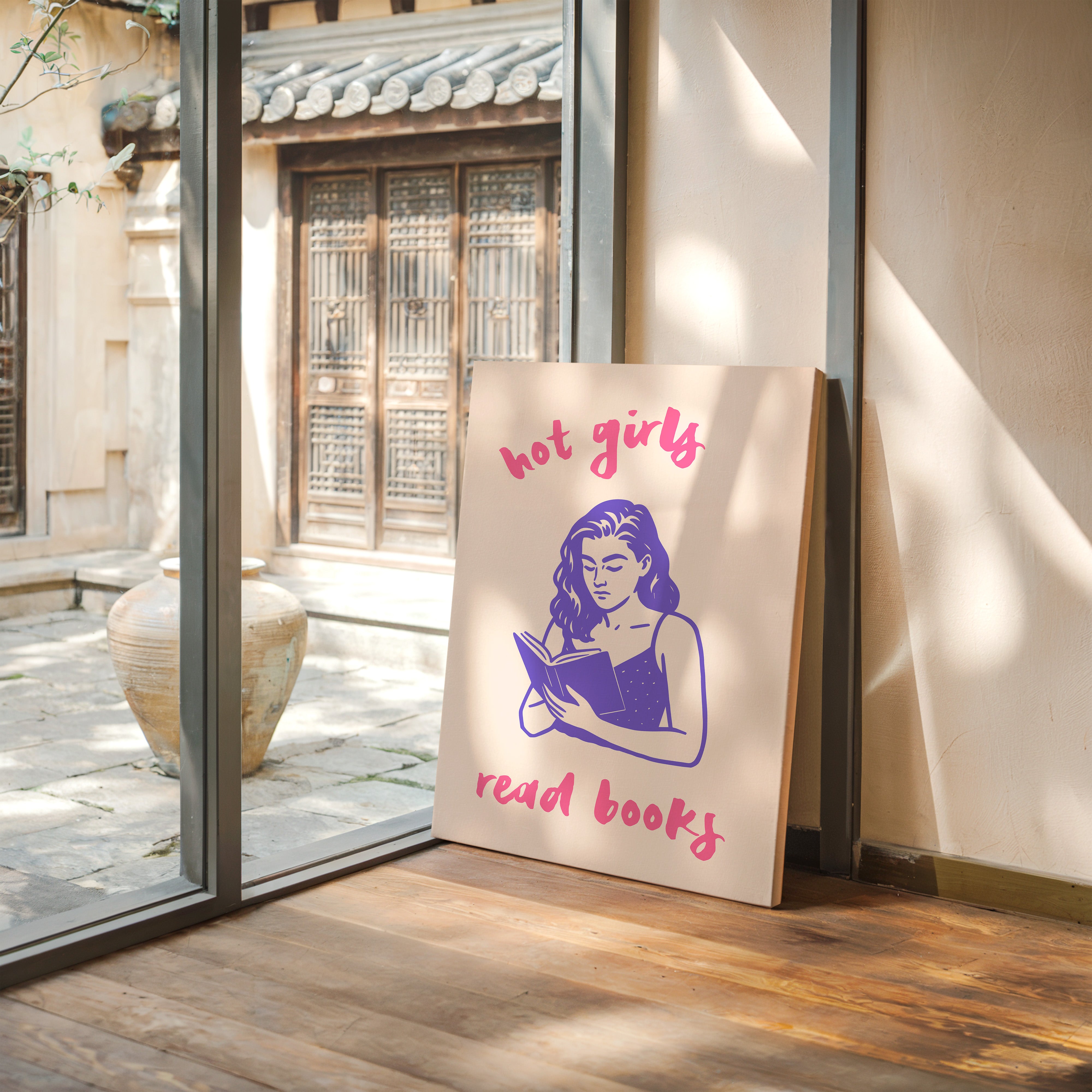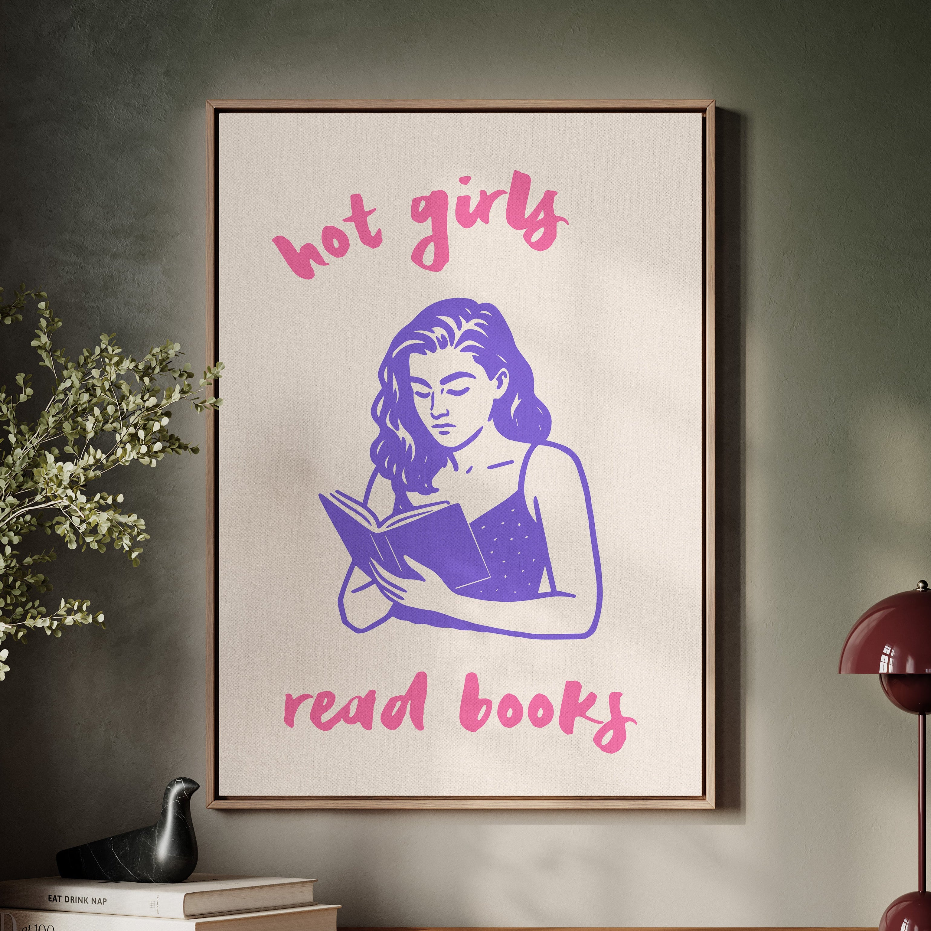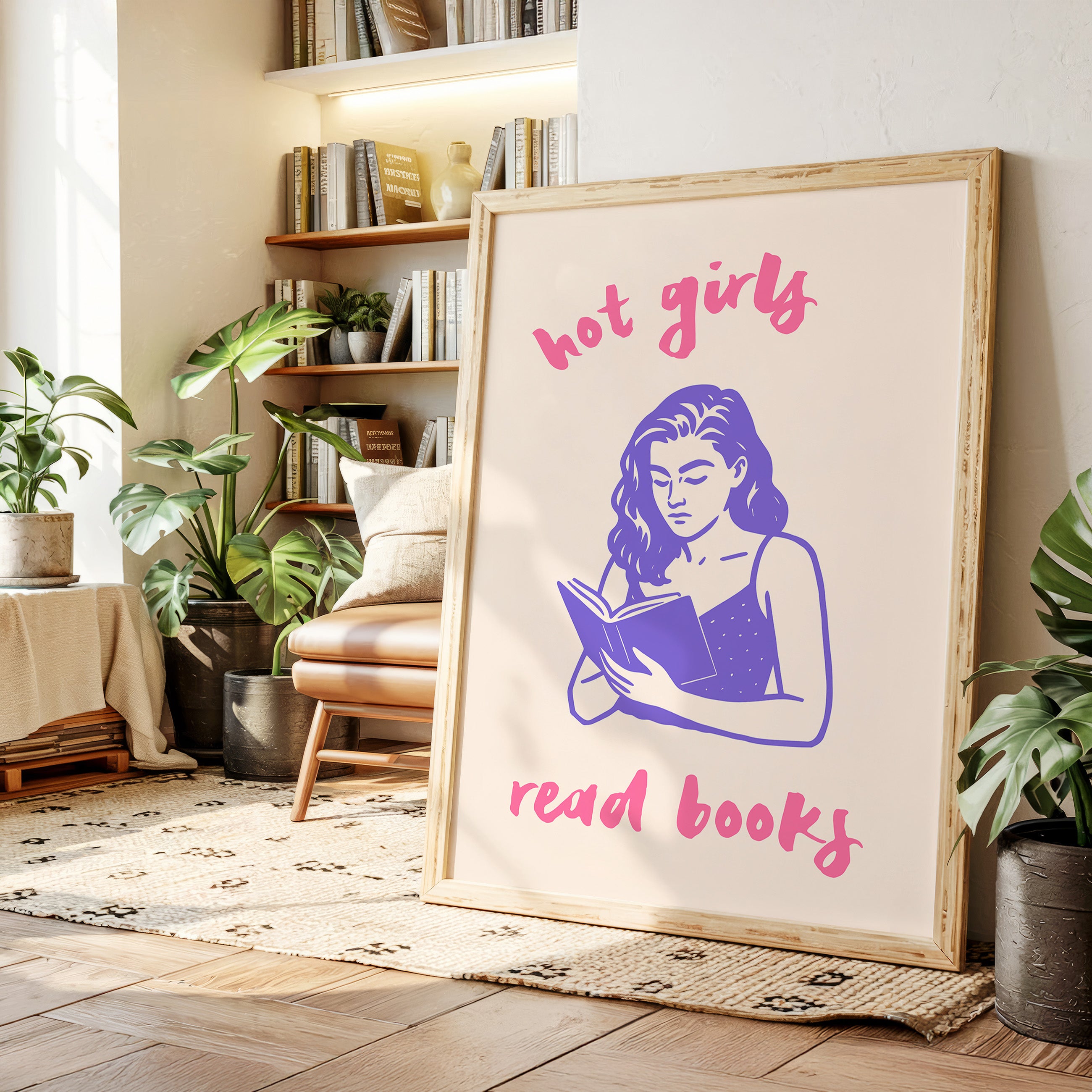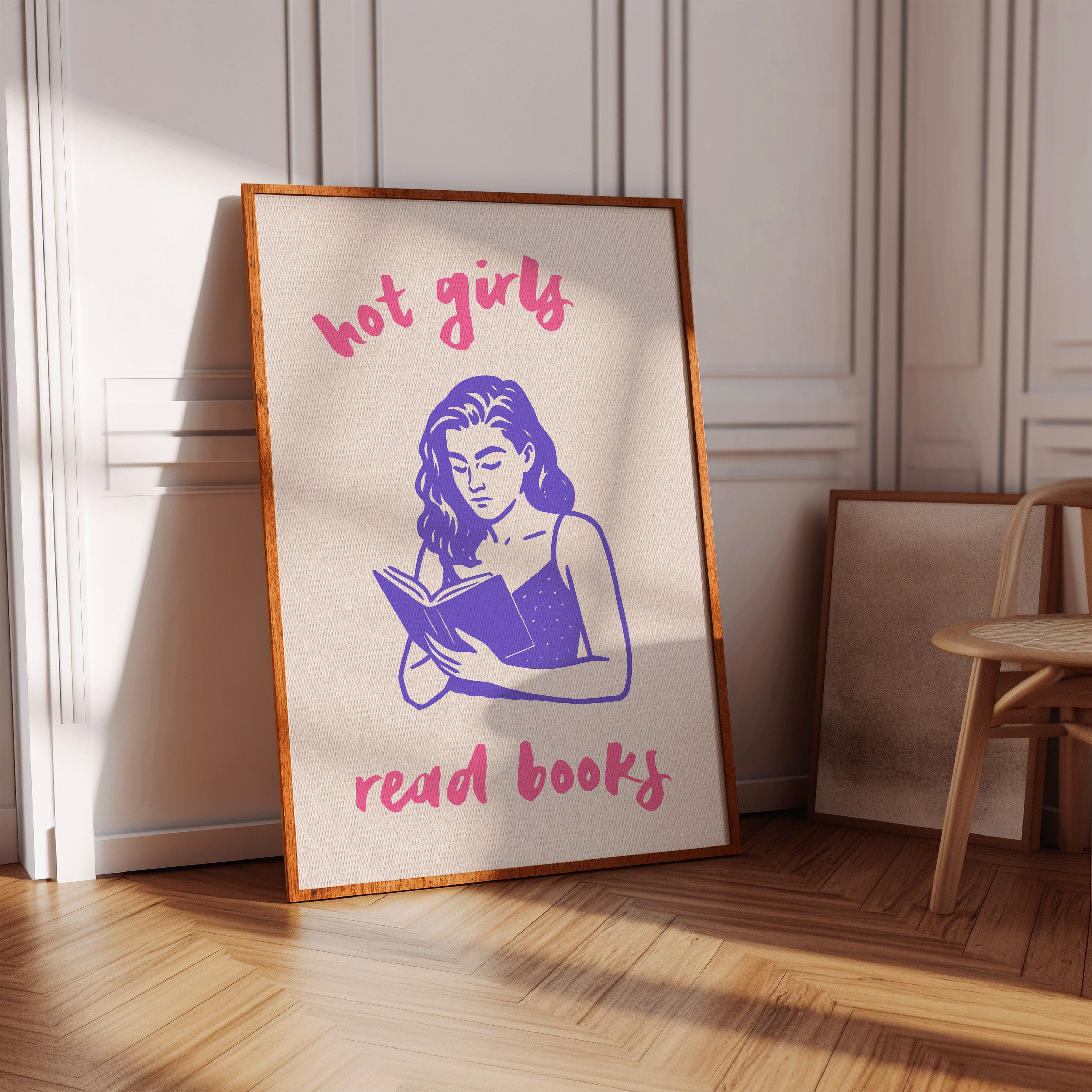 A gentle moment unfolds in shades of violet and pink, capturing the intimate communion between reader and story. The illustration's minimalist style emphasizes flowing lines and thoughtful composition, with a purple figure absorbed in the pages of an open book. The soft peach background creates a warm, inviting atmosphere that celebrates literary devotion and quiet contemplation. This piece speaks to the timeless joy of getting lost in a good book, with its modern typography adding a contemporary feminist edge. Perfect for a reading nook, home library, or any space dedicated to literary pursuits and peaceful reflection.