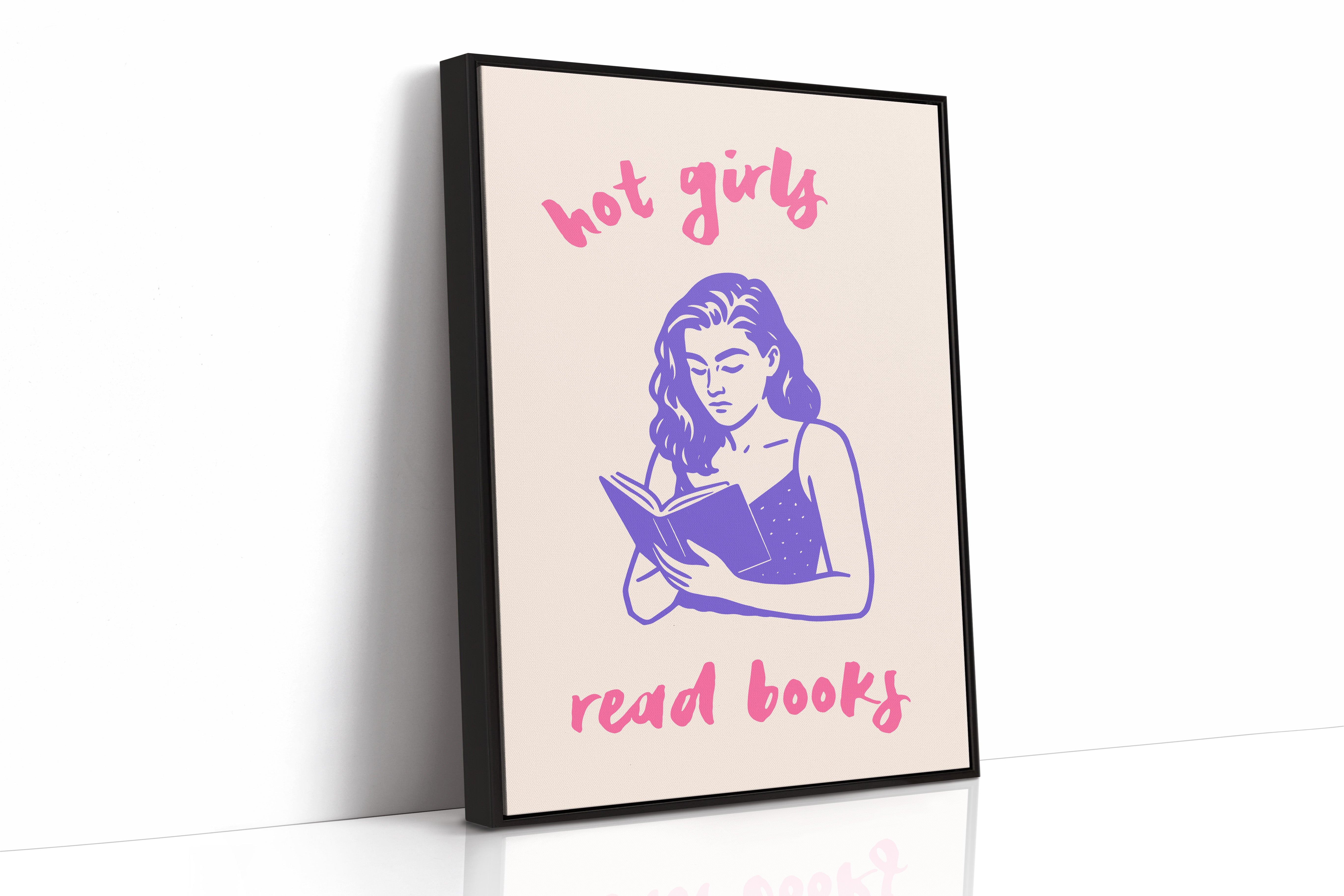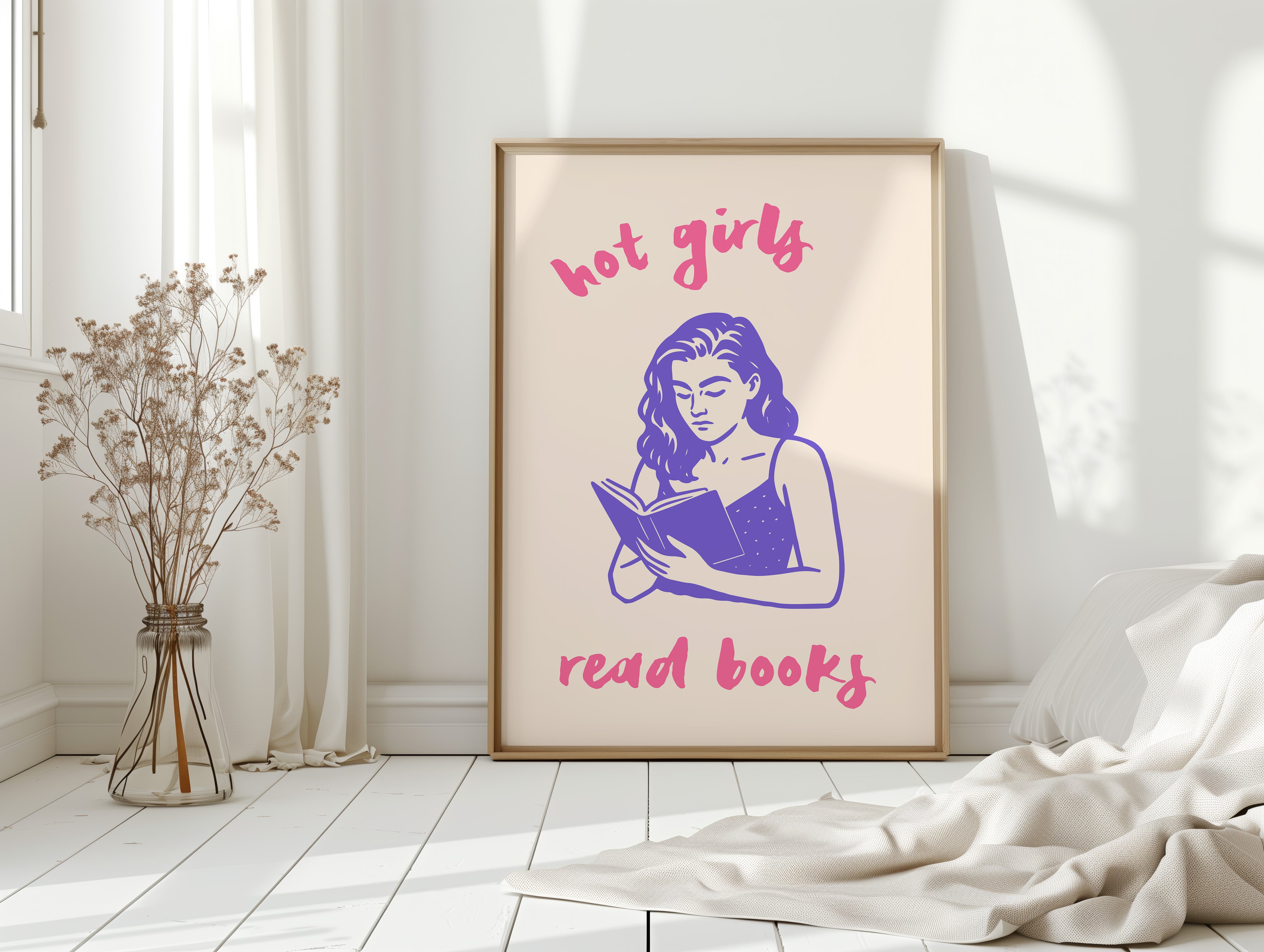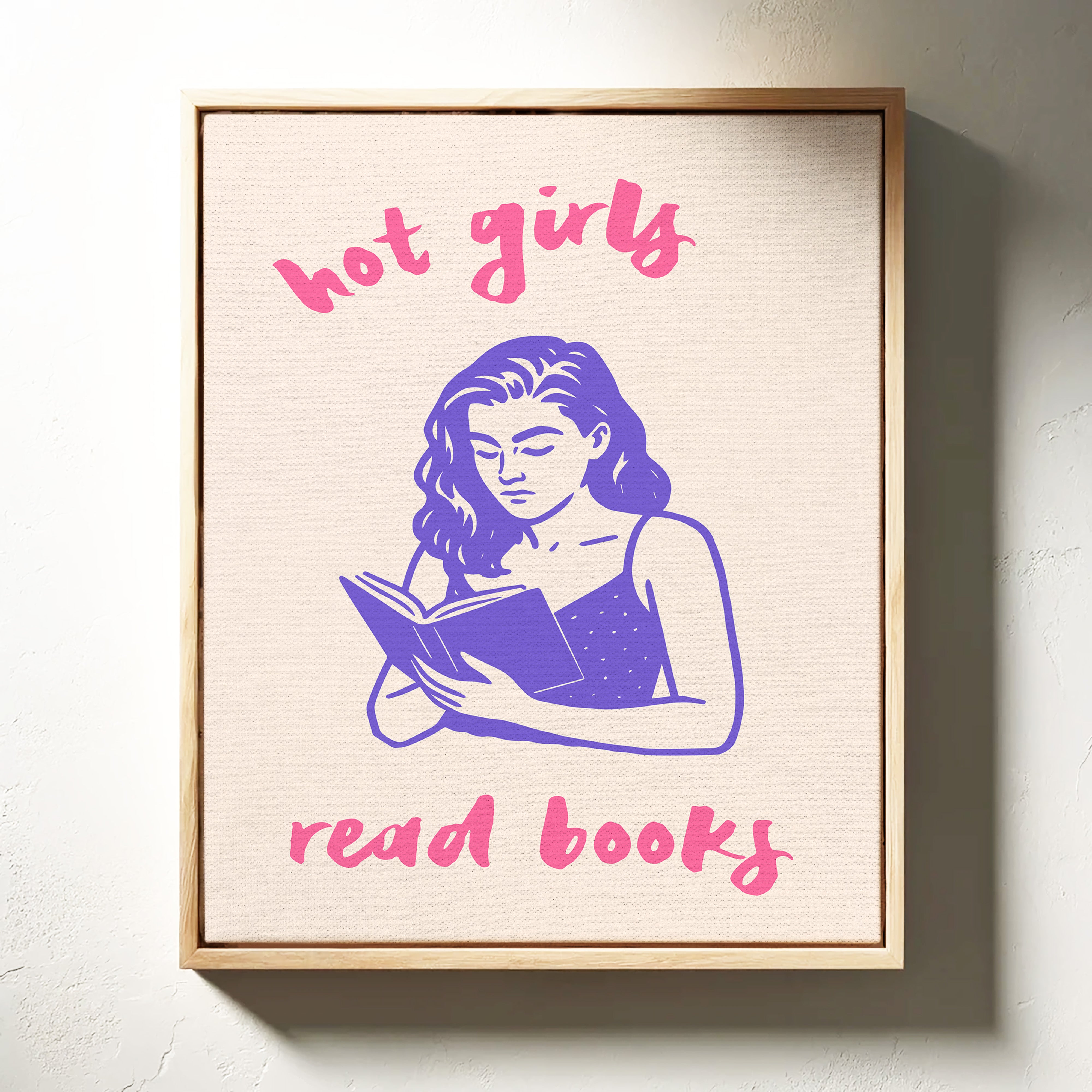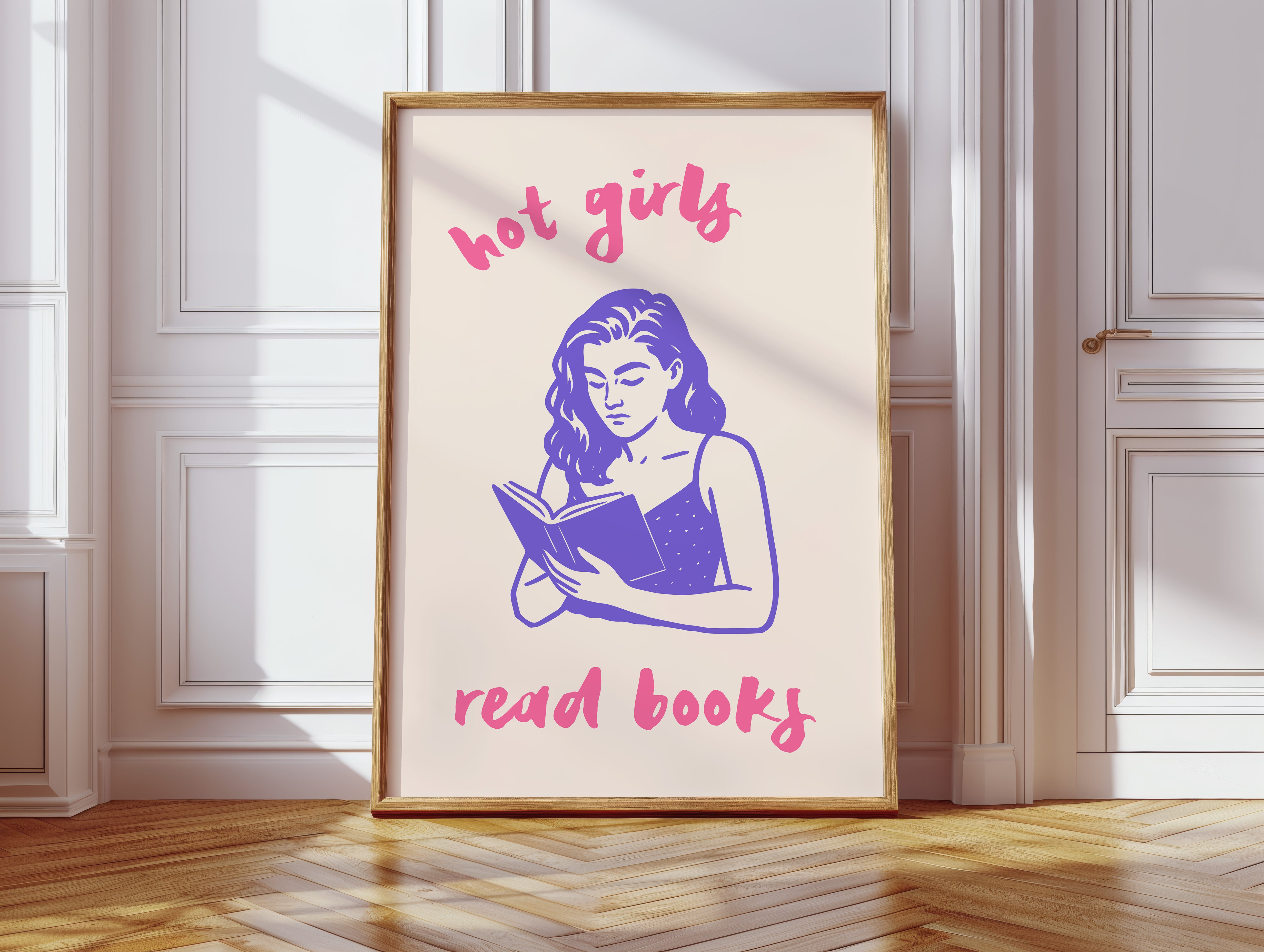 A gentle moment unfolds in shades of violet and pink, capturing the intimate communion between reader and story. The illustration's minimalist style emphasizes flowing lines and thoughtful composition, with a purple figure absorbed in the pages of an open book. The soft peach background creates a warm, inviting atmosphere that celebrates literary devotion and quiet contemplation. This piece speaks to the timeless joy of getting lost in a good book, with its modern typography adding a contemporary feminist edge. Perfect for a reading nook, home library, or any space dedicated to literary pursuits and peaceful reflection.
