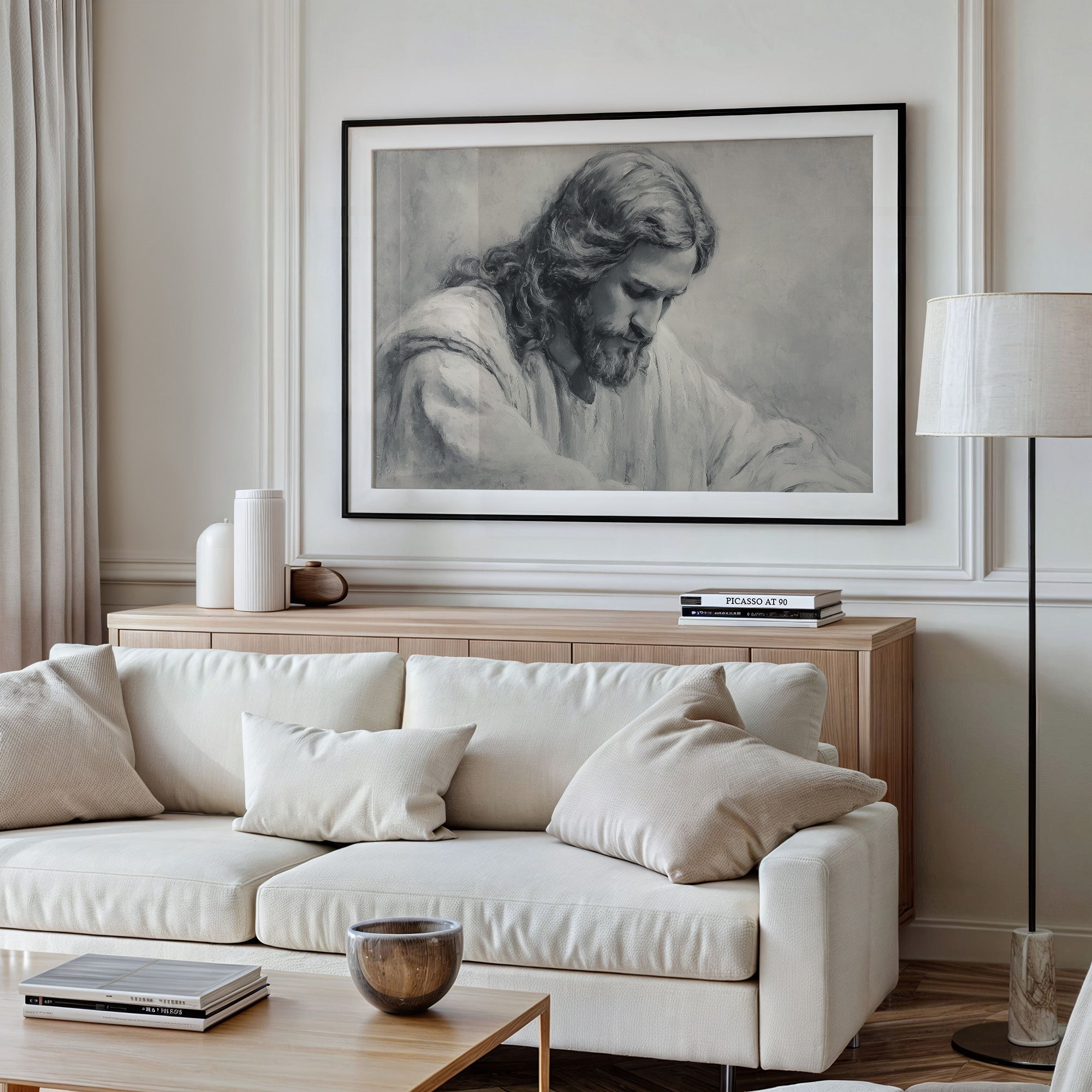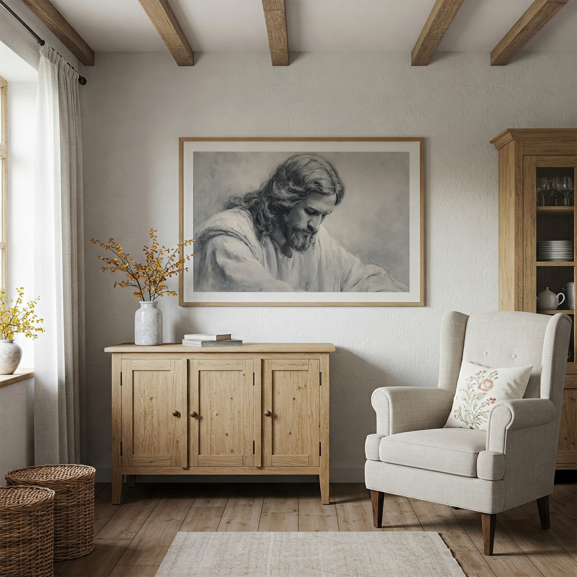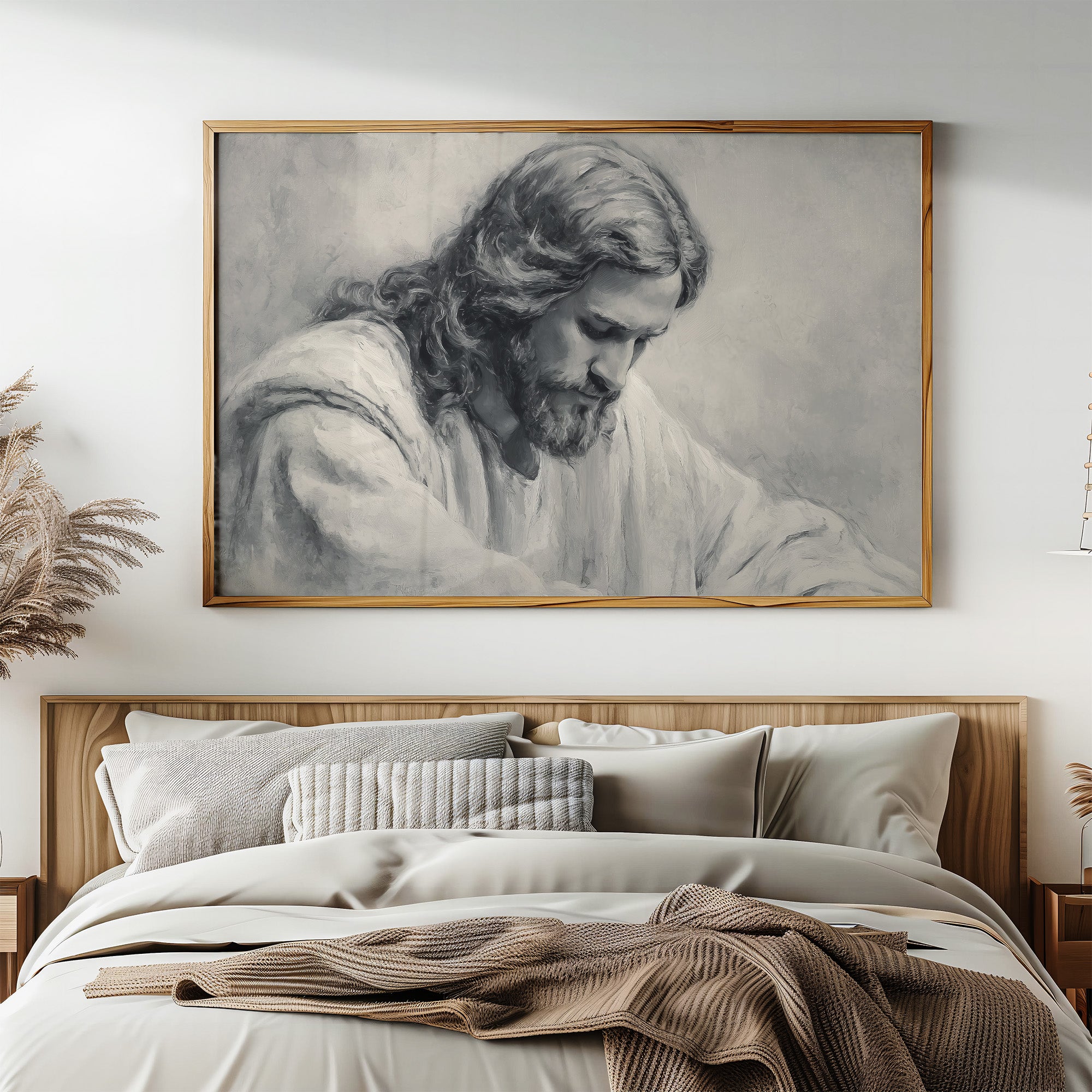 A moment of sacred stillness captured in charcoal and graphite. The monochromatic portrait rests thoughtfully among wooden shelves lined with well-loved books, creating a peaceful sanctuary of reflection. Soft shadows and delicate linework bring depth to the contemplative scene, while dried pampas grass in an earthen vessel adds organic texture to this serene corner. This piece creates a meditative focal point for a home office, reading nook, or any space where quiet reflection is cherished.