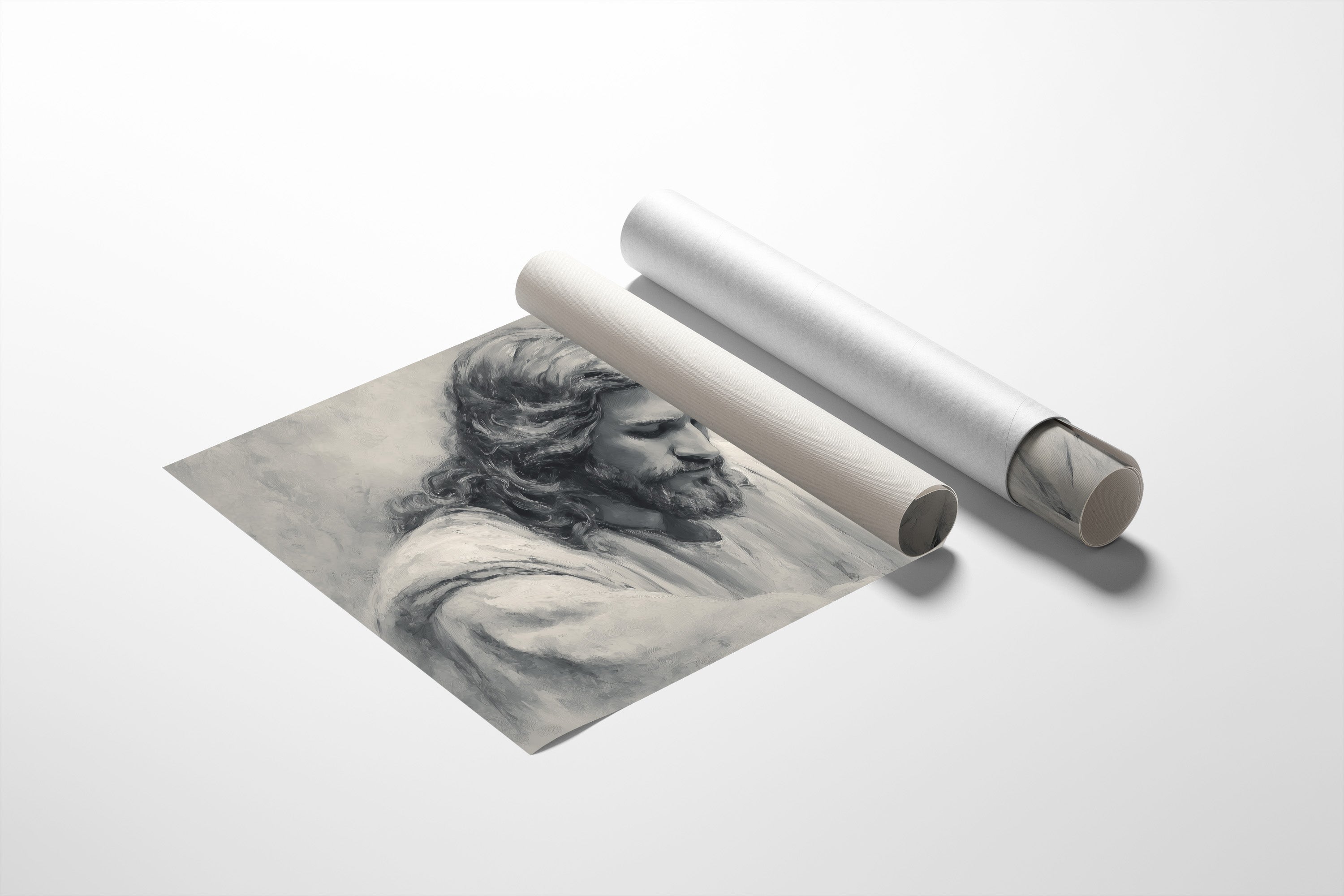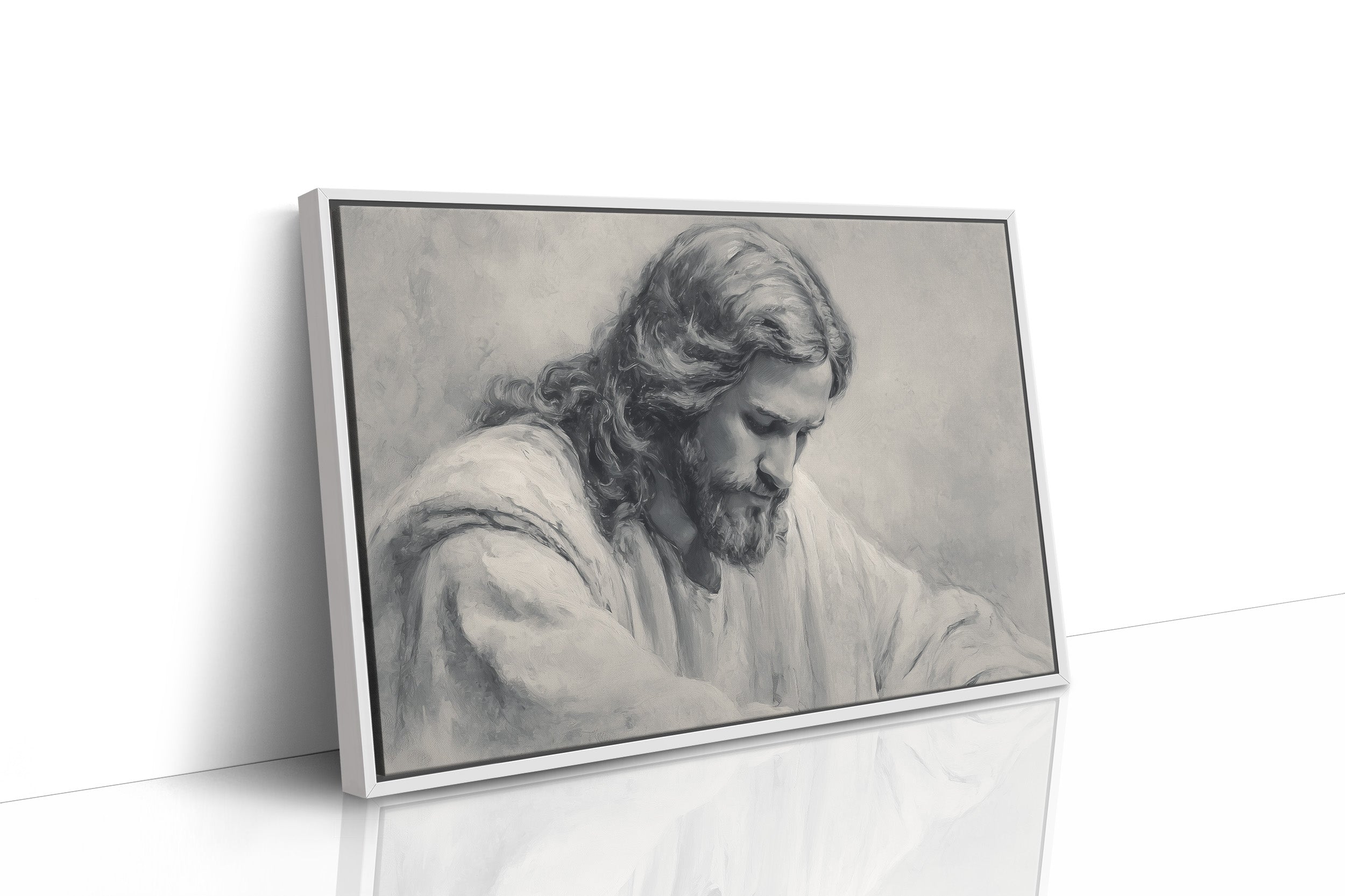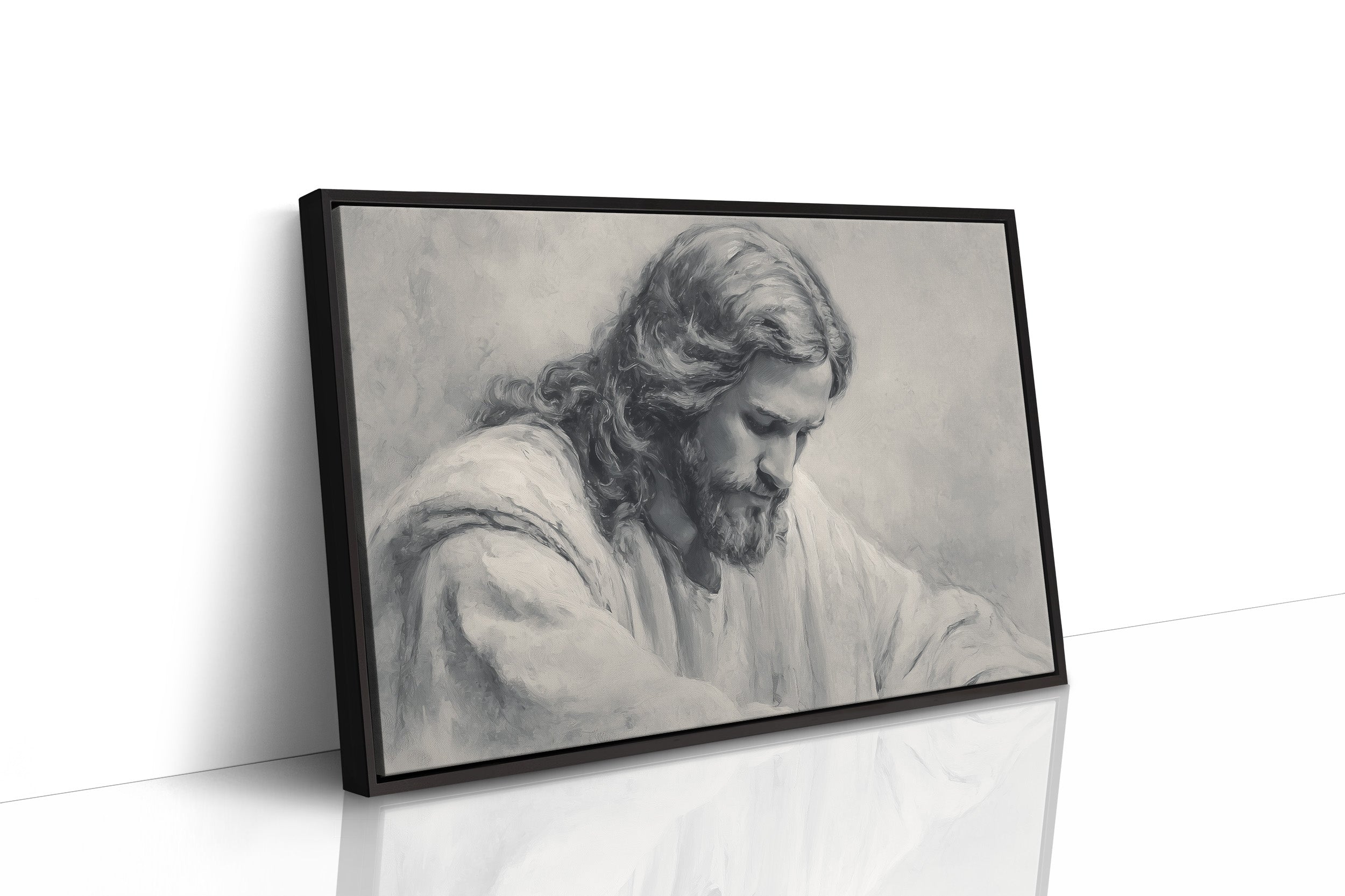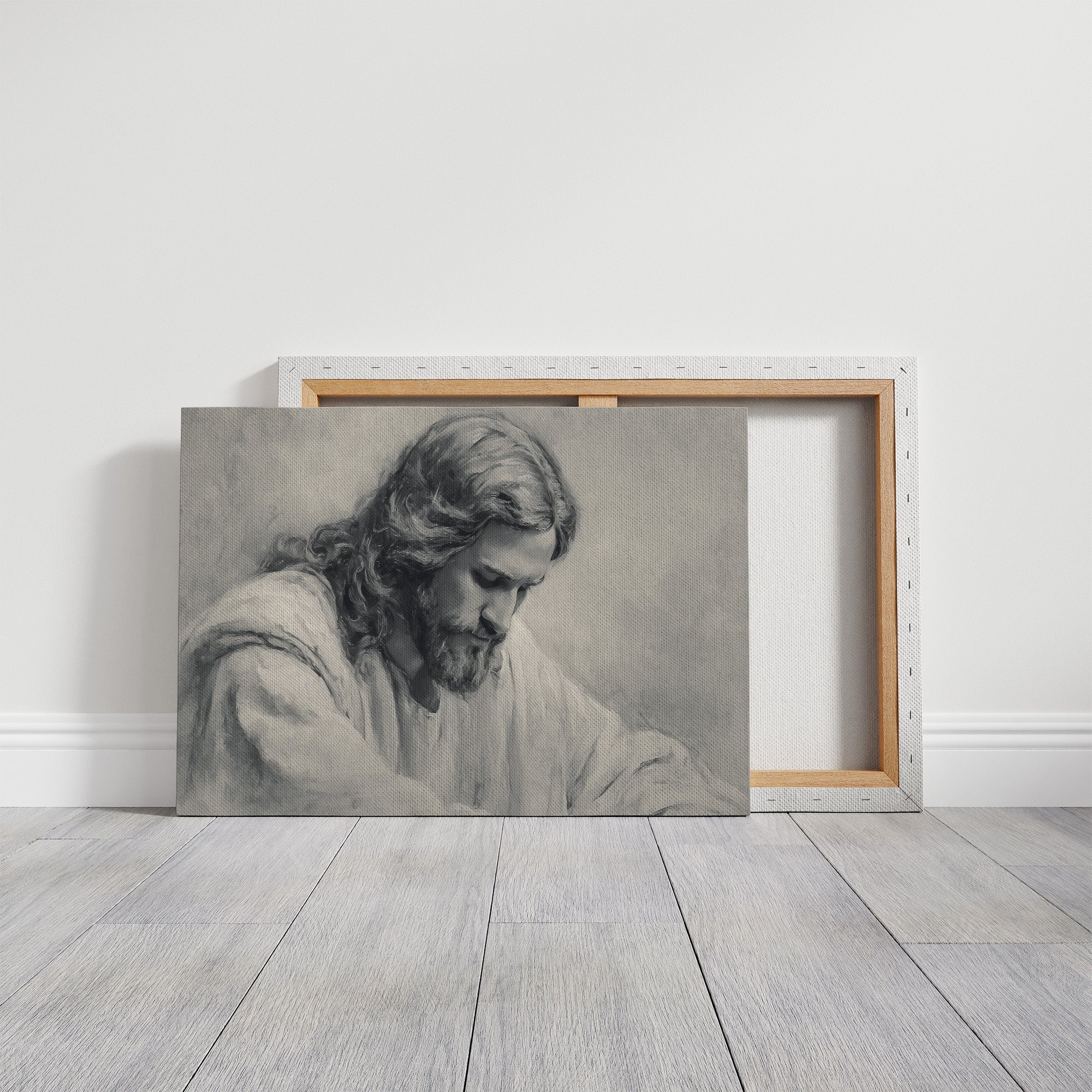 A moment of sacred stillness captured in charcoal and graphite. The monochromatic portrait rests thoughtfully among wooden shelves lined with well-loved books, creating a peaceful sanctuary of reflection. Soft shadows and delicate linework bring depth to the contemplative scene, while dried pampas grass in an earthen vessel adds organic texture to this serene corner. This piece creates a meditative focal point for a home office, reading nook, or any space where quiet reflection is cherished.