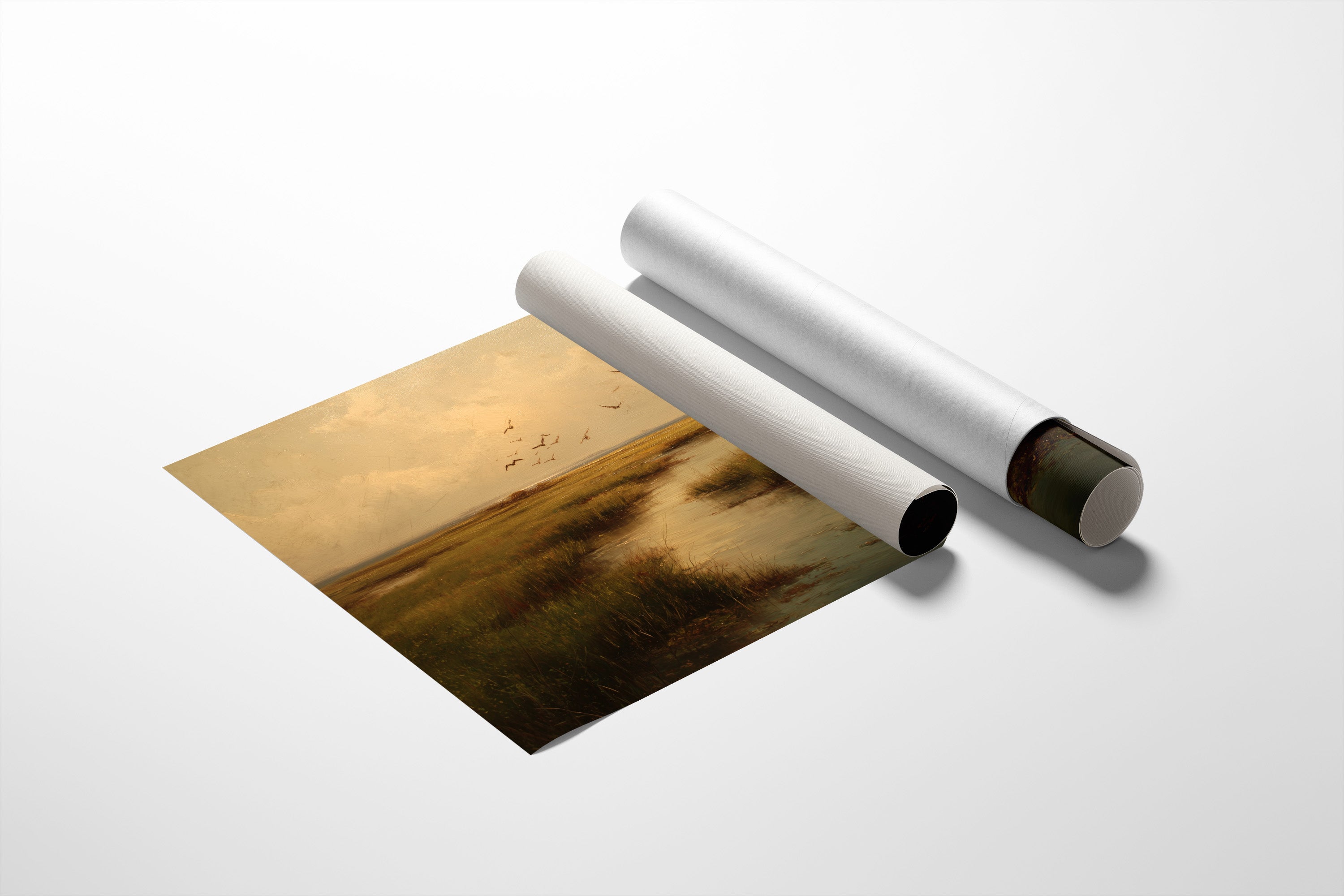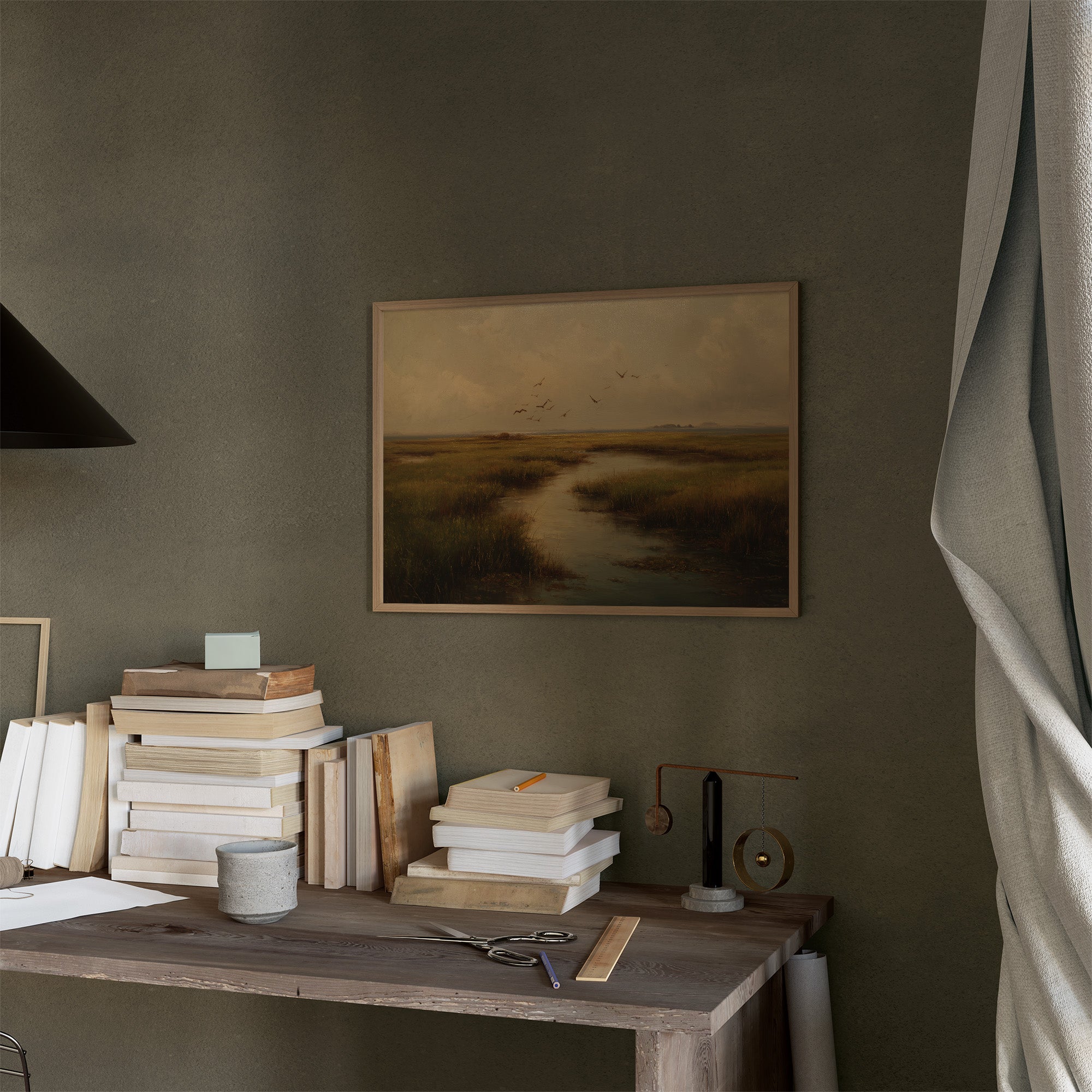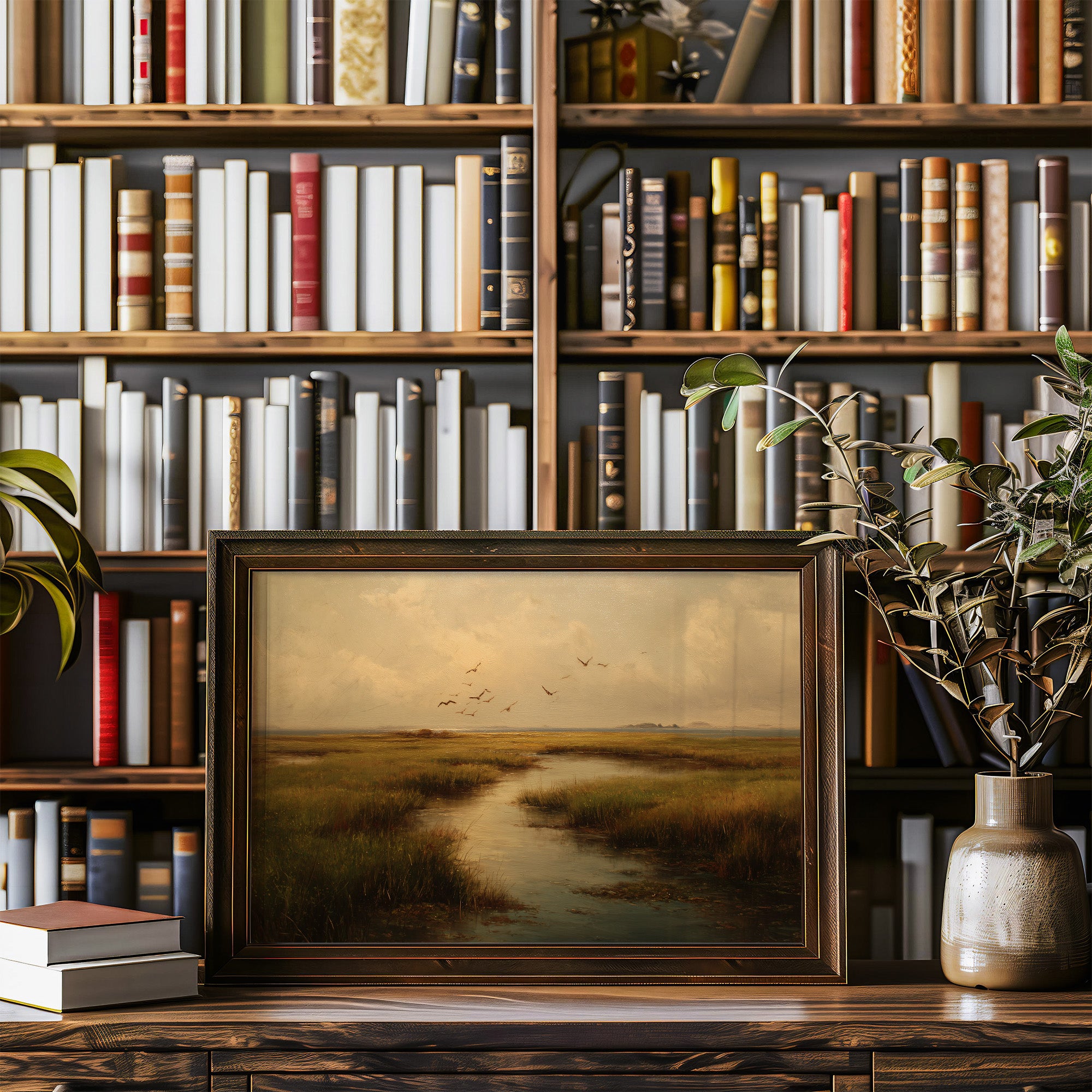 The gentle curve of water winds through golden marshlands, carrying centuries of secrets beneath a honey-hued sky. Birds drift like scattered thoughts above the serene landscape, their silhouettes promising adventure beyond the distant horizon. This tranquil scene rests against a backdrop of collected wisdom, the leather-bound spines and well-worn pages creating a sanctuary for both literature and nature's artistry.