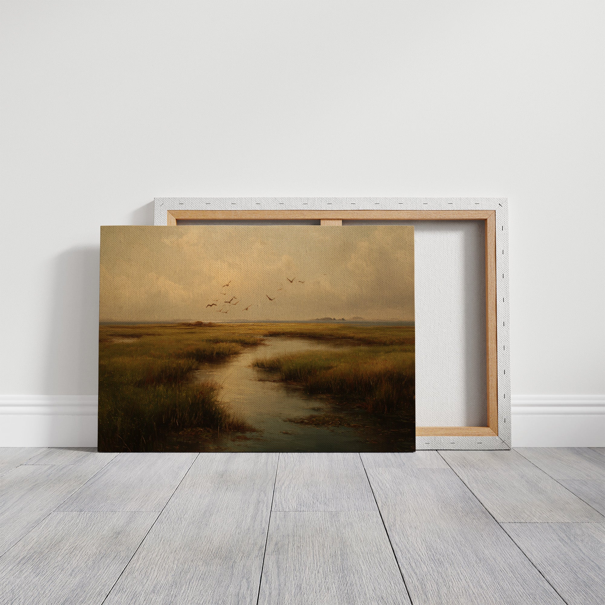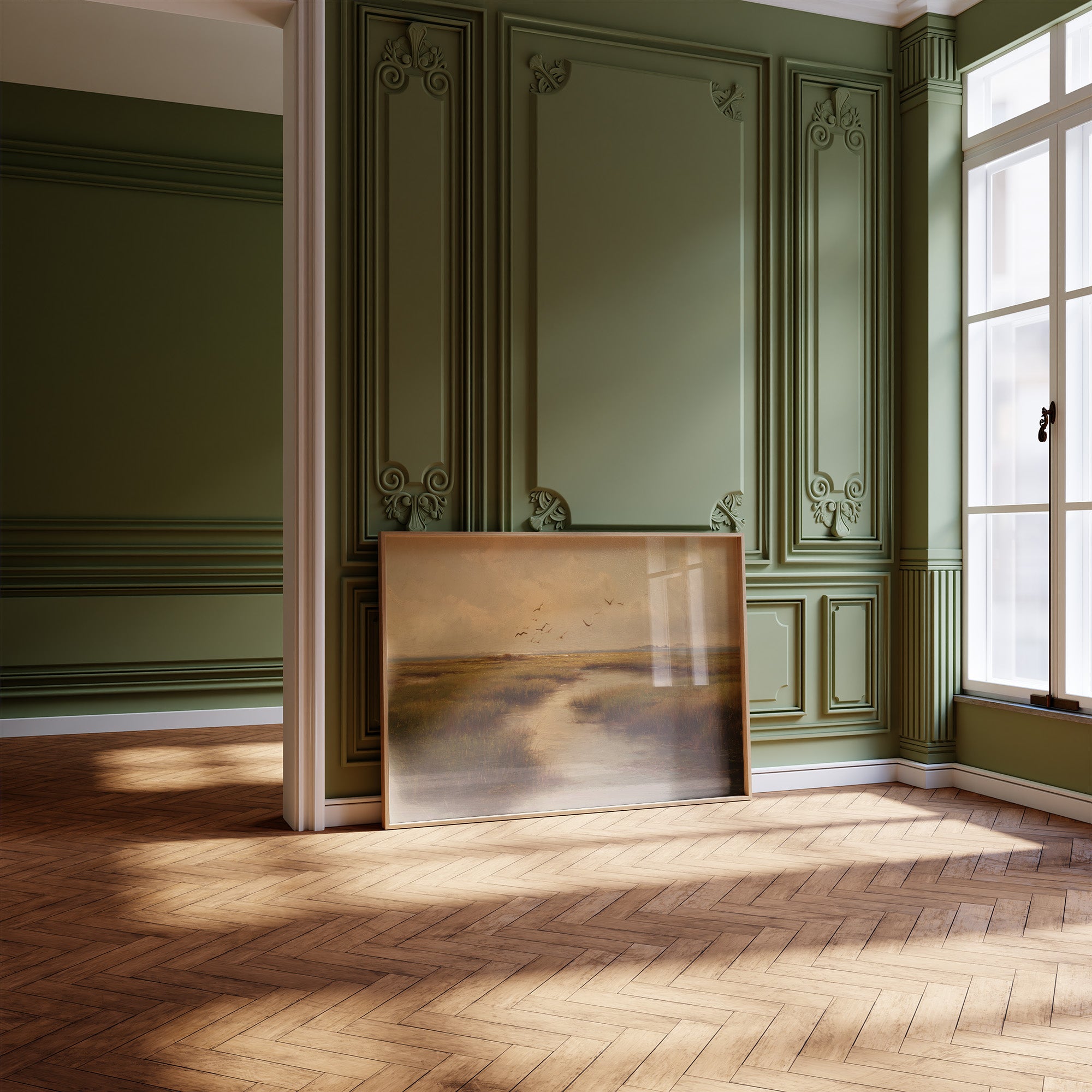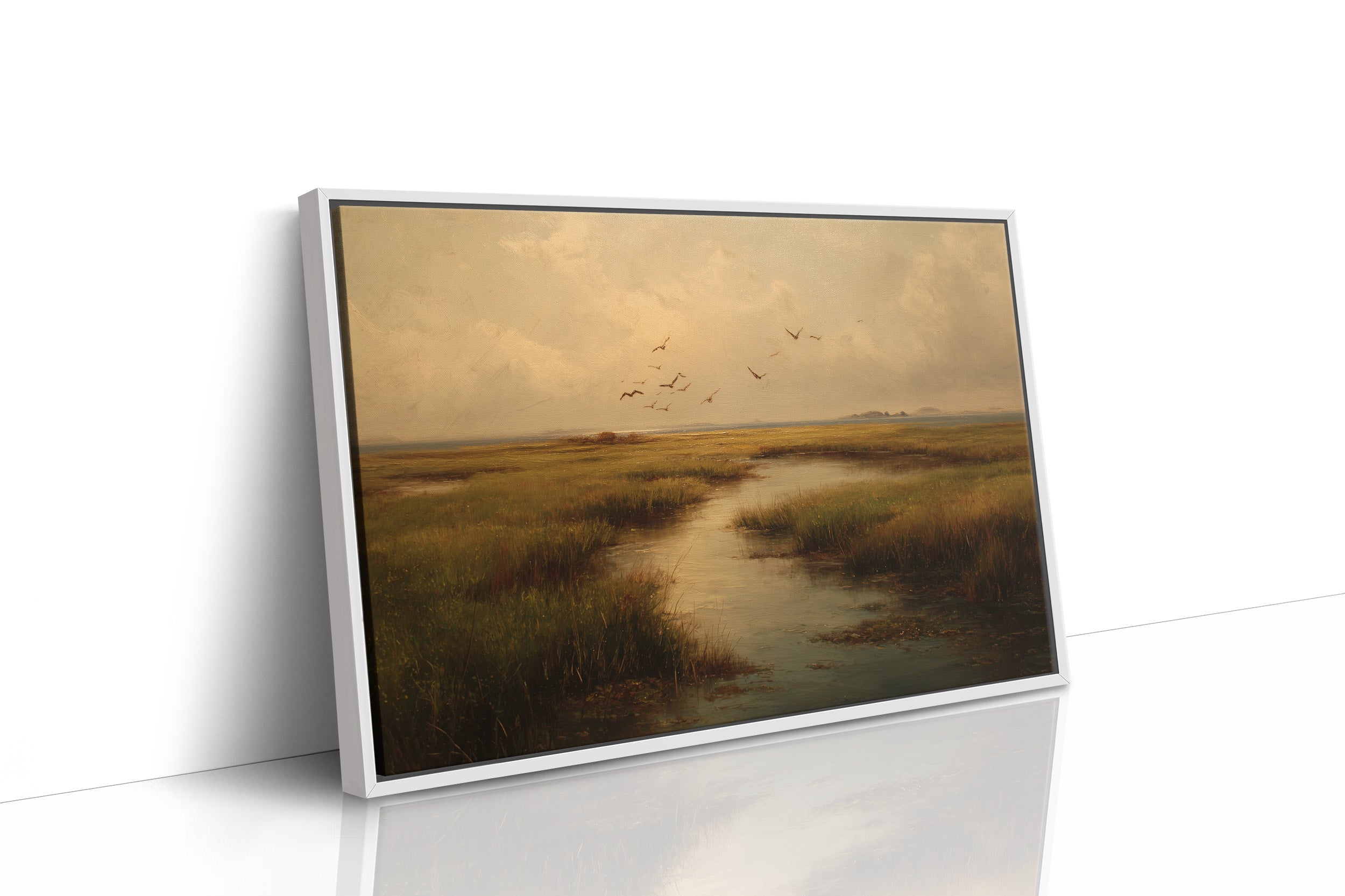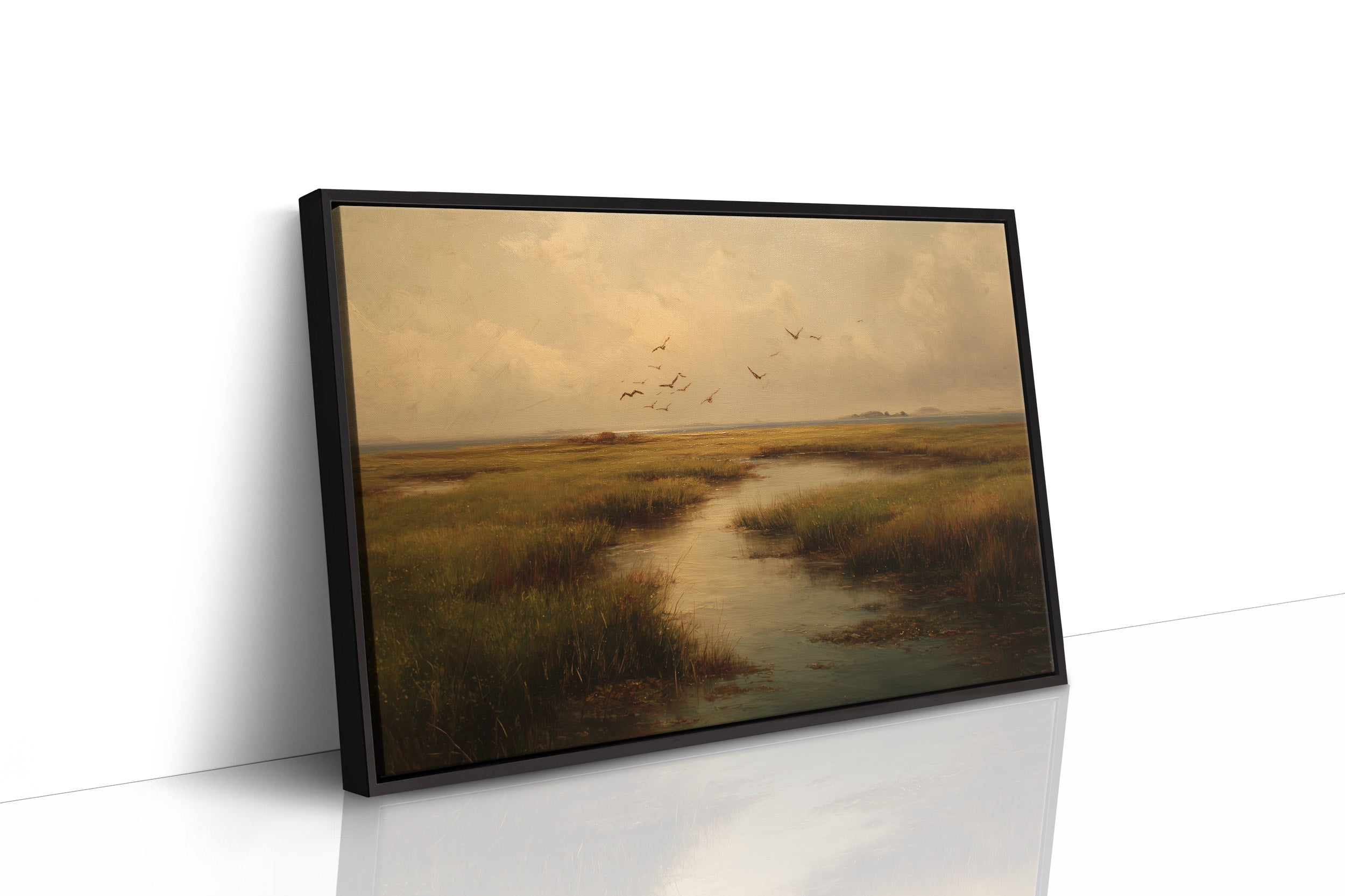The gentle curve of water winds through golden marshlands, carrying centuries of secrets beneath a honey-hued sky. Birds drift like scattered thoughts above the serene landscape, their silhouettes promising adventure beyond the distant horizon. This tranquil scene rests against a backdrop of collected wisdom, the leather-bound spines and well-worn pages creating a sanctuary for both literature and nature's artistry.