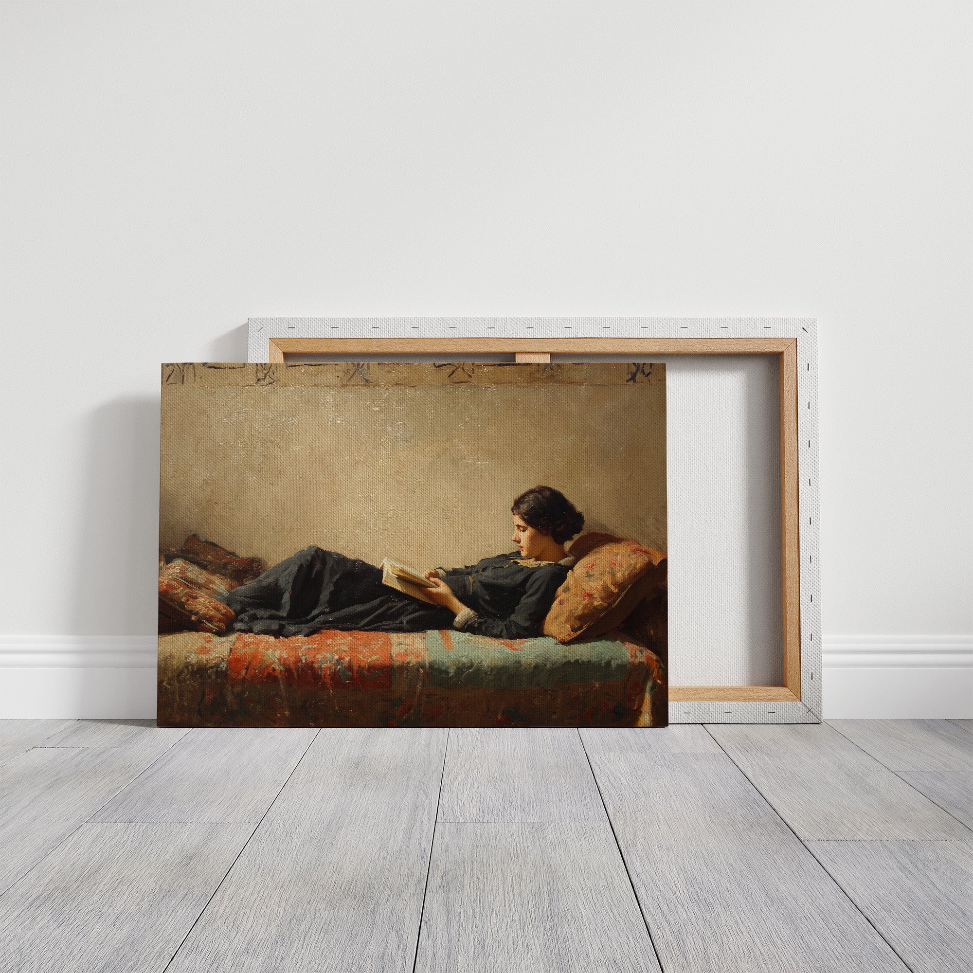 A classical painting rests against a backdrop of well-stocked bookshelves, creating a moment of perfect literary harmony. The vintage artwork depicts a figure absorbed in reading while reclining on a richly textured couch, embodying the timeless pleasure of getting lost in a good book. Warm amber tones of the painting contrast beautifully with the orderly rows of colorful book spines, while delicate greenery adds a touch of life to this scholarly sanctuary.