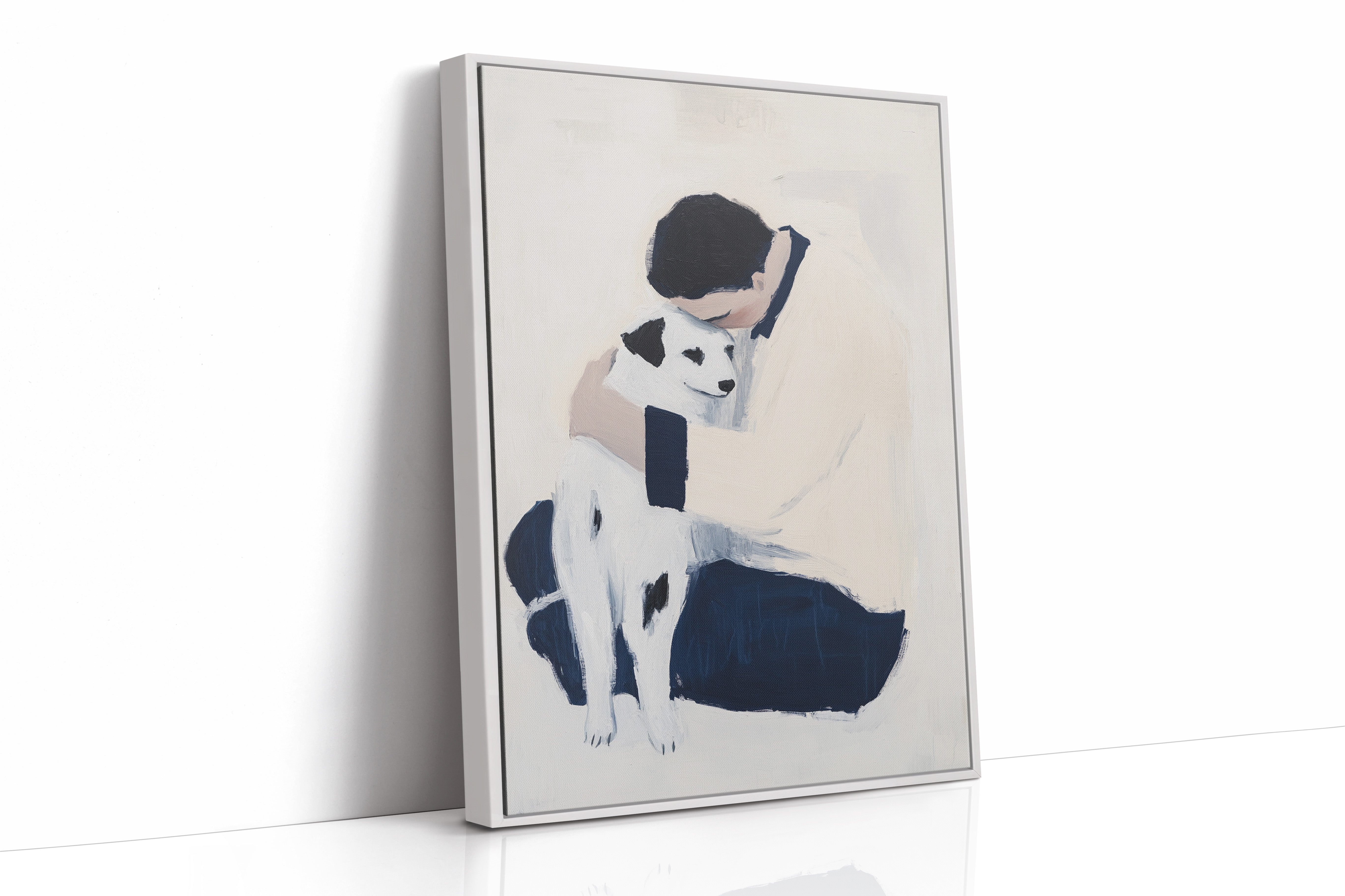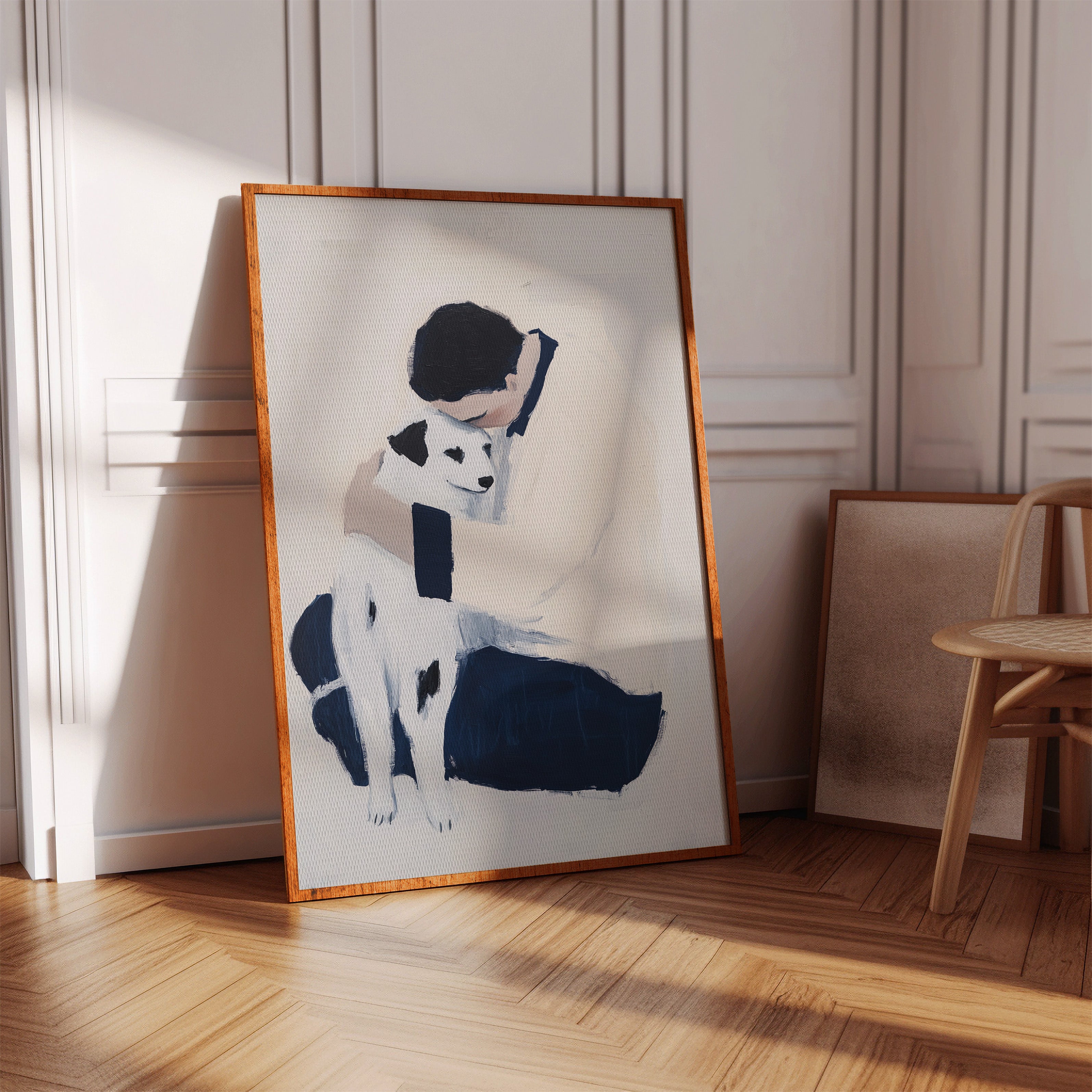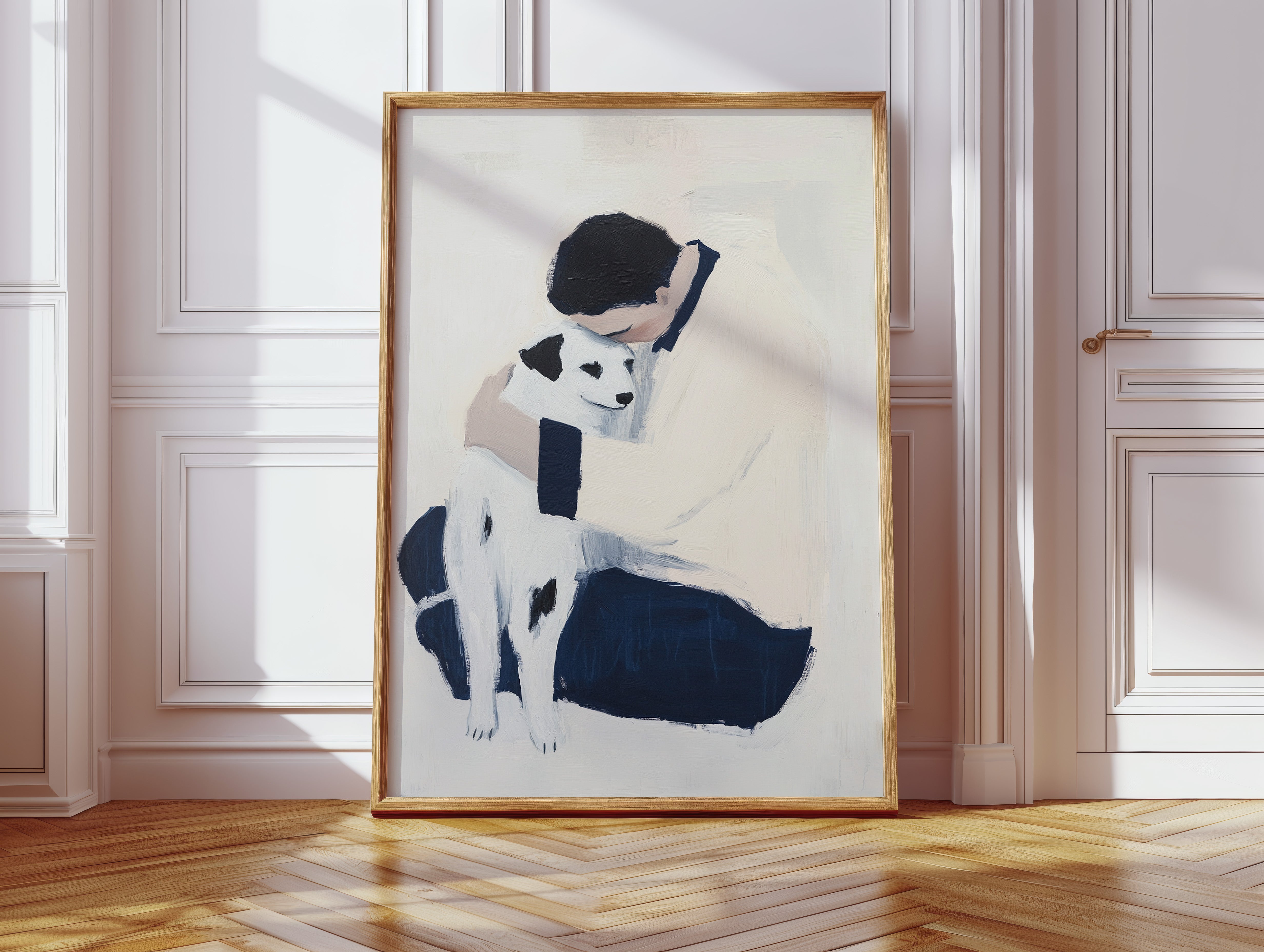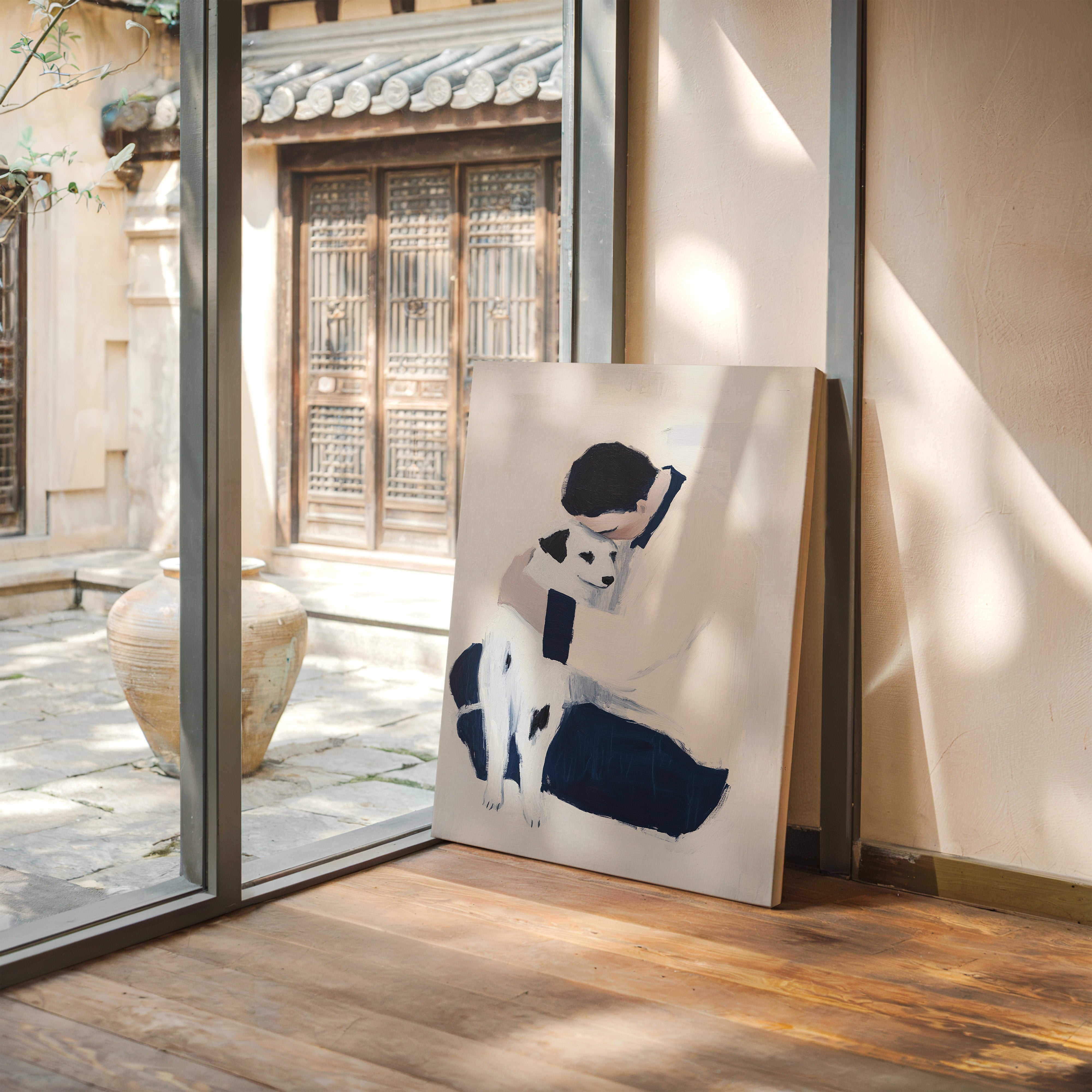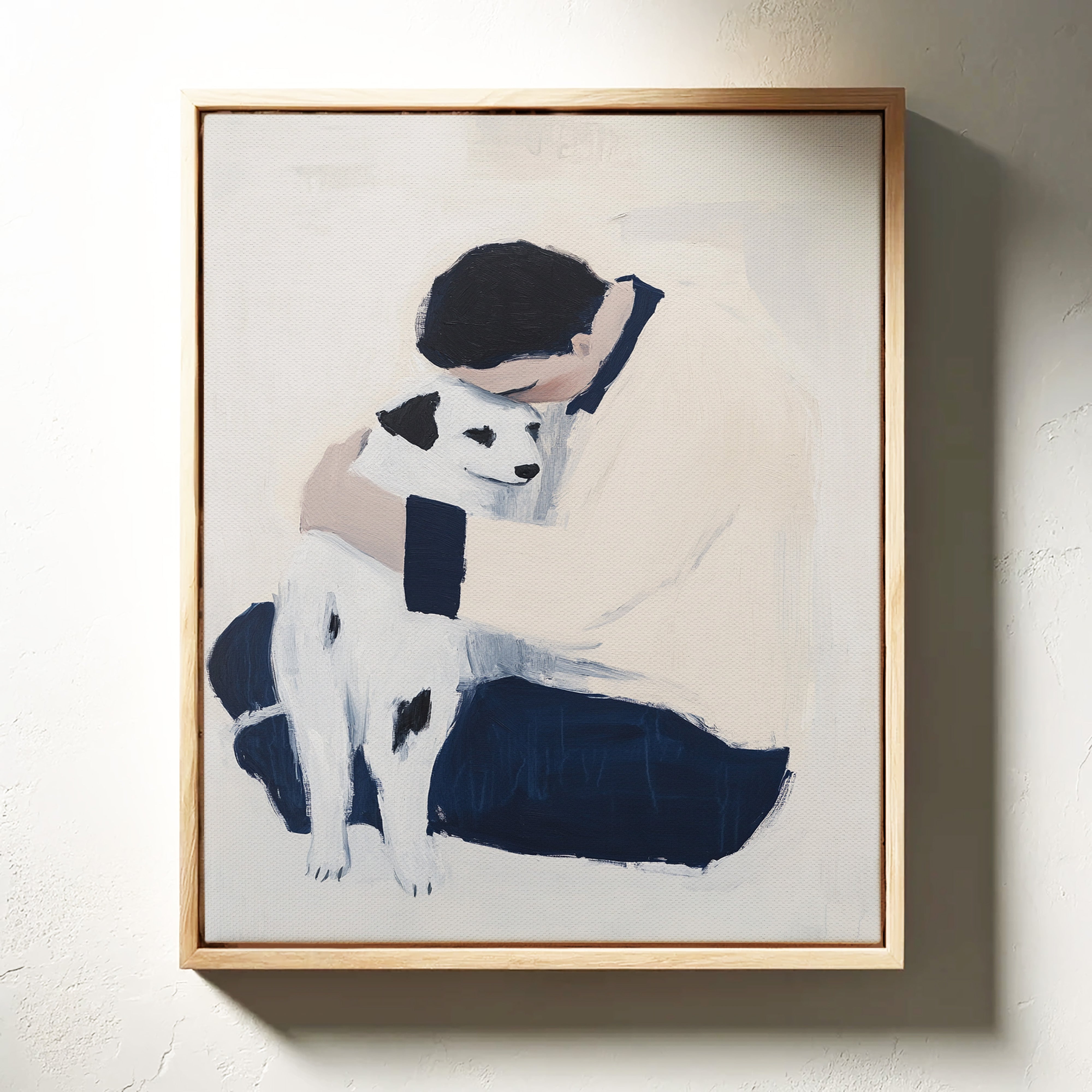 A tender scene unfolds in gentle brushstrokes of navy and cream, capturing an intimate moment between companions. The minimalist painting style emphasizes the emotional connection through simplified forms and careful attention to posture and touch. Bold contrasts between light and dark create a striking composition while maintaining a sense of softness and warmth. This contemporary piece would bring a touching presence to a reading nook, bedroom, or any quiet corner where moments of connection are cherished.