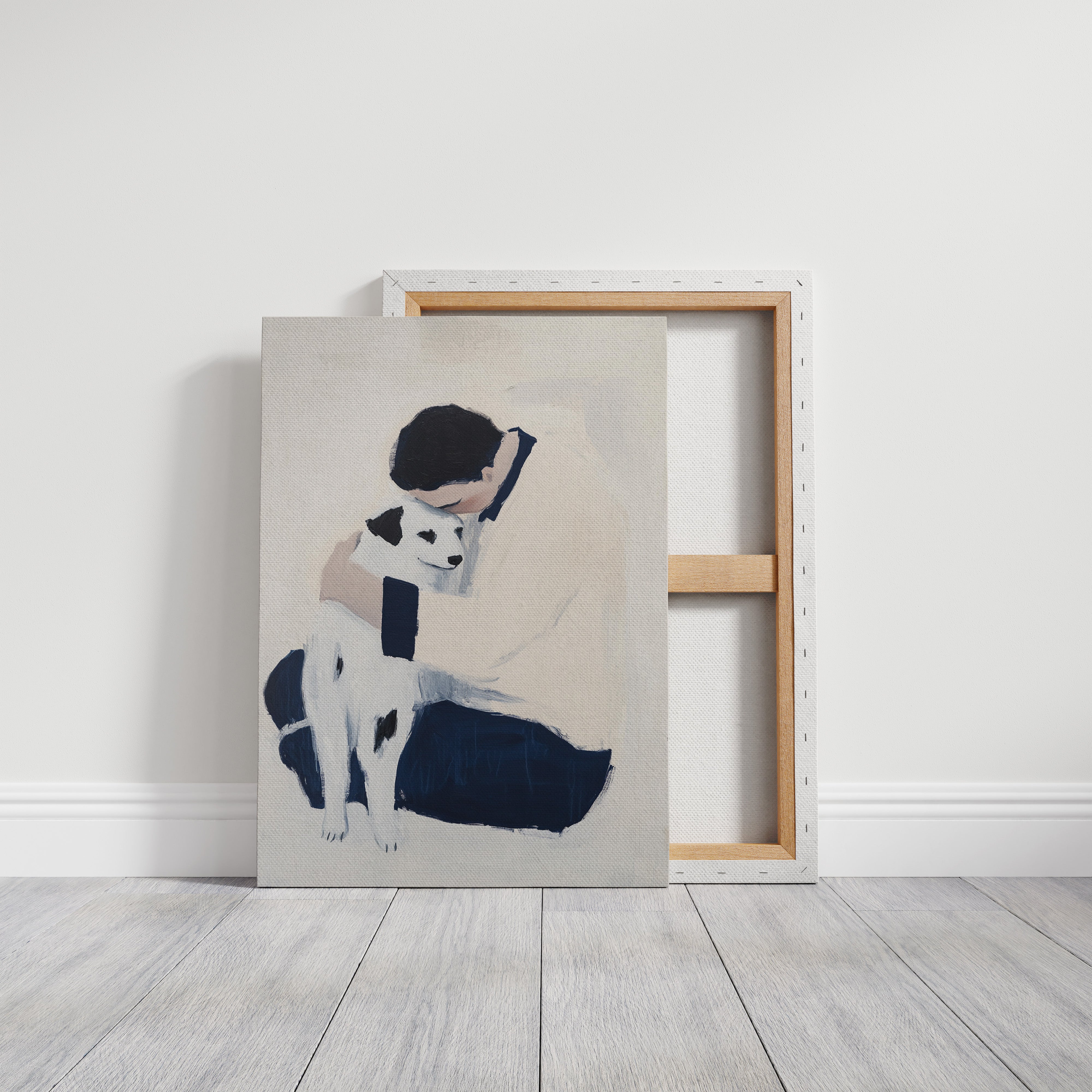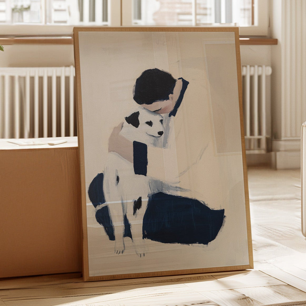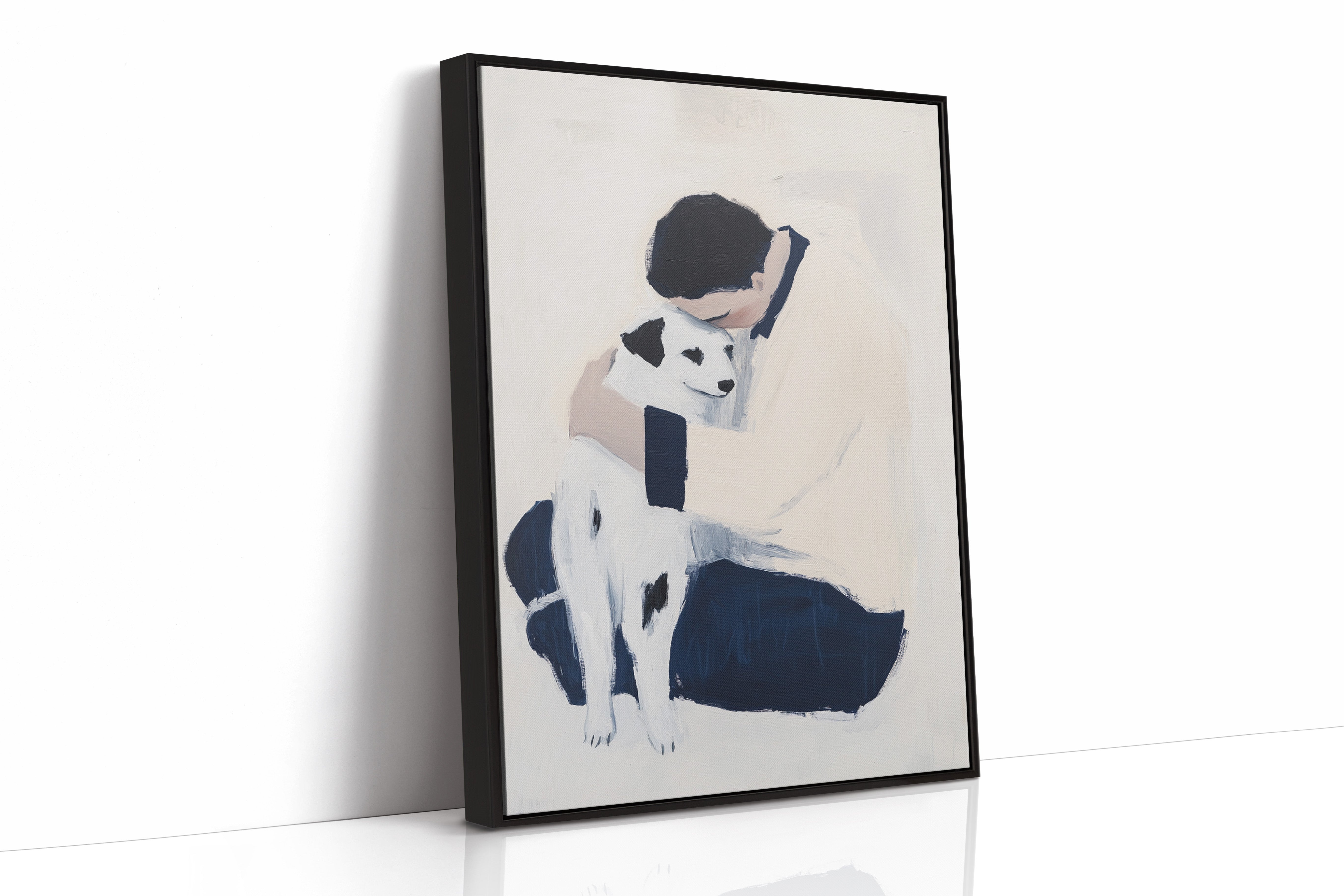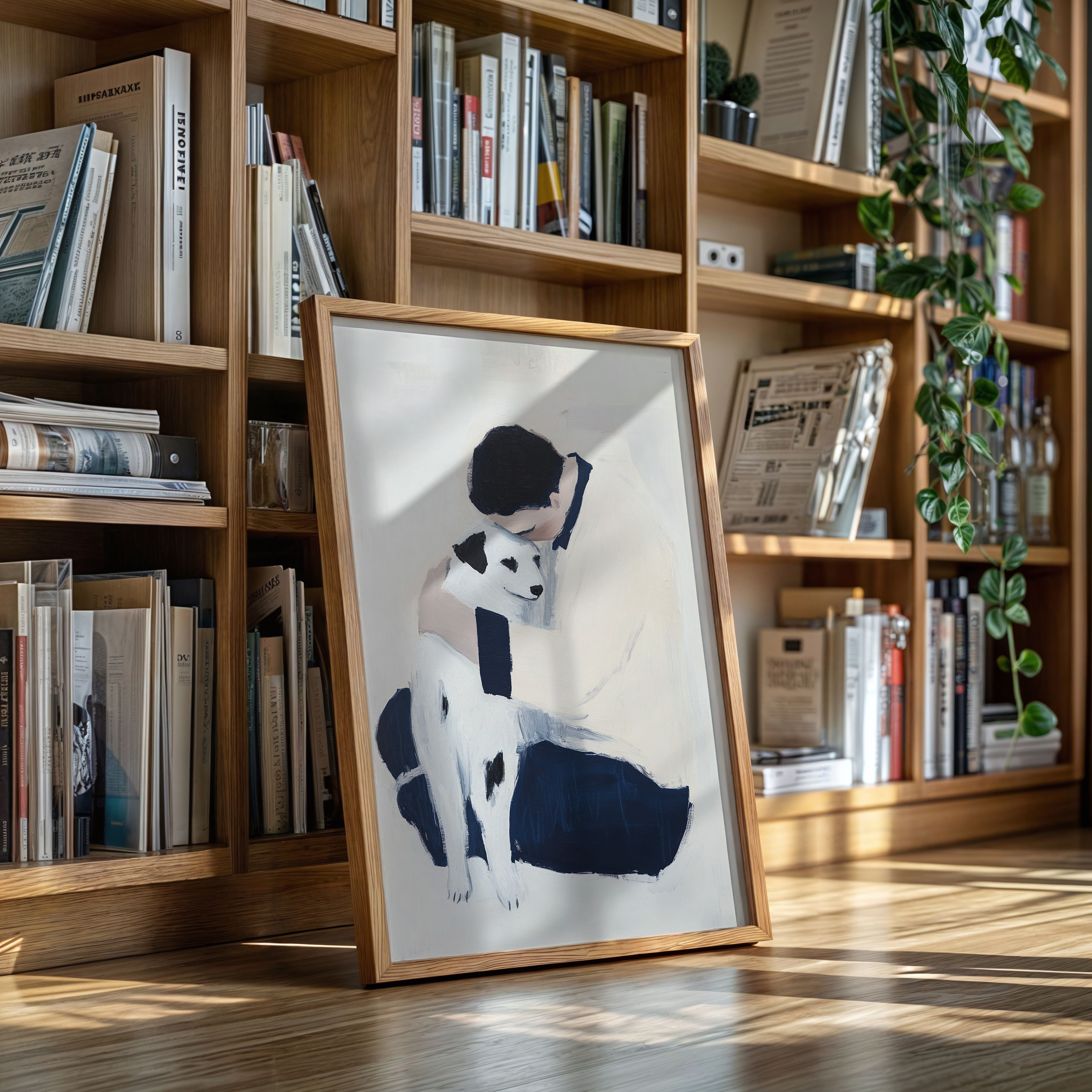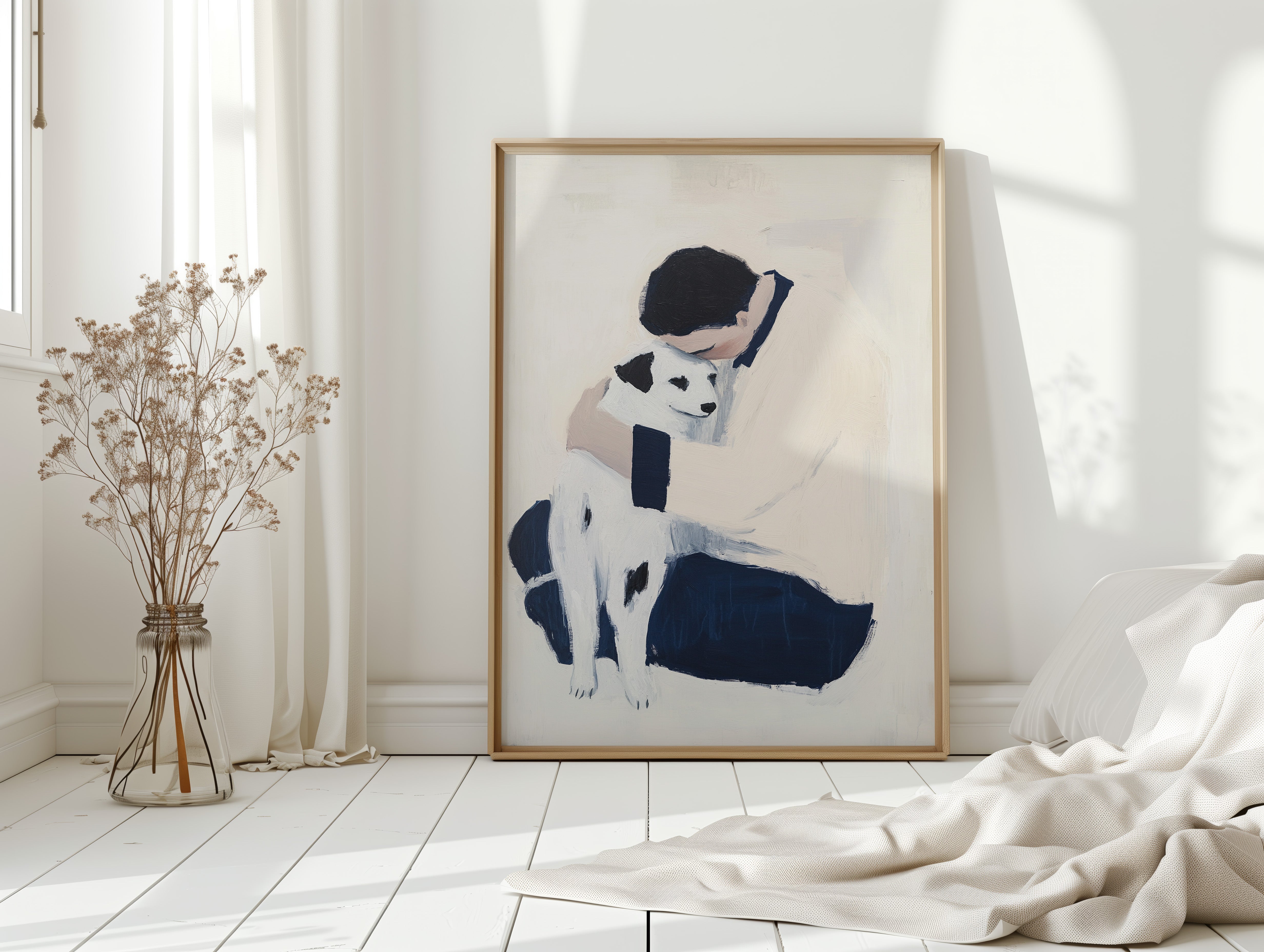 A tender scene unfolds in gentle brushstrokes of navy and cream, capturing an intimate moment between companions. The minimalist painting style emphasizes the emotional connection through simplified forms and careful attention to posture and touch. Bold contrasts between light and dark create a striking composition while maintaining a sense of softness and warmth. This contemporary piece would bring a touching presence to a reading nook, bedroom, or any quiet corner where moments of connection are cherished.