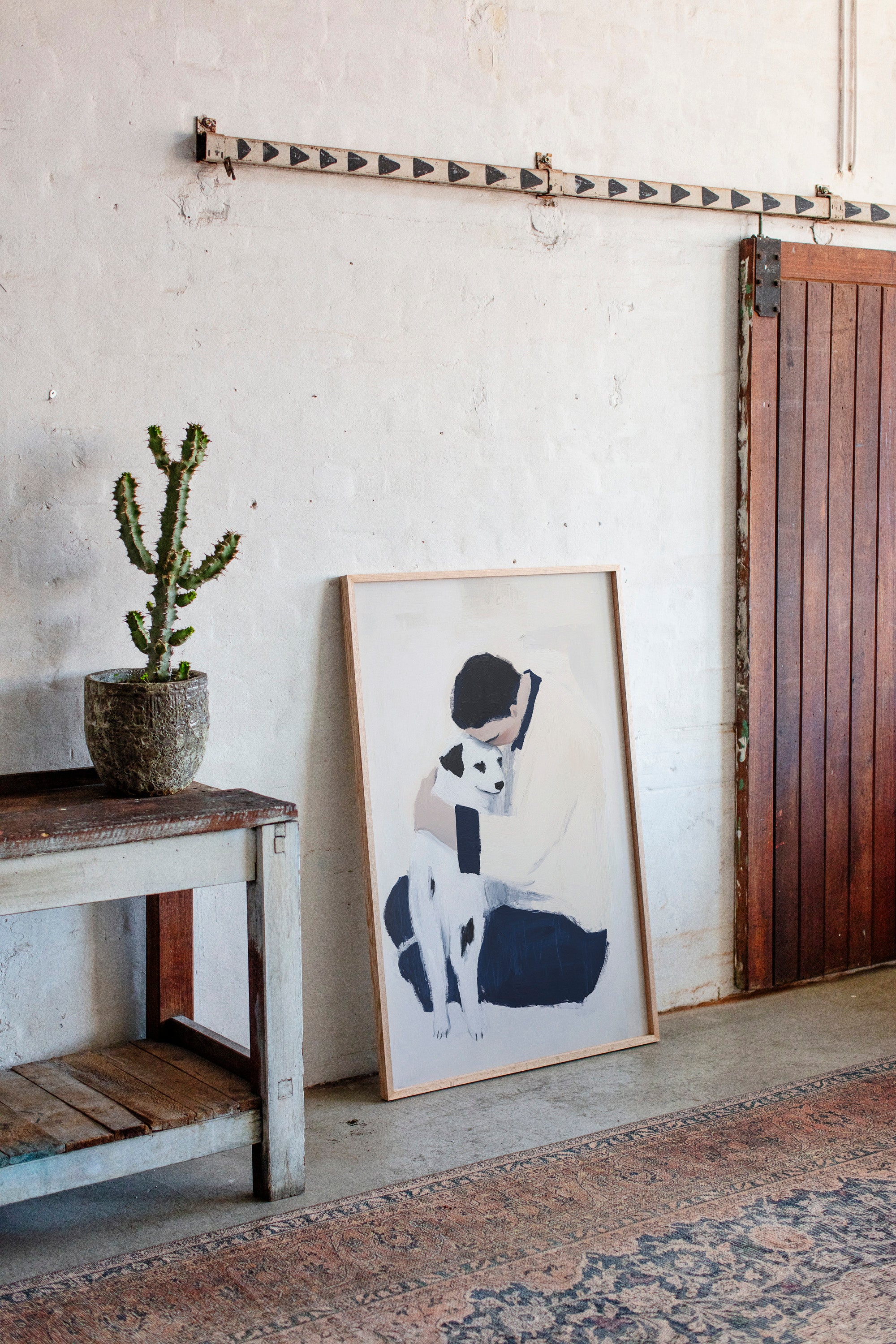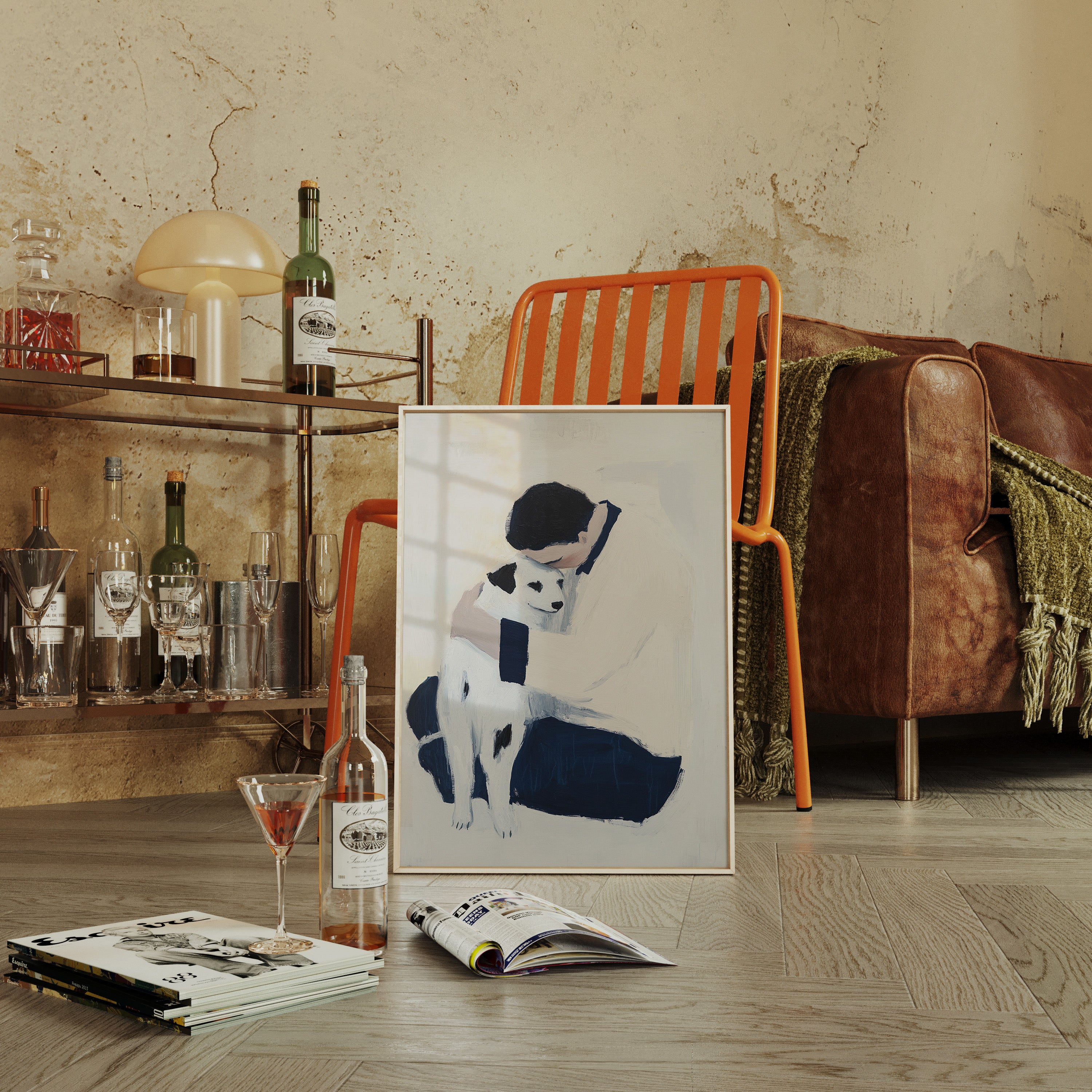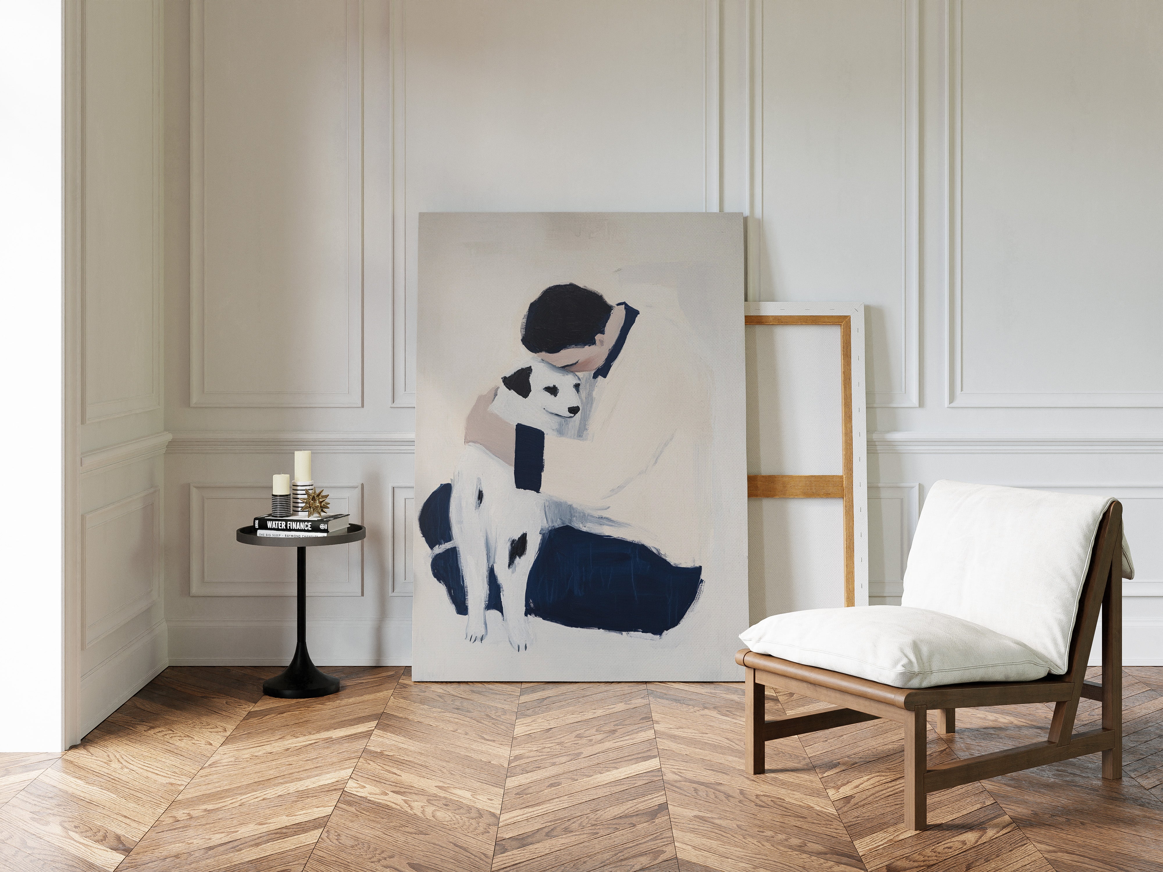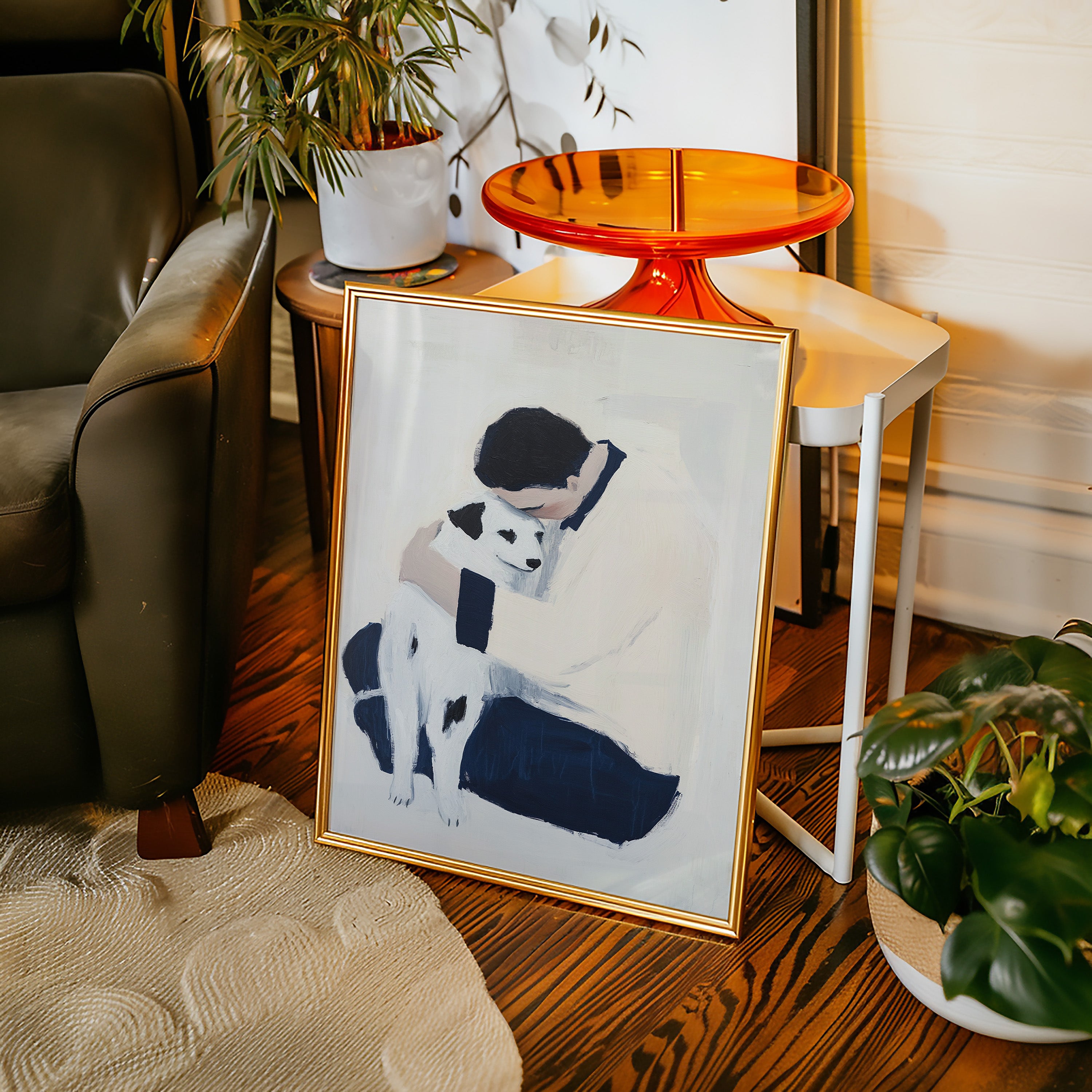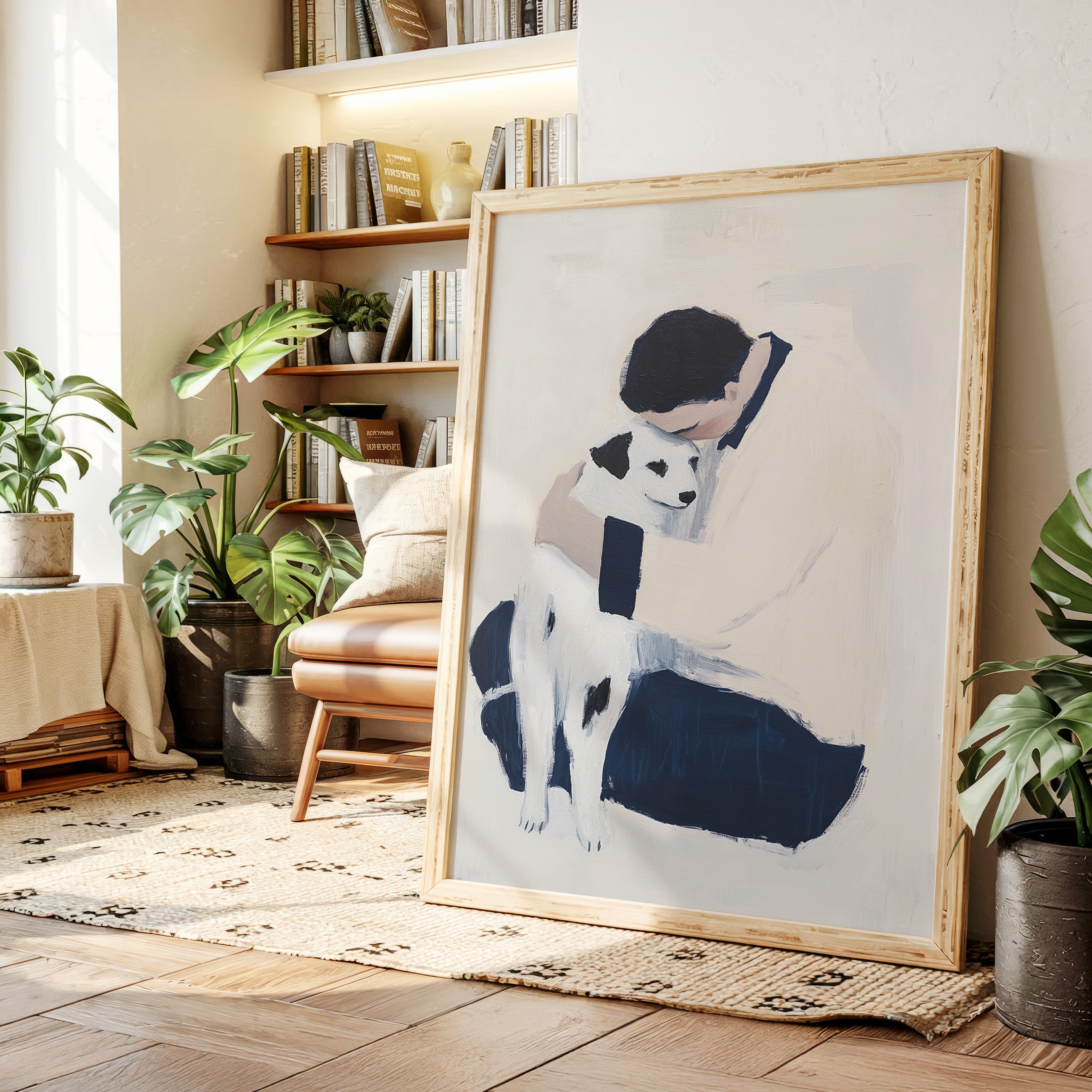 A tender scene unfolds in gentle brushstrokes of navy and cream, capturing an intimate moment between companions. The minimalist painting style emphasizes the emotional connection through simplified forms and careful attention to posture and touch. Bold contrasts between light and dark create a striking composition while maintaining a sense of softness and warmth. This contemporary piece would bring a touching presence to a reading nook, bedroom, or any quiet corner where moments of connection are cherished.