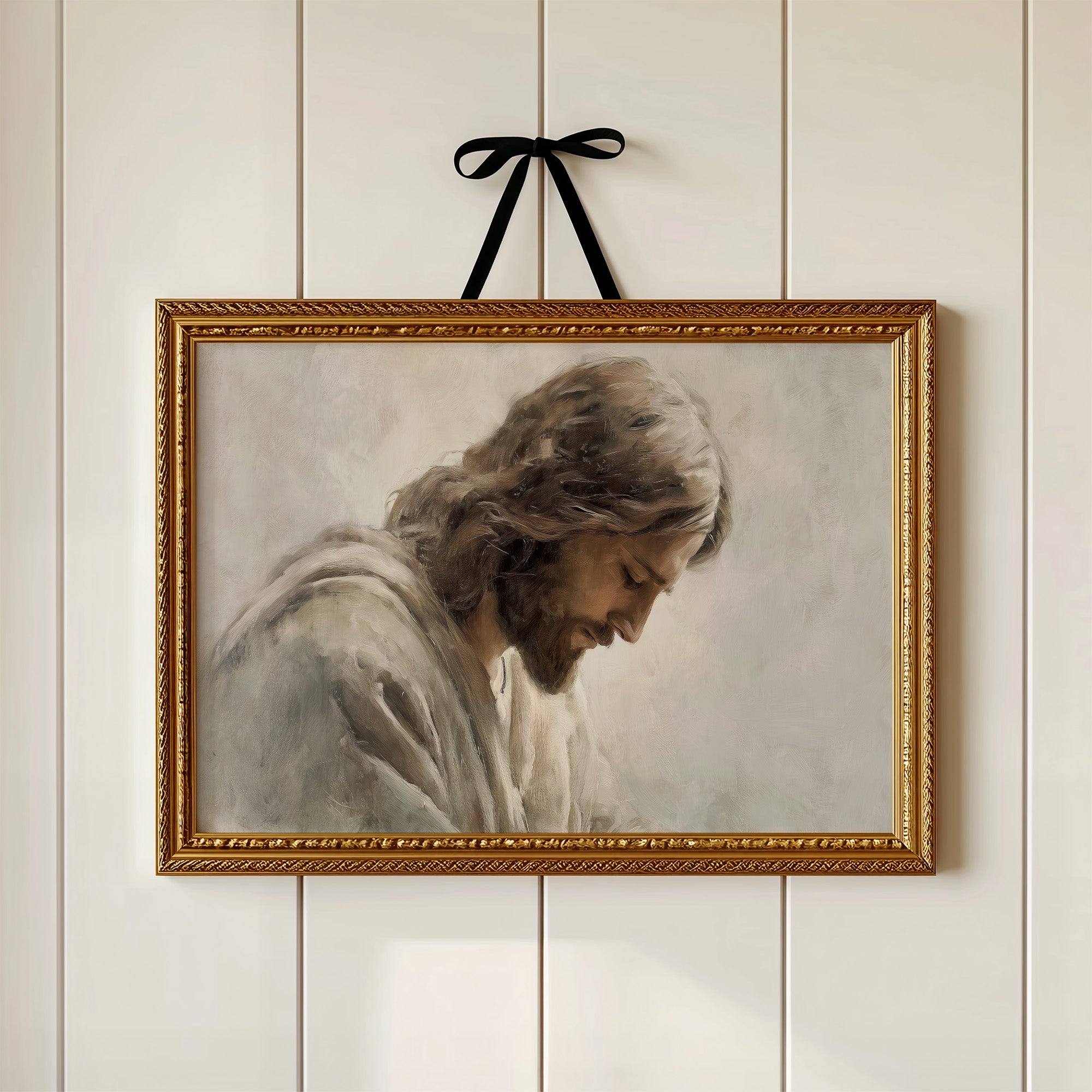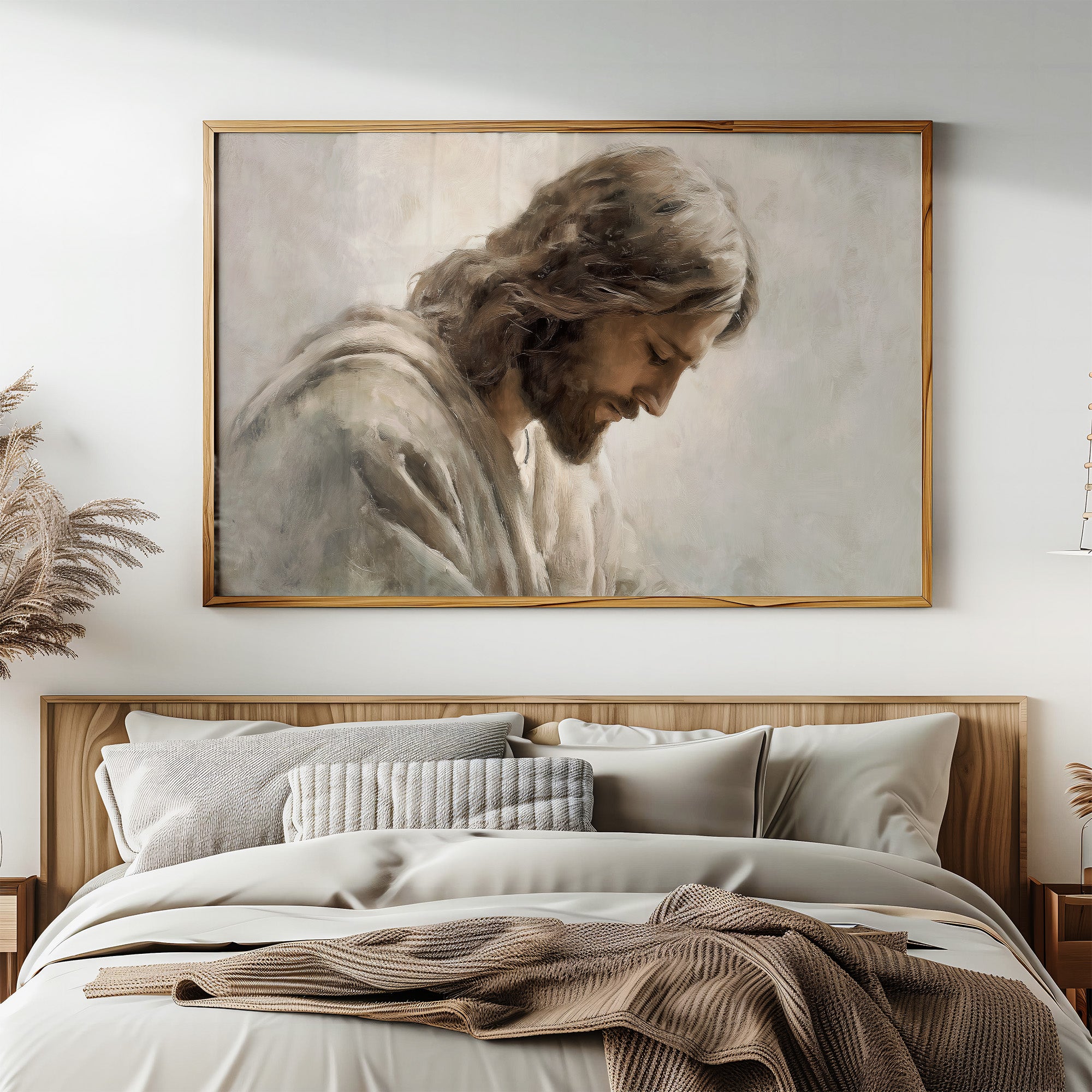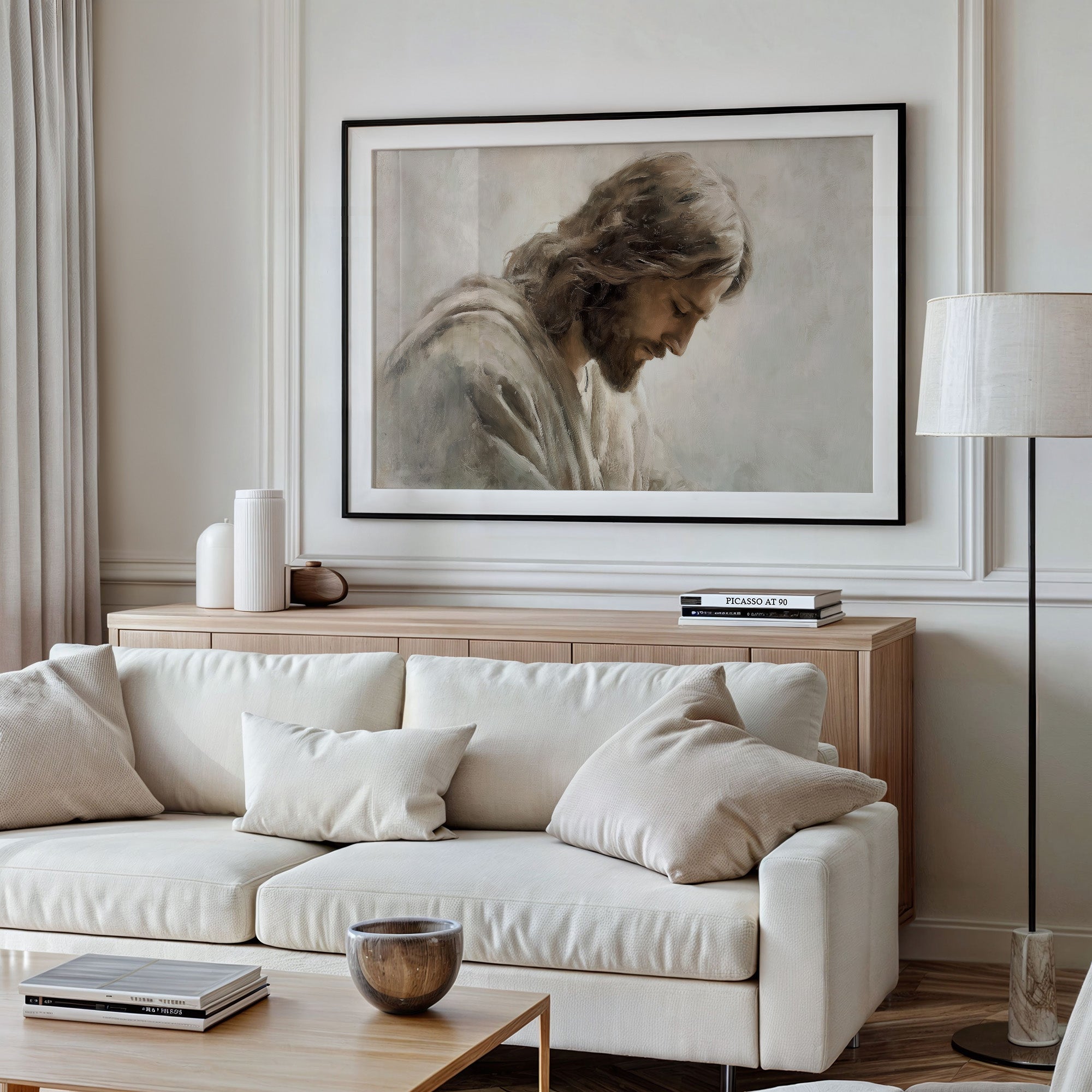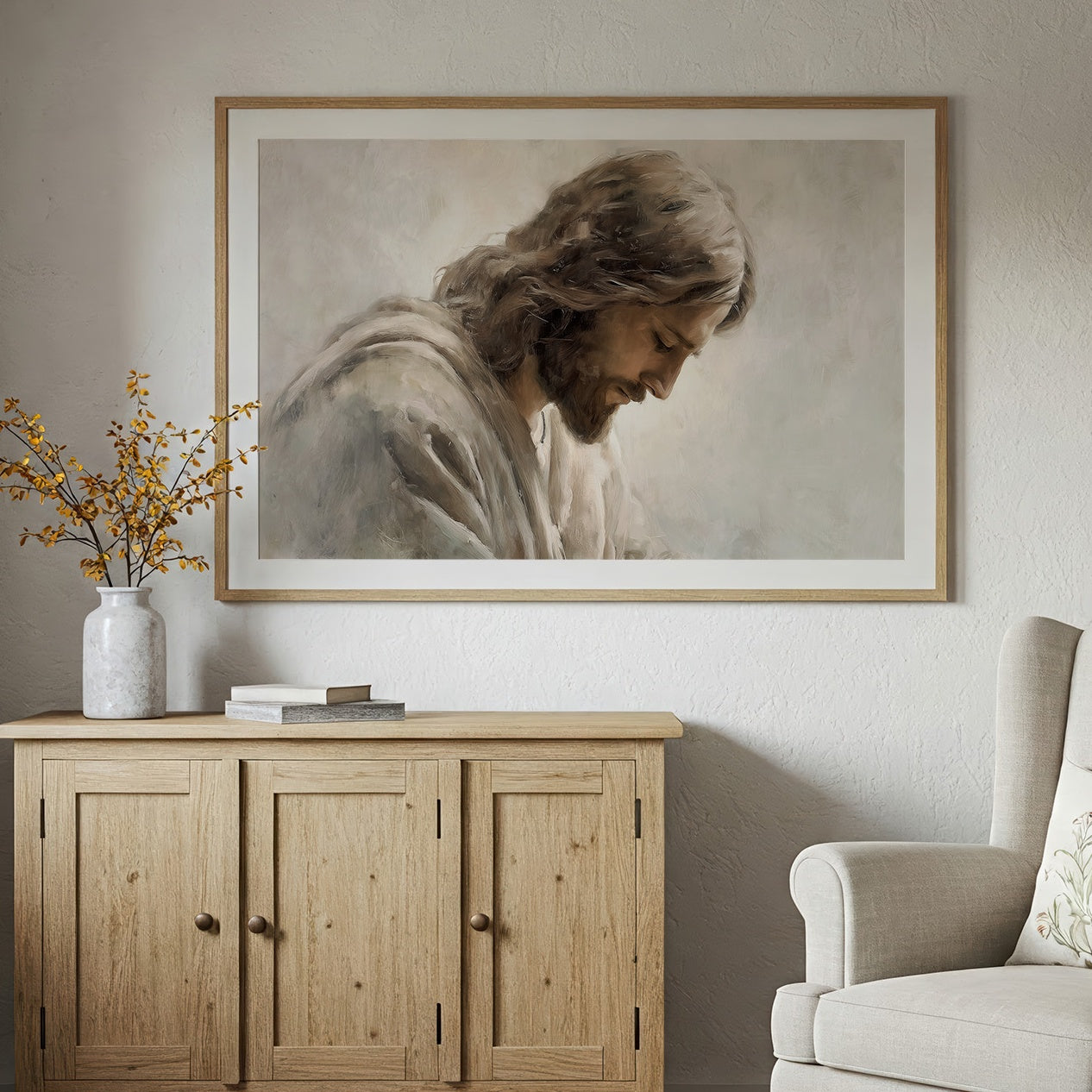 Soft morning light bathes the contemplative portrait, creating a sanctuary of calm amid the bustle of everyday life. The muted gray and ivory tones of the artwork blend harmoniously with the warm wooden shelves and delicate pampas grass nearby. This thoughtful scene marries spiritual depth with intellectual pursuit, as books stand sentinel around the centerpiece.