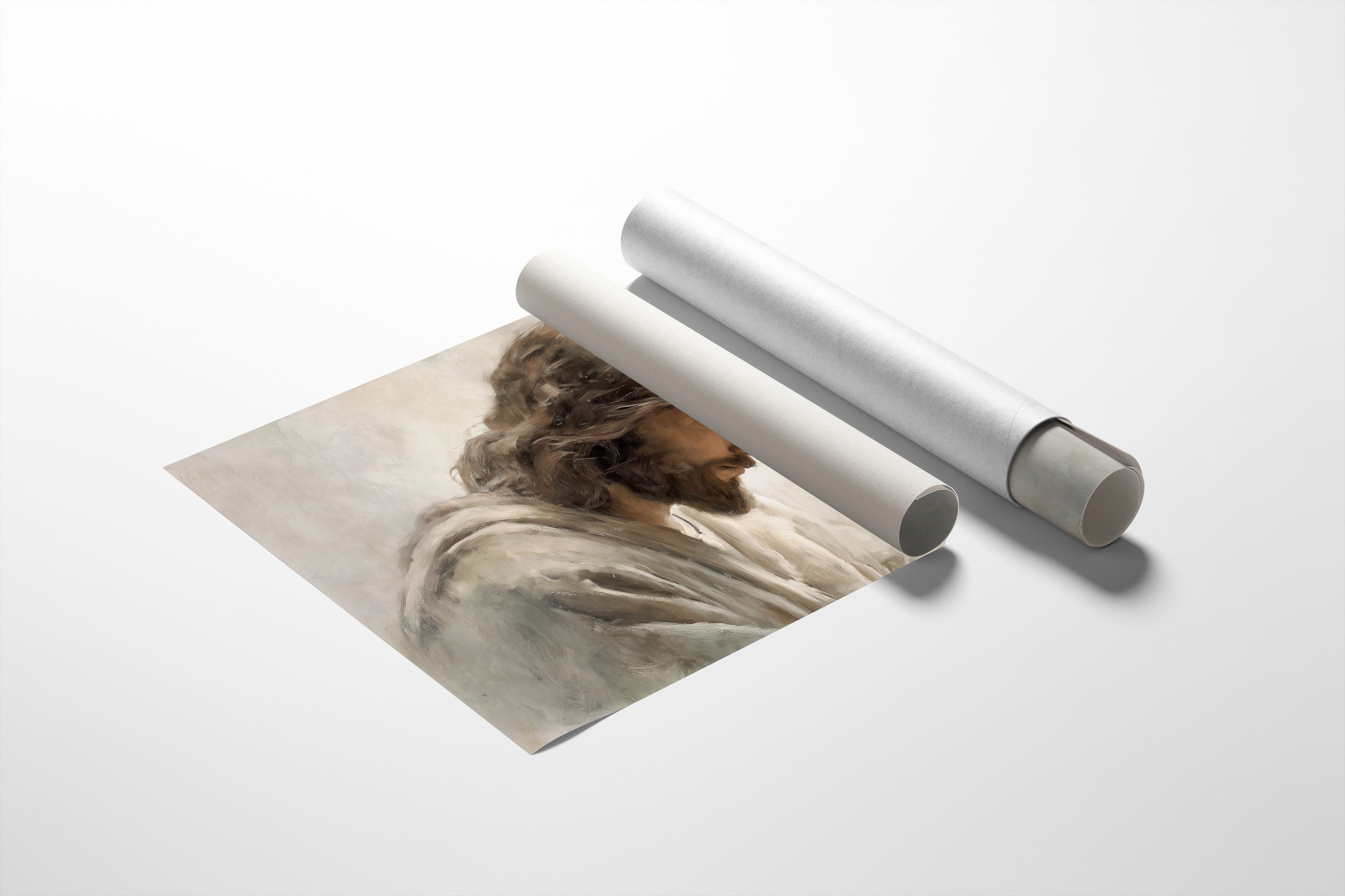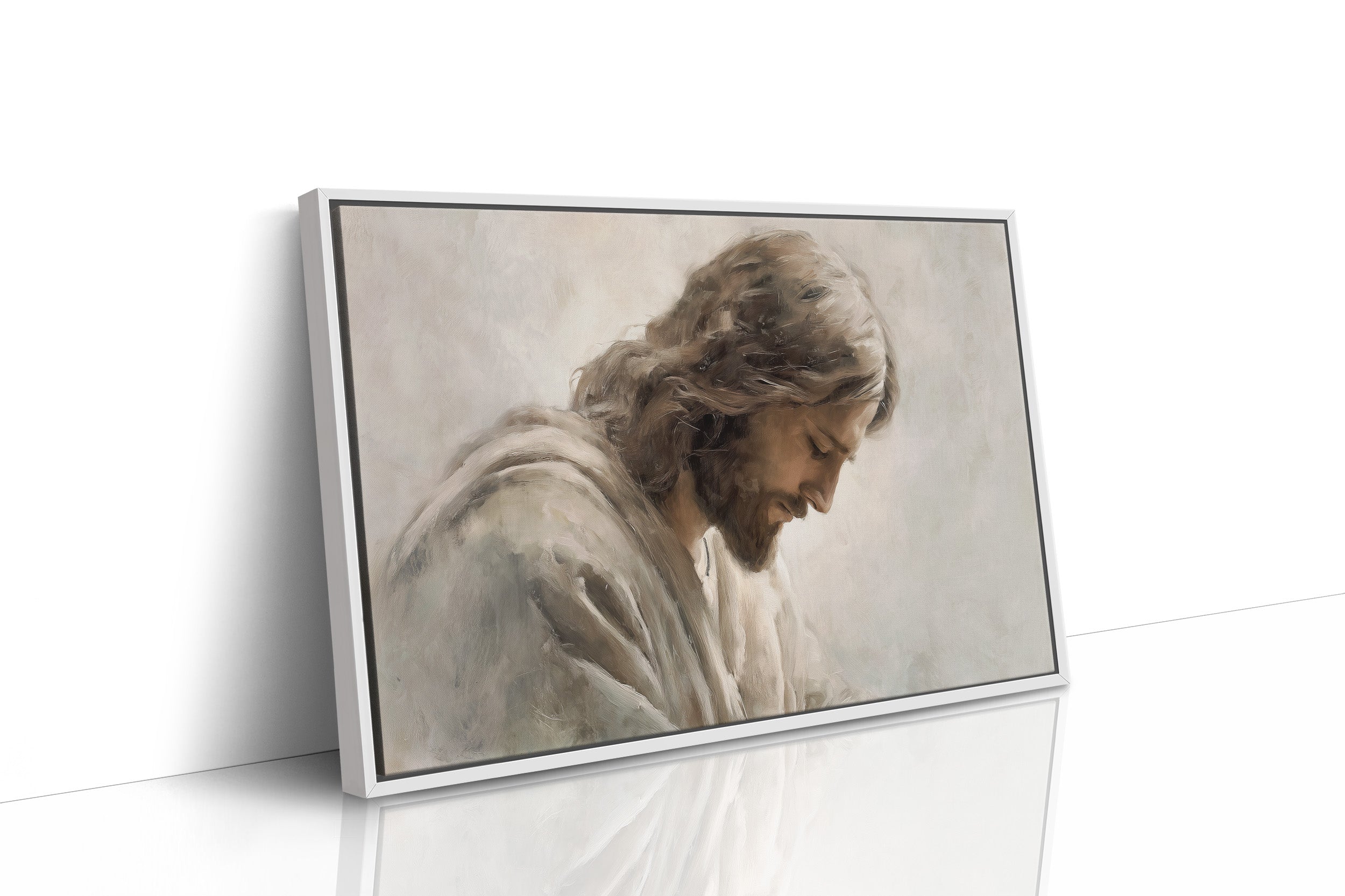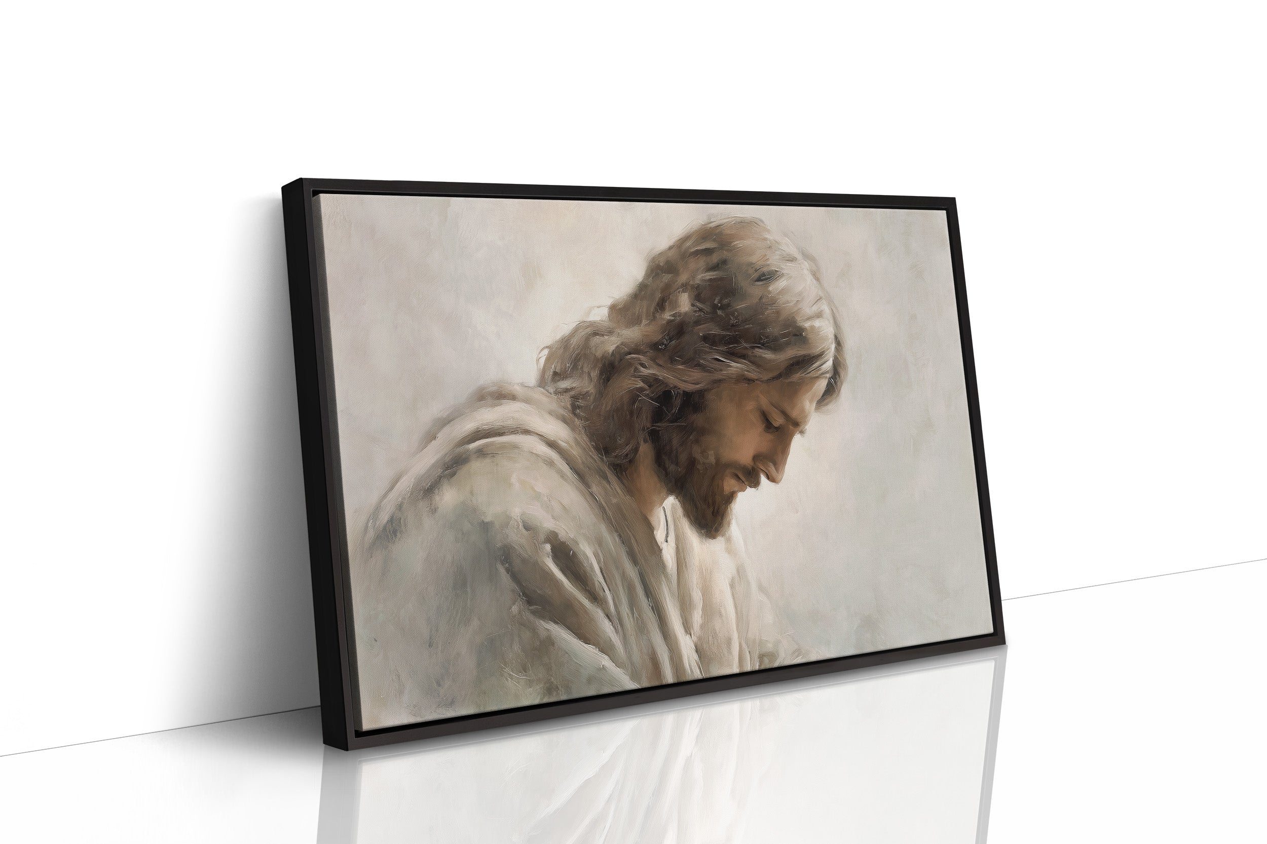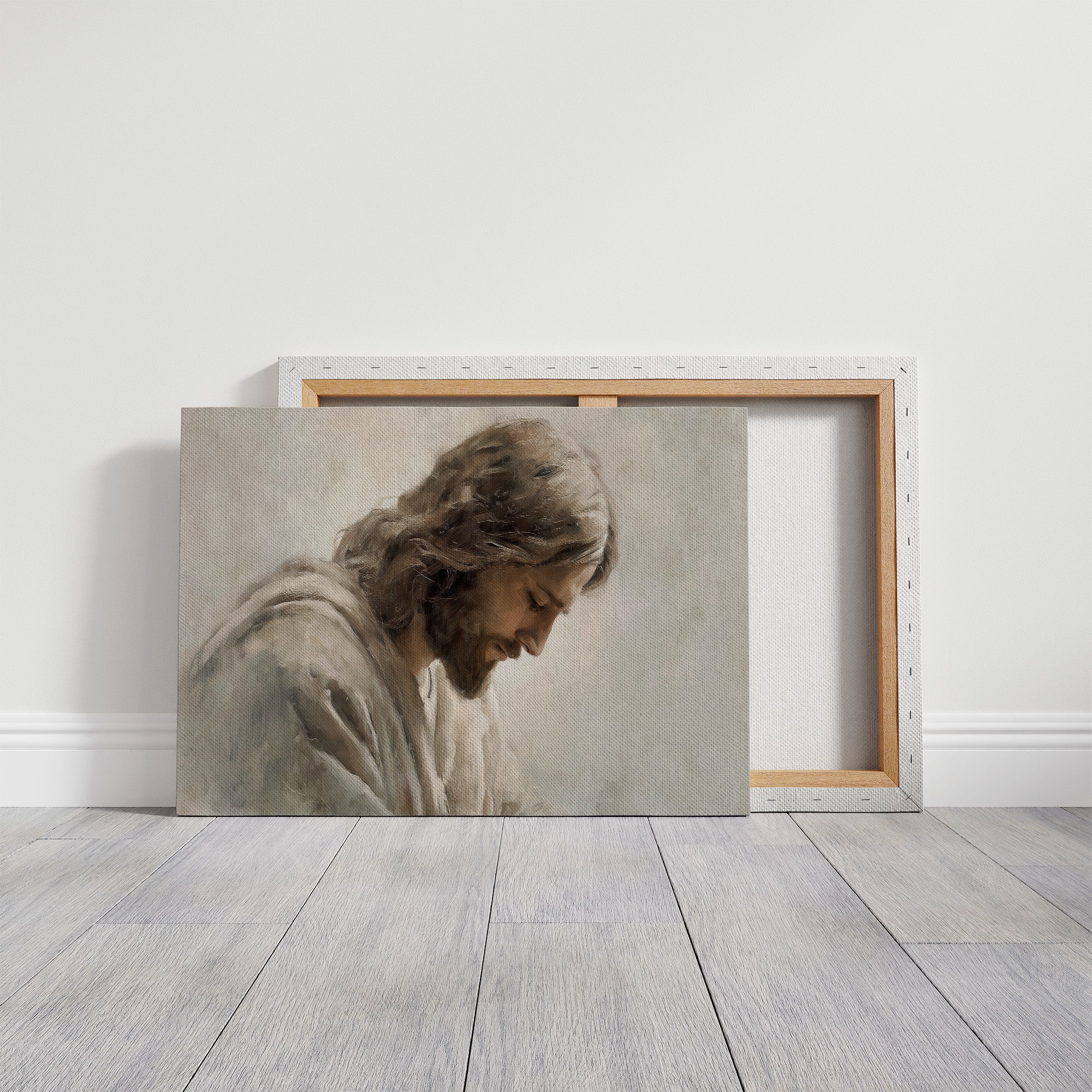 Soft morning light bathes the contemplative portrait, creating a sanctuary of calm amid the bustle of everyday life. The muted gray and ivory tones of the artwork blend harmoniously with the warm wooden shelves and delicate pampas grass nearby. This thoughtful scene marries spiritual depth with intellectual pursuit, as books stand sentinel around the centerpiece.