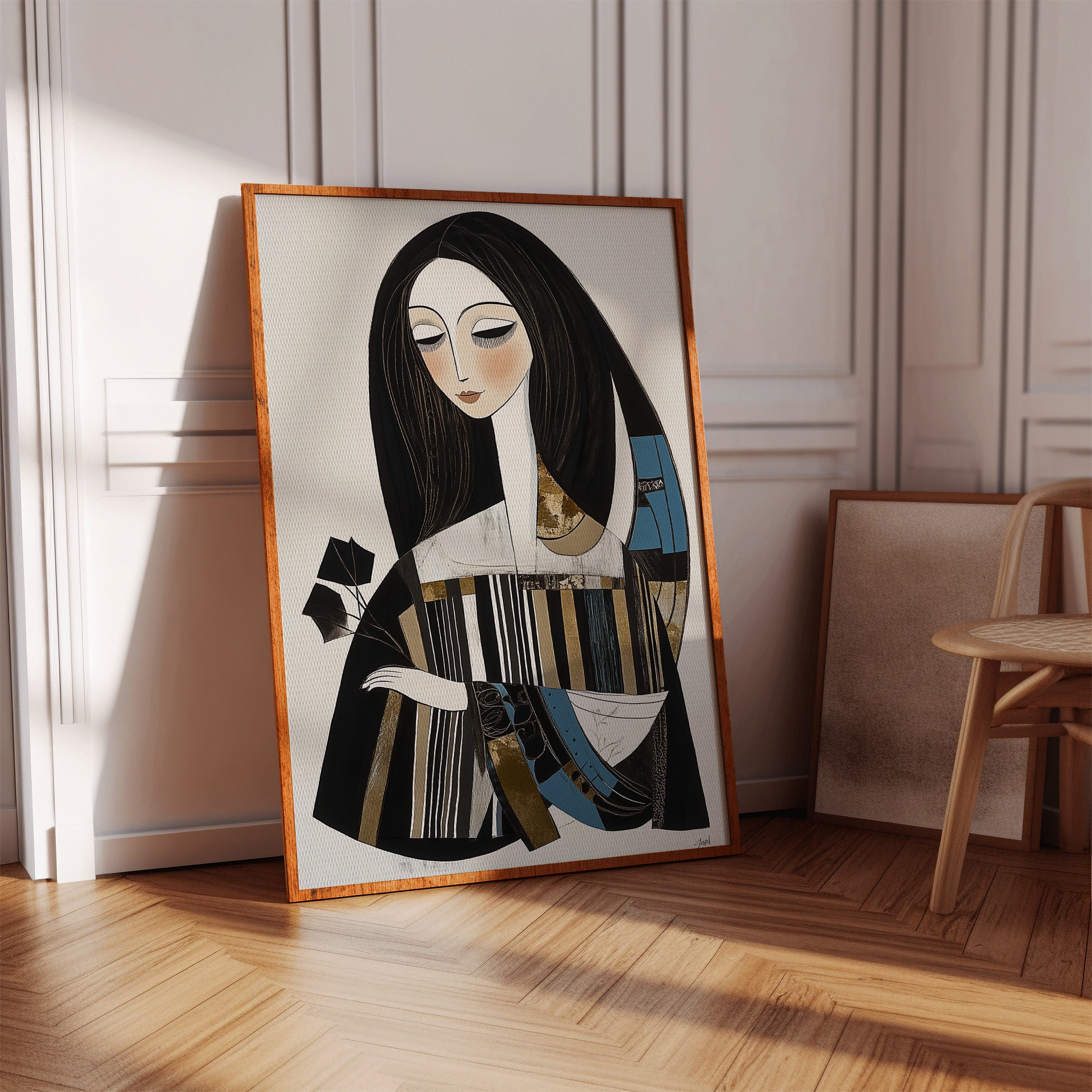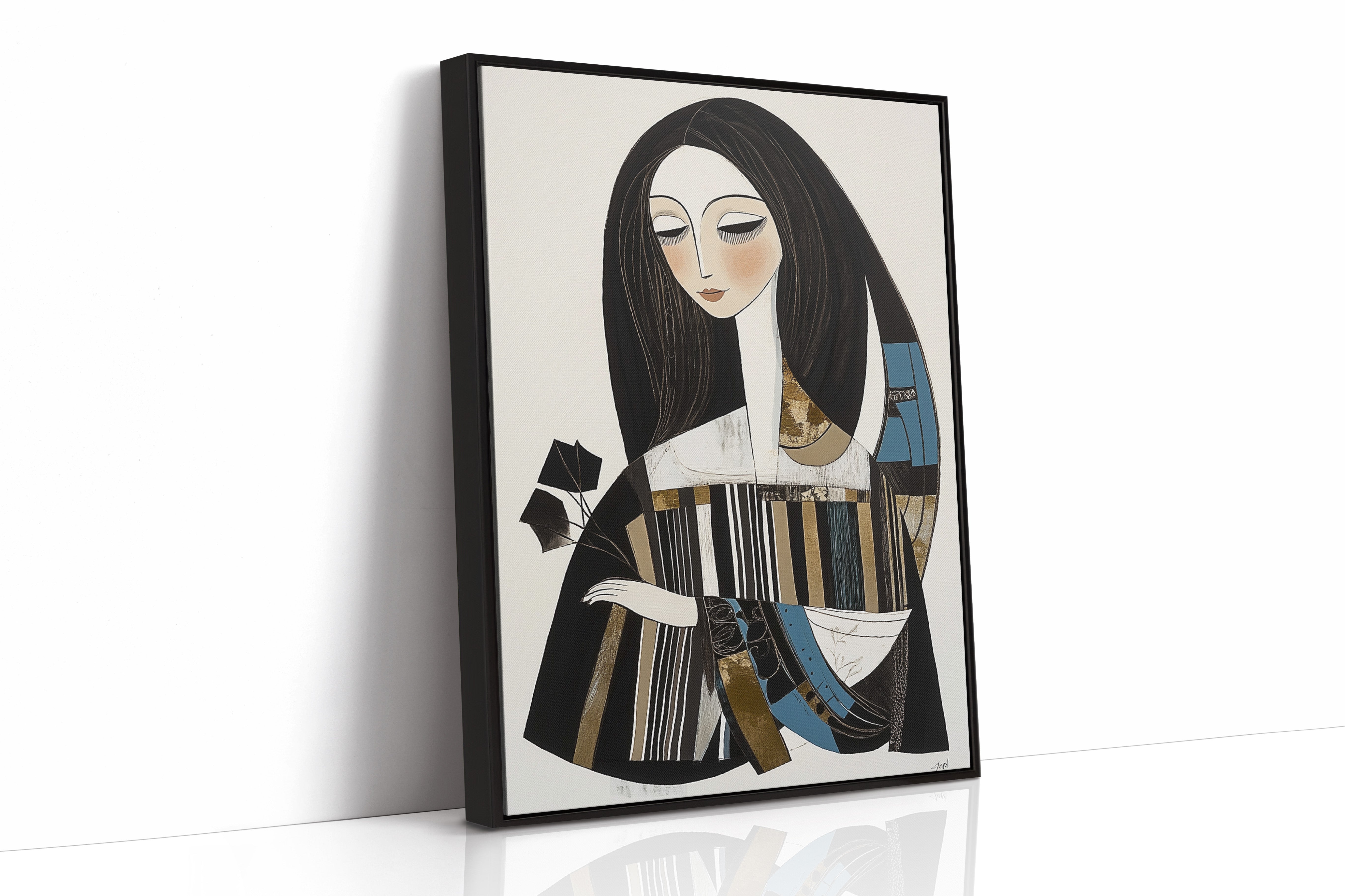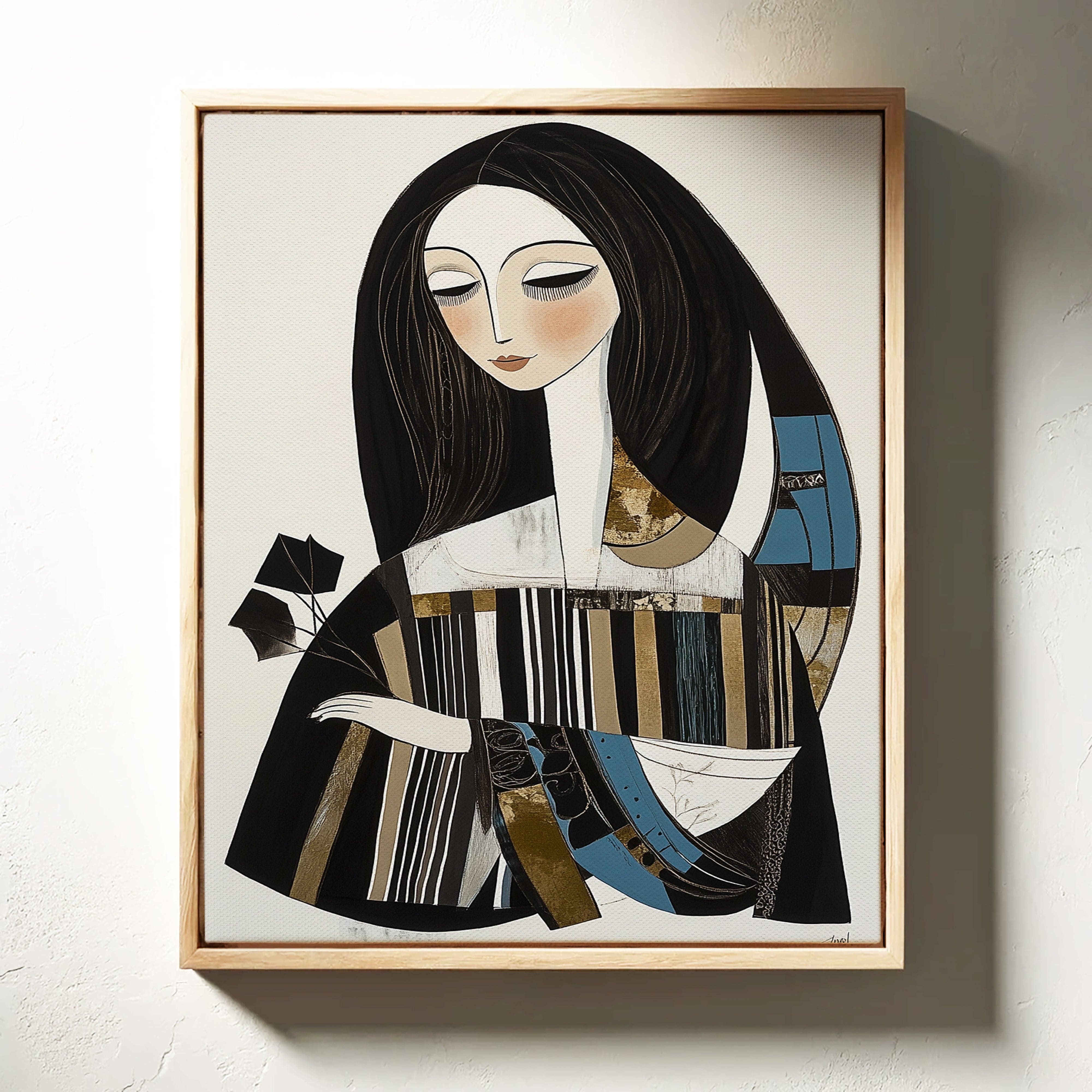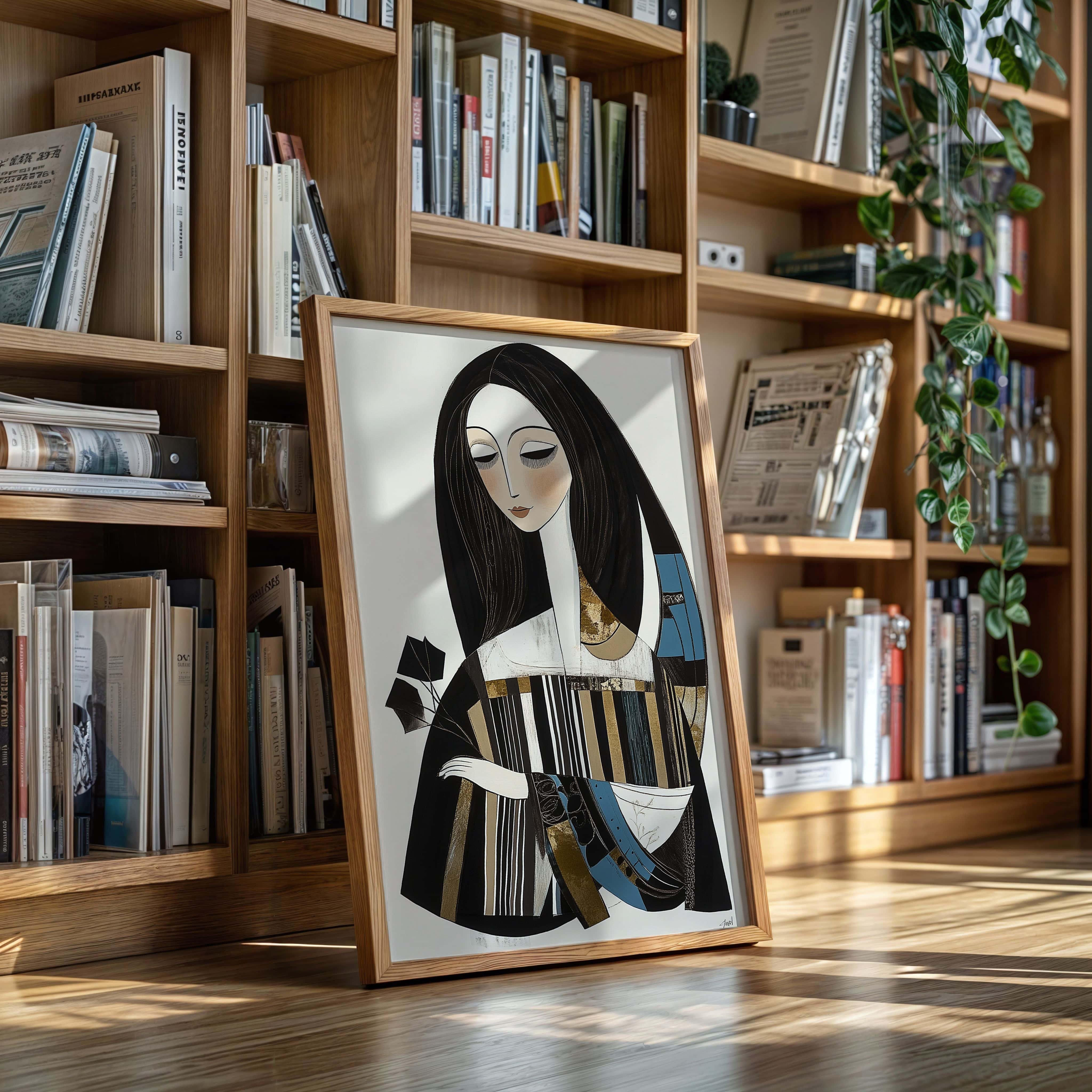 In the gentle pause between pages turning, a figure finds solace in literary contemplation. The artistic style merges modern minimalism with Art Deco influences, creating a sophisticated portrait in a palette of black, white, and touches of teal and gold. The elongated lines and geometric patterns play against the soft curves of the figure, while the composition suggests both movement and stillness in its careful balance of elements. This piece would bring an air of artistic sophistication to a reading nook, home library, or creative workspace where its contemplative energy can inspire quiet moments of reflection.