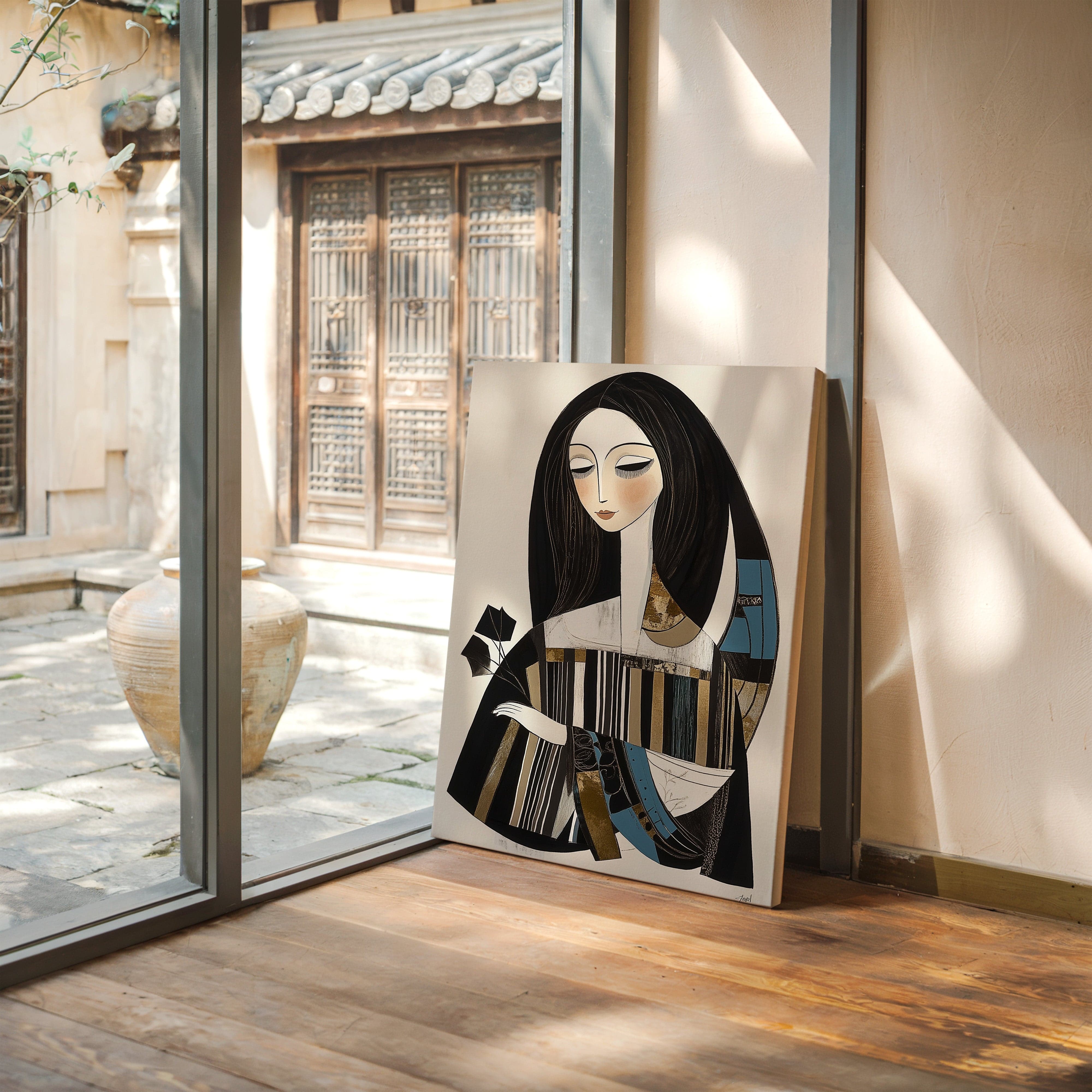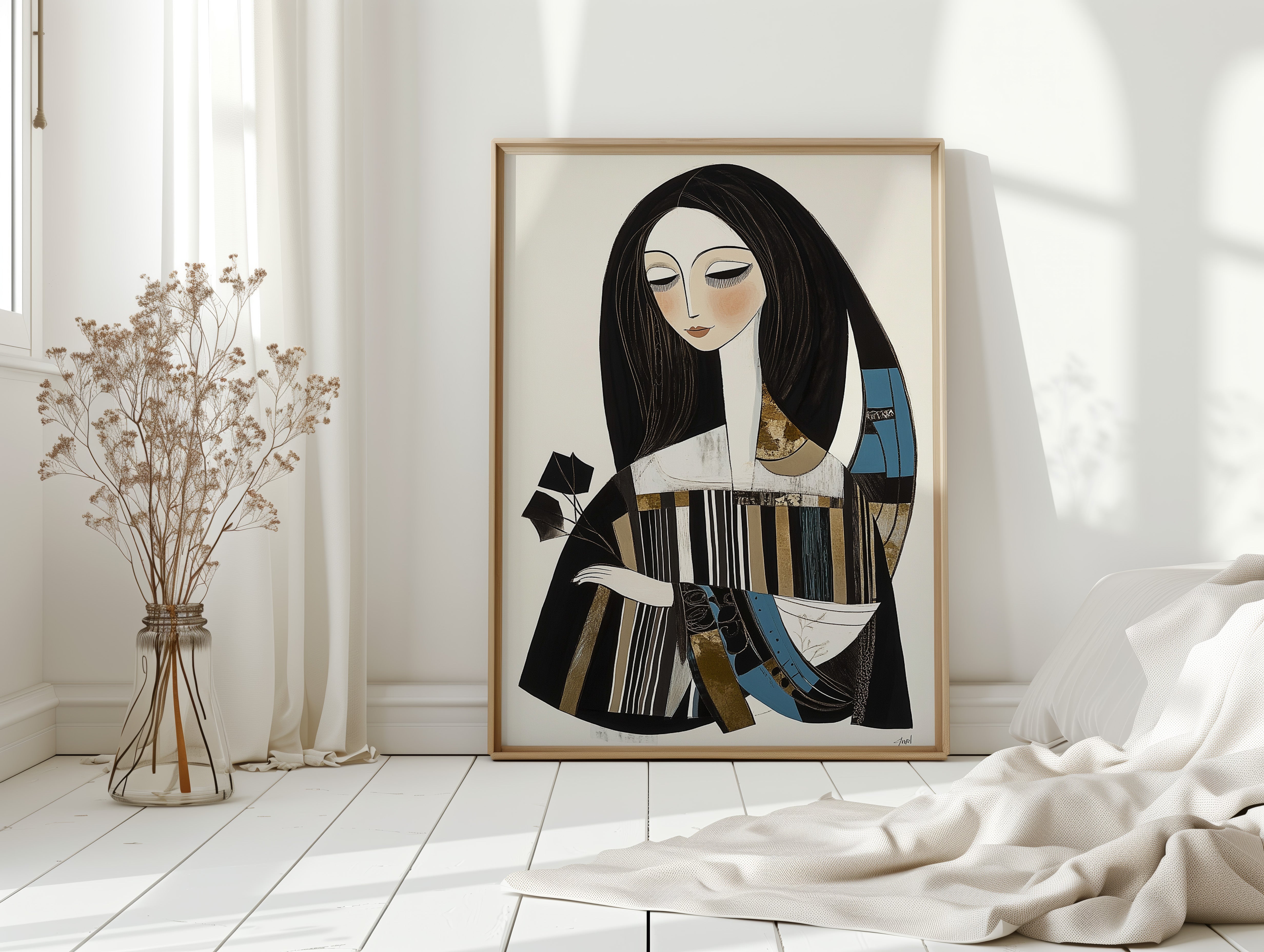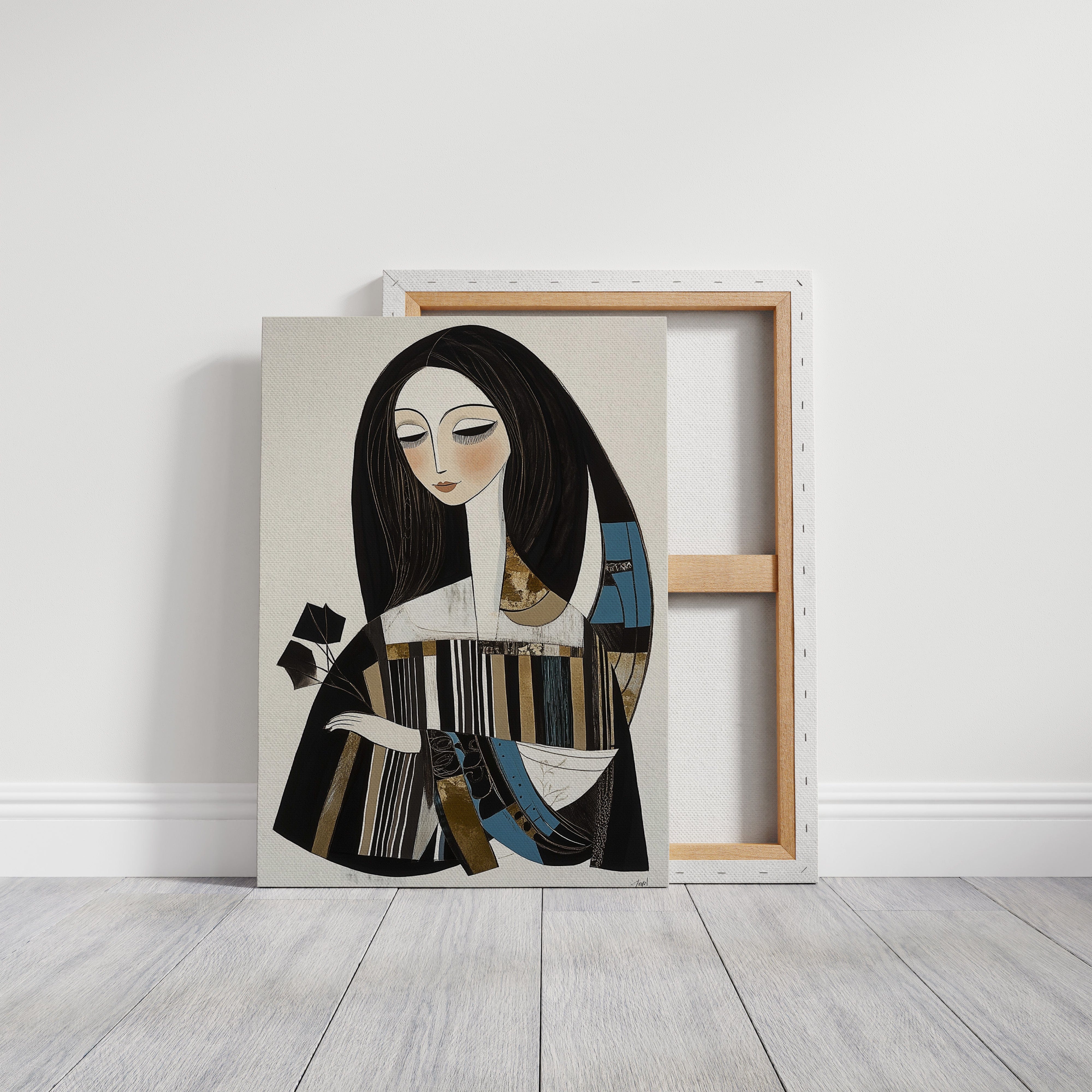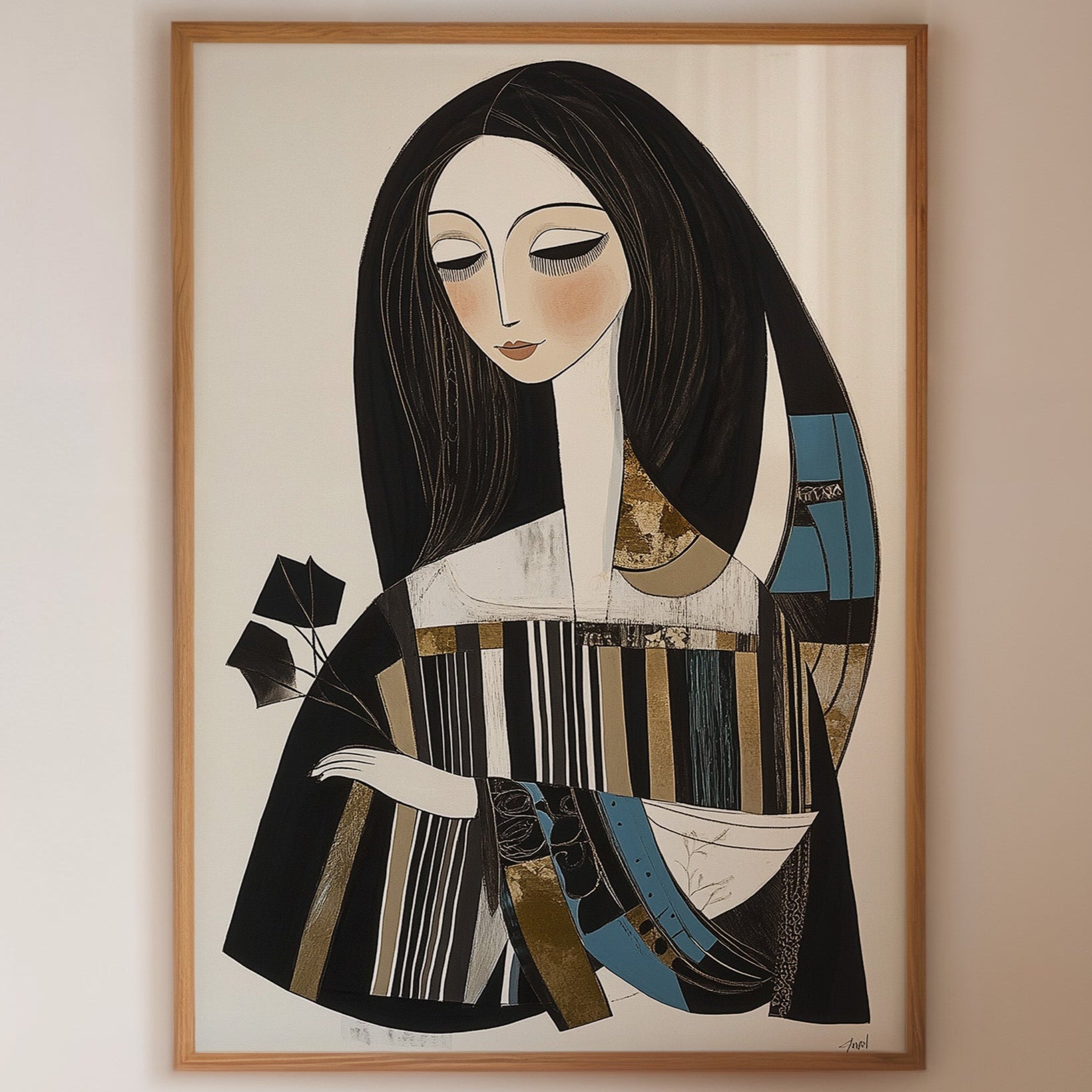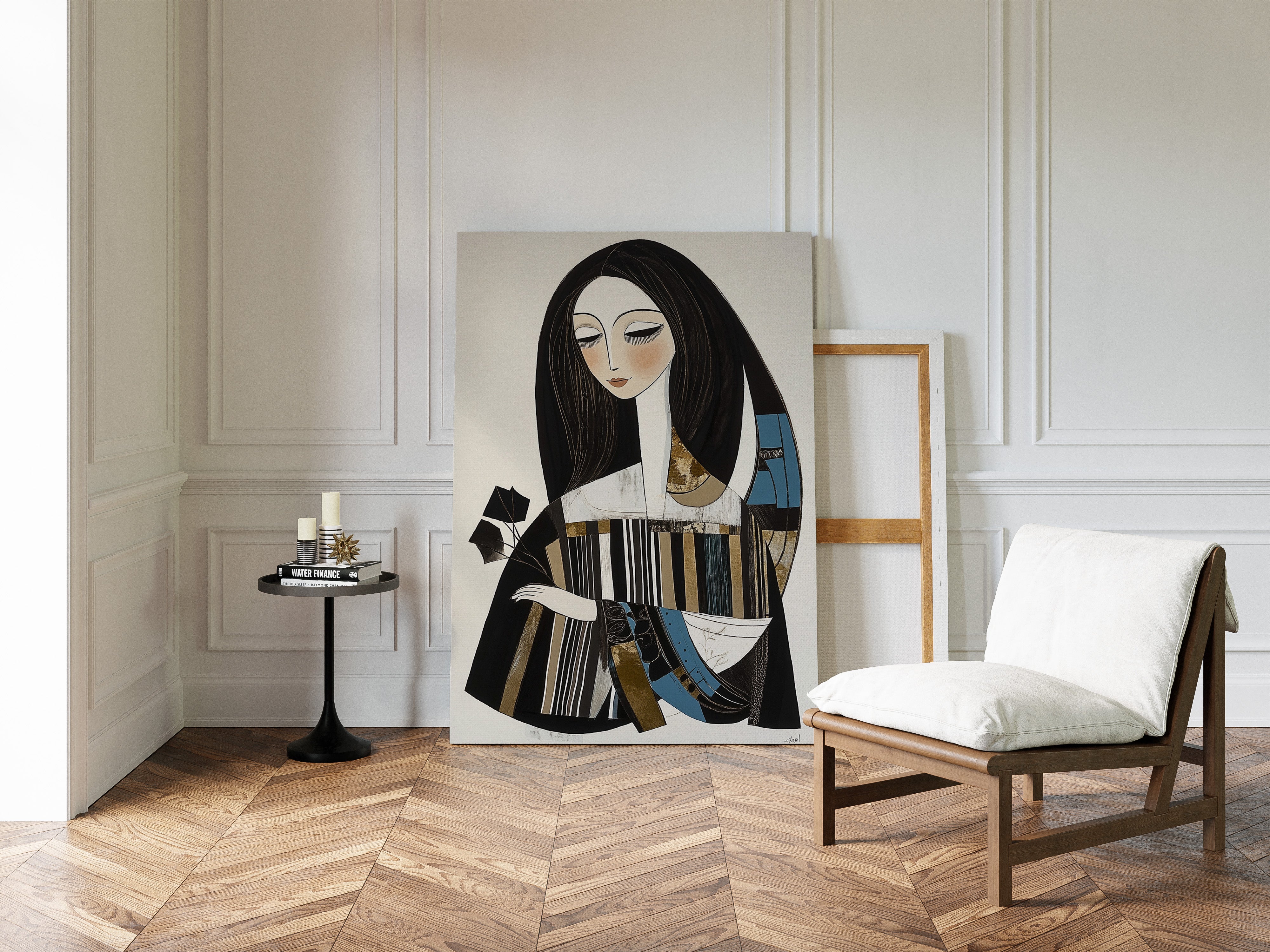 In the gentle pause between pages turning, a figure finds solace in literary contemplation. The artistic style merges modern minimalism with Art Deco influences, creating a sophisticated portrait in a palette of black, white, and touches of teal and gold. The elongated lines and geometric patterns play against the soft curves of the figure, while the composition suggests both movement and stillness in its careful balance of elements. This piece would bring an air of artistic sophistication to a reading nook, home library, or creative workspace where its contemplative energy can inspire quiet moments of reflection.