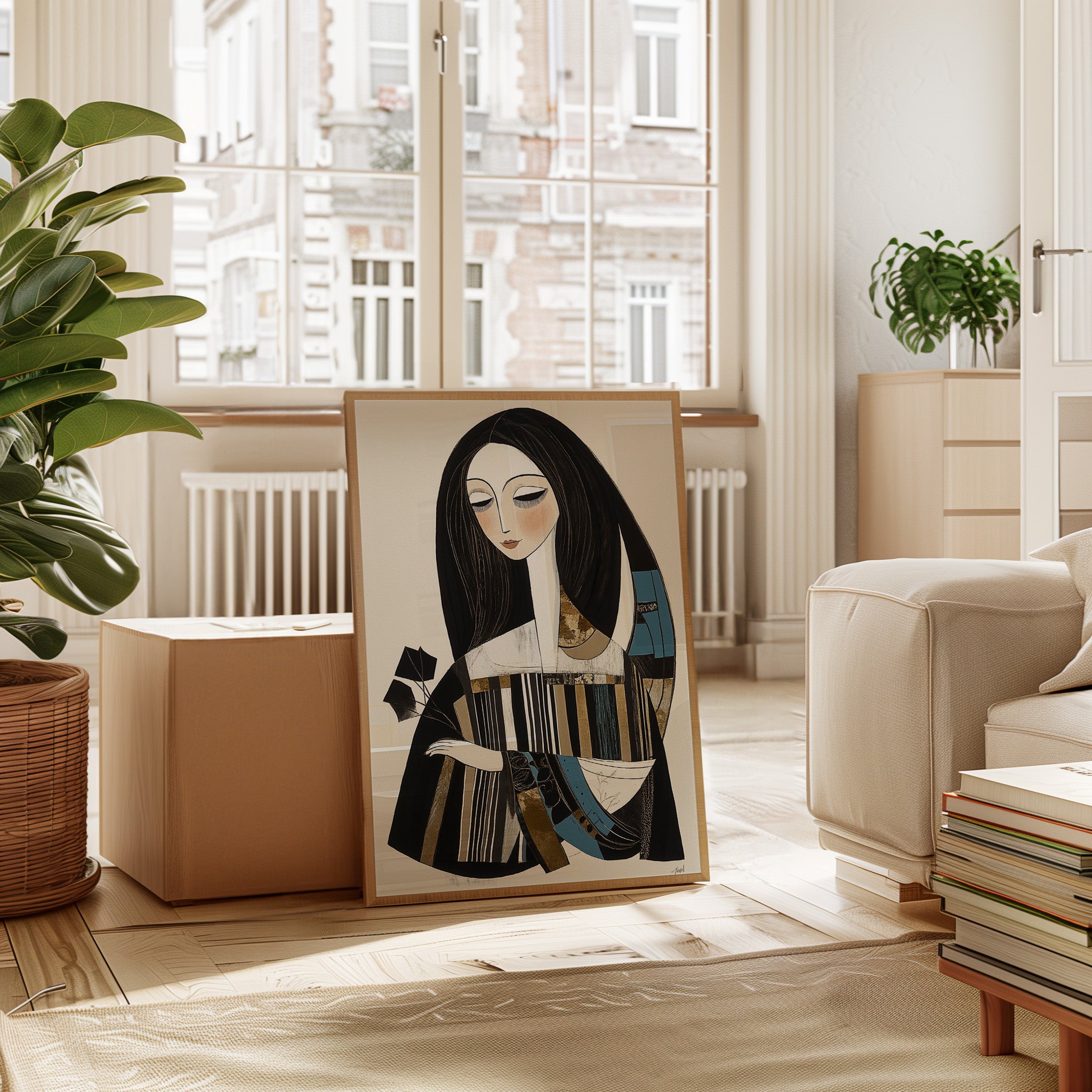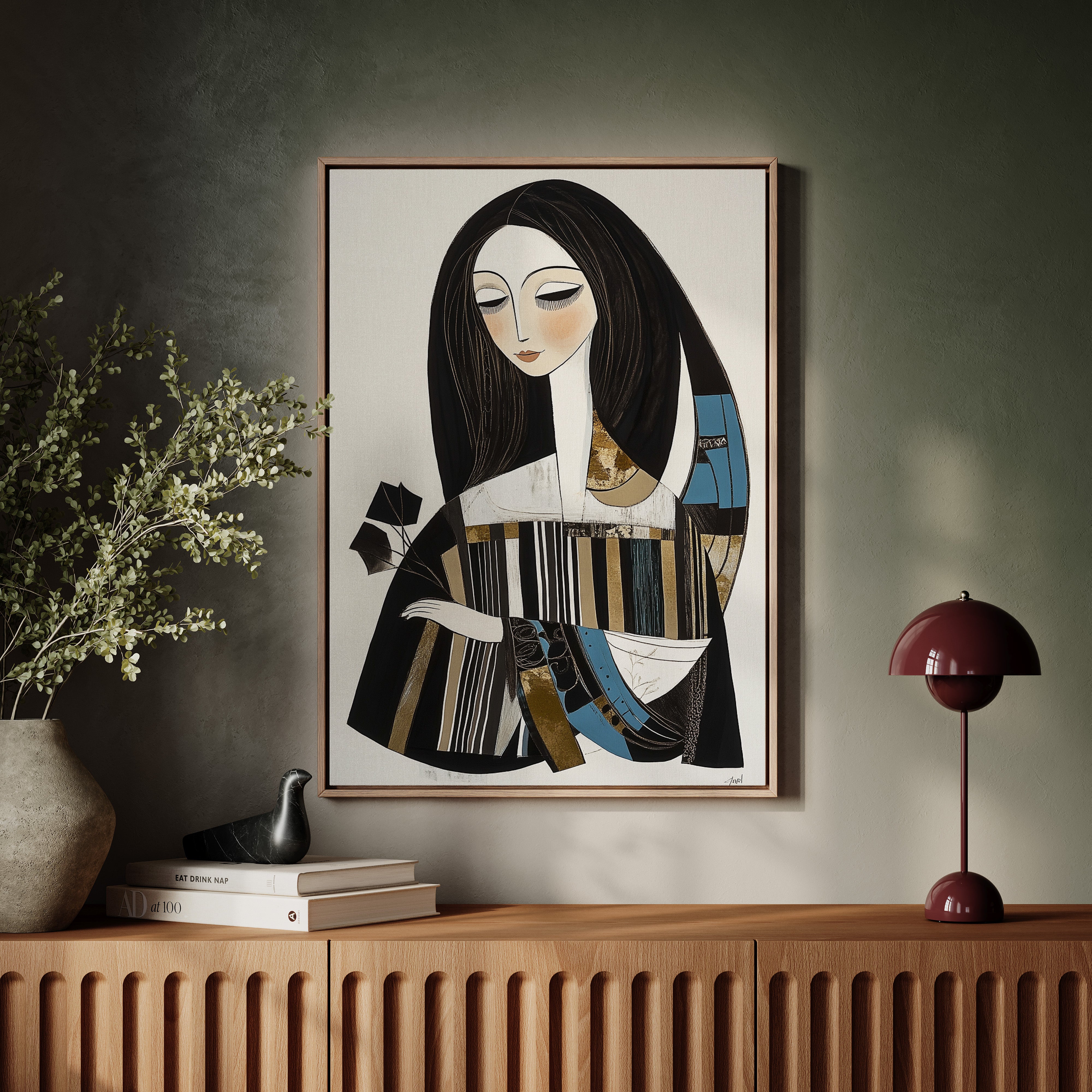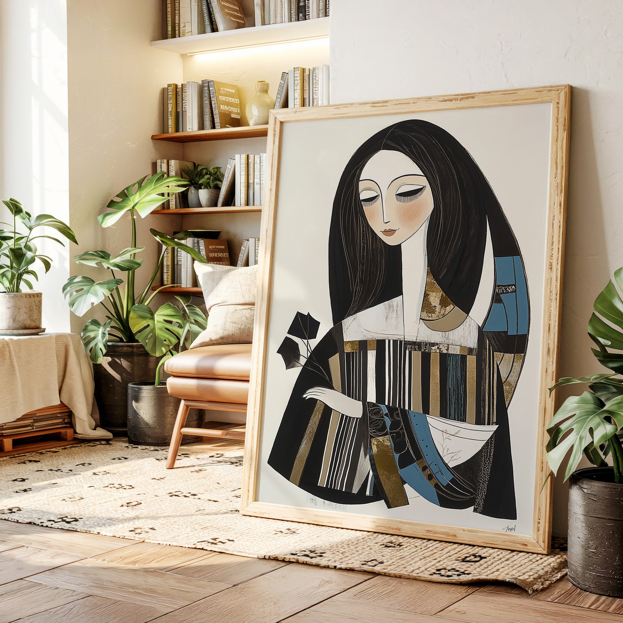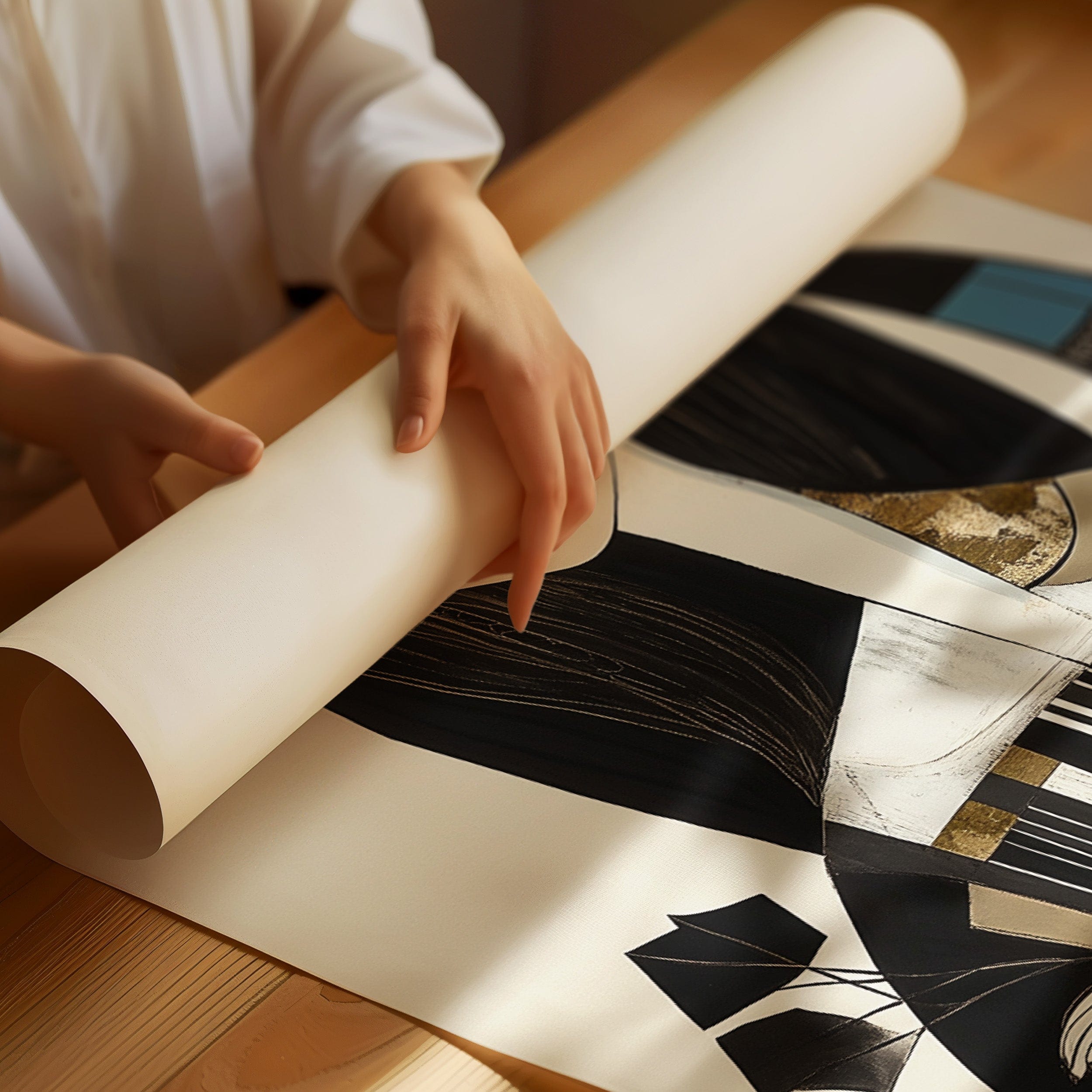 In the gentle pause between pages turning, a figure finds solace in literary contemplation. The artistic style merges modern minimalism with Art Deco influences, creating a sophisticated portrait in a palette of black, white, and touches of teal and gold. The elongated lines and geometric patterns play against the soft curves of the figure, while the composition suggests both movement and stillness in its careful balance of elements. This piece would bring an air of artistic sophistication to a reading nook, home library, or creative workspace where its contemplative energy can inspire quiet moments of reflection.