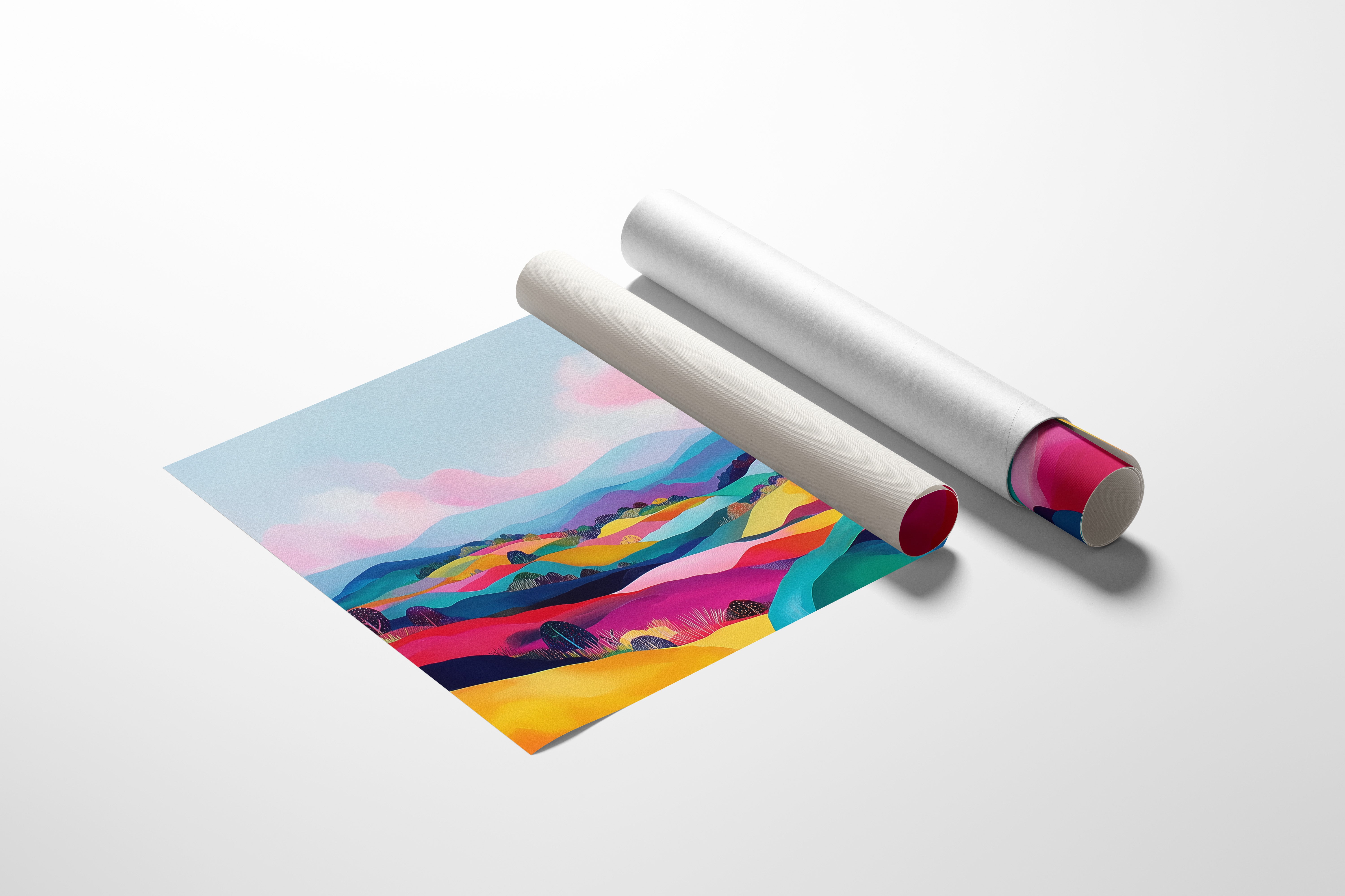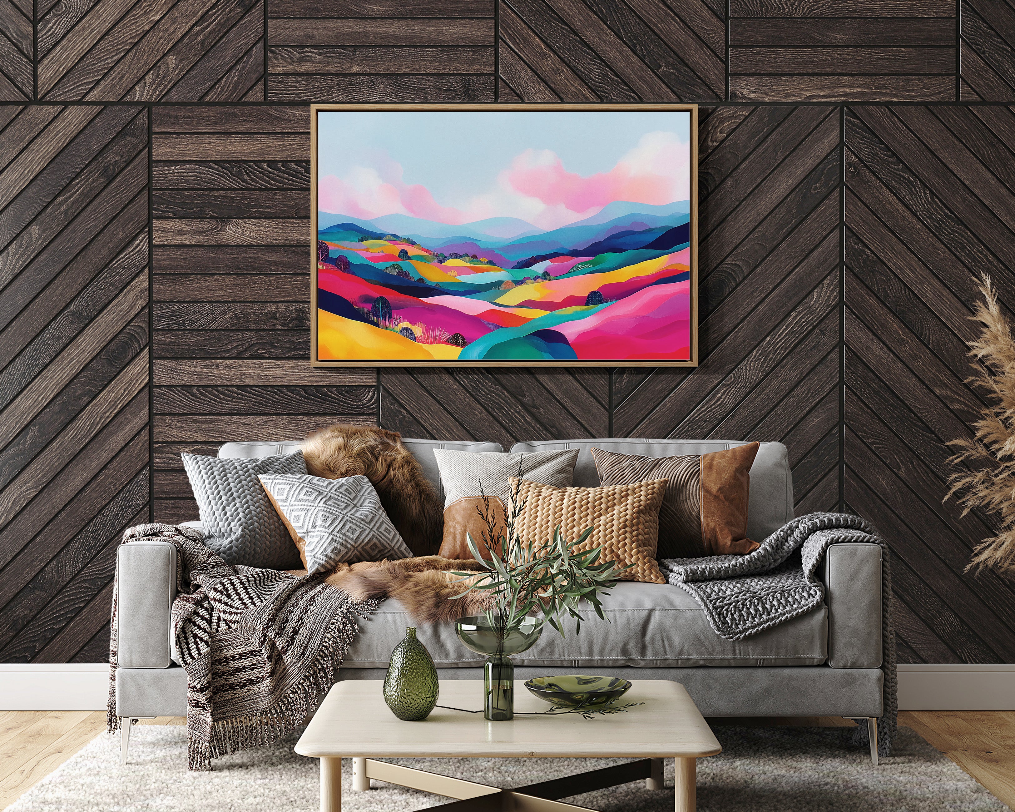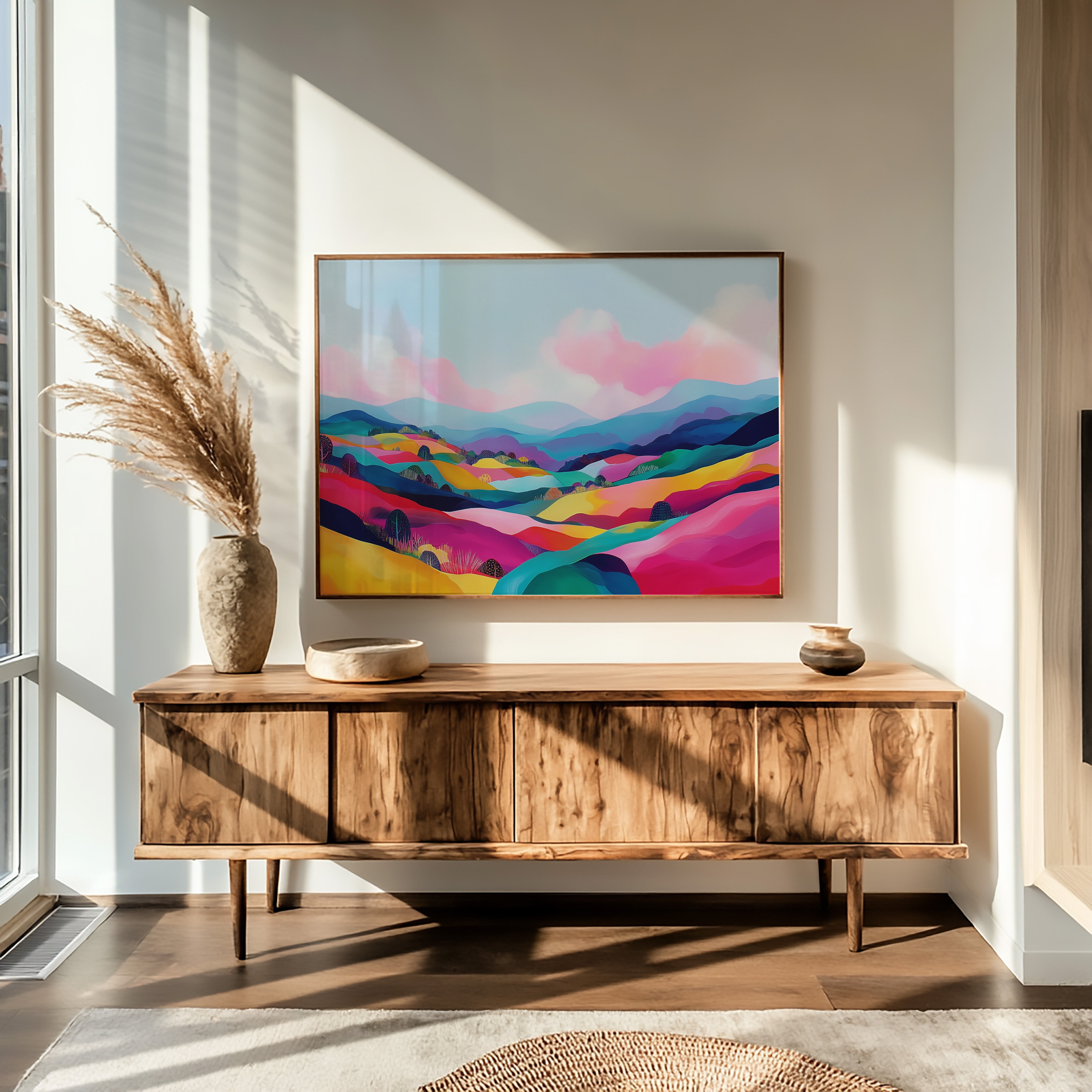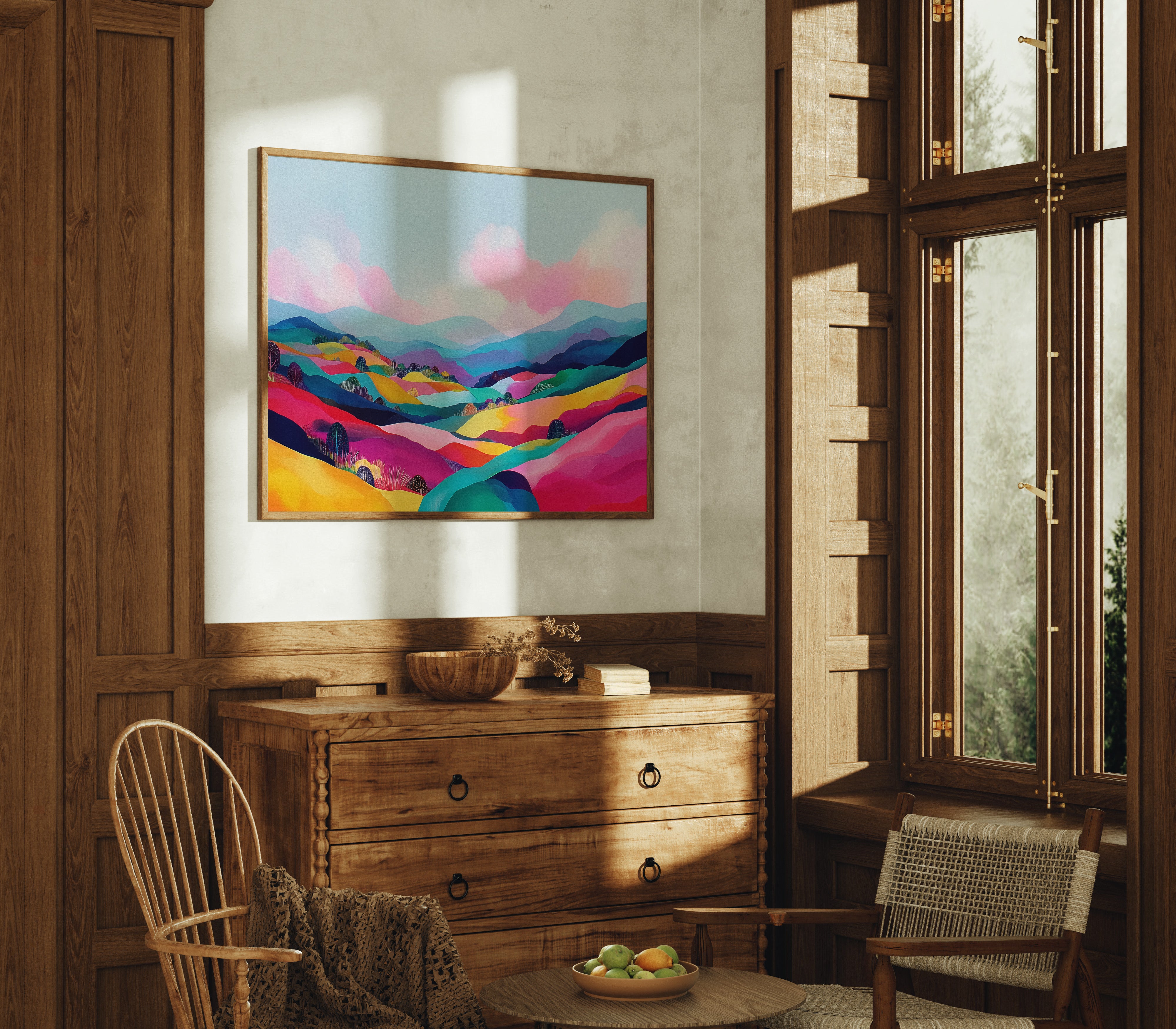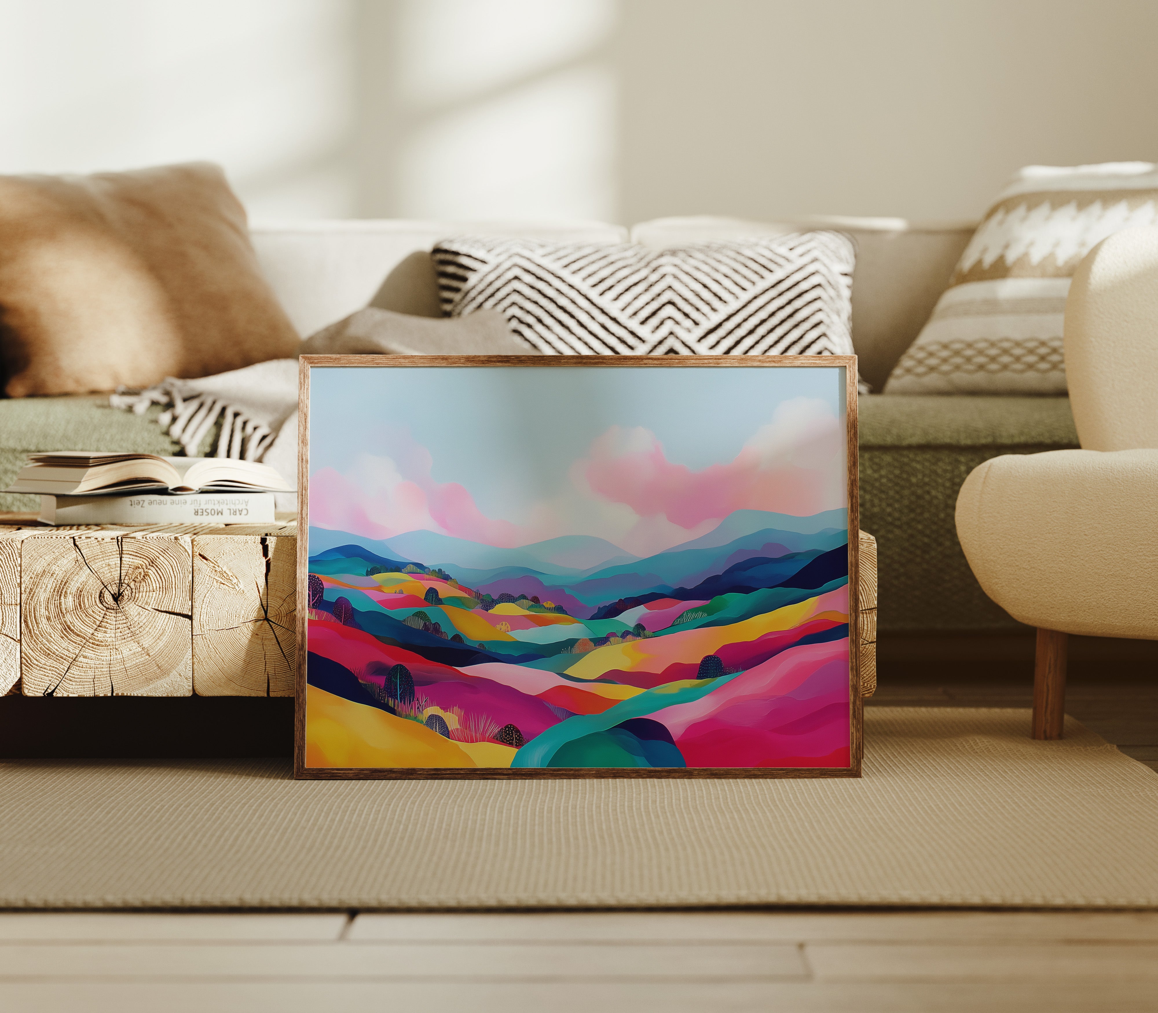 A kaleidoscope of rolling hills unfolds in vibrant waves, each curve painted in bold strokes of magenta, turquoise, and golden yellow. The landscape pulses with an almost musical rhythm as the colors flow and blend like a visual symphony. Layers of mountains stretch into the distance beneath cotton candy clouds, while scattered trees dot the technicolor valleys in deep navy clusters. This contemporary interpretation of a pastoral scene would transform a modern living space into a celebration of color and movement, making a striking focal point in a minimalist room or adding artistic energy to a creative workspace.