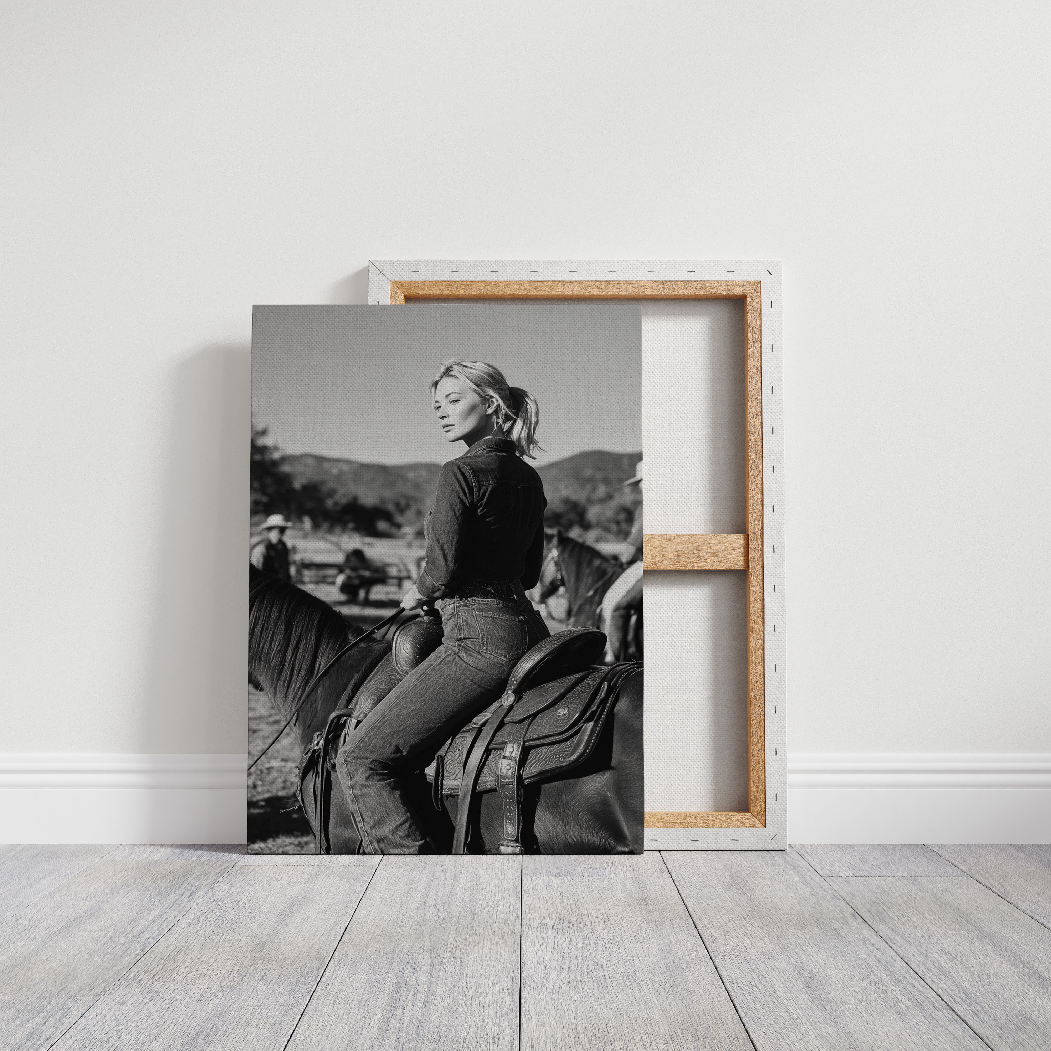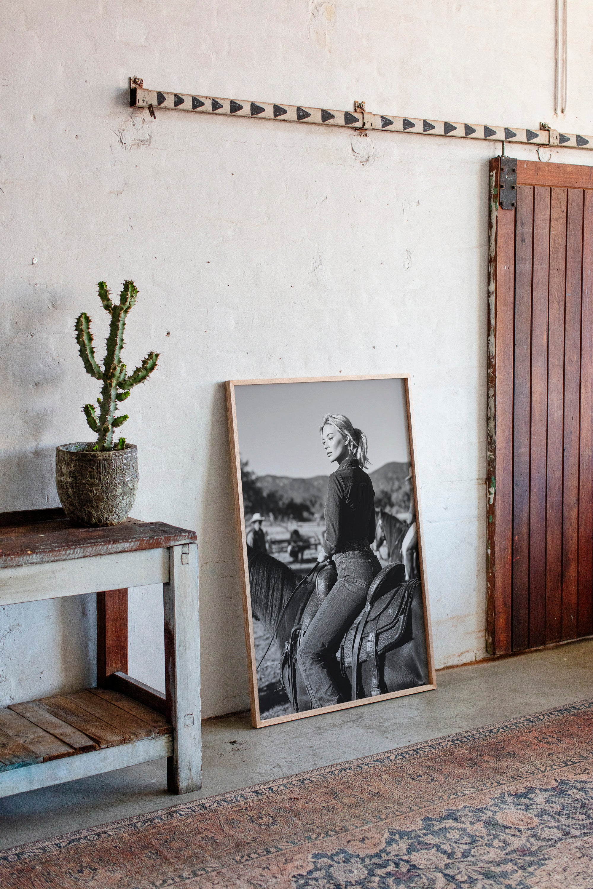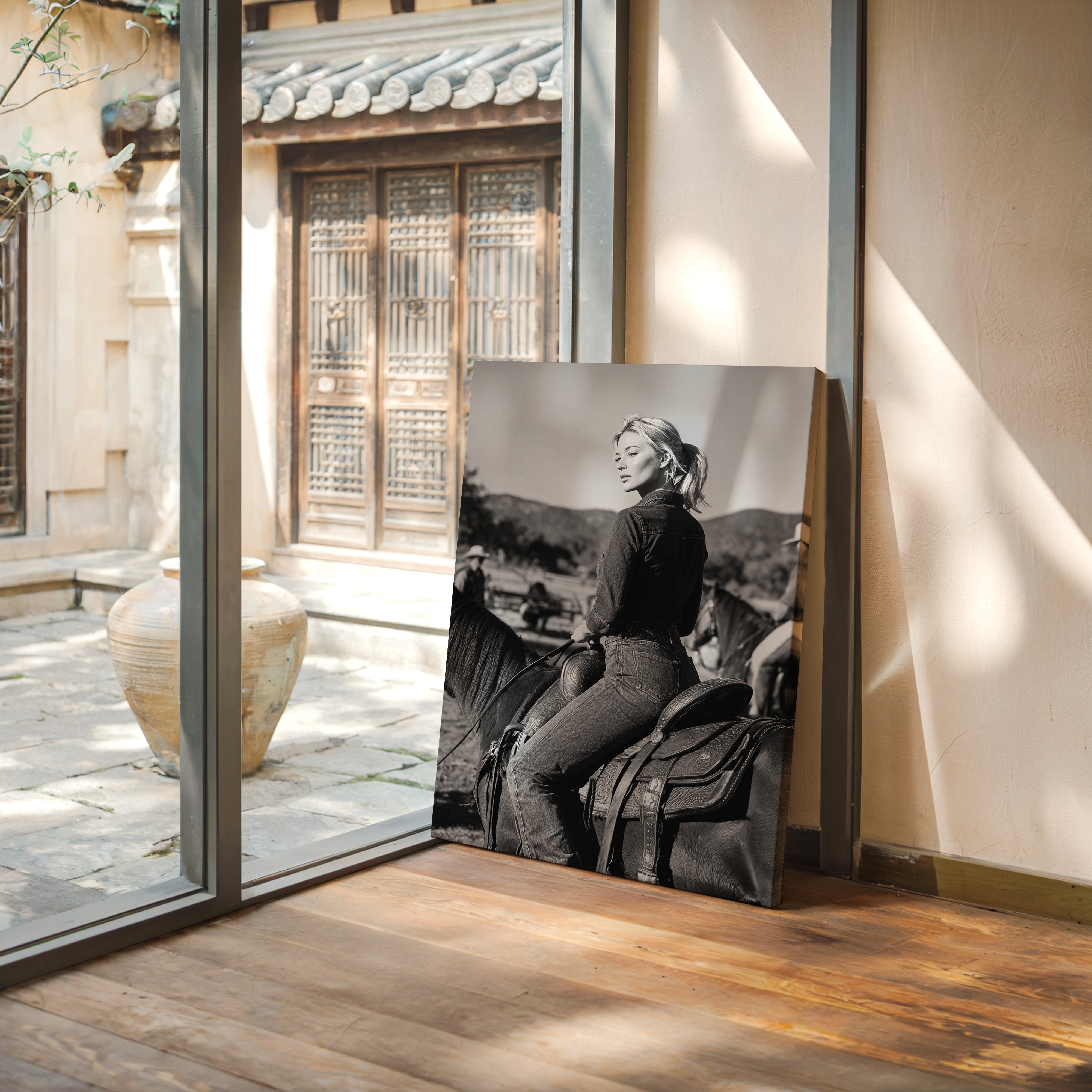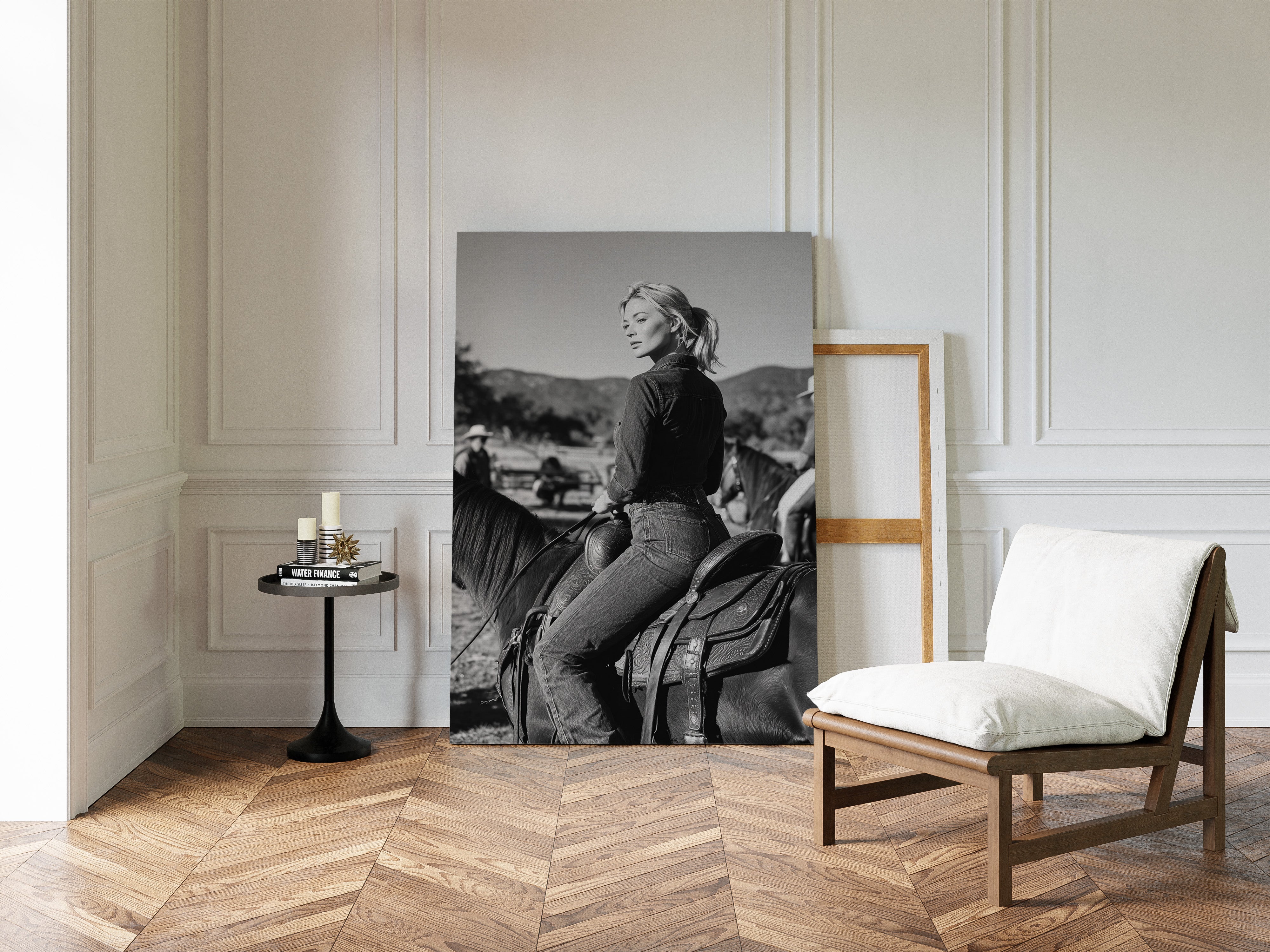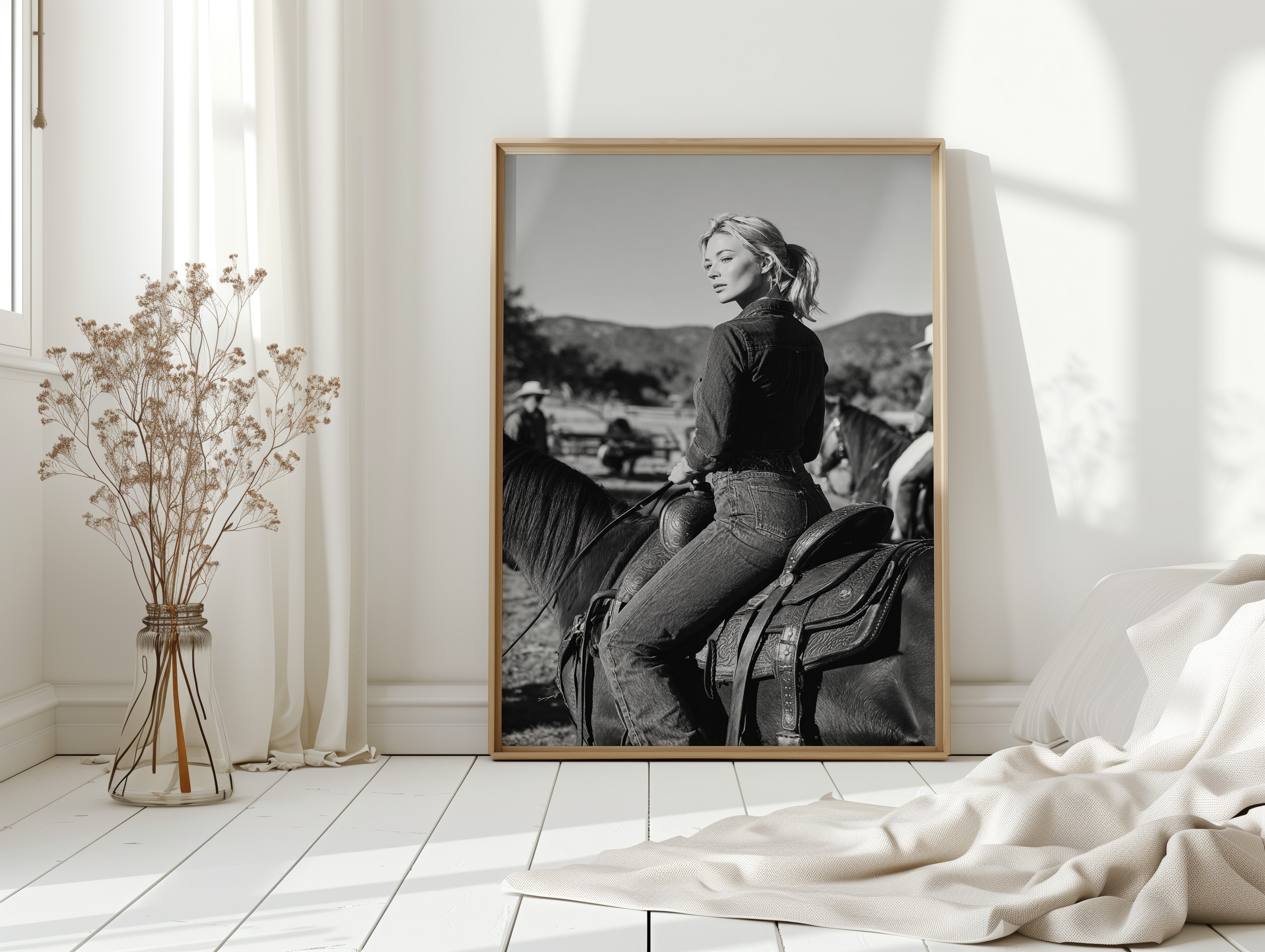 Part of our Ranch Elegance collection, this sophisticated black and white portrait captures the authentic spirit of today's equestrian lifestyle. The ornate saddle details and natural ranch setting create a composition that celebrates both the artistry of western horsemanship and the confident beauty of the modern cowgirl.