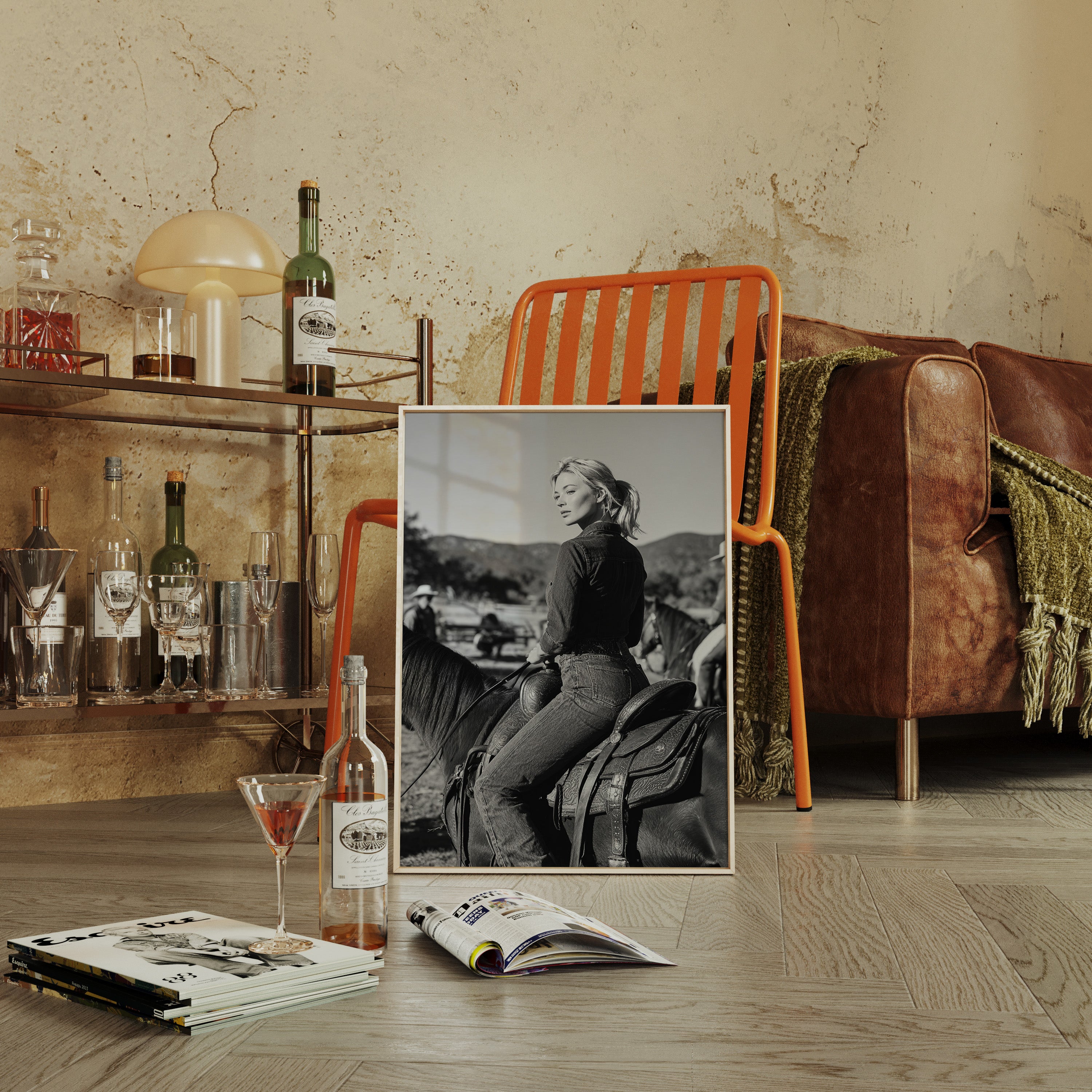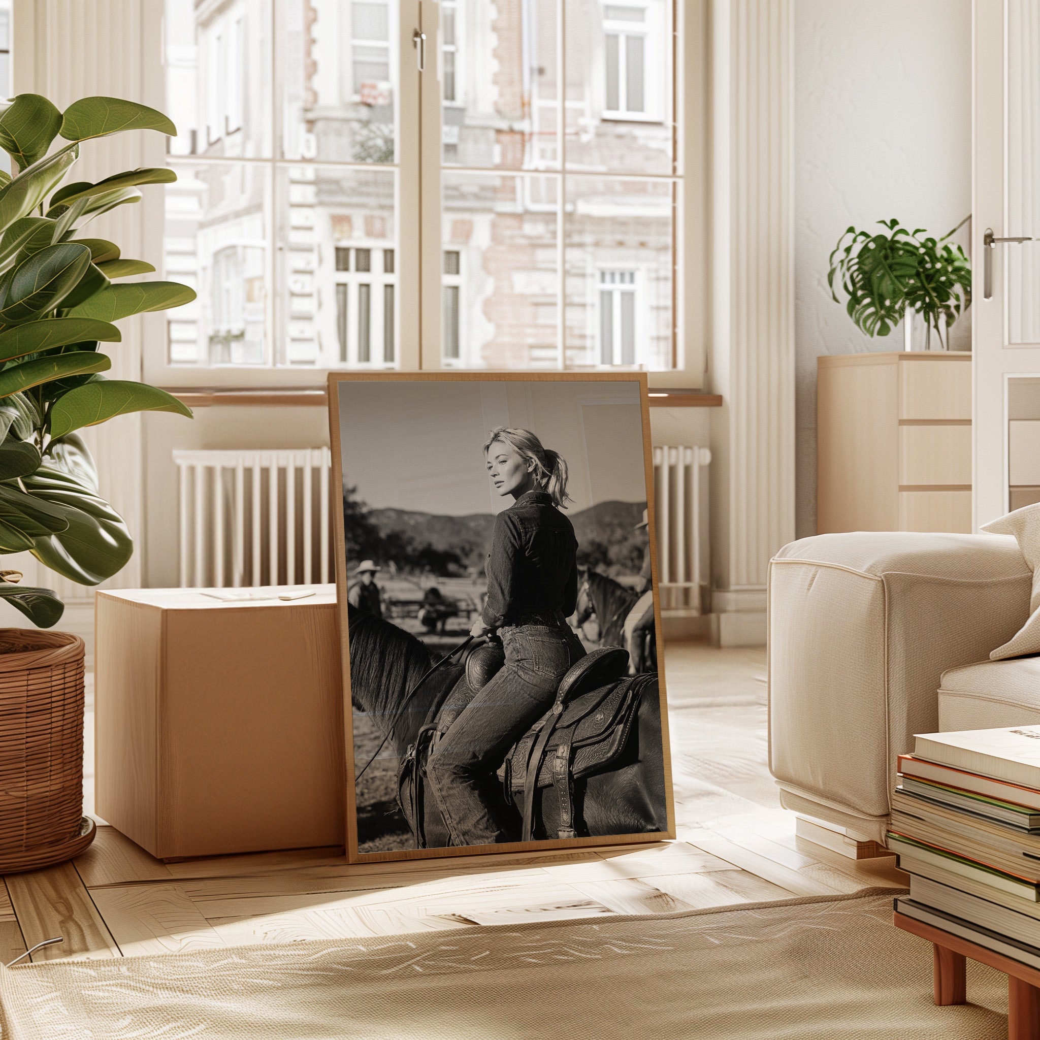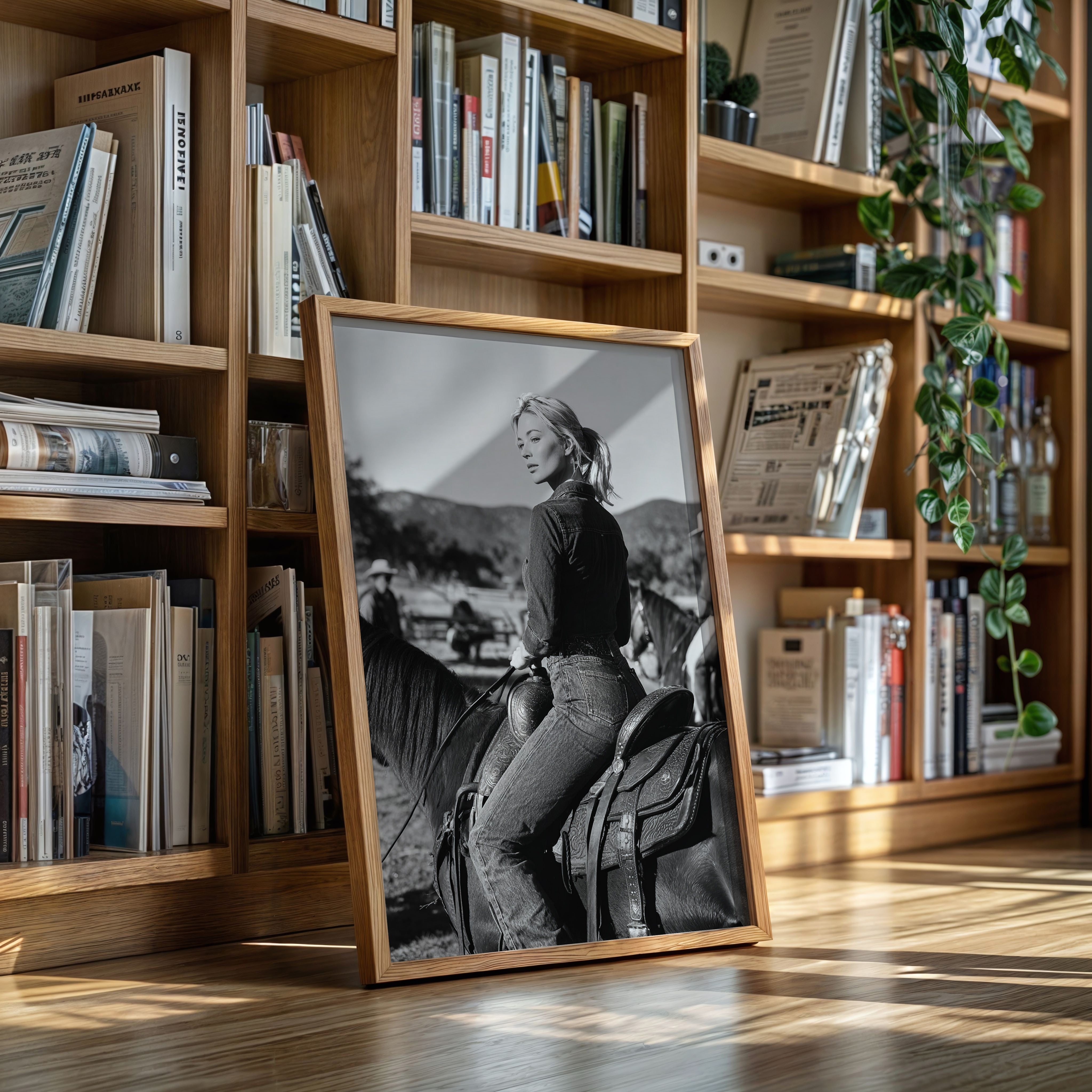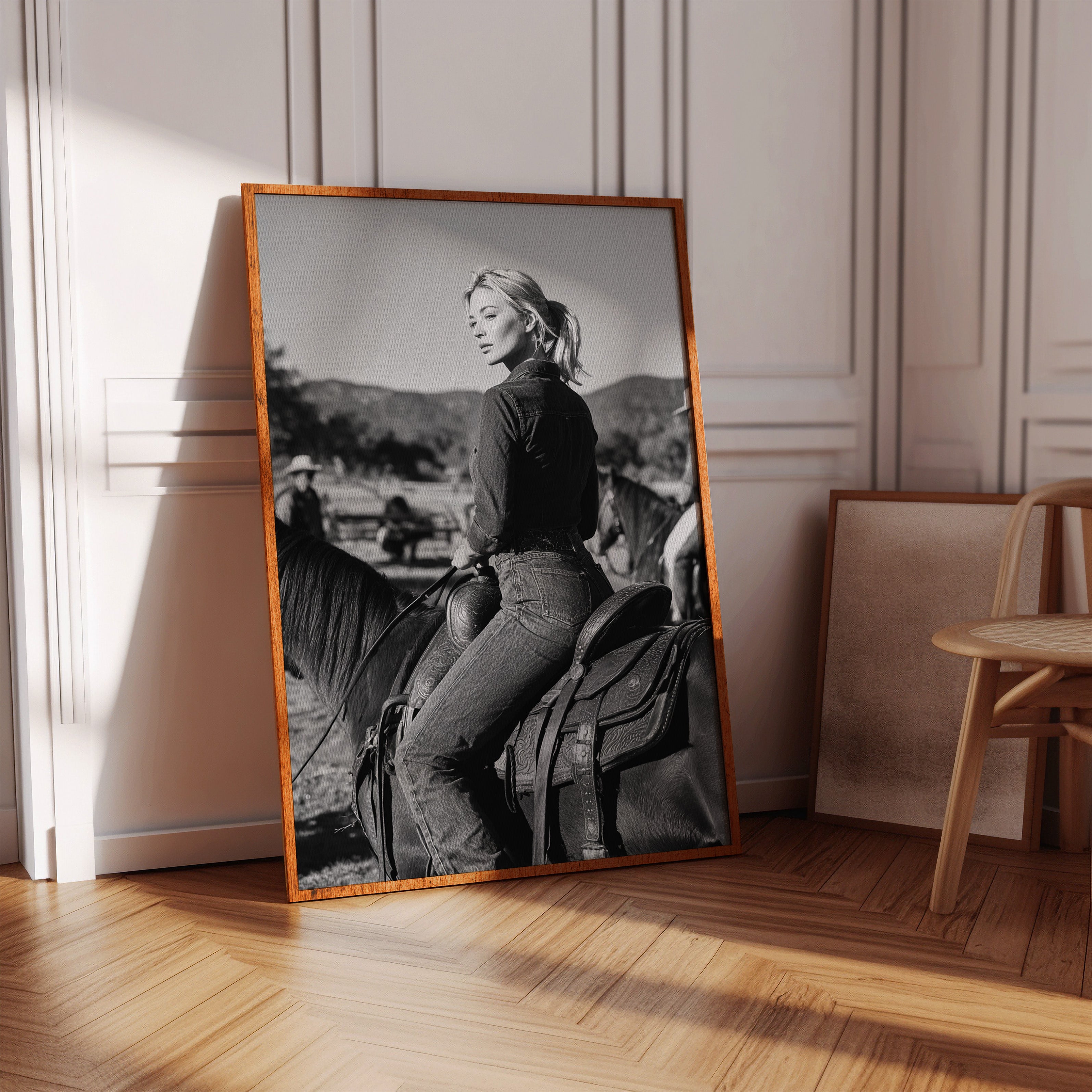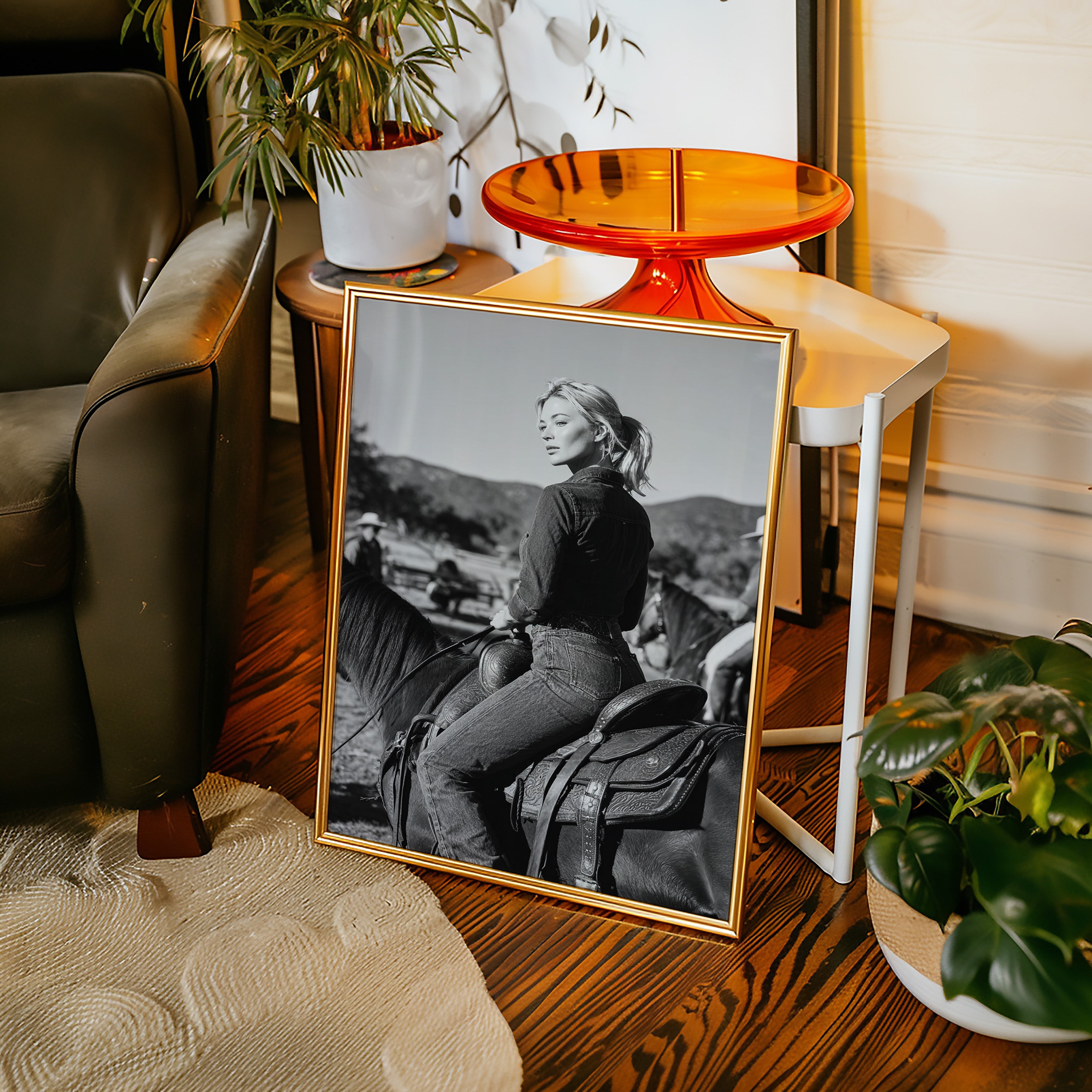 Part of our Ranch Elegance collection, this sophisticated black and white portrait captures the authentic spirit of today's equestrian lifestyle. The ornate saddle details and natural ranch setting create a composition that celebrates both the artistry of western horsemanship and the confident beauty of the modern cowgirl.