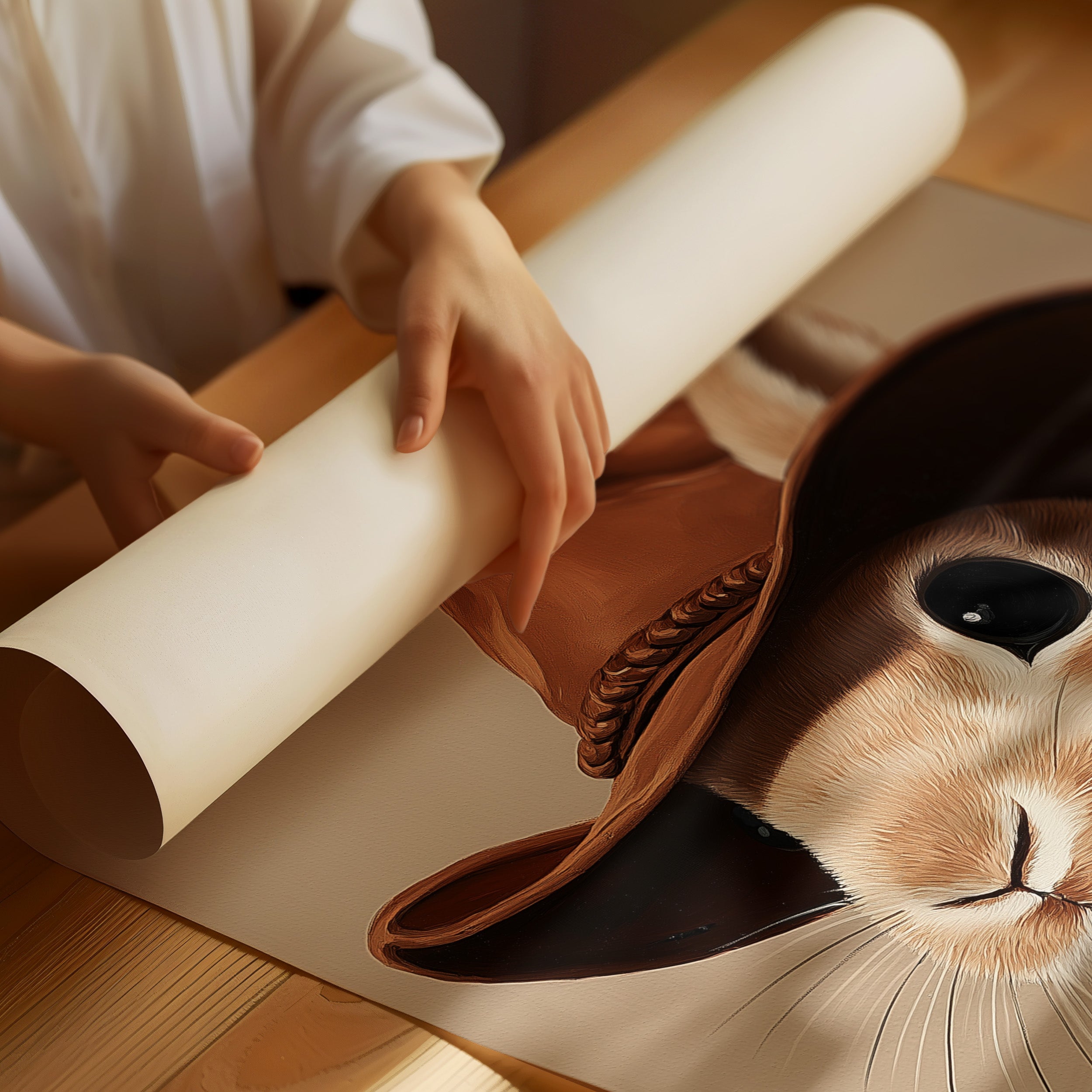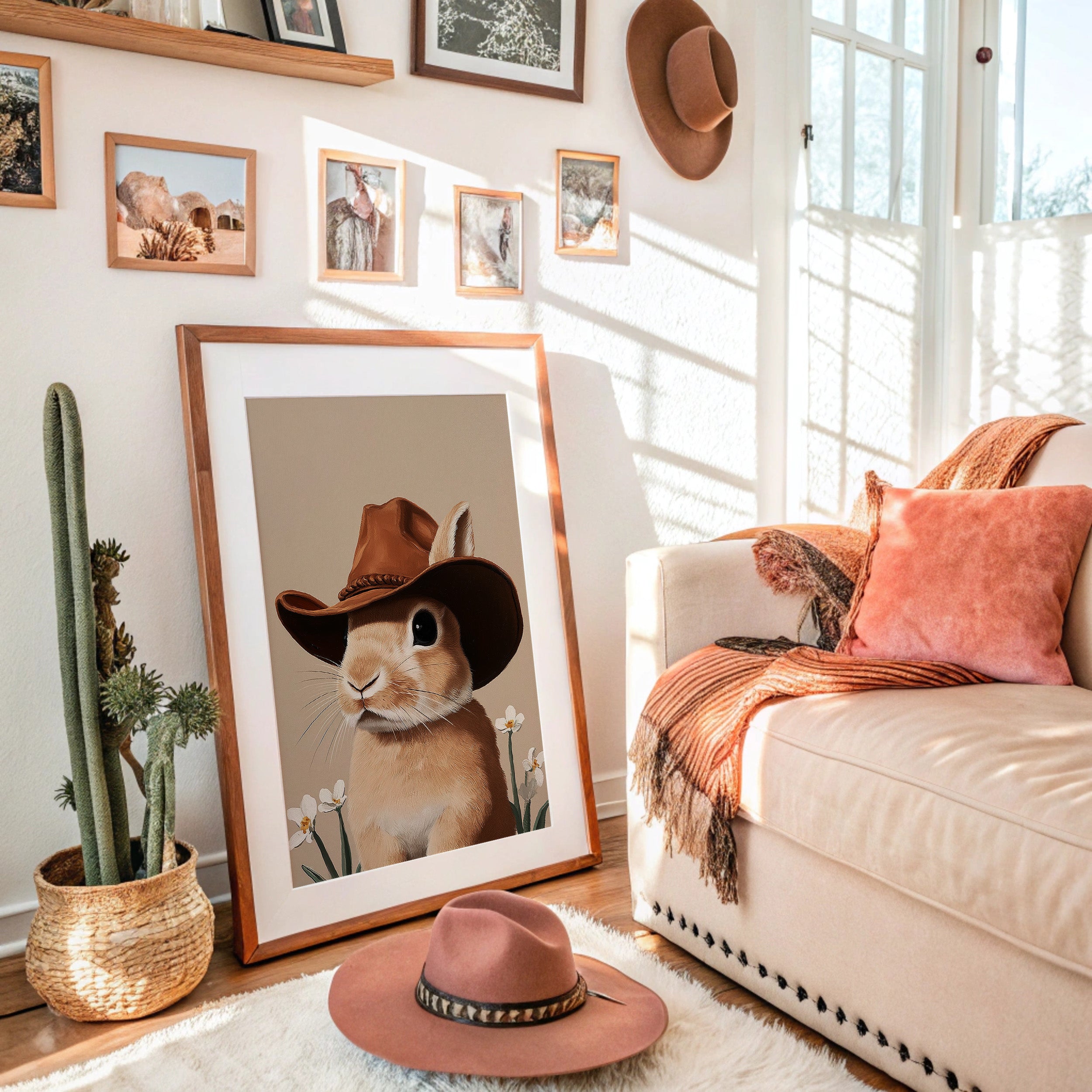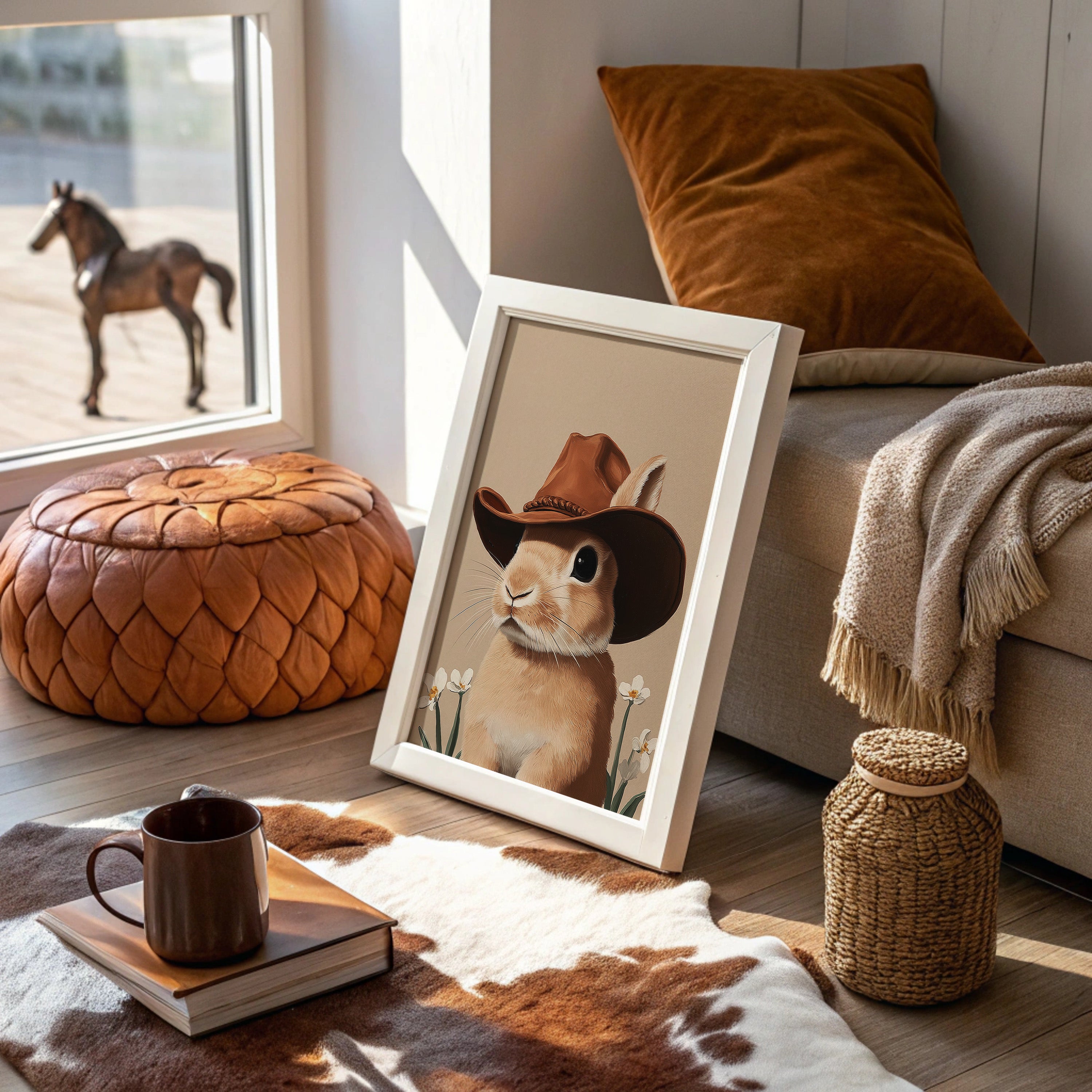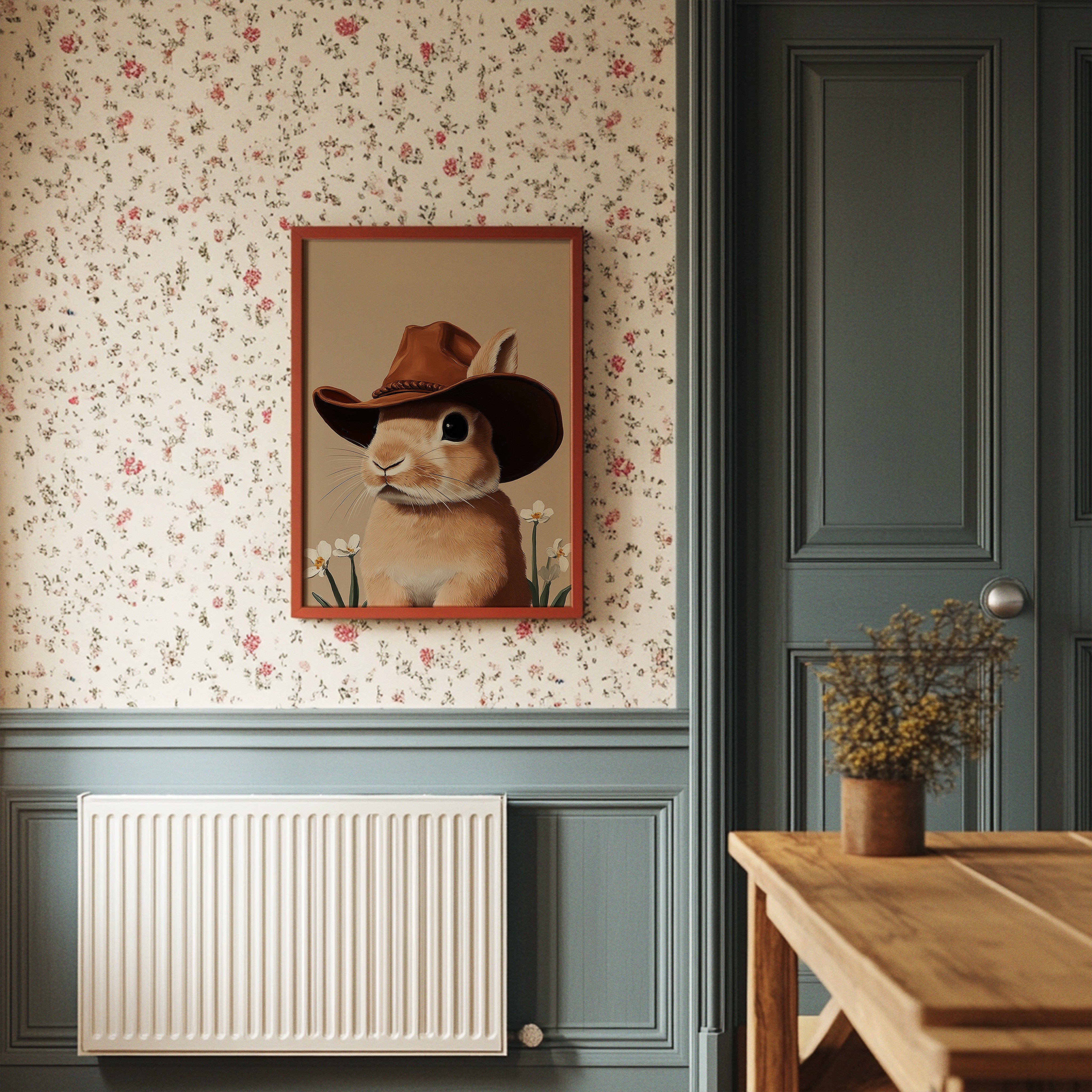 A charming bunny dons a weathered leather cowboy hat, his gentle expression radiating both confidence and whimsy among delicate white daisies. This playful portrait from our Contemporary collection perfectly captures the intersection of rustic charm and modern wit. The rich browns of the hat complement the rabbit's soft honey-colored fur, while pristine white flowers dance at the edges, creating a delightful contrast against the warm neutral background. This endearing piece brings personality and charm to any space, making it particularly suited for a child's room, playful office space, or anywhere that could use a touch of imaginative humor. The artwork's ability to bring smiles while maintaining sophisticated appeal makes it a versatile addition to any modern home.