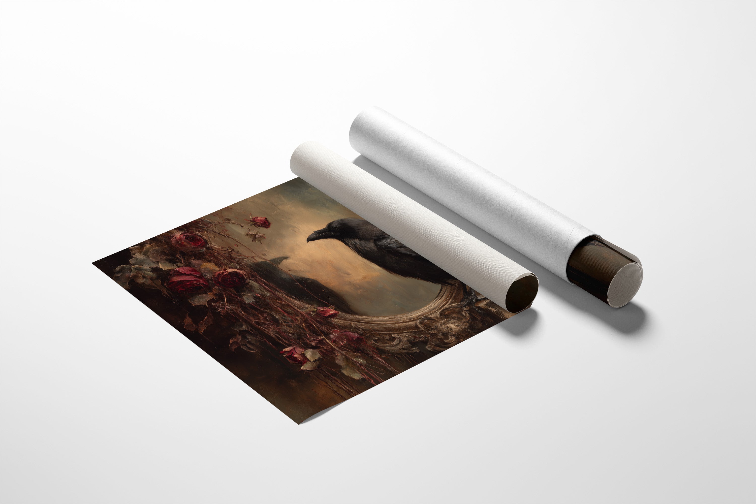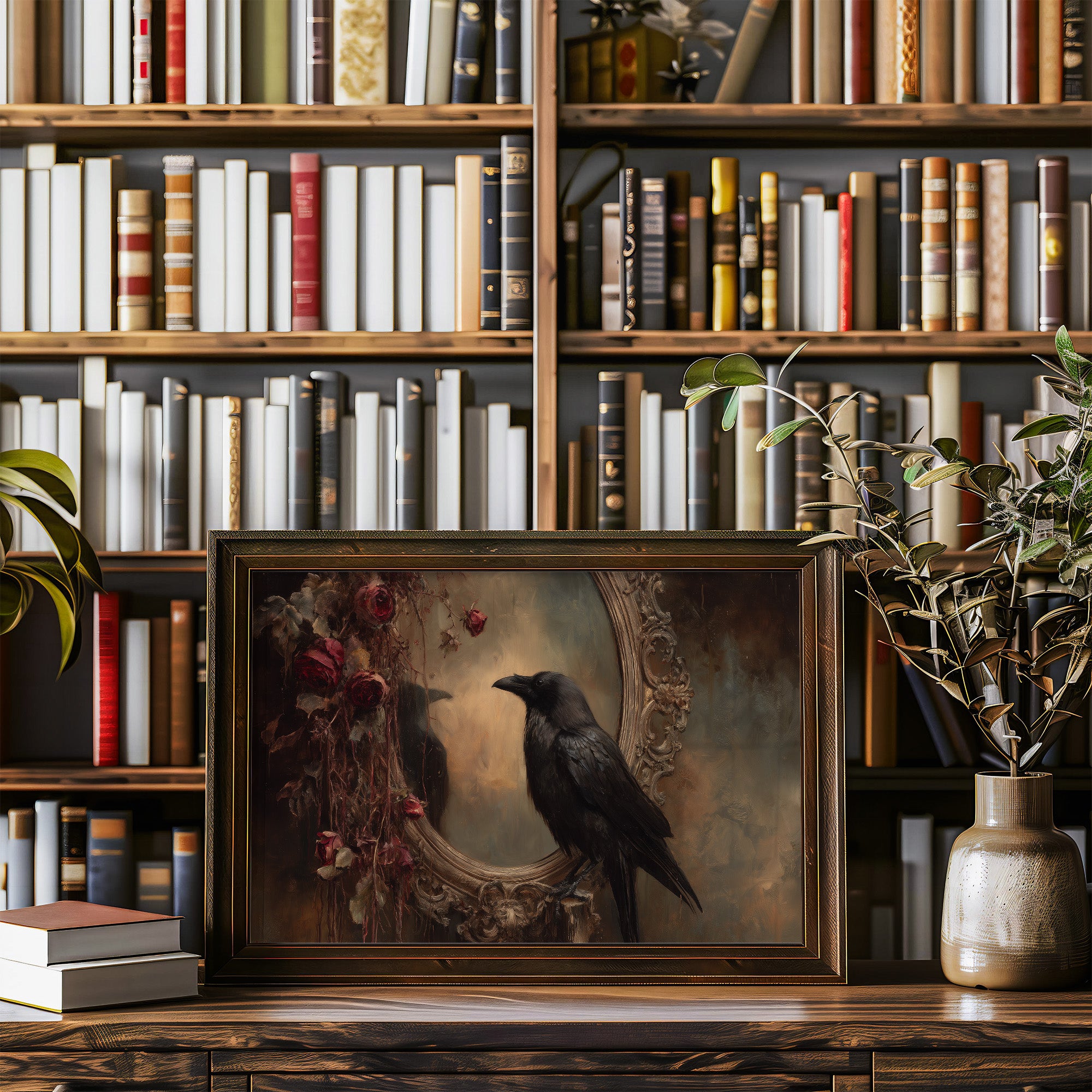 A mysterious raven perches amid withered crimson blooms, its obsidian feathers catching the dim light against a backdrop of antique gold. The painting exudes a haunting elegance, where the ornate gilded frame and dried roses create a perfect dialogue between beauty and mortality. This moody still life sits proudly against a library of leather-bound volumes and cream-colored spines, the perfect marriage of literary and visual storytelling.