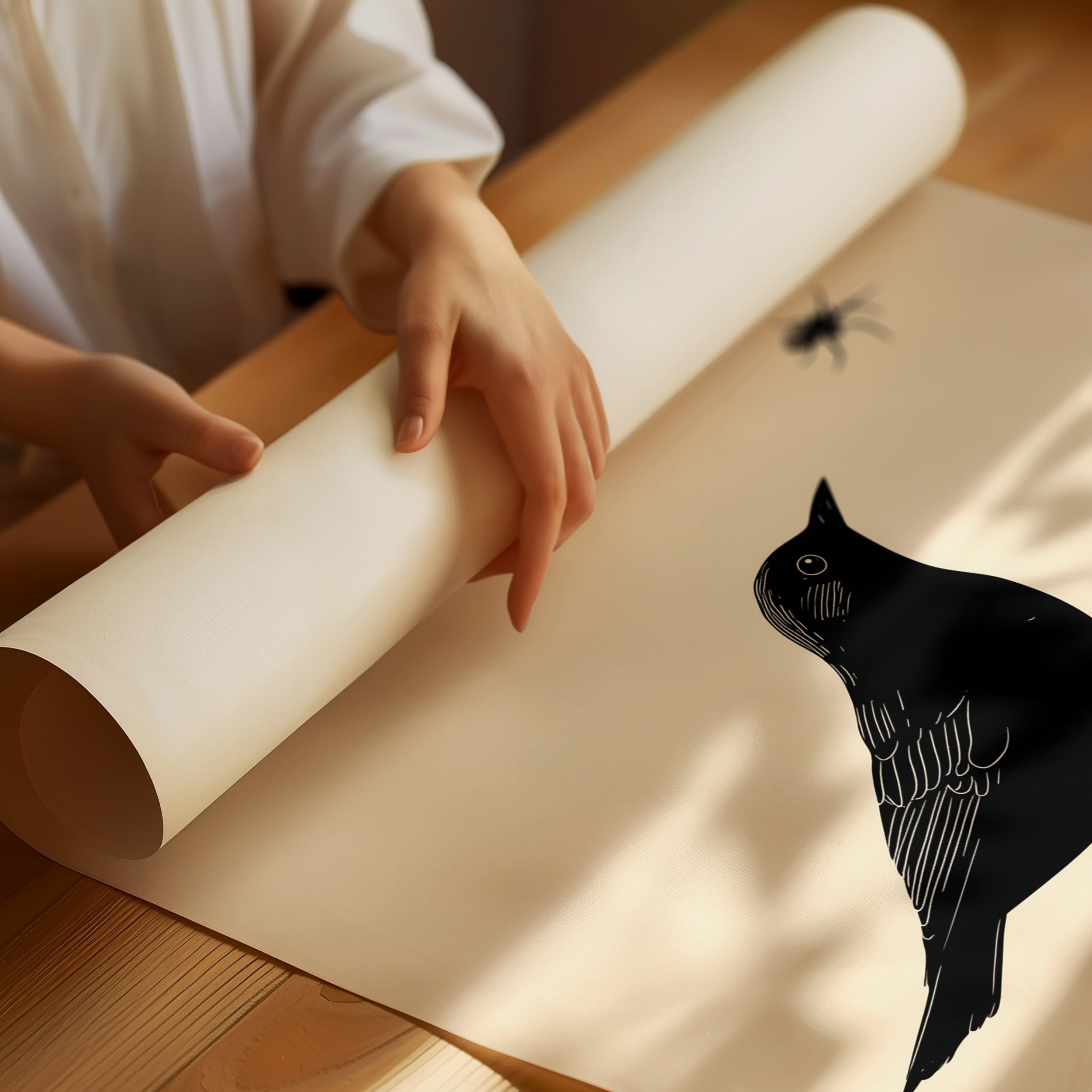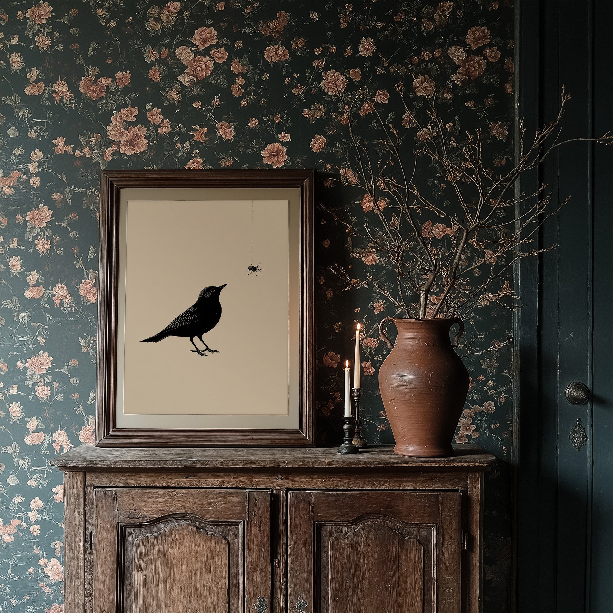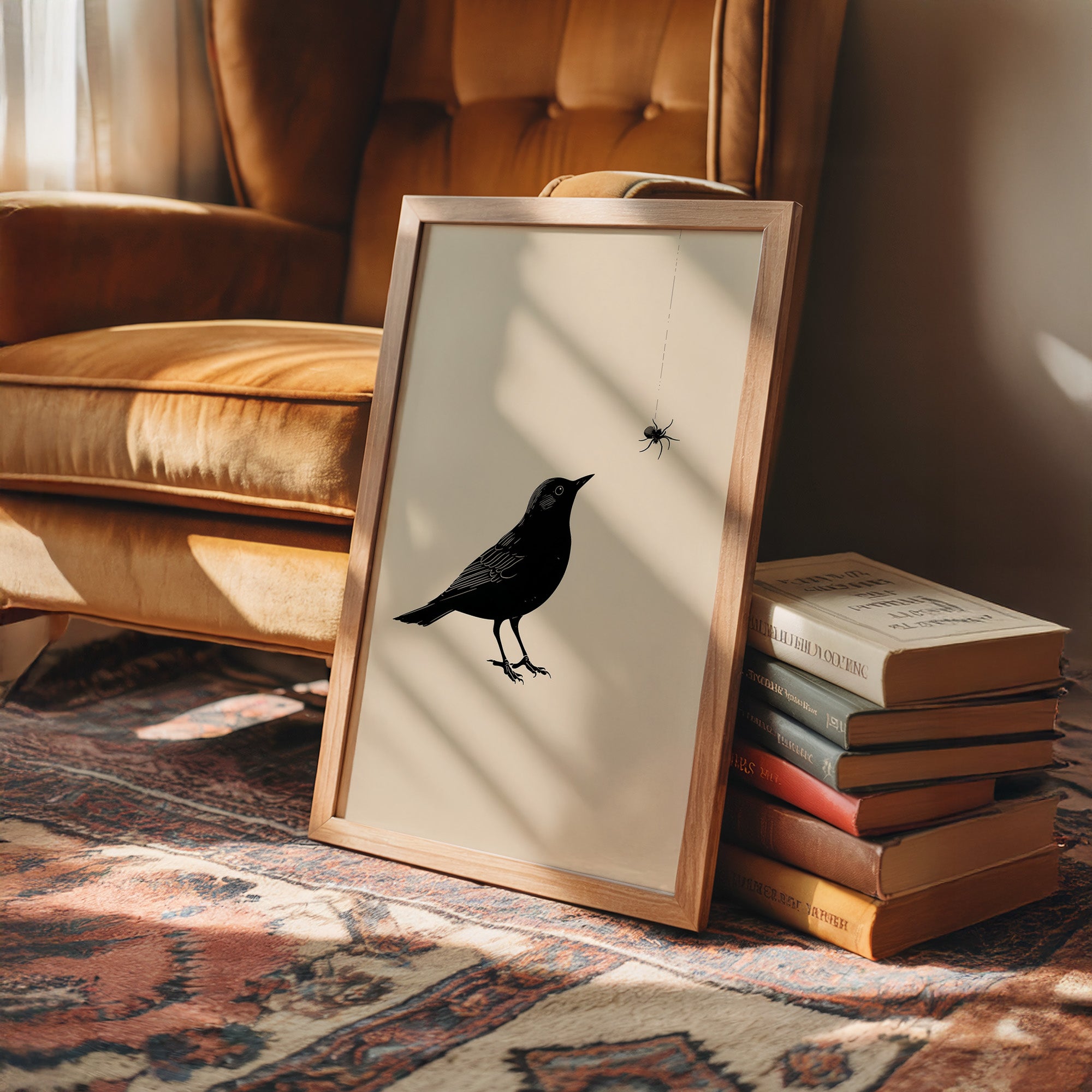 A moment suspended between curiosity and caution as a sleek black bird gazes upward at a spider descending on its silken thread. The stark contrast of the raven's inky silhouette against the warm cream background creates a powerful visual tension. Fine line details capture the texture of feathers and the spider's delicate legs, telling a story of nature's unexpected encounters and silent conversations. This minimalist piece brings understated drama to studies, reading nooks, or any space where contemplative art adds depth.