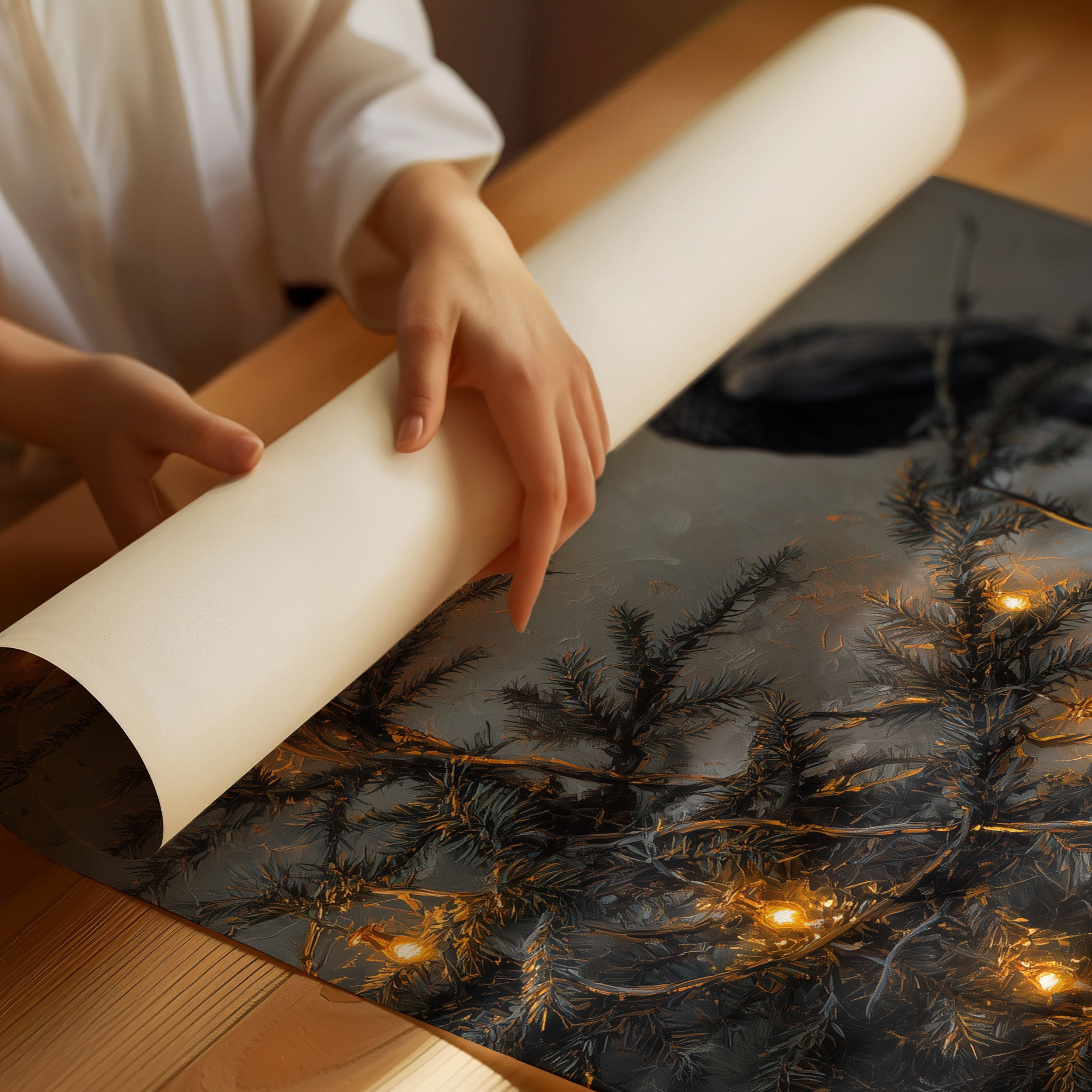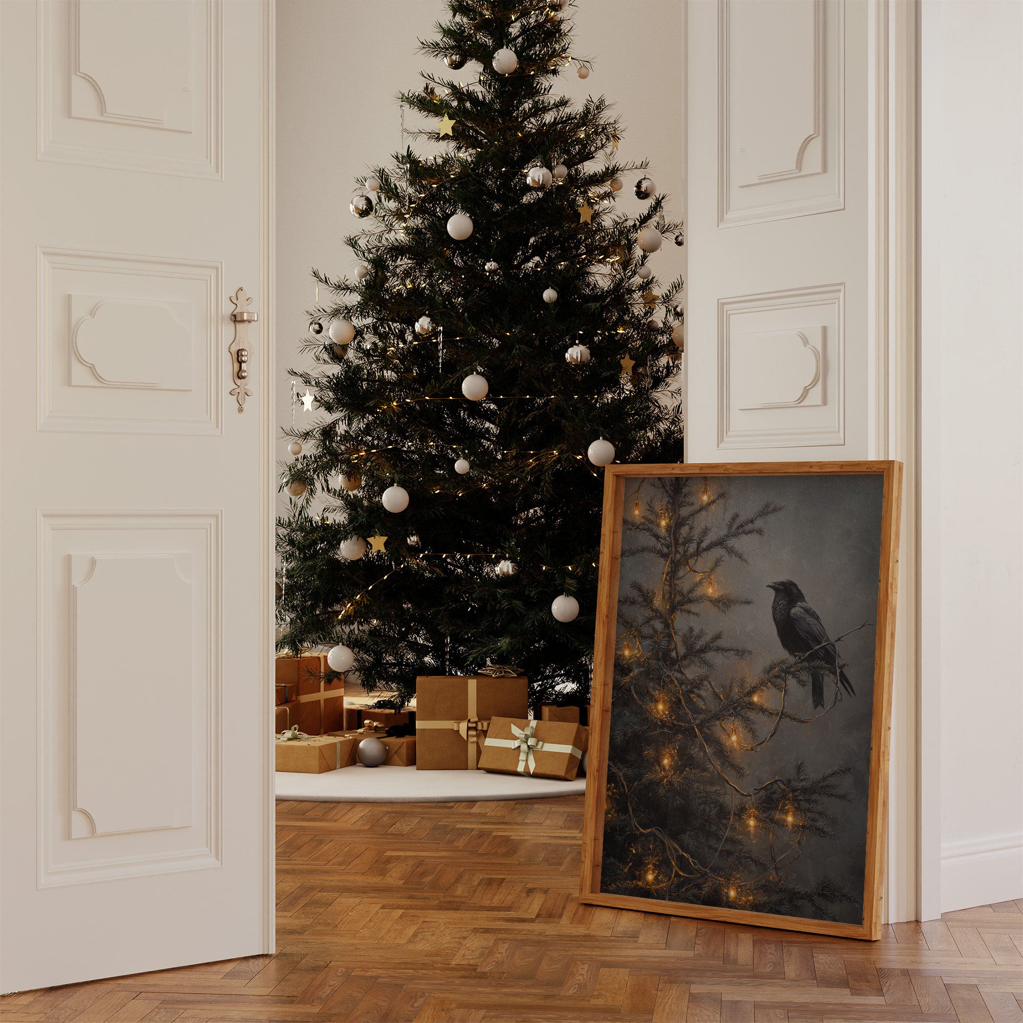 A solitary raven commands attention against a moody winter sky, while delicate fairy lights twinkle through frost-dusted pine branches. The contrast between the dark bird and the warm golden illumination creates a captivating dance of light and shadow. The scene captures a magical moment where nature meets festive charm, with the mysterious corvid serving as a dramatic focal point against the ethereal glow of the winter evening. This piece would create an enchanting focal point in a modern living room or add seasonal sophistication to a cozy reading nook.