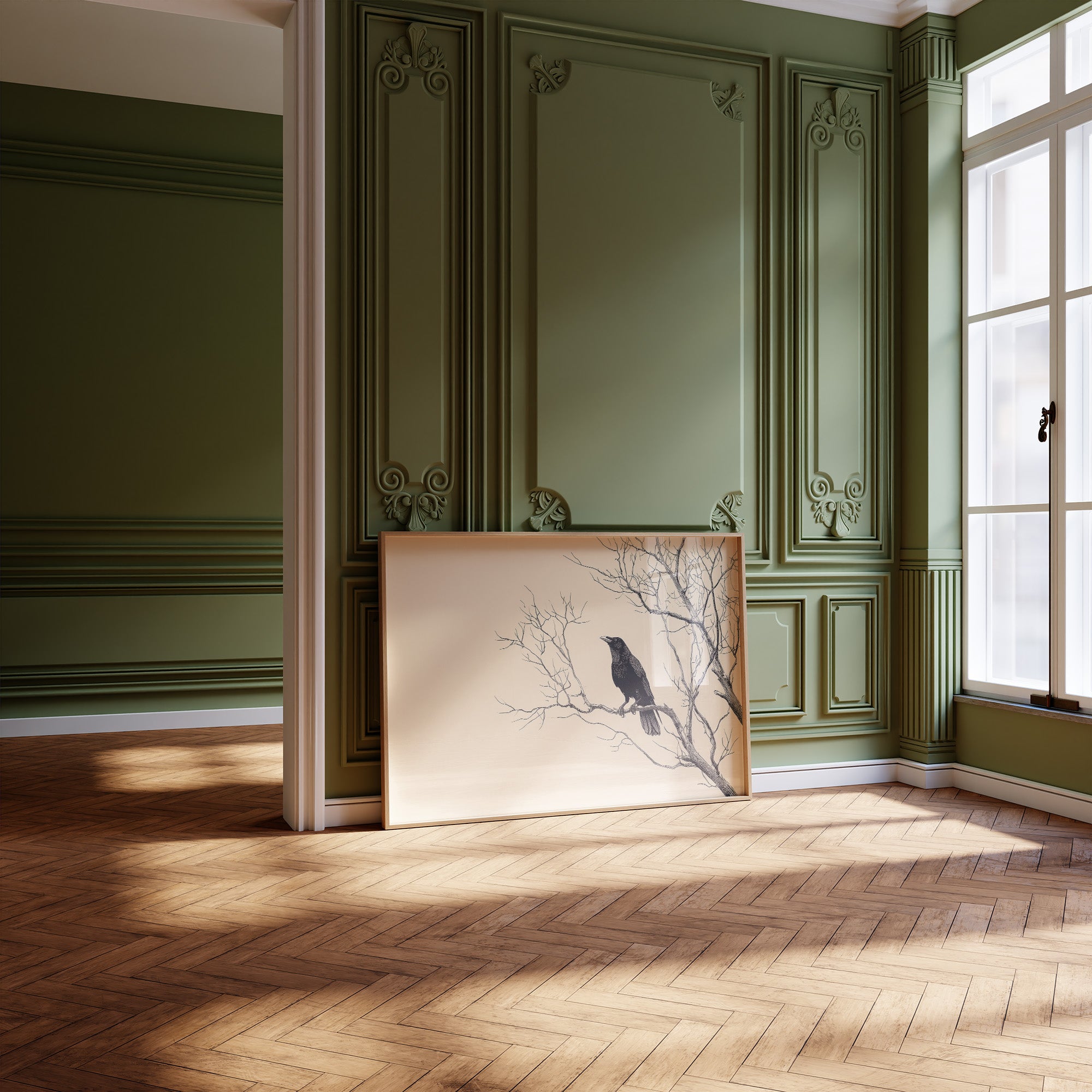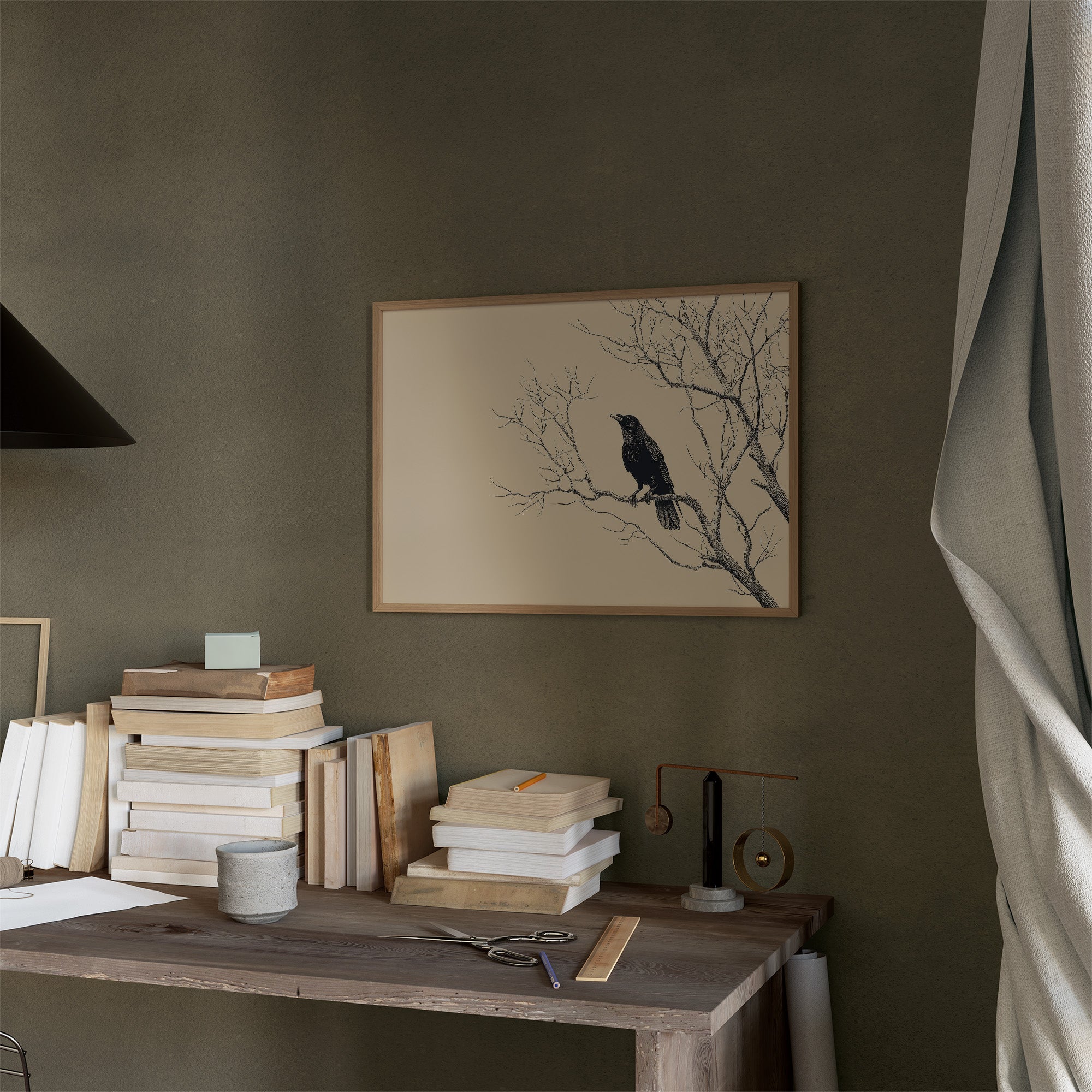 Stillness settles like dust on this monochromatic scene of a solitary raven resting among bare branches. The stark contrast between the bird's inky silhouette and the cream-colored background creates a contemplative mood, inviting viewers to pause in the quietude of nature's simplicity. Fine linework captures every delicate twig and feather, speaking to the fragile beauty found in winter's austerity. This elegant piece finds its perfect home in a study or reading nook, where its thoughtful presence complements the wisdom contained in surrounding bookshelves.